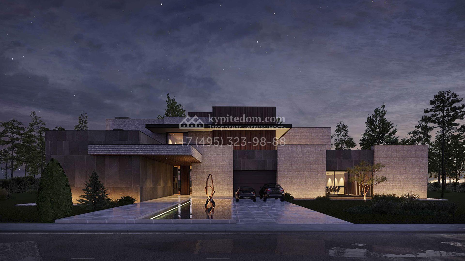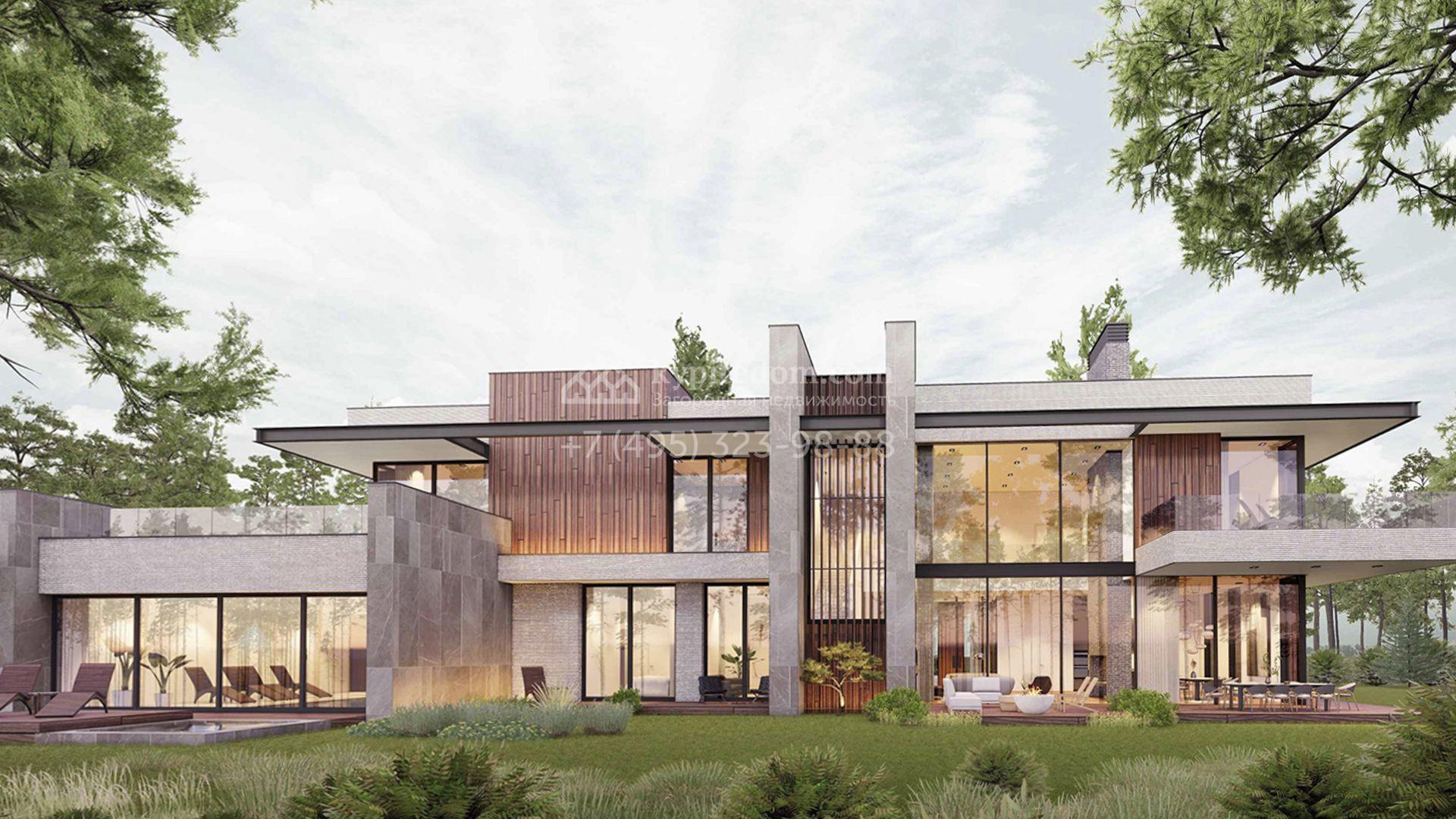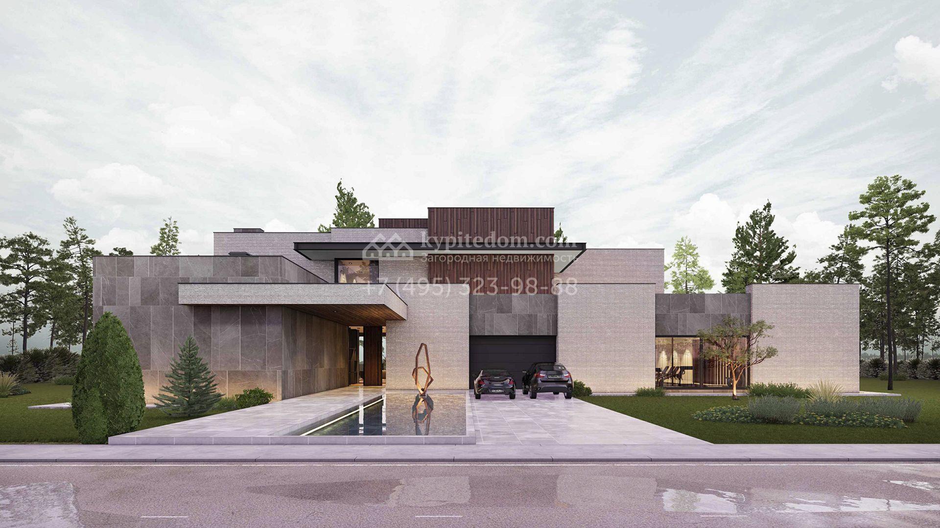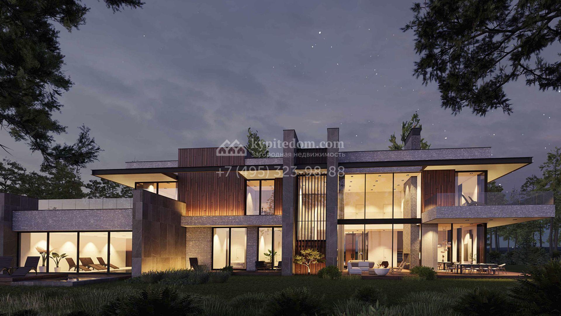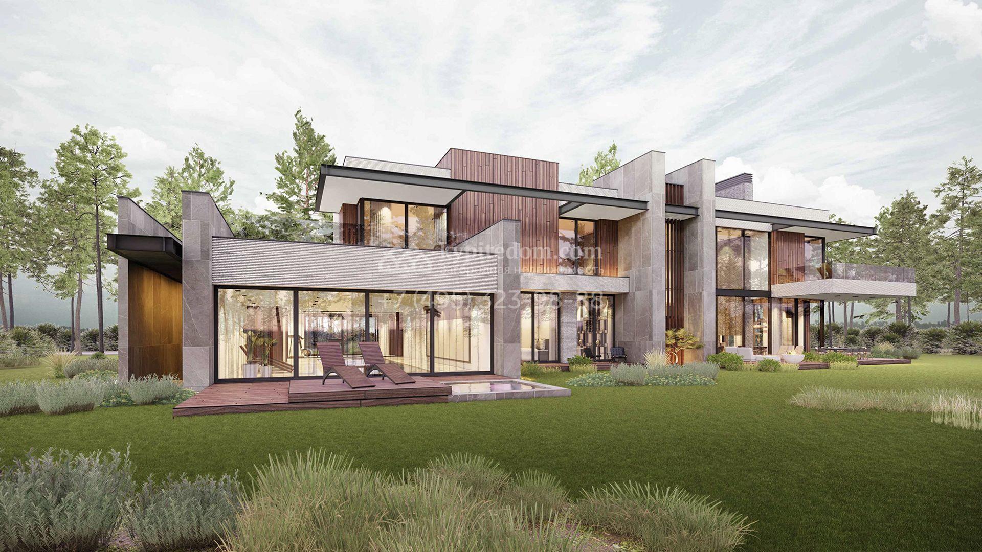 Загородная резиденция площадью 1181 м² расположена на участке 35 соток. Современный фасад с панорамными окнами, оформленный в сдержанных серых тонах, облицован доломитом, керамогранитом и панелями с фактурой дерева. Свободная планировка дома позволяет организовать пространство по собственному усмотрению. Дополнительно предусмотрена возможность реализации дизайн-проекта от застройщика.