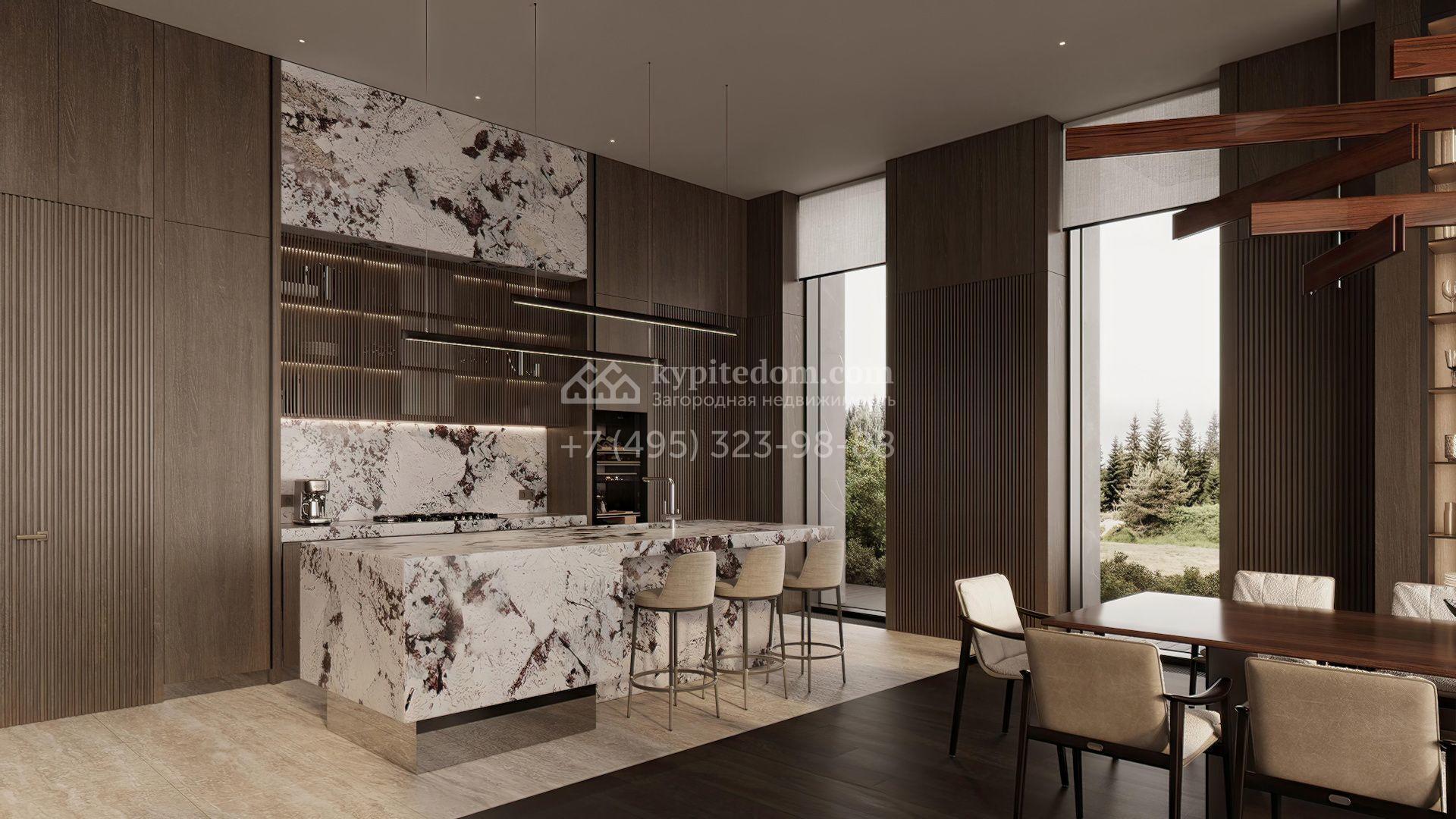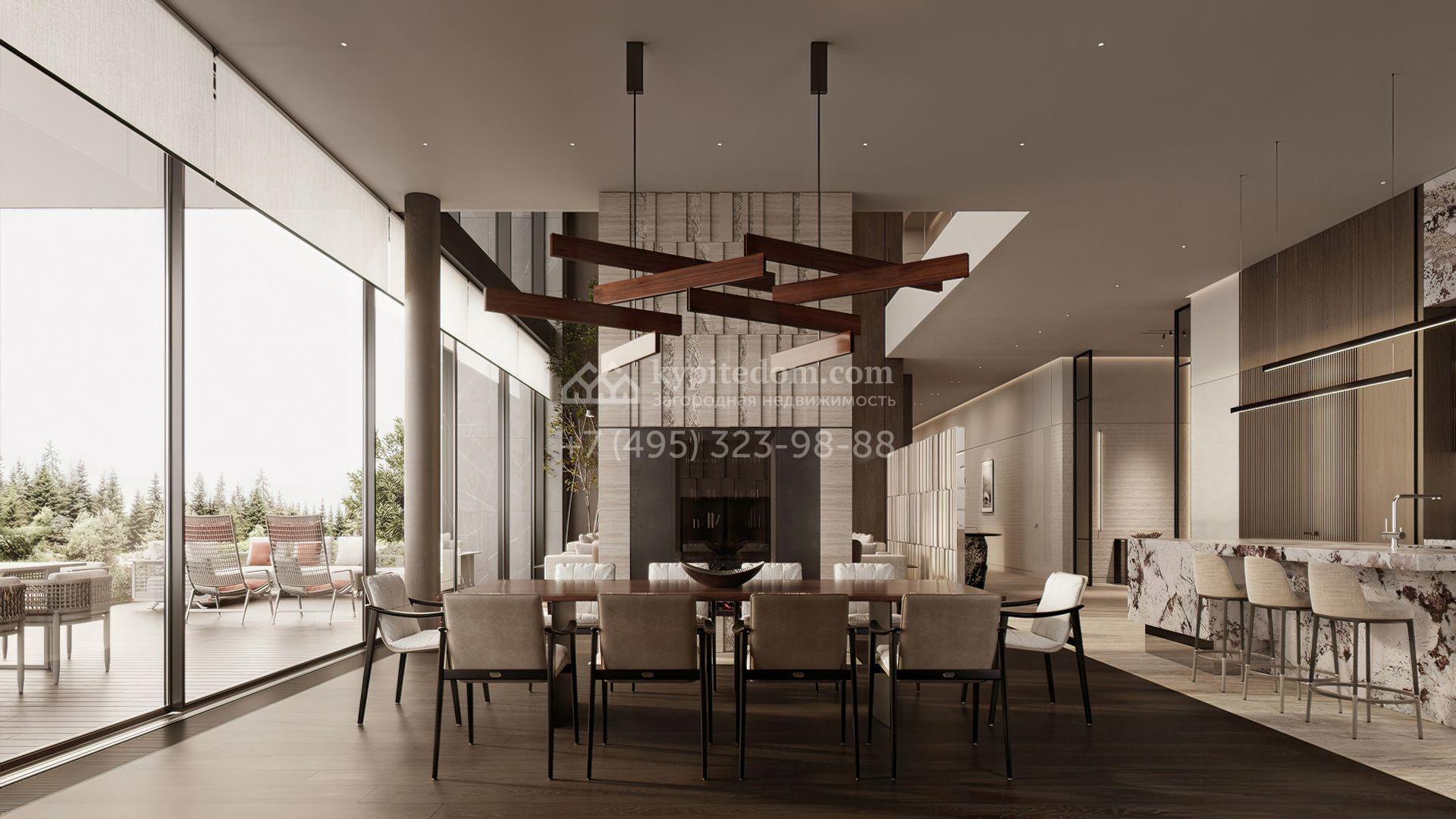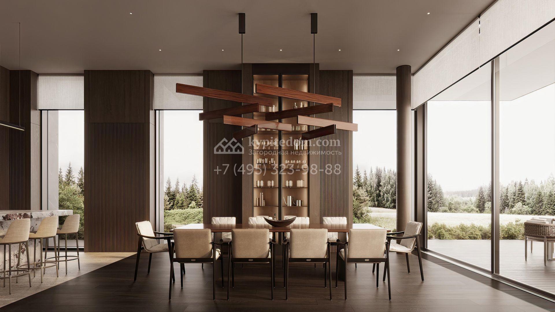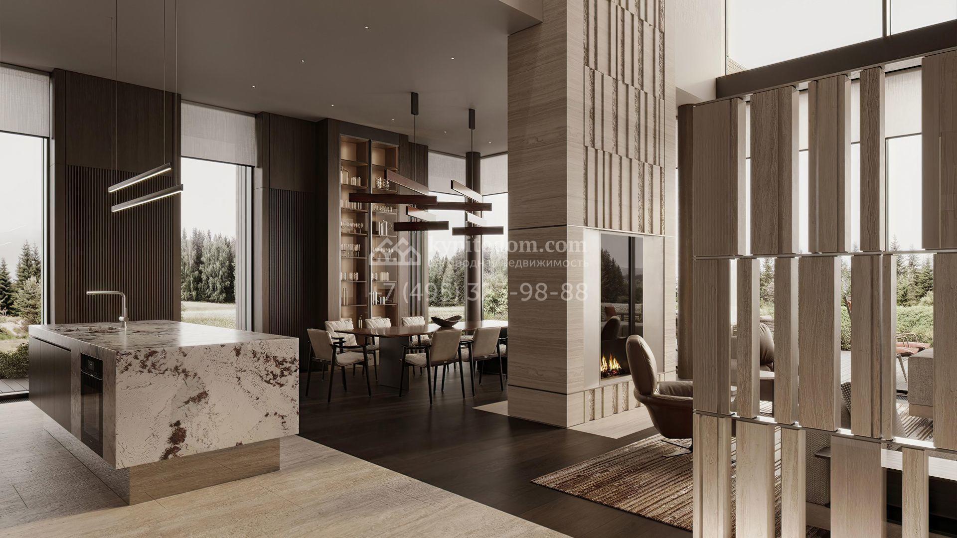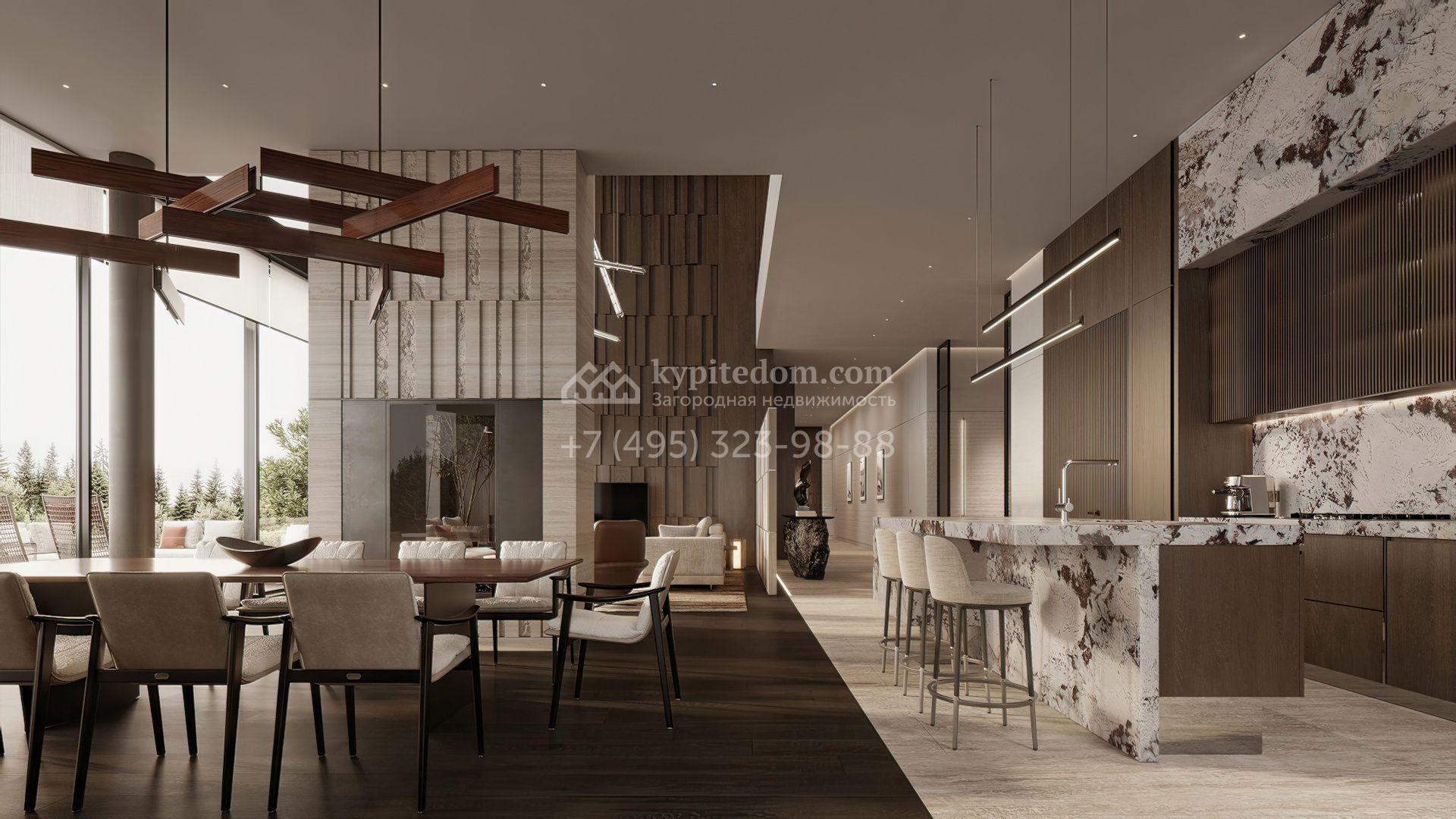 Загородная резиденция площадью 1181 м² расположена на участке 35 соток. Современный фасад с панорамными окнами, оформленный в сдержанных серых тонах, облицован доломитом, керамогранитом и панелями с фактурой дерева. Свободная планировка дома позволяет организовать пространство по собственному усмотрению. Дополнительно предусмотрена возможность реализации дизайн-проекта от застройщика.