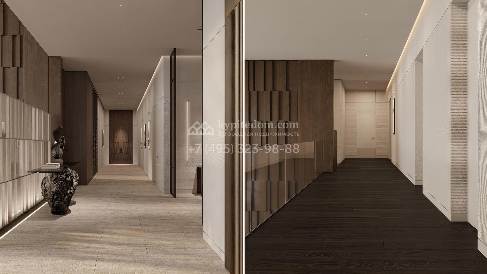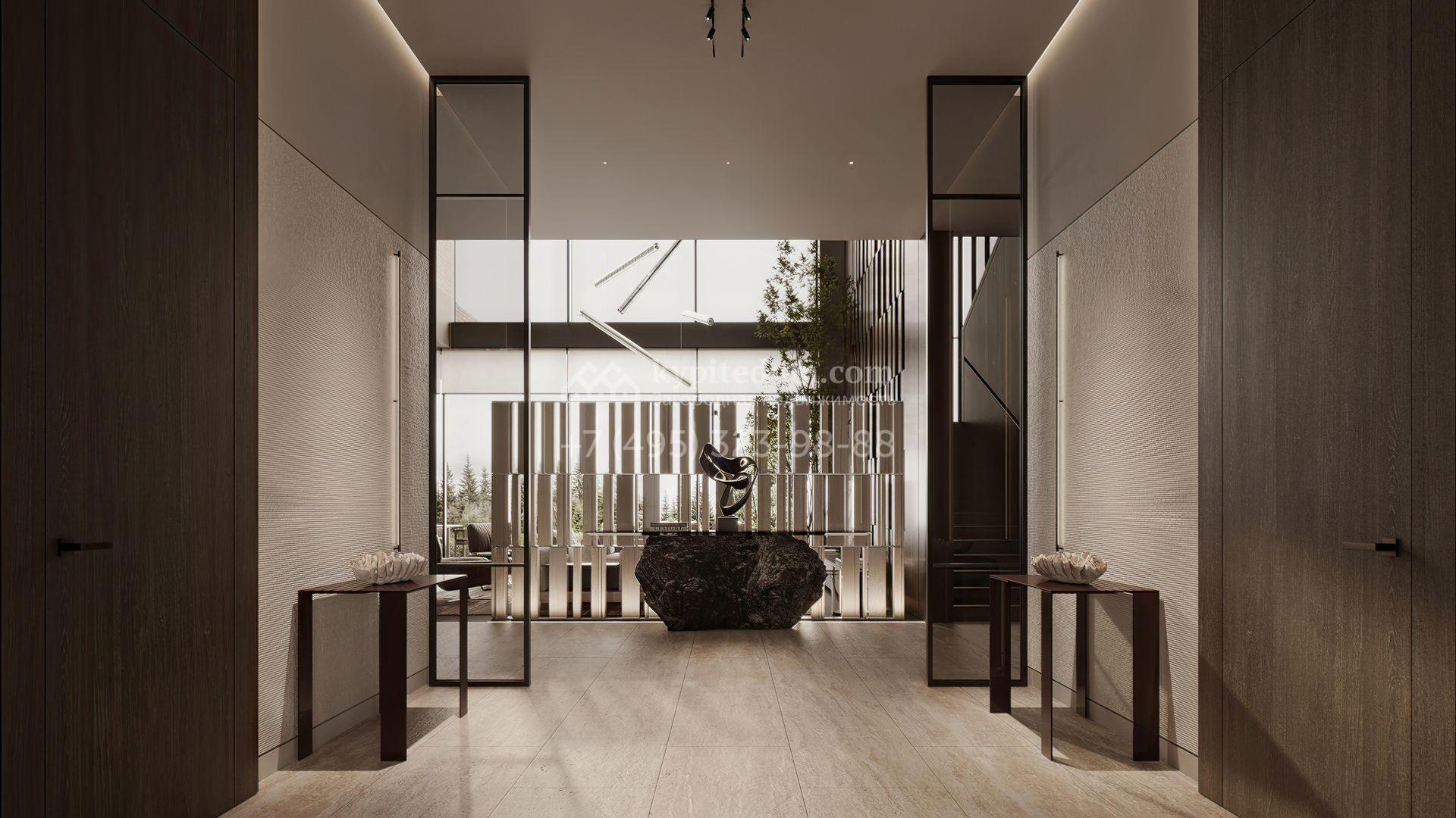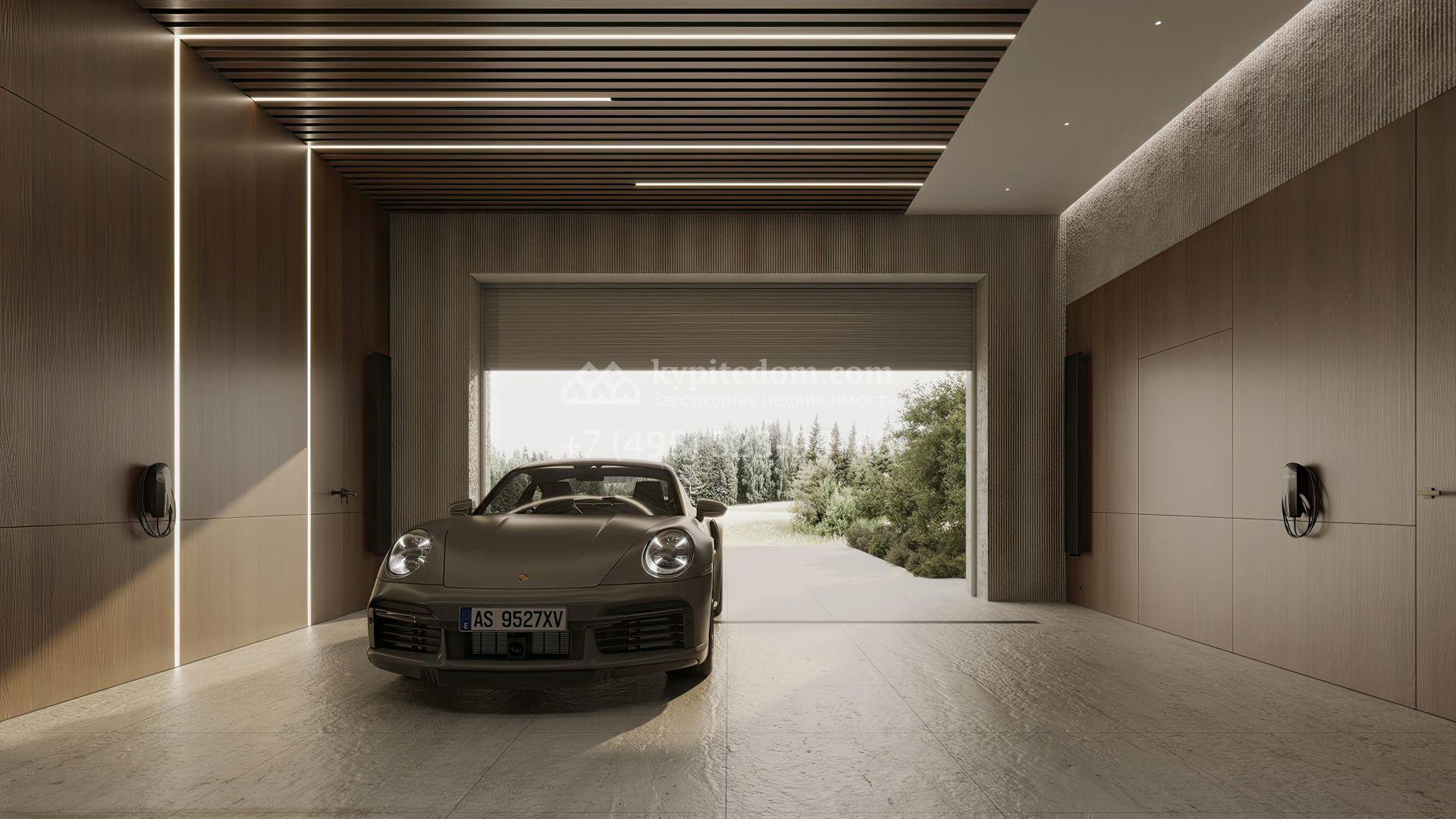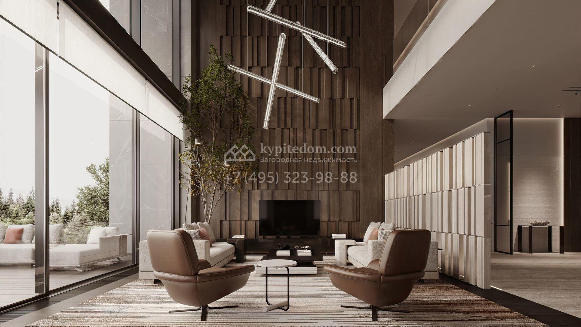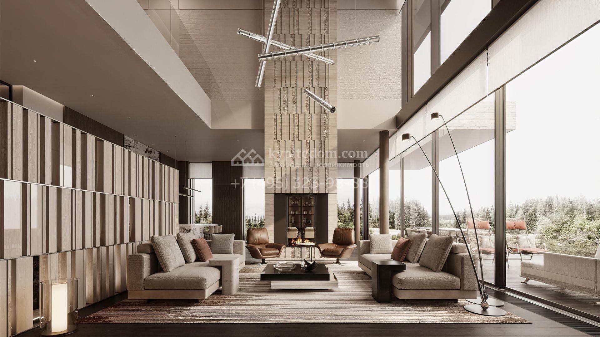 Загородная резиденция площадью 1181 м² расположена на участке 35 соток. Современный фасад с панорамными окнами, оформленный в сдержанных серых тонах, облицован доломитом, керамогранитом и панелями с фактурой дерева. Свободная планировка дома позволяет организовать пространство по собственному усмотрению. Дополнительно предусмотрена возможность реализации дизайн-проекта от застройщика.