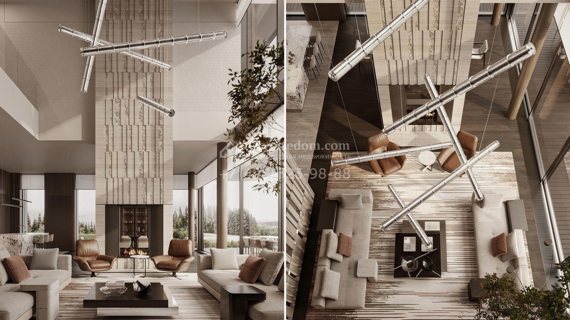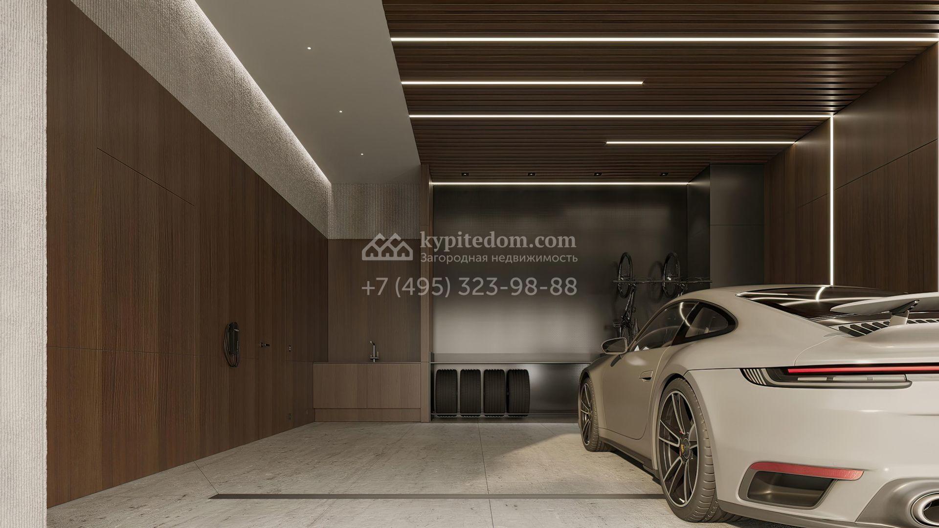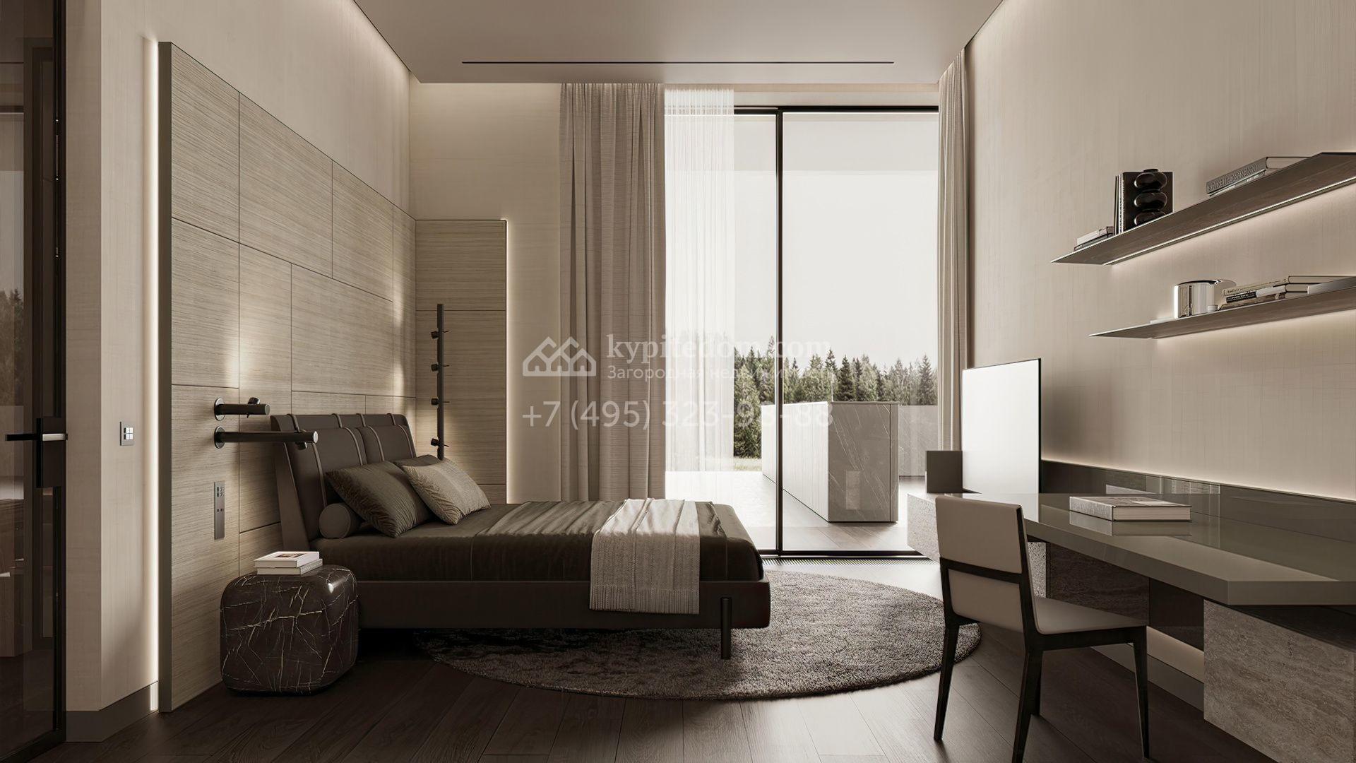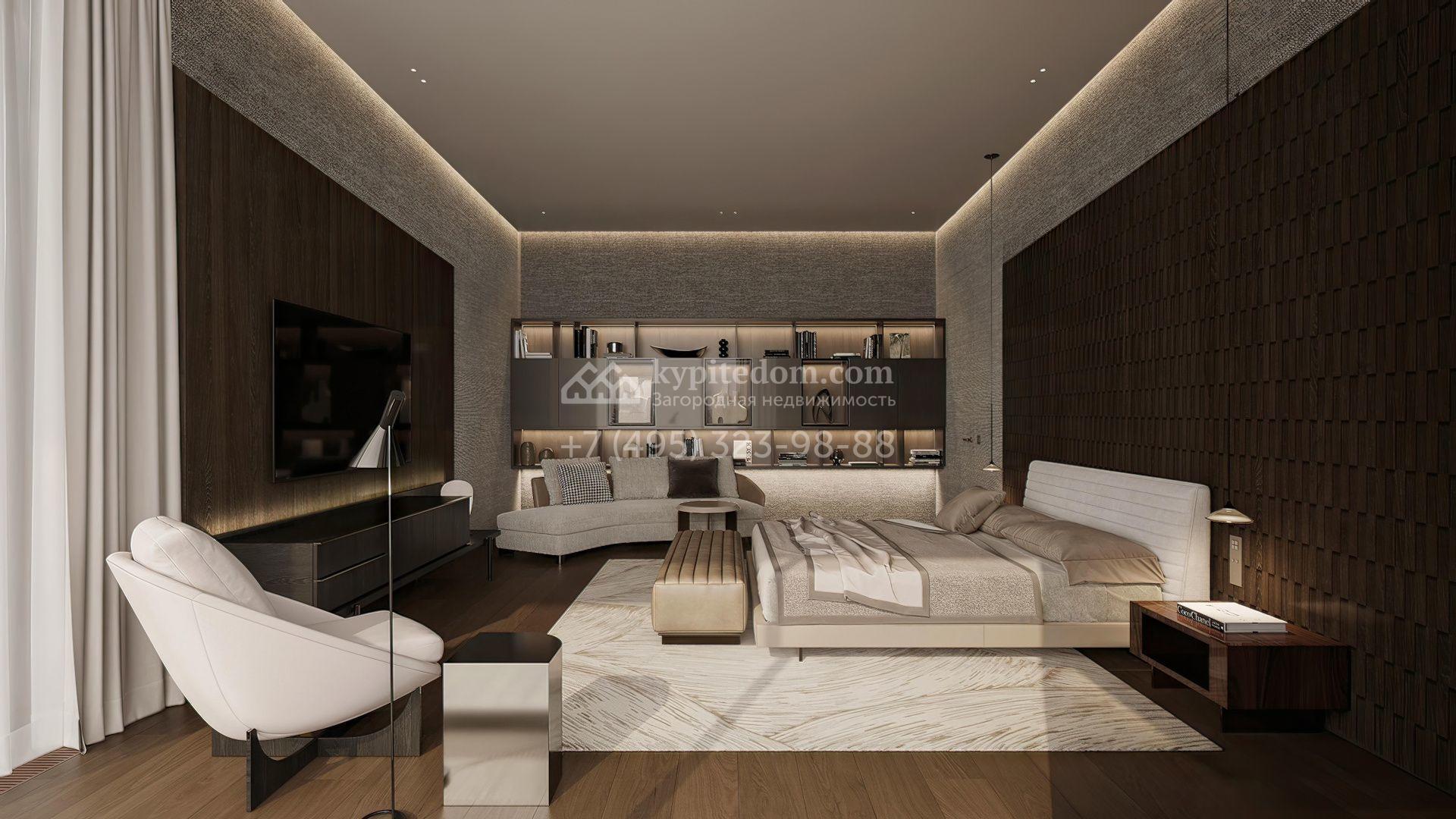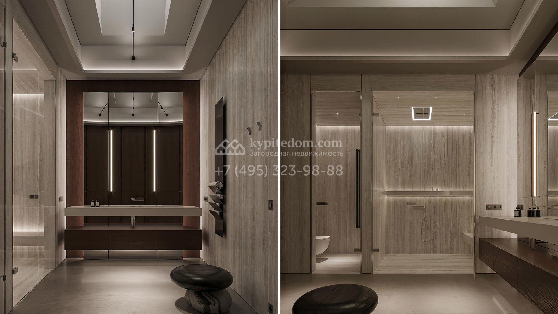 Загородная резиденция площадью 1181 м² расположена на участке 35 соток. Современный фасад с панорамными окнами, оформленный в сдержанных серых тонах, облицован доломитом, керамогранитом и панелями с фактурой дерева. Свободная планировка дома позволяет организовать пространство по собственному усмотрению. Дополнительно предусмотрена возможность реализации дизайн-проекта от застройщика.