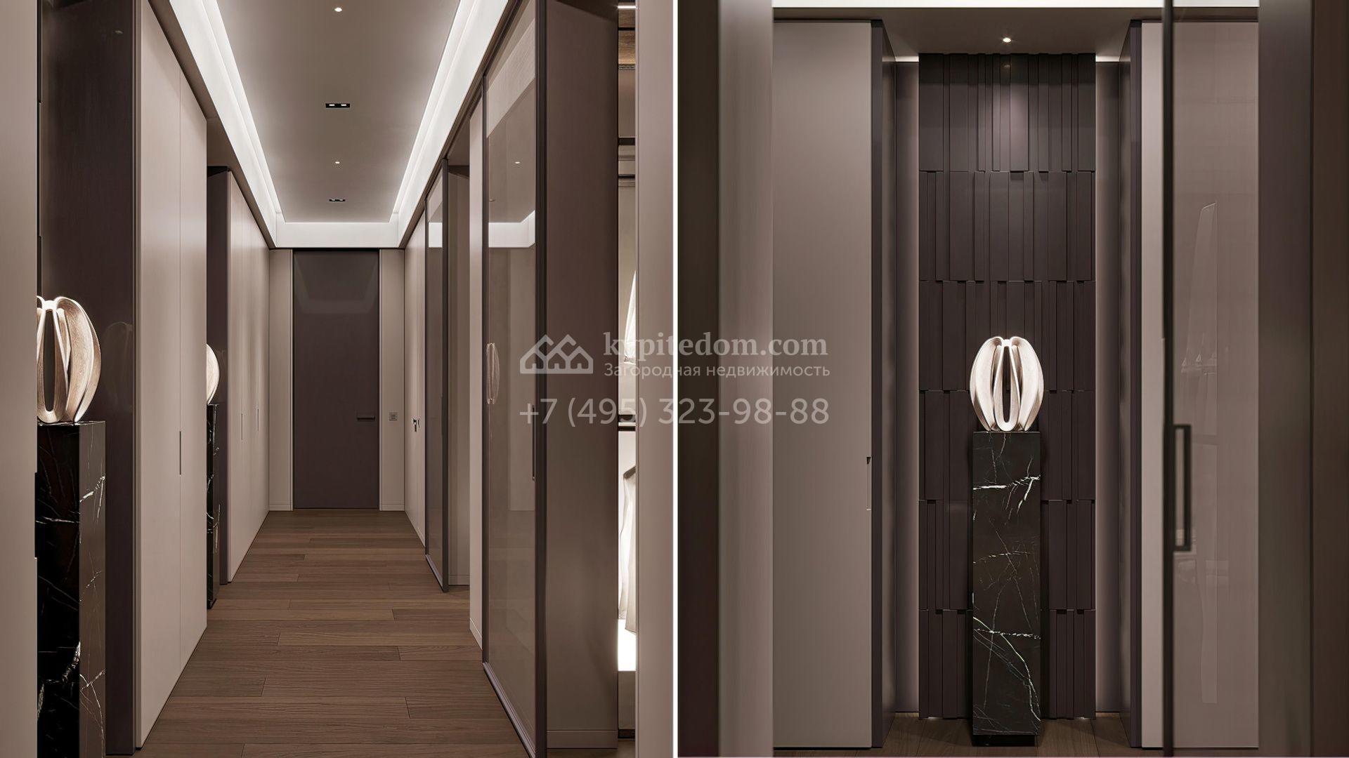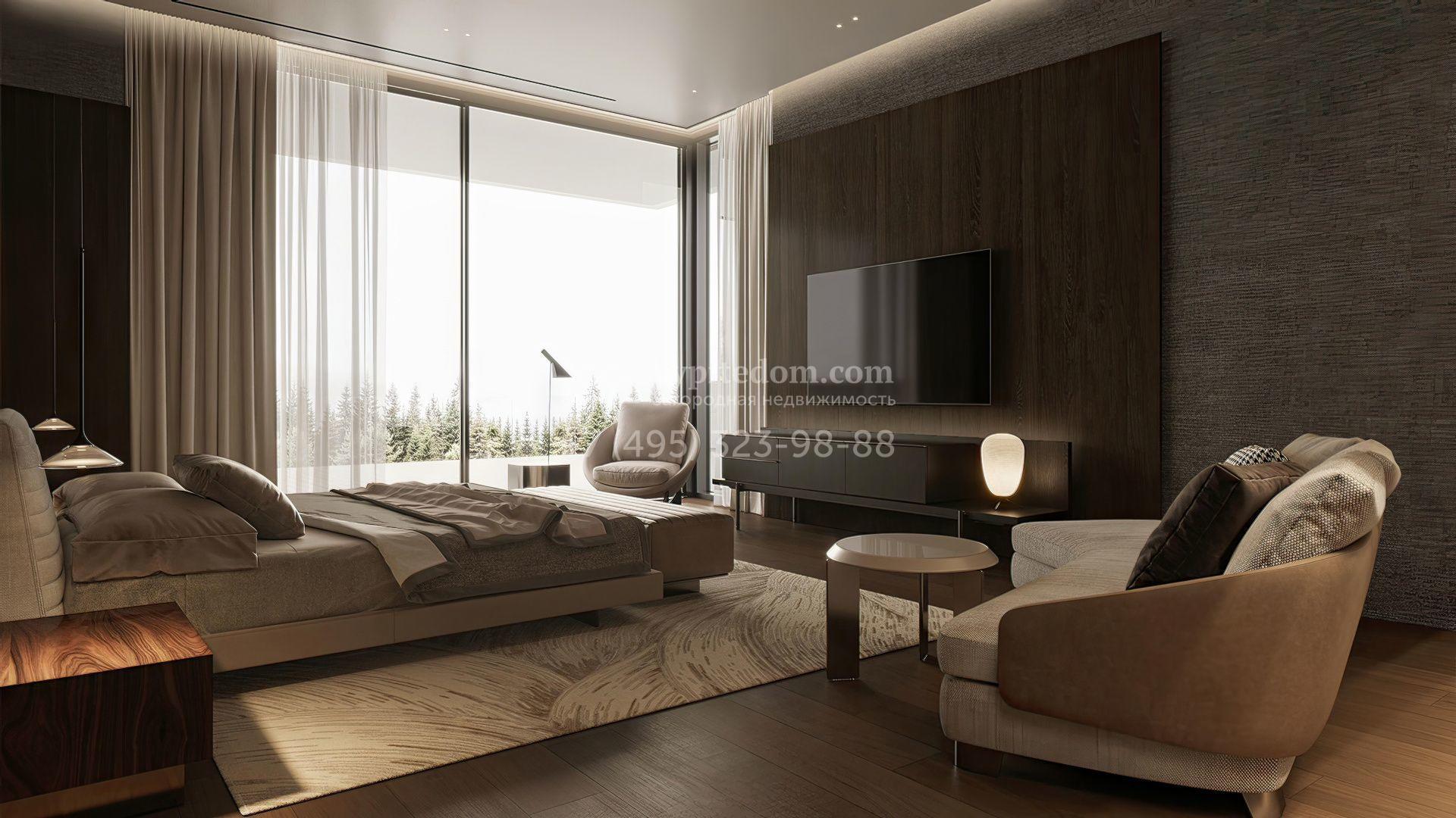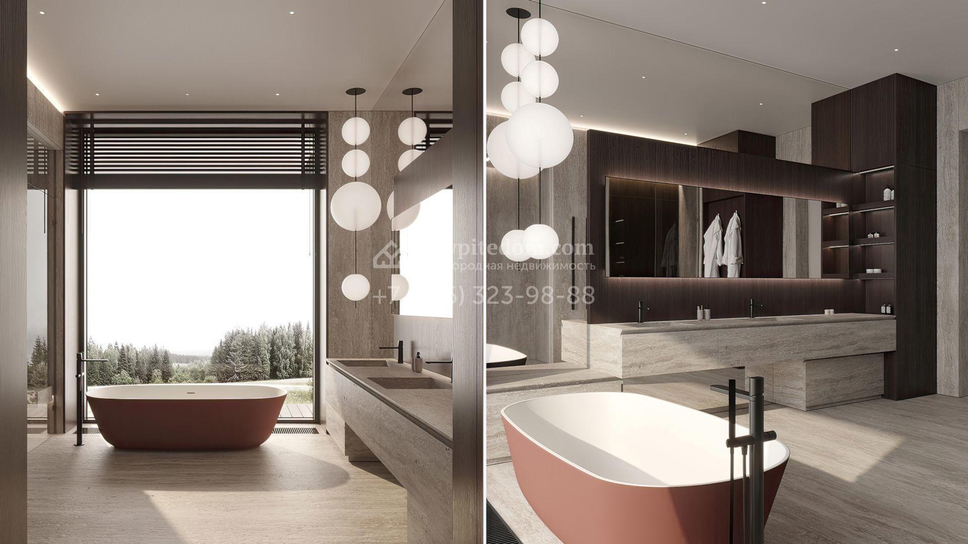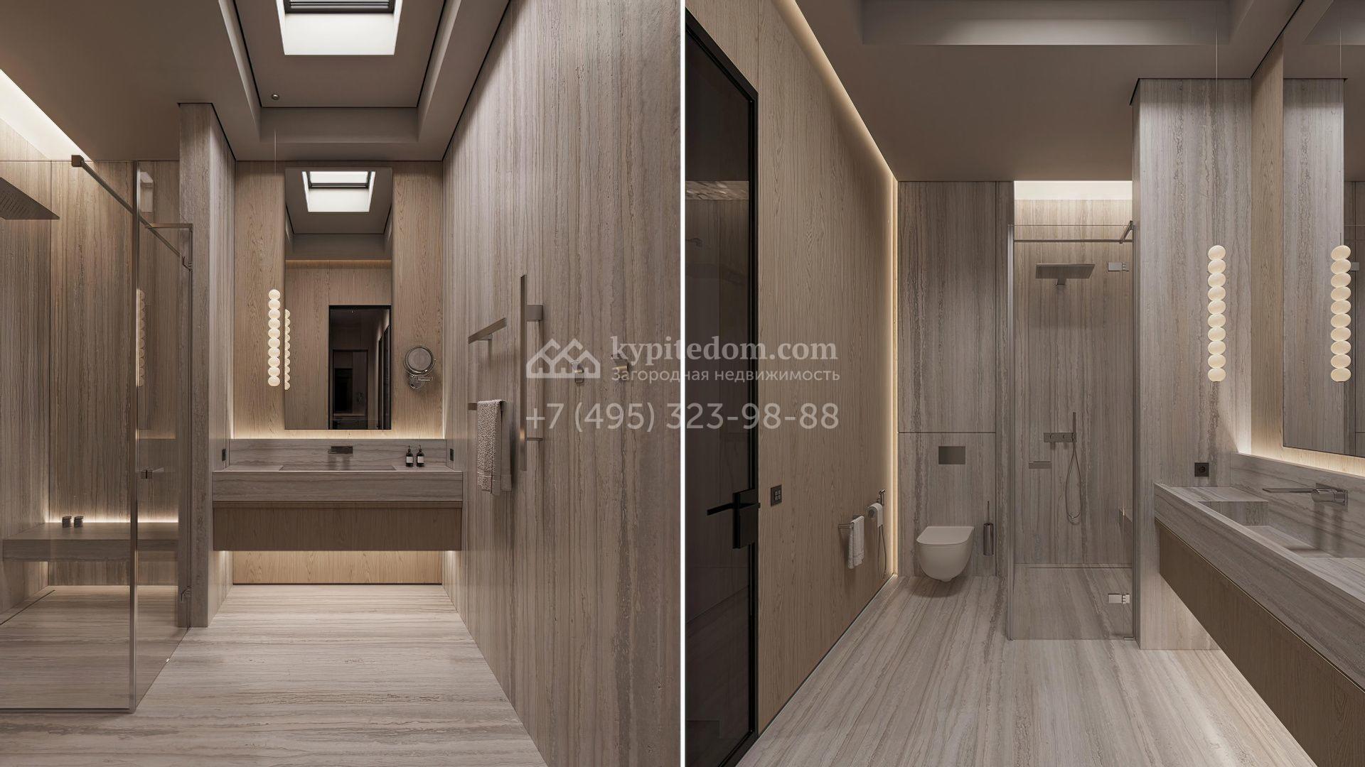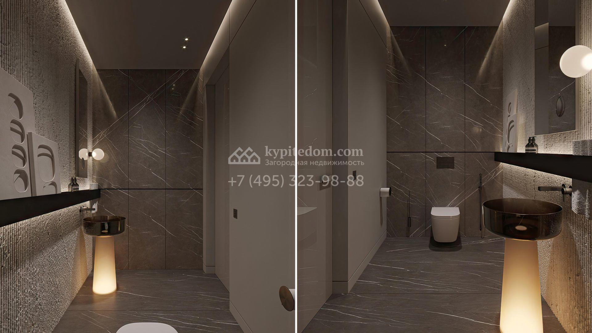 Загородная резиденция площадью 1181 м² расположена на участке 35 соток. Современный фасад с панорамными окнами, оформленный в сдержанных серых тонах, облицован доломитом, керамогранитом и панелями с фактурой дерева. Свободная планировка дома позволяет организовать пространство по собственному усмотрению. Дополнительно предусмотрена возможность реализации дизайн-проекта от застройщика.