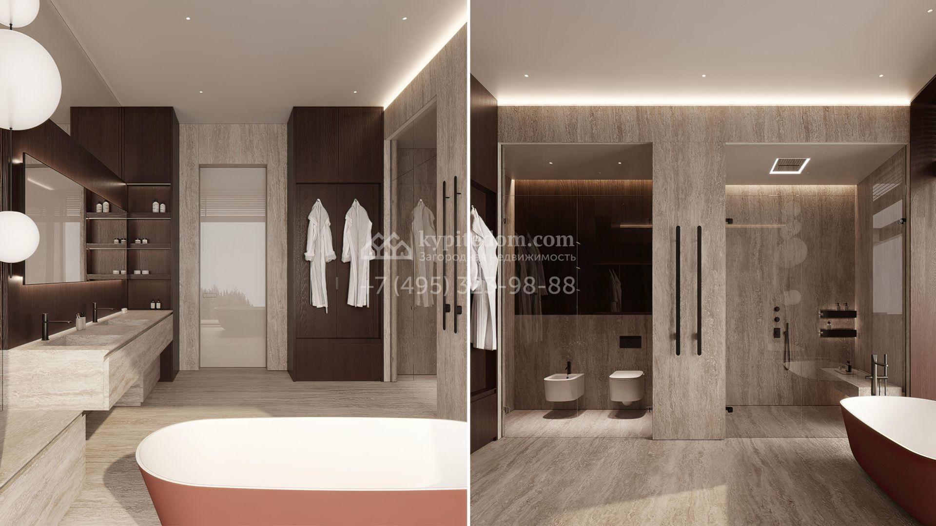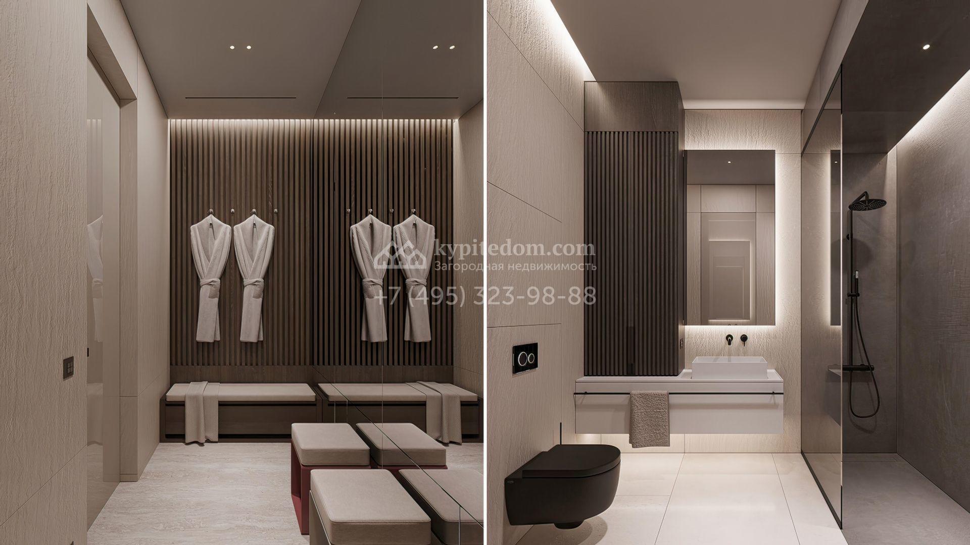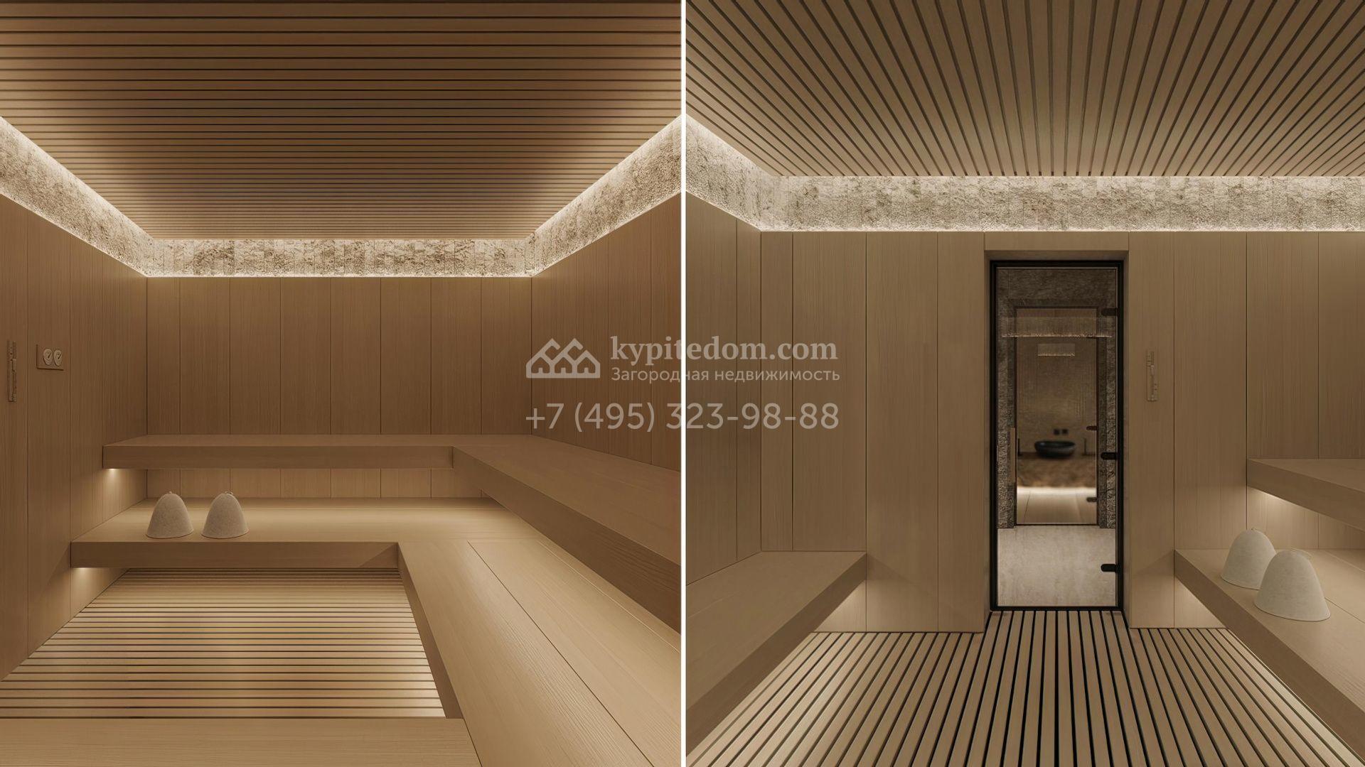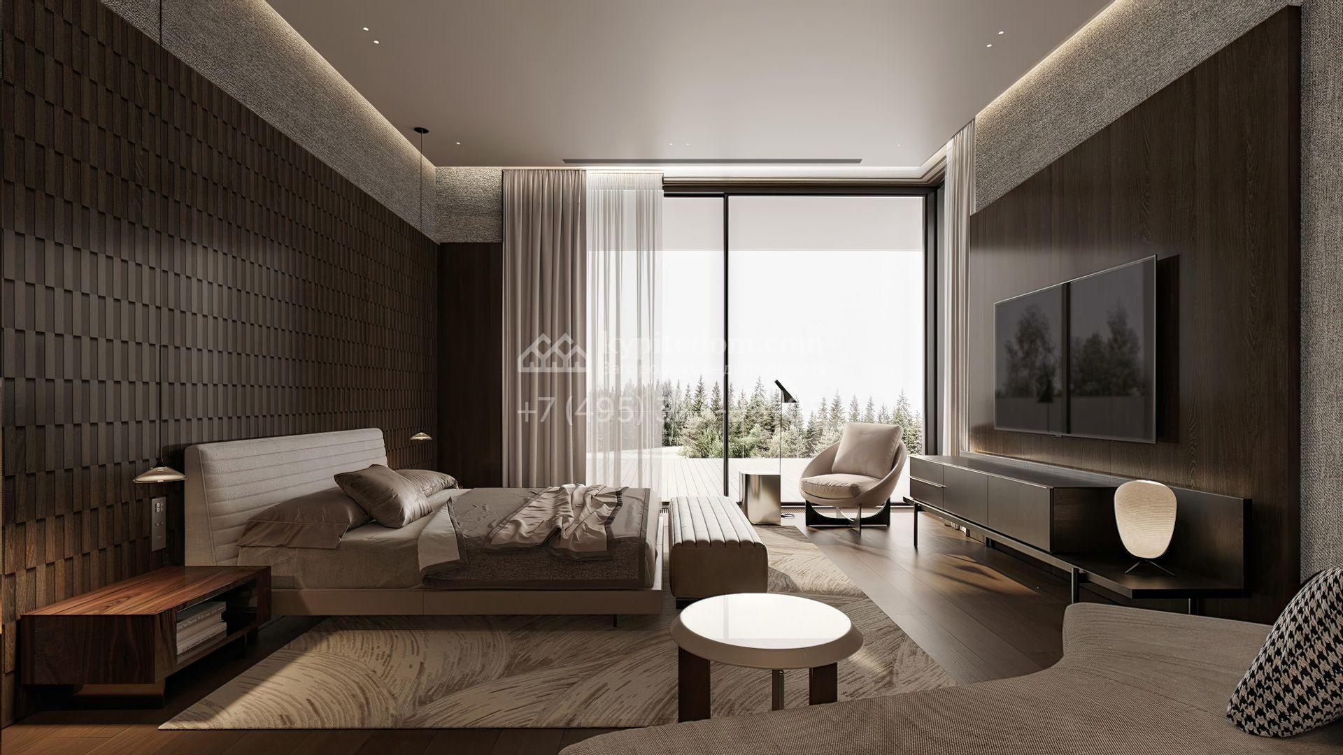 Планировка включает просторную кухню-гостиную-столовую, кабинет, 5 спален с гардеробными, 4 из которых имеют выход на индивидуальные террасы, SPA-зону с бассейном, сауной и хаммамом, а также квартиру для персонала и гараж на 2 машины. На эксплуатируемой крыше можно разместить ротанговую мебель и спроектировать уютное место для отдыха с барбекю.