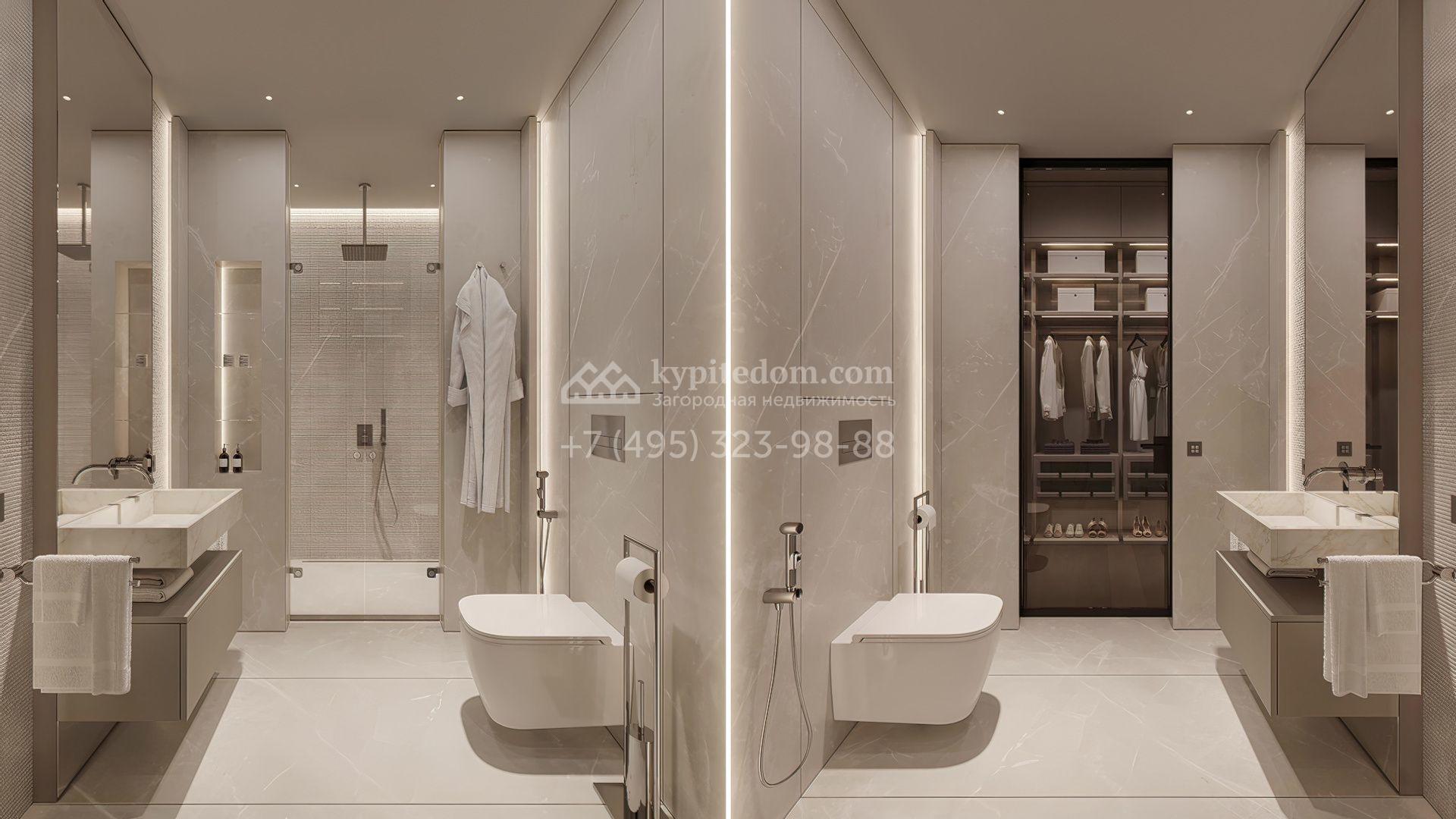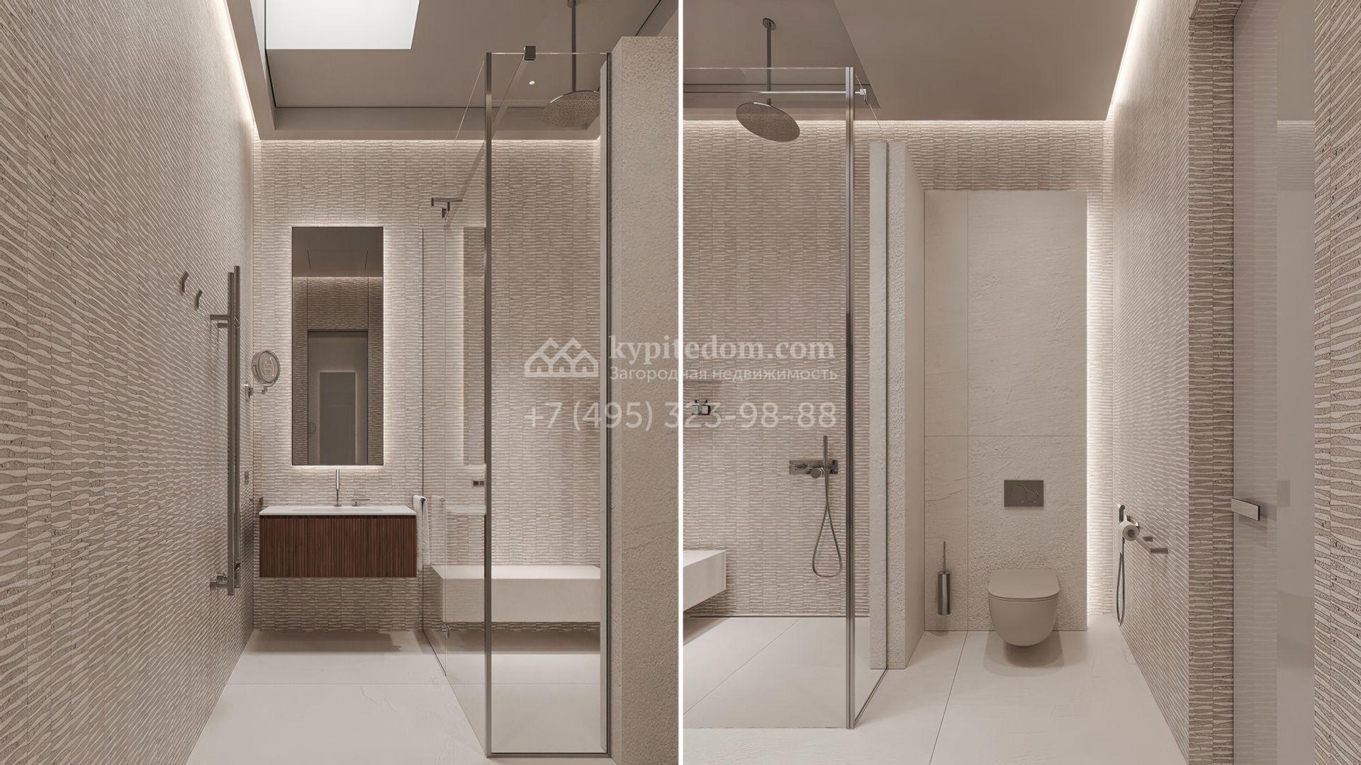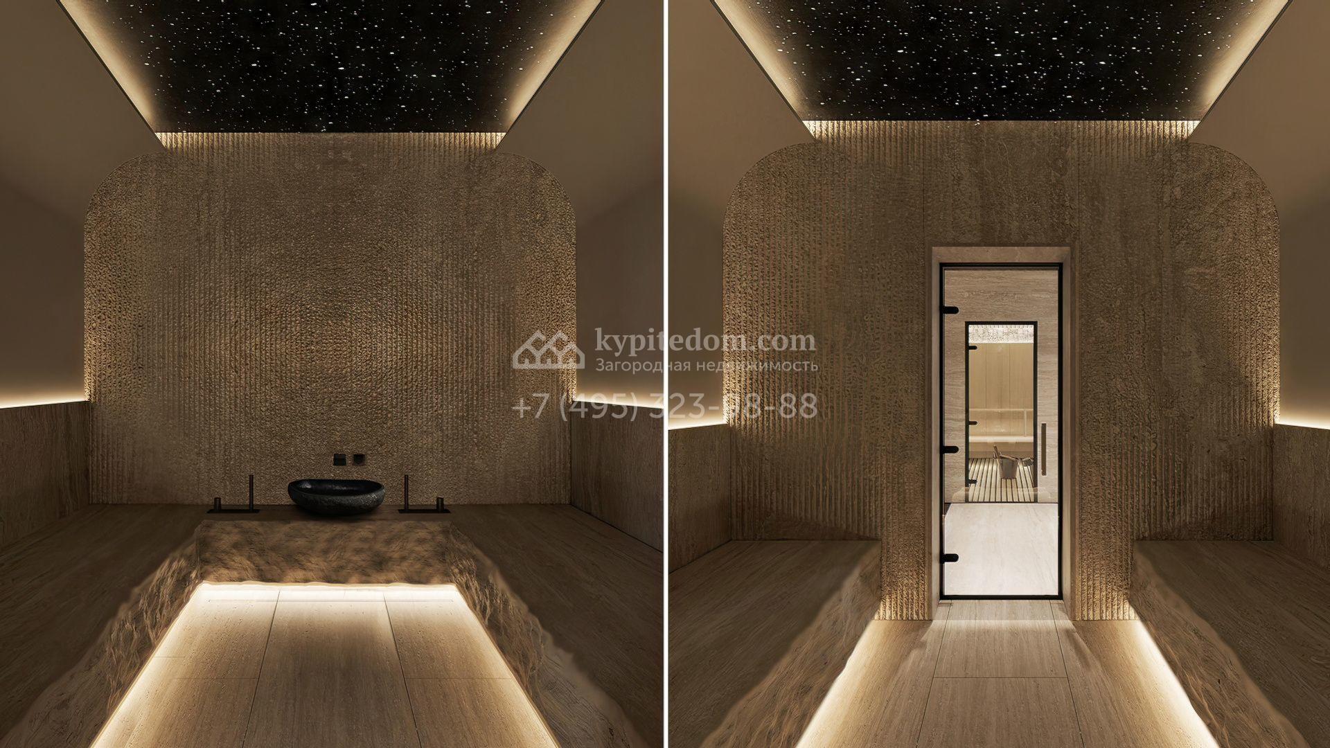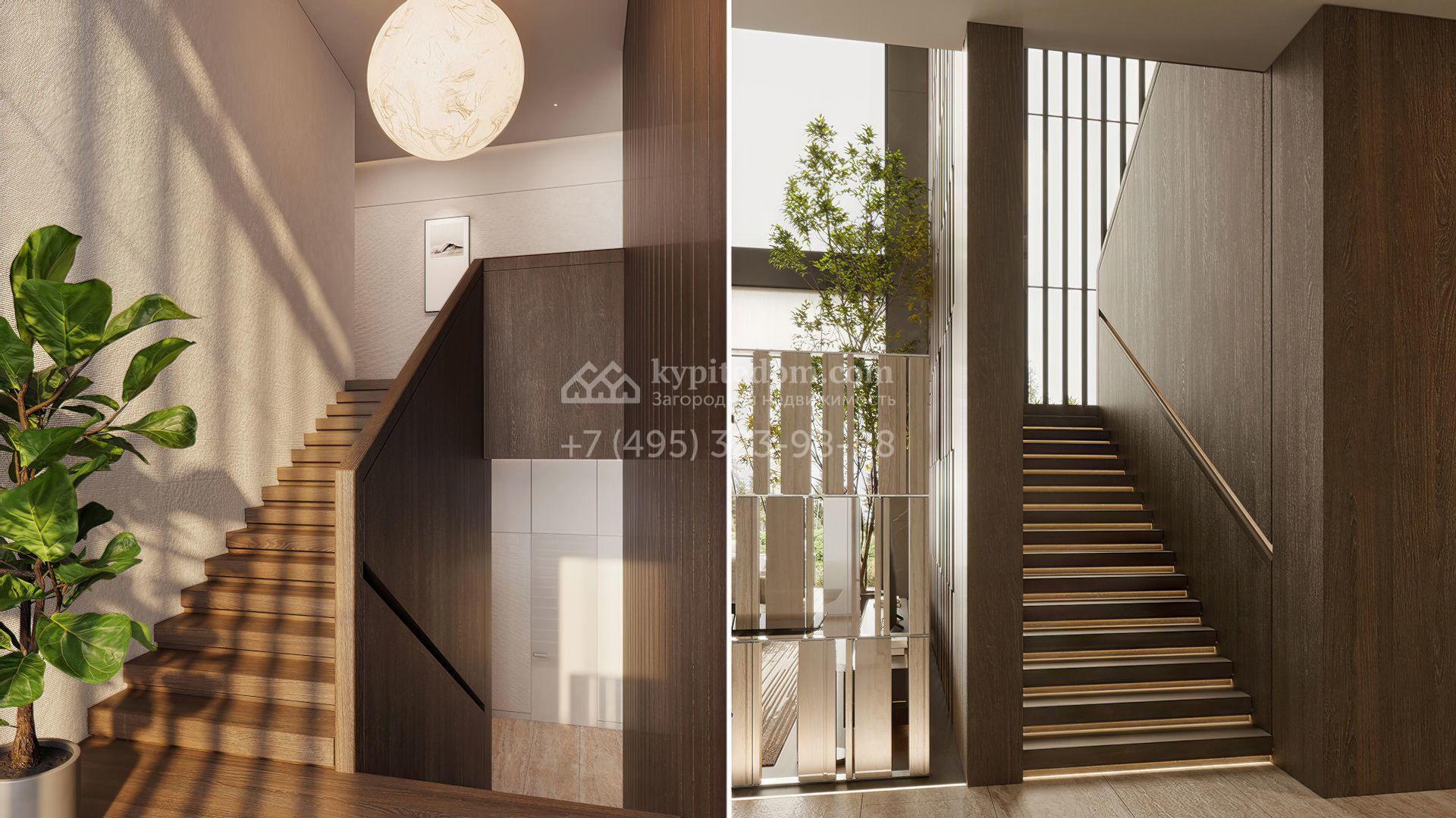 Планировка включает просторную кухню-гостиную-столовую, кабинет, 5 спален с гардеробными, 4 из которых имеют выход на индивидуальные террасы, SPA-зону с бассейном, сауной и хаммамом, а также квартиру для персонала и гараж на 2 машины. На эксплуатируемой крыше можно разместить ротанговую мебель и спроектировать уютное место для отдыха с барбекю.