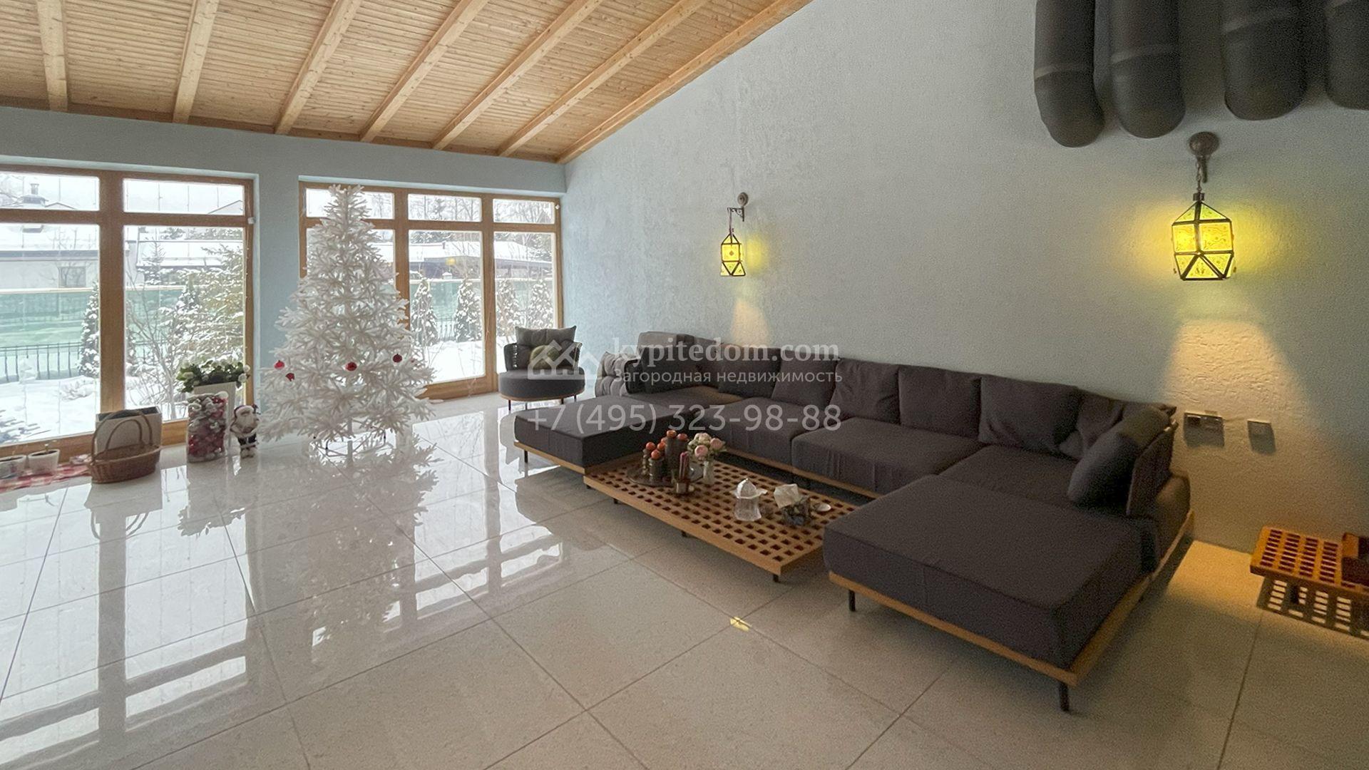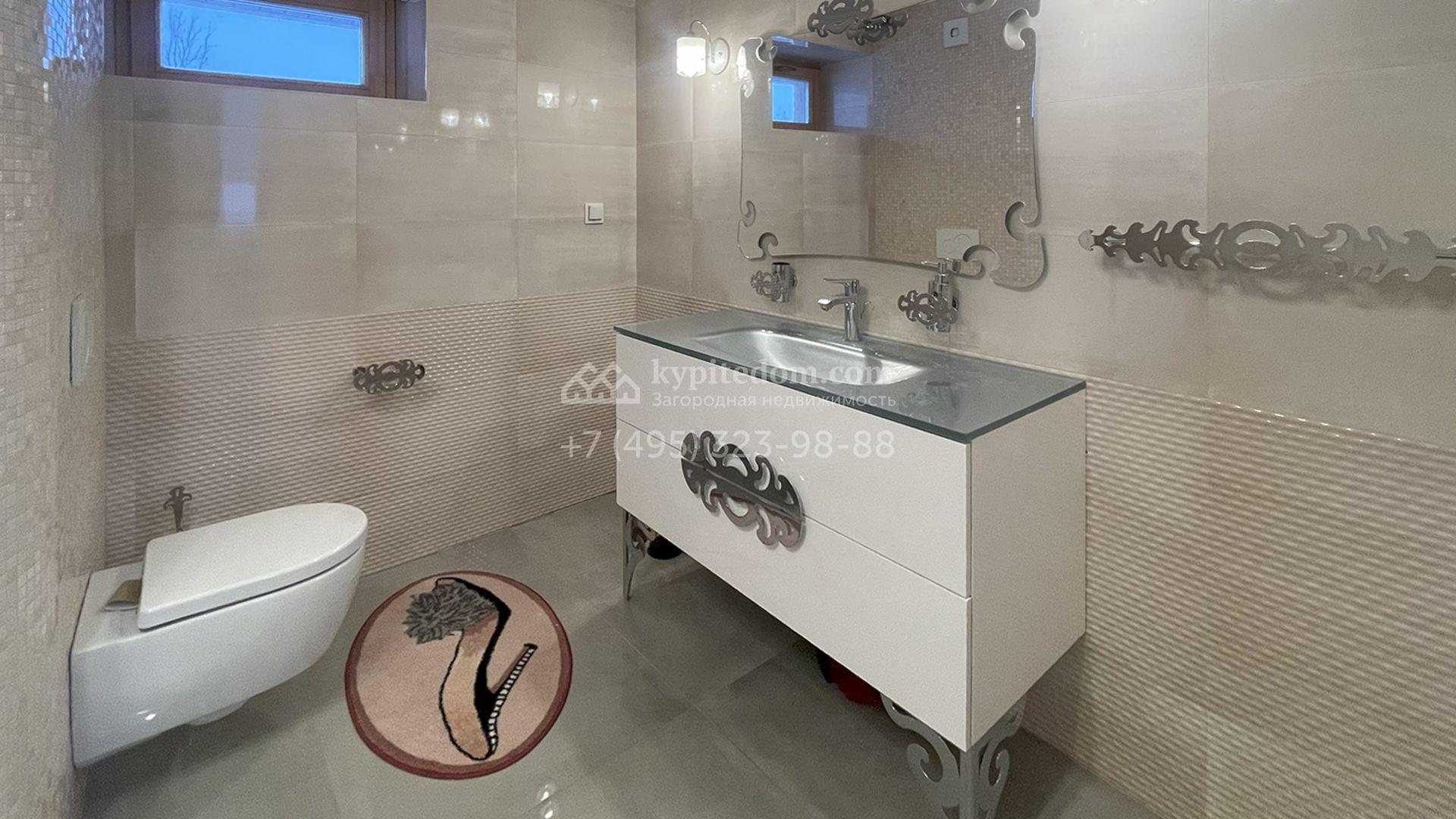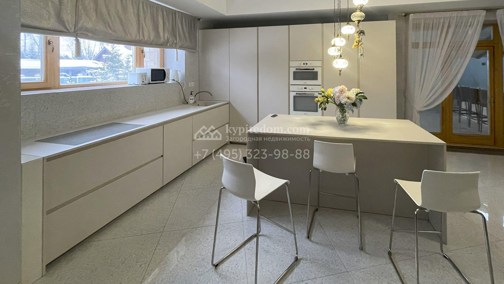 В трехуровневом особняке спланировали просторную гостиную с камином, 5 спален, оборудованную кухню, спа-зону с сауной, мануальной зоной и бассейном площадью 60 м² и глубиной 1,8 метра. Также в контуре дома предусмотрен гараж. На огороженном участке засеян газон, растут хвойные и лиственные деревья, оборудованы места для отдыха.