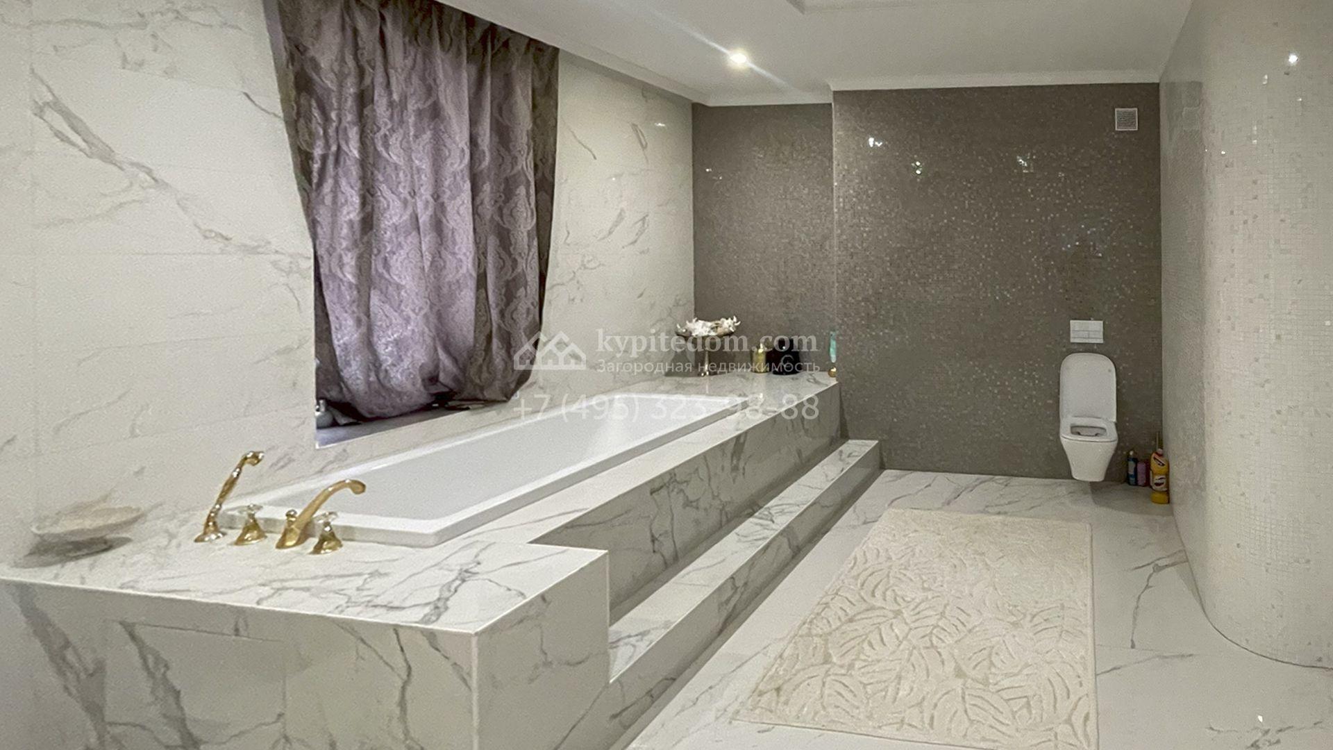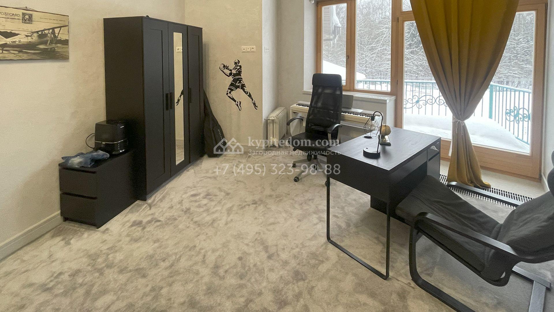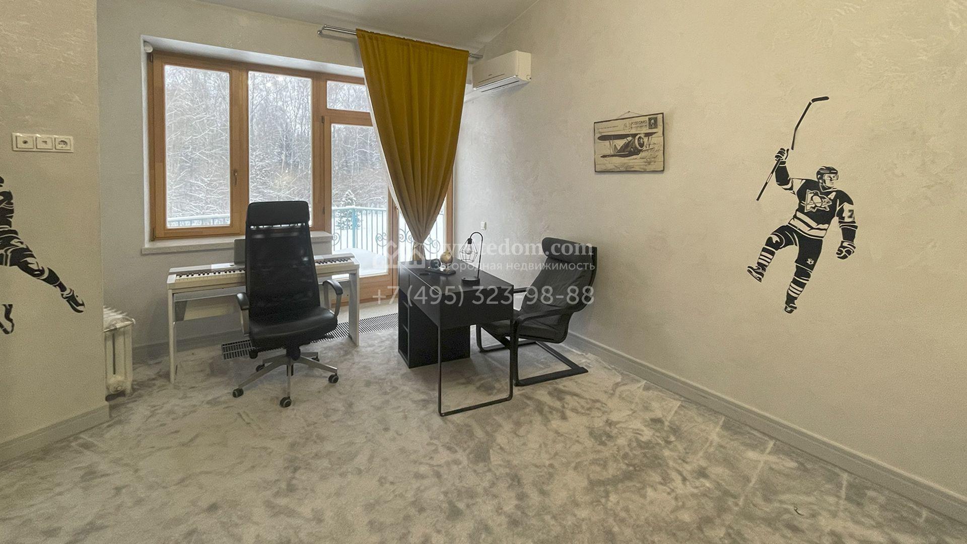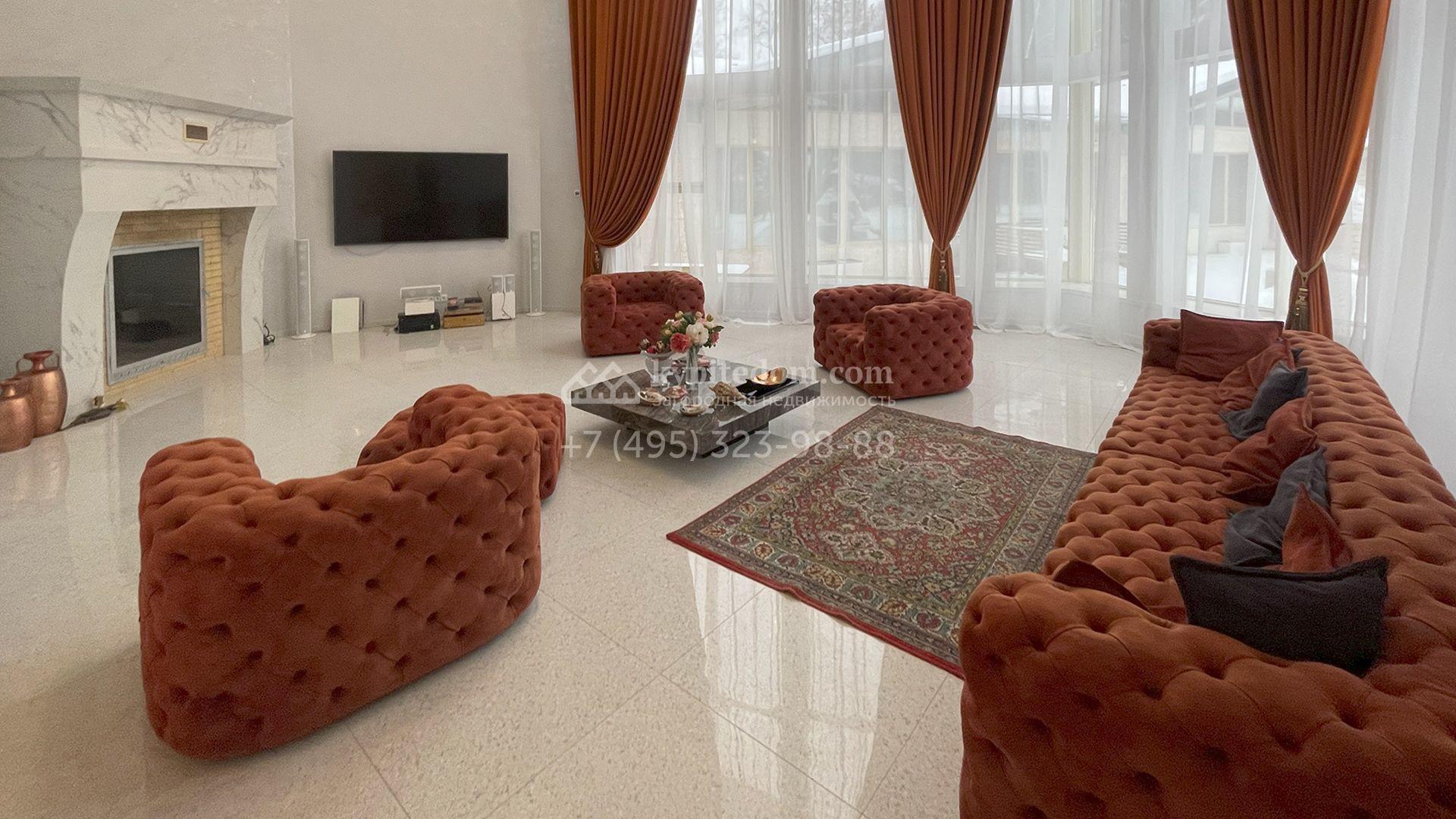 В трехуровневом особняке спланировали просторную гостиную с камином, 5 спален, оборудованную кухню, спа-зону с сауной, мануальной зоной и бассейном площадью 60 м² и глубиной 1,8 метра. Также в контуре дома предусмотрен гараж. На огороженном участке засеян газон, растут хвойные и лиственные деревья, оборудованы места для отдыха.