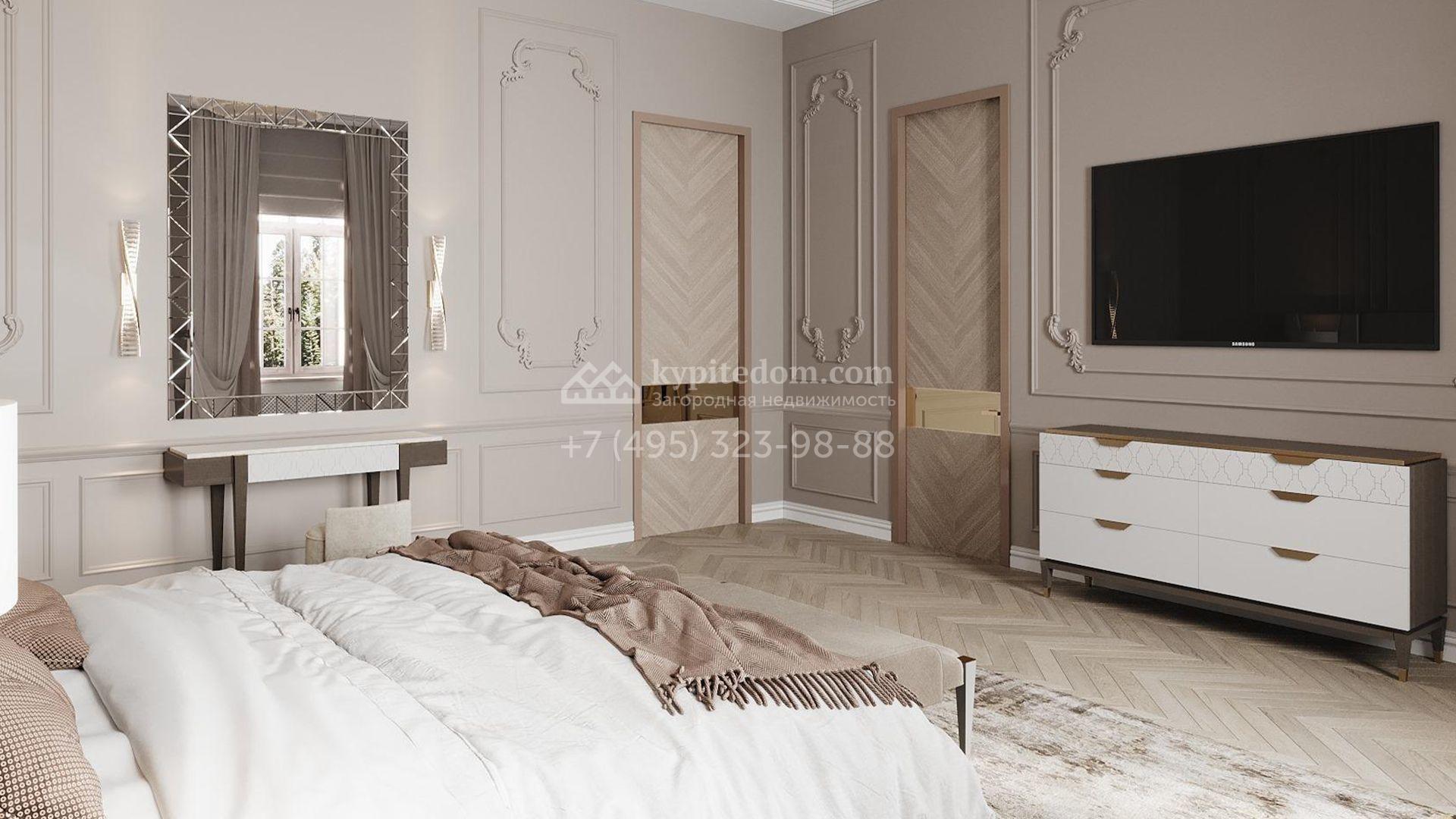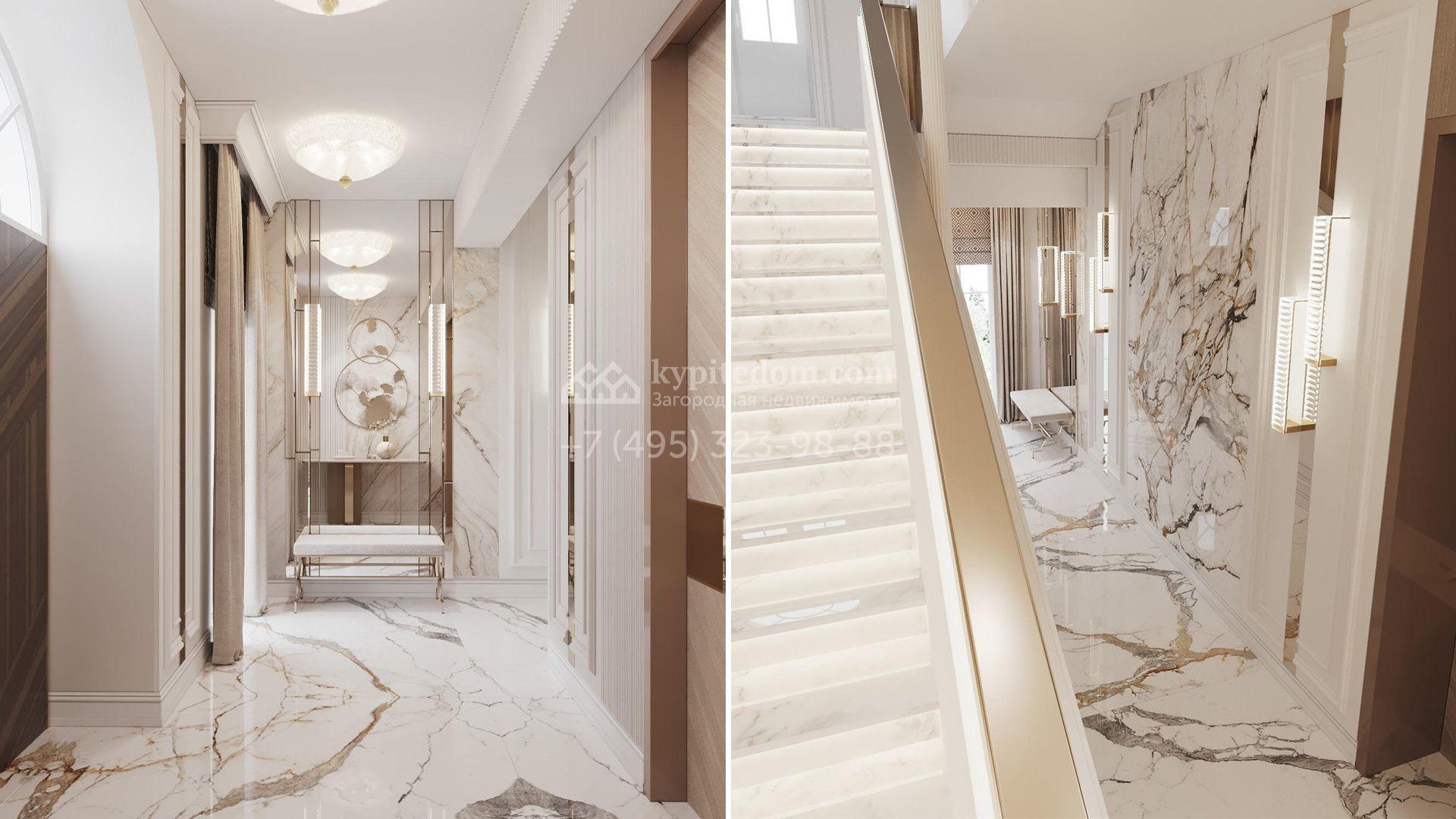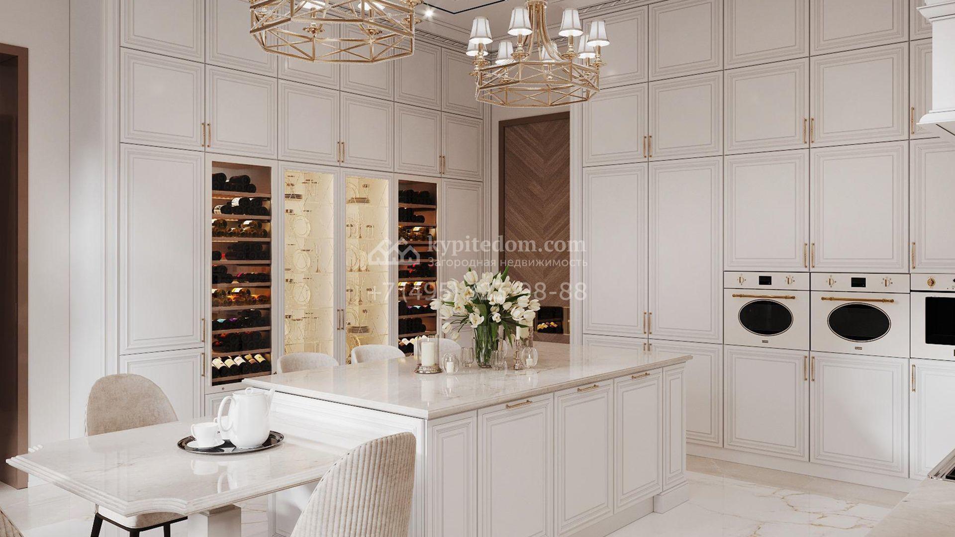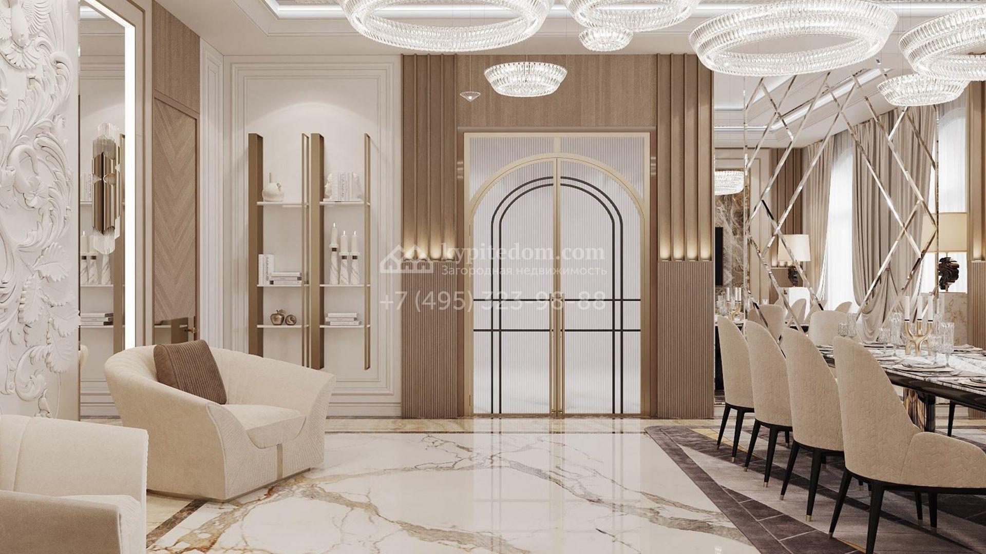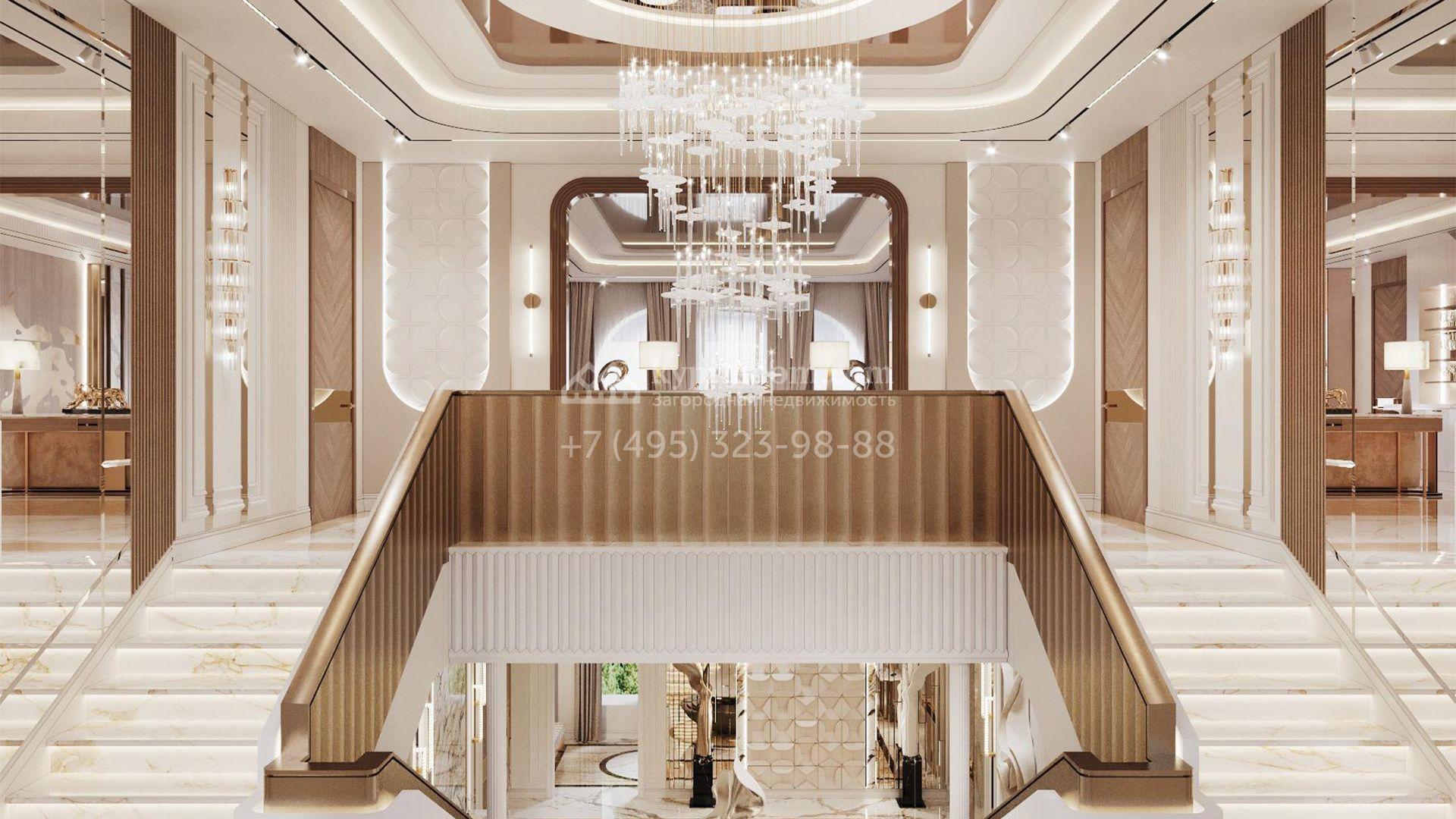 Загородная резиденция площадью 1411 м² расположена на живописном лесном участке 30 соток. Симметричный фасад построен в элегантном классическом стиле и дополнен колоннами — его можно облицевать белоснежной штукатуркой и украсить лепниной, молдингами и балясинами. Отсутствие отделки позволяет будущим владельцам оформить интерьеры на свой вкус или же воспользоваться готовым дизайн-проектом от архитектурного бюро Dempire.