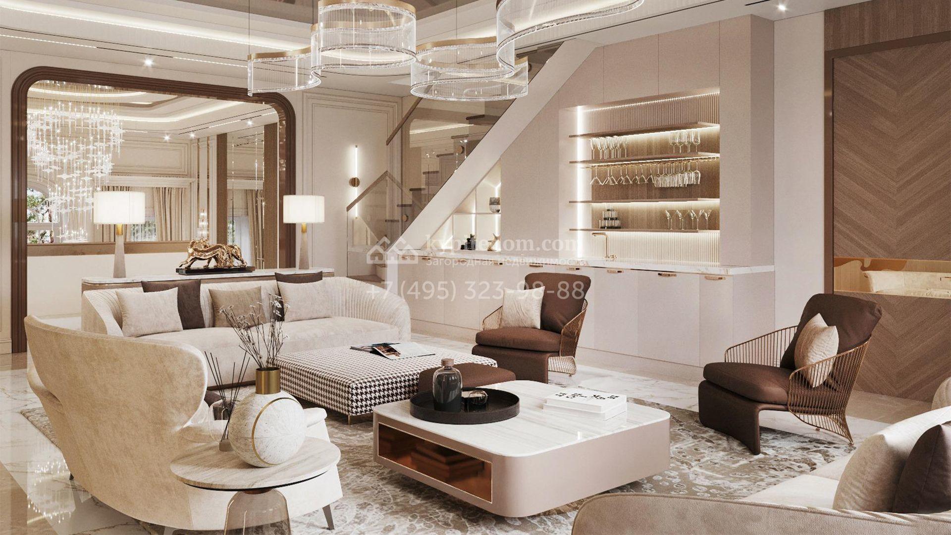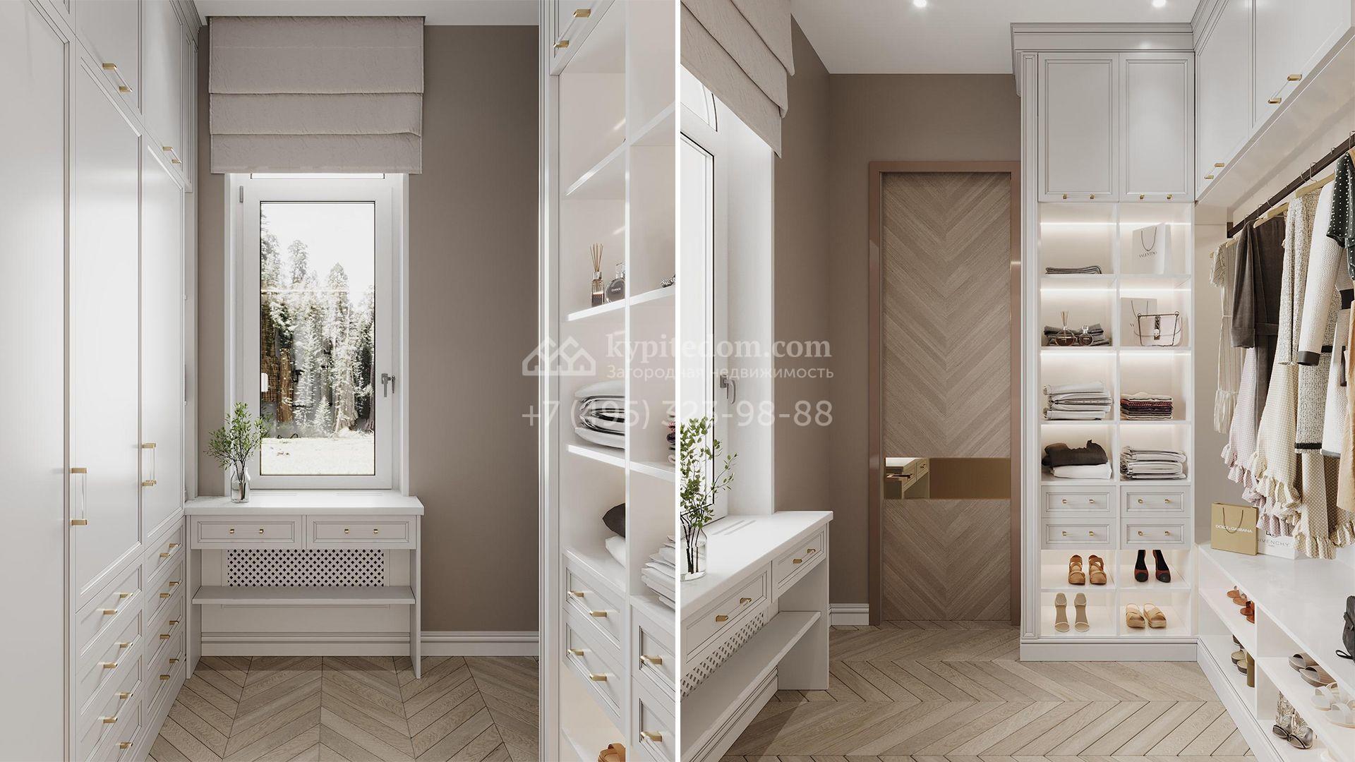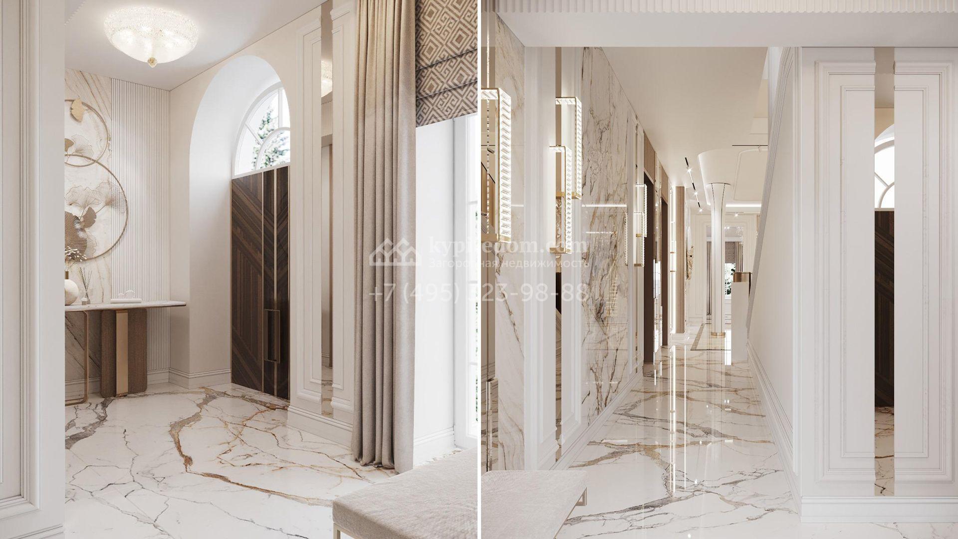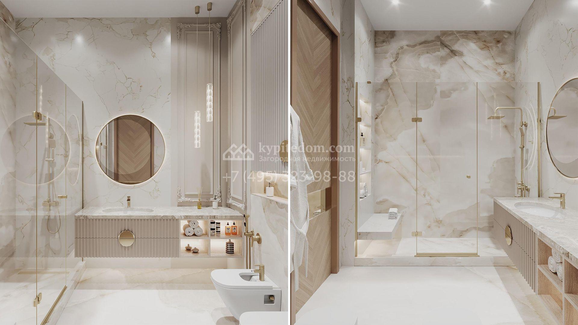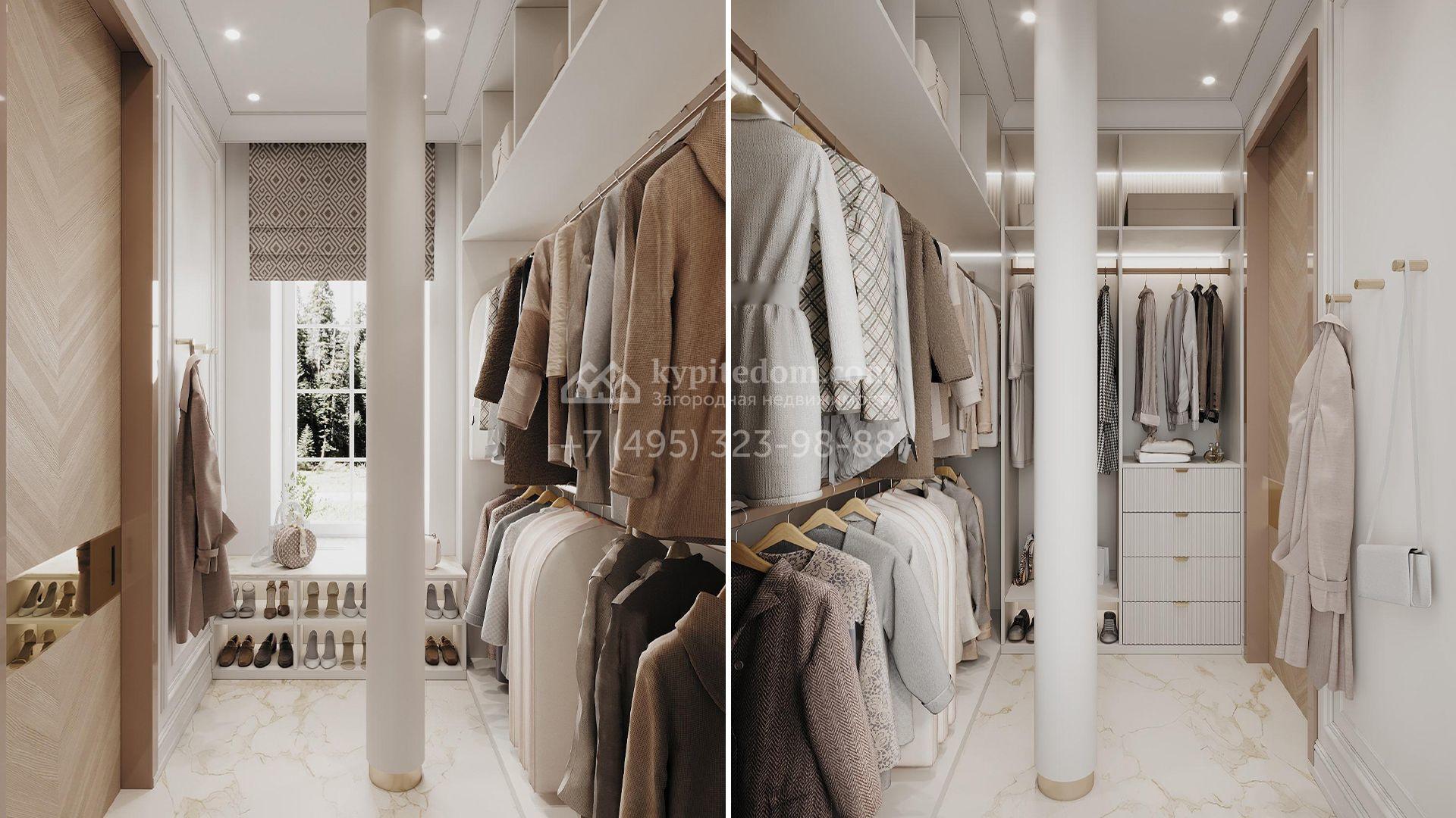 Загородная резиденция площадью 1411 м² расположена на живописном лесном участке 30 соток. Симметричный фасад построен в элегантном классическом стиле и дополнен колоннами — его можно облицевать белоснежной штукатуркой и украсить лепниной, молдингами и балясинами. Отсутствие отделки позволяет будущим владельцам оформить интерьеры на свой вкус или же воспользоваться готовым дизайн-проектом от архитектурного бюро Dempire.