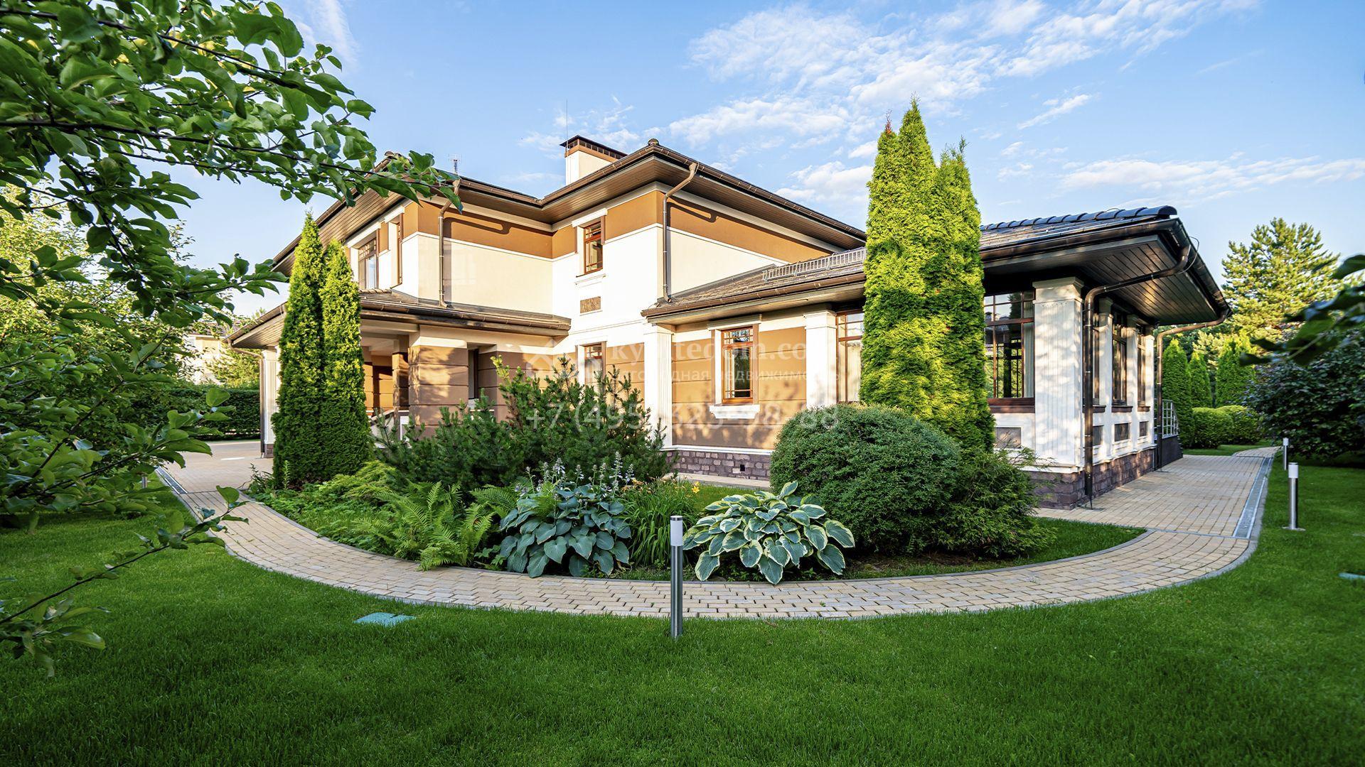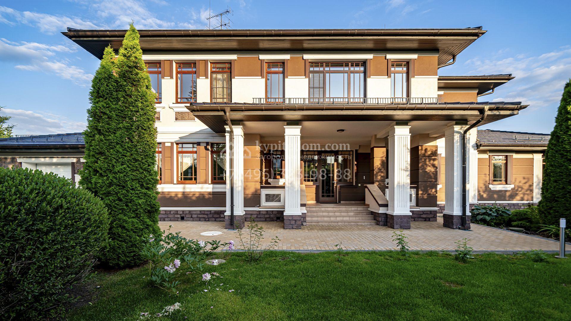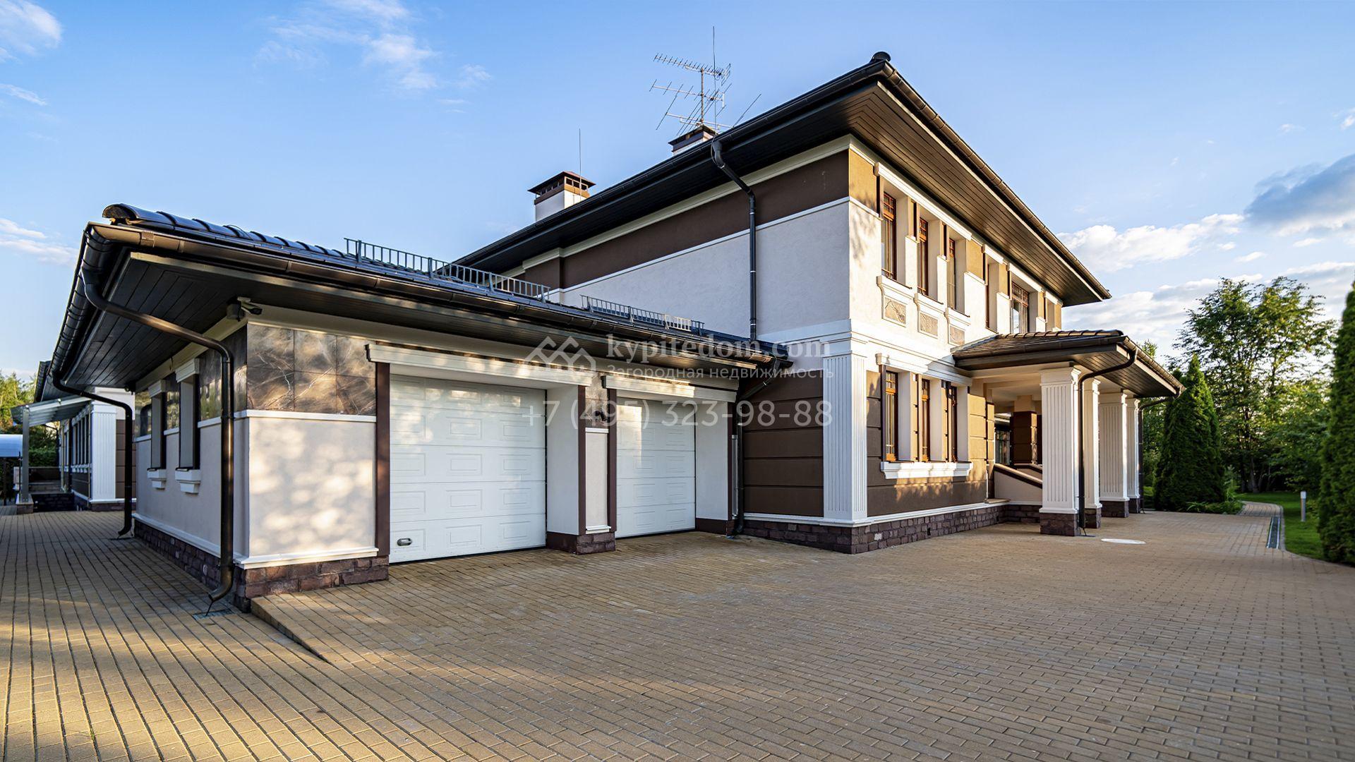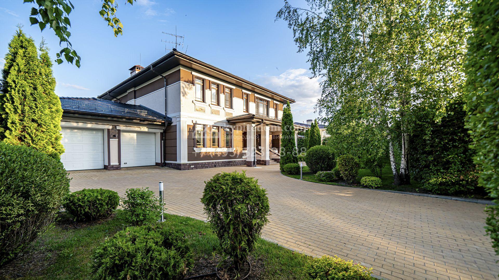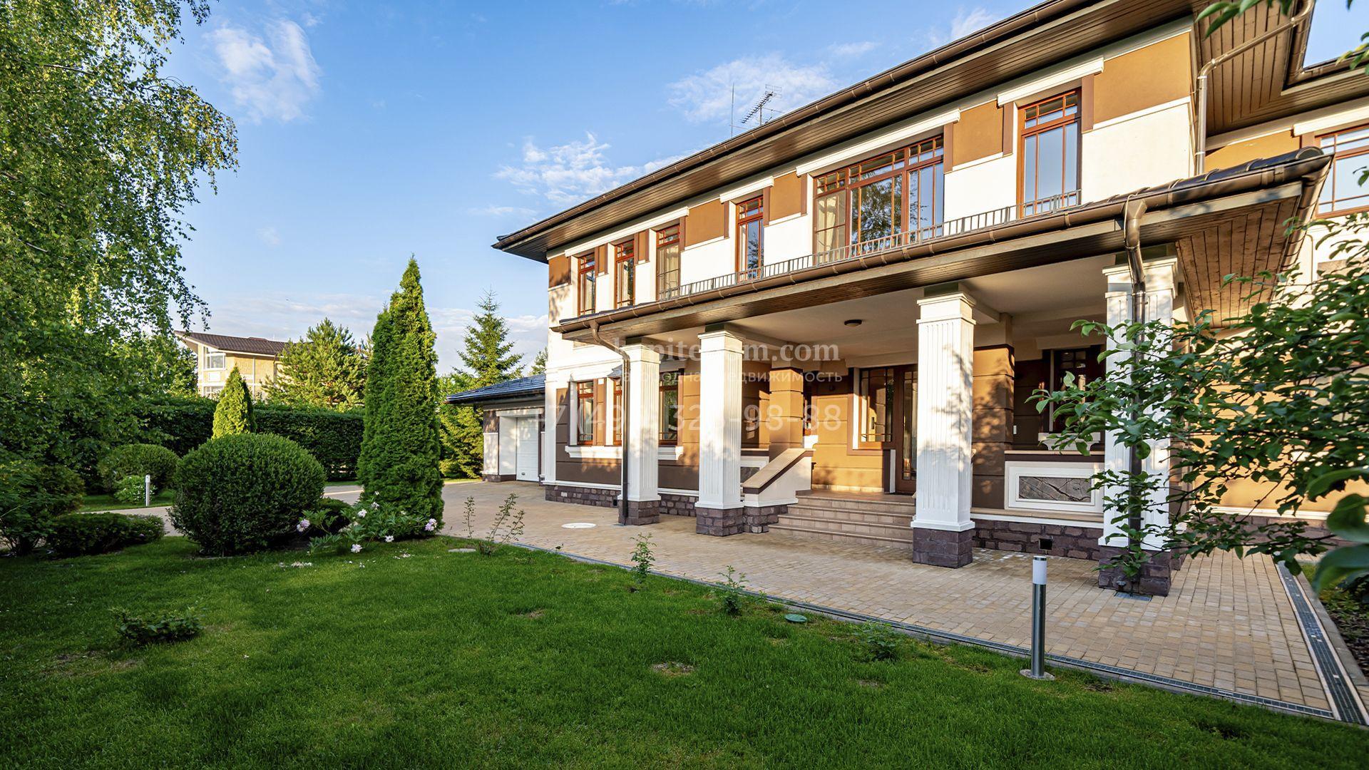 Загородная резиденция площадью 1300 м² расположена на полевом участке 31 сотка в тихой части посёлка рядом с парковой аллеей. Фасад выполнен в европейском стиле, облицован натуральным камнем и штукатуркой двух оттенков, а изящные колонны, филёнки и русты придают ему особый шарм. Современные интерьеры выдержаны в светлой гамме и отделаны с использованием оникса, гранита, мрамора и дерева. Каждая деталь продумана до мелочей — от дизайнерской мебели до премиальной бытовой техники. «Умный дом» и кондиционирование обеспечивают комфорт в любое время года.