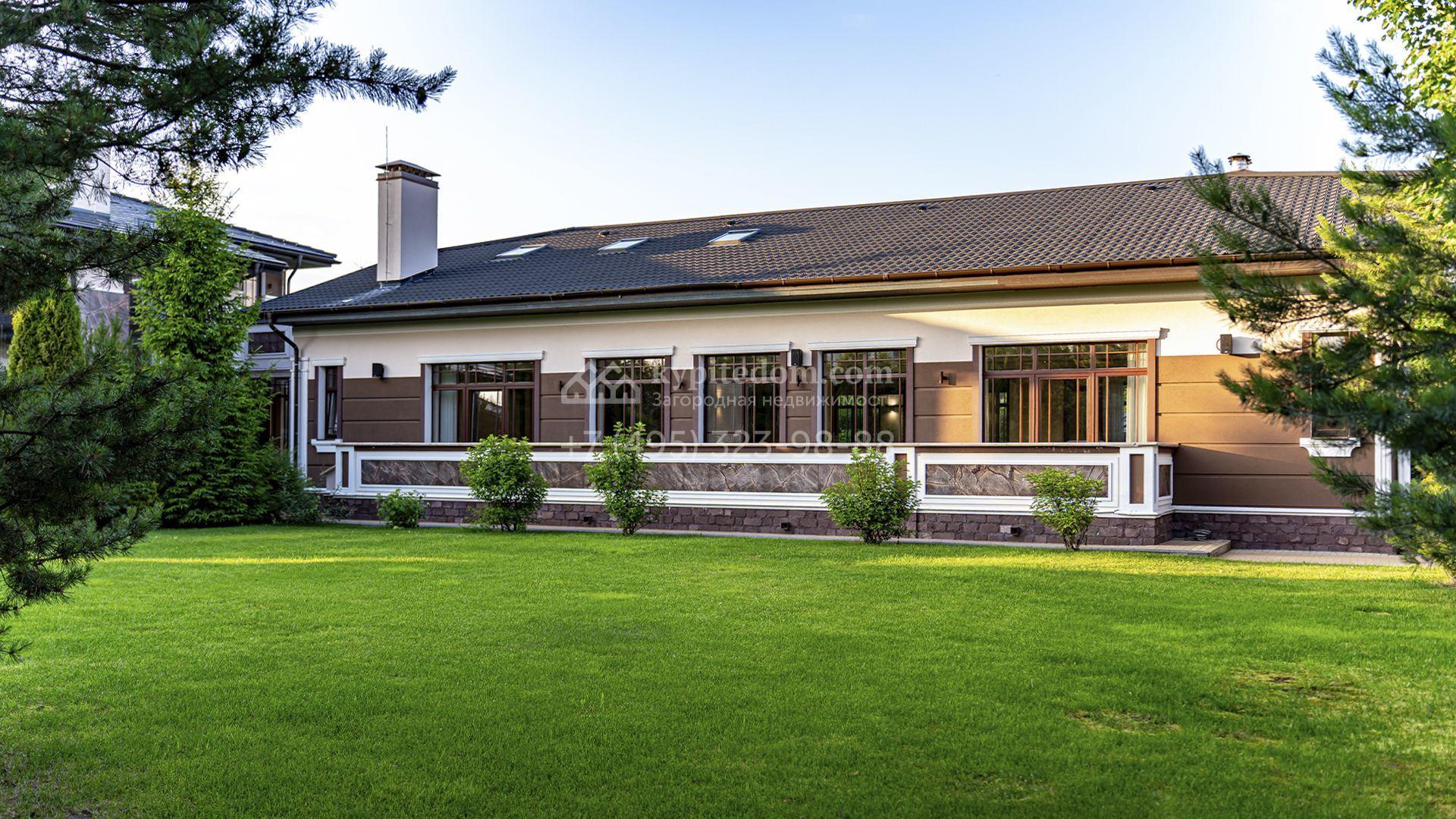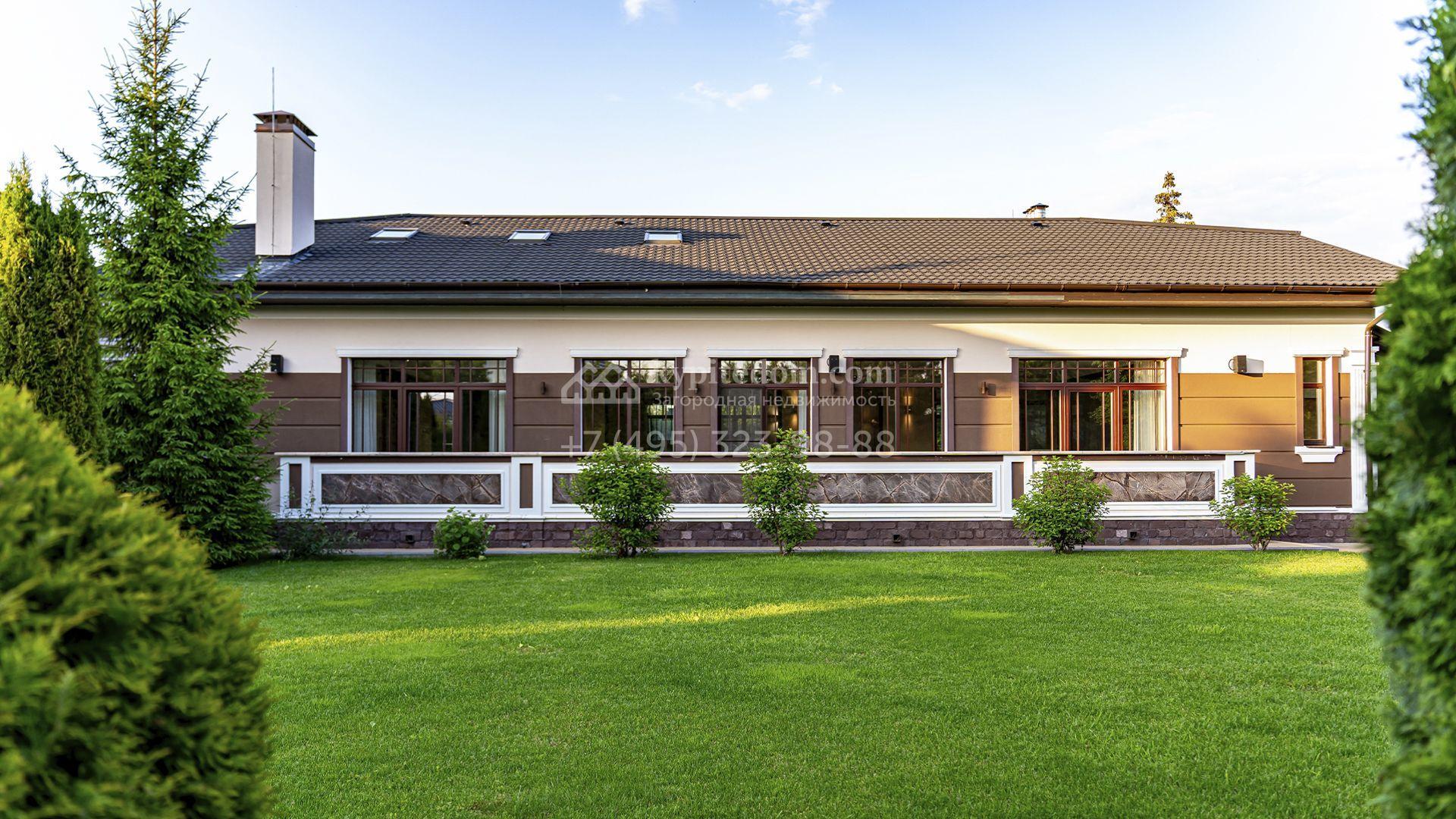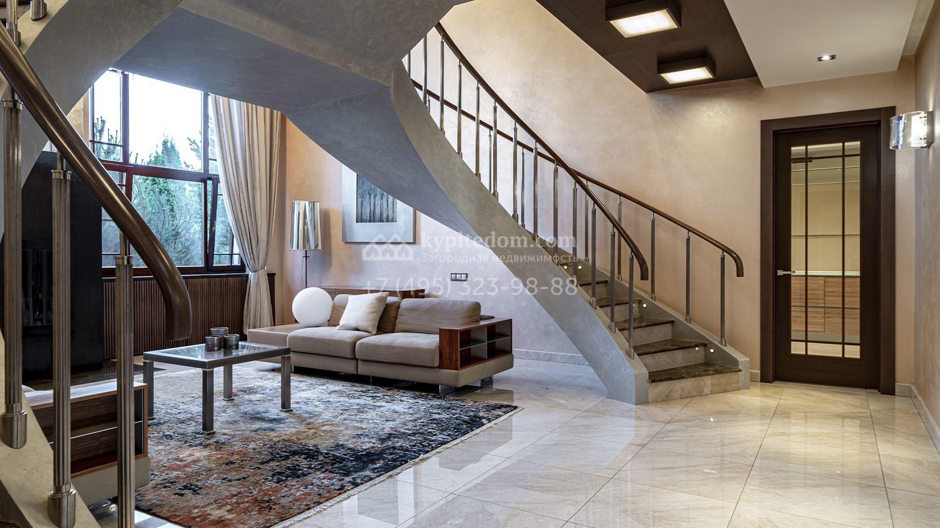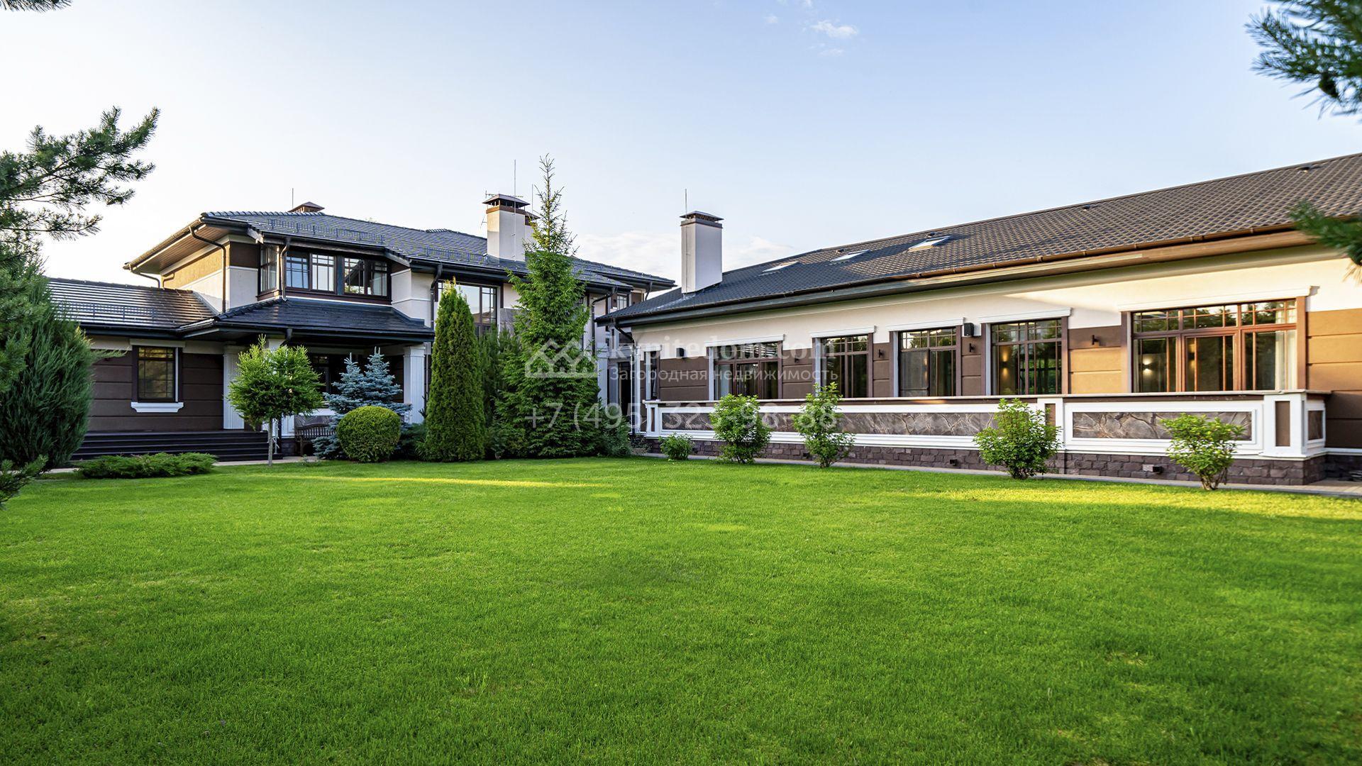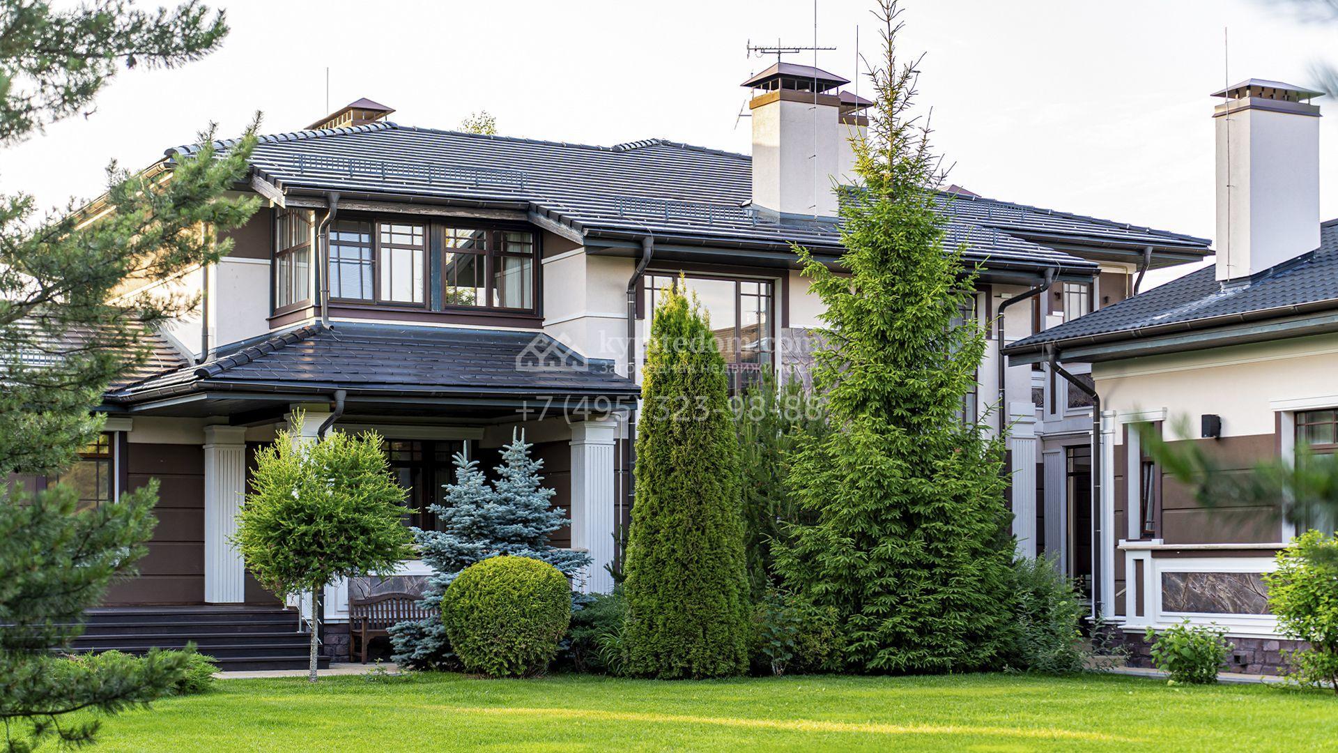 Загородная резиденция площадью 1300 м² расположена на полевом участке 31 сотка в тихой части посёлка рядом с парковой аллеей. Фасад выполнен в европейском стиле, облицован натуральным камнем и штукатуркой двух оттенков, а изящные колонны, филёнки и русты придают ему особый шарм. Современные интерьеры выдержаны в светлой гамме и отделаны с использованием оникса, гранита, мрамора и дерева. Каждая деталь продумана до мелочей — от дизайнерской мебели до премиальной бытовой техники. «Умный дом» и кондиционирование обеспечивают комфорт в любое время года.