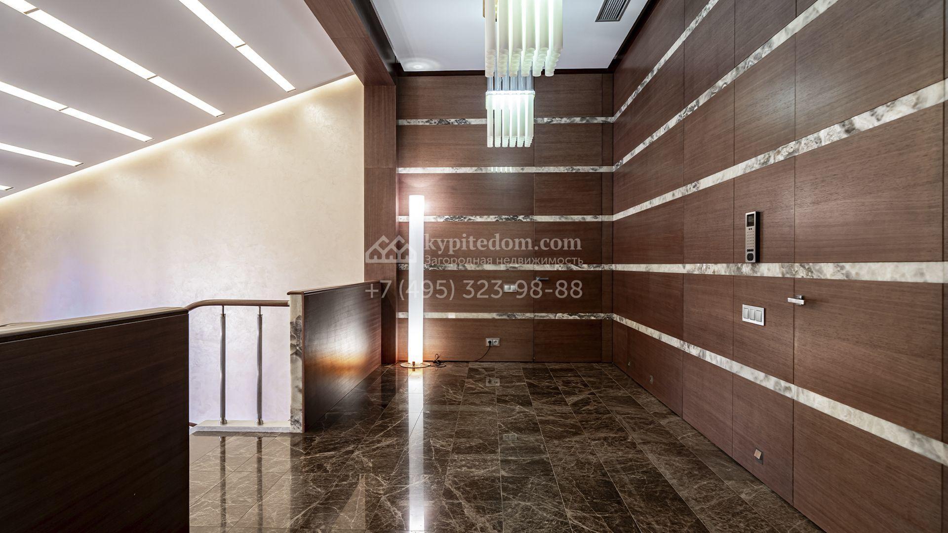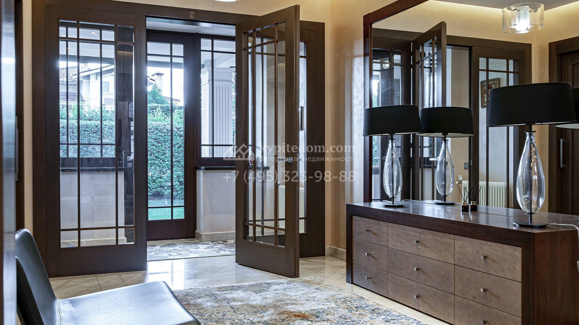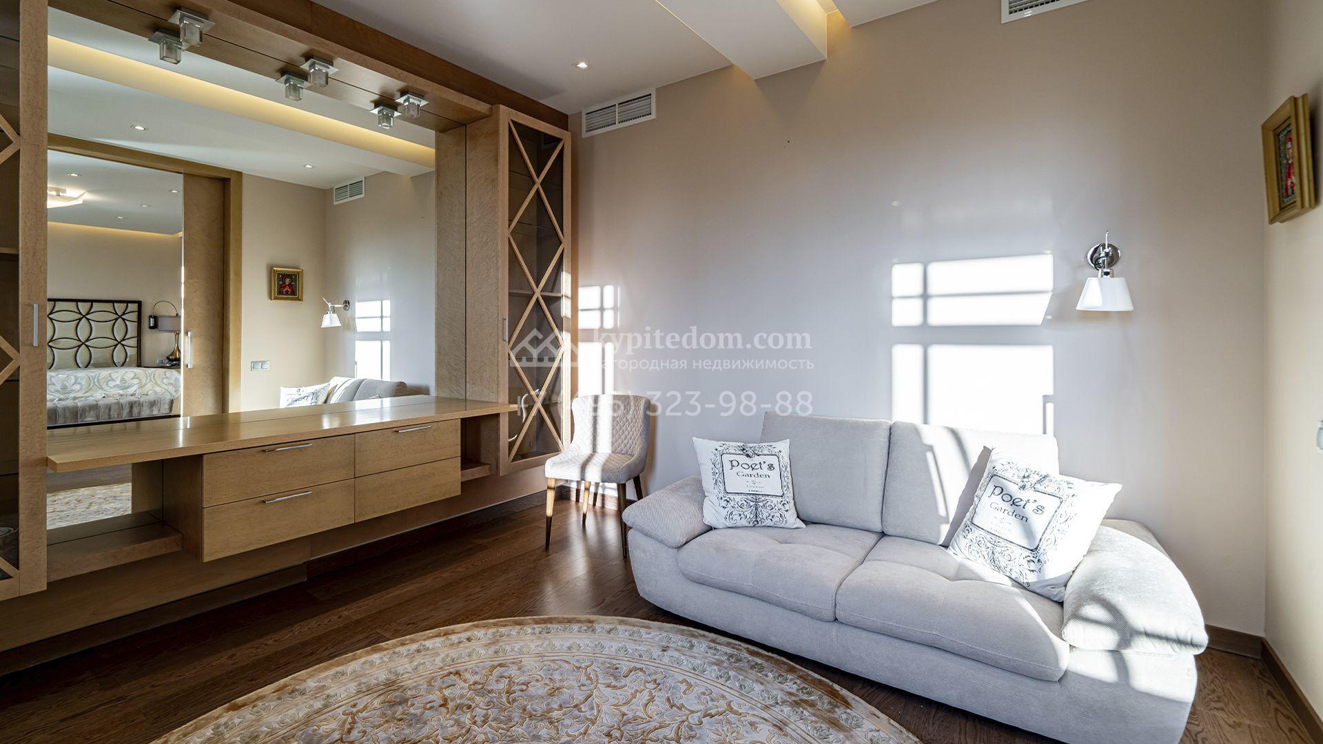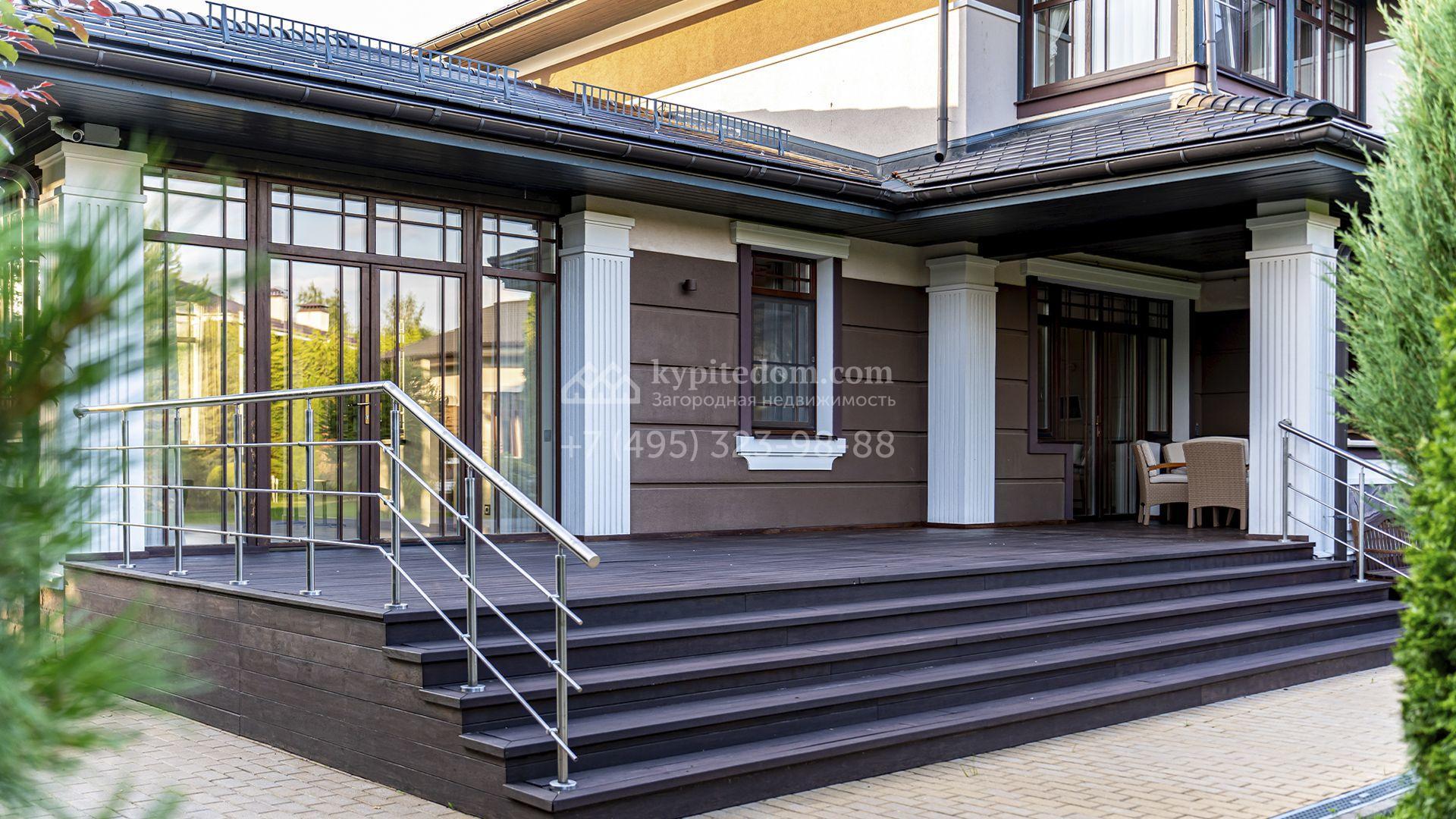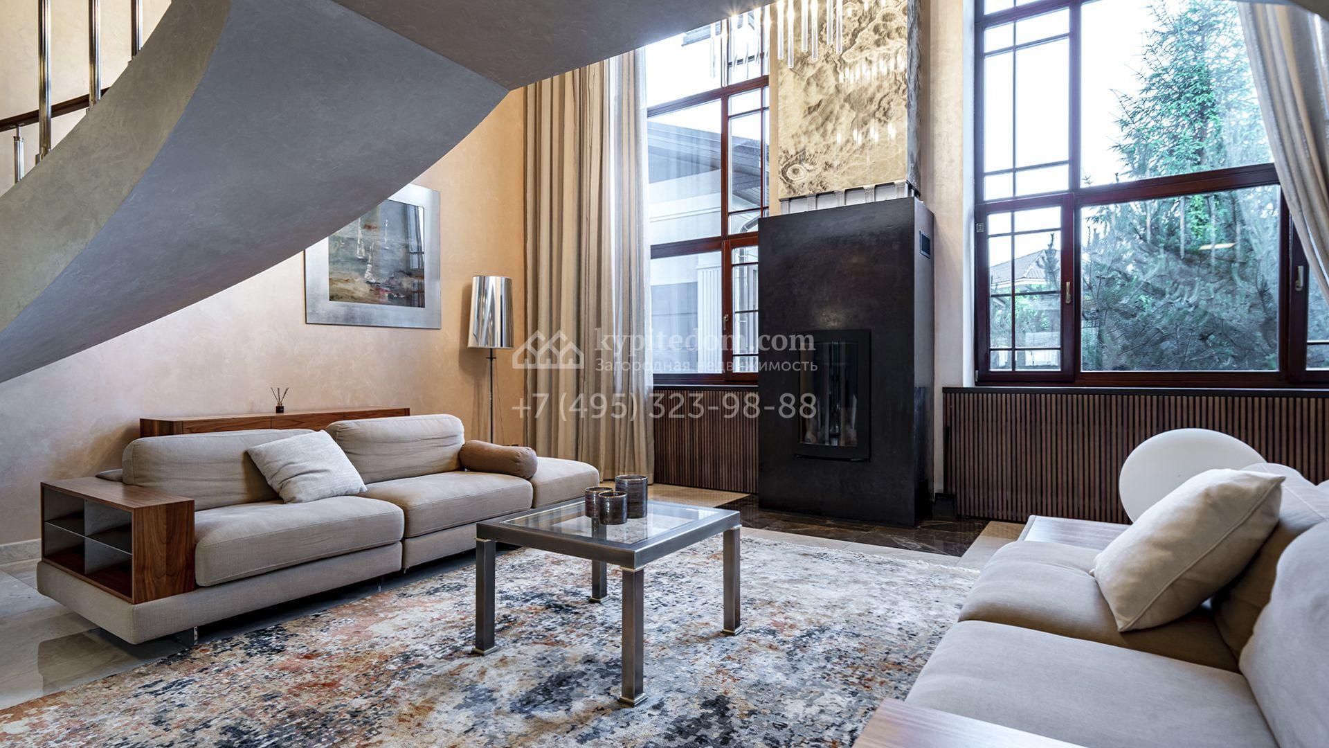 Загородная резиденция площадью 1300 м² расположена на полевом участке 31 сотка в тихой части посёлка рядом с парковой аллеей. Фасад выполнен в европейском стиле, облицован натуральным камнем и штукатуркой двух оттенков, а изящные колонны, филёнки и русты придают ему особый шарм. Современные интерьеры выдержаны в светлой гамме и отделаны с использованием оникса, гранита, мрамора и дерева. Каждая деталь продумана до мелочей — от дизайнерской мебели до премиальной бытовой техники. «Умный дом» и кондиционирование обеспечивают комфорт в любое время года.