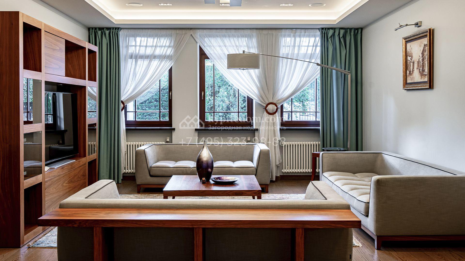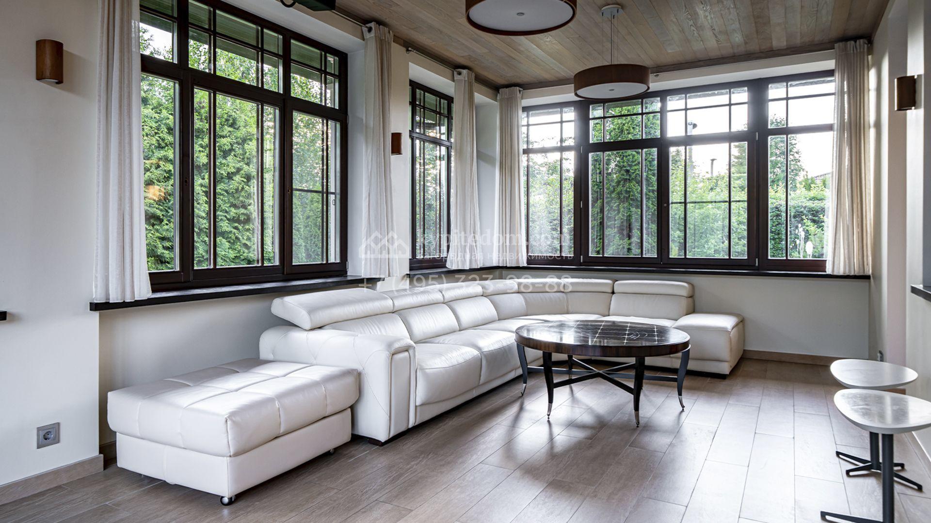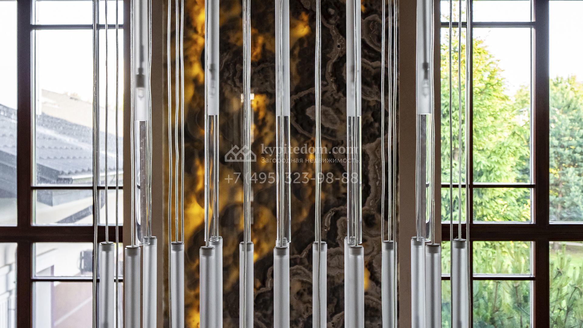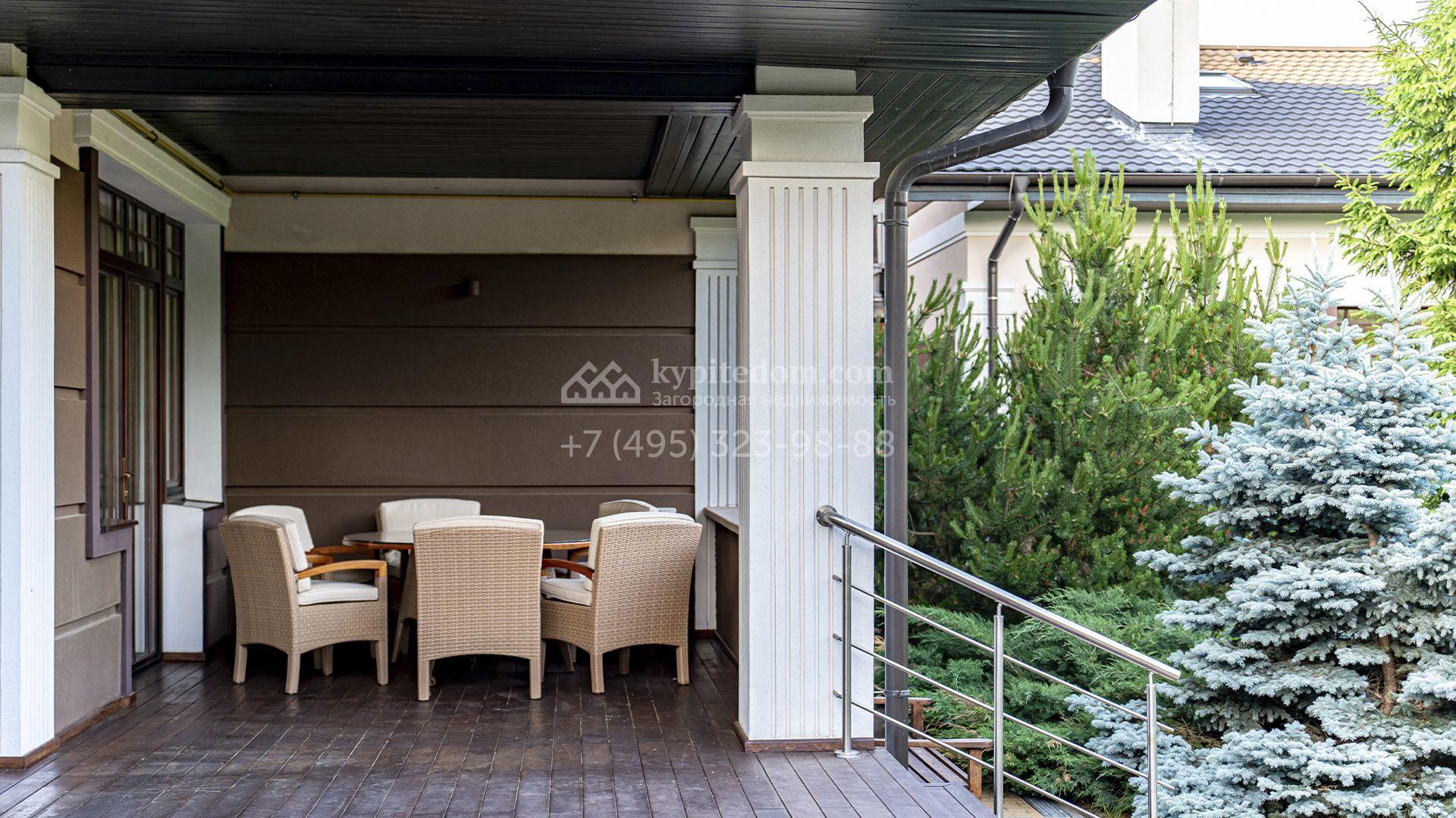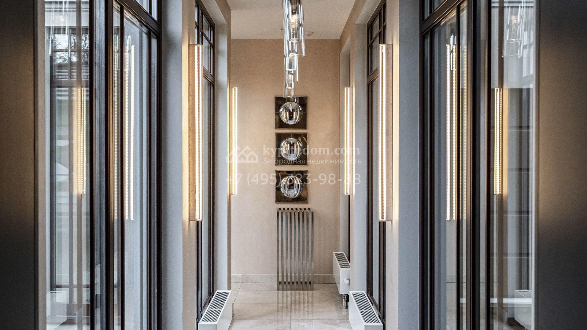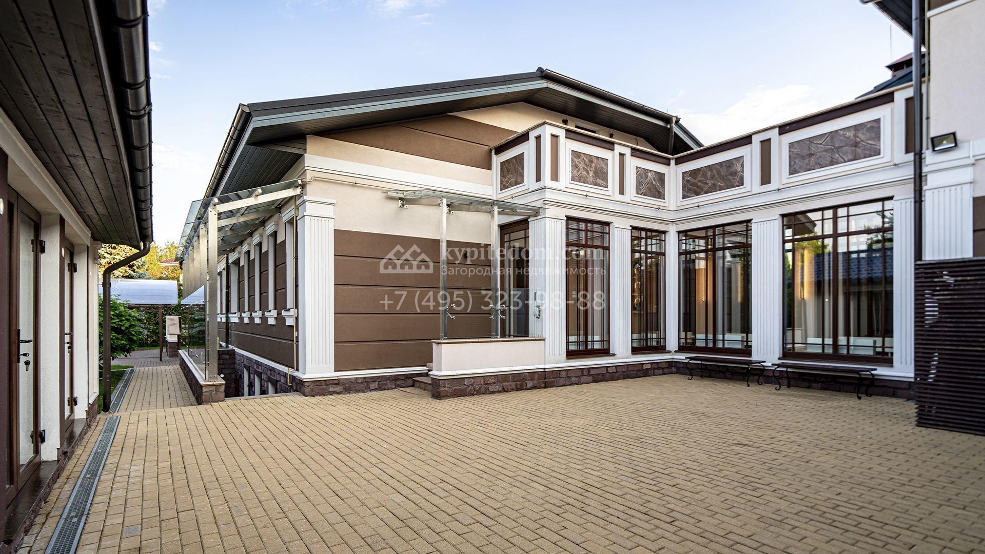 Загородная резиденция площадью 1300 м² расположена на полевом участке 31 сотка в тихой части посёлка рядом с парковой аллеей. Фасад выполнен в европейском стиле, облицован натуральным камнем и штукатуркой двух оттенков, а изящные колонны, филёнки и русты придают ему особый шарм. Современные интерьеры выдержаны в светлой гамме и отделаны с использованием оникса, гранита, мрамора и дерева. Каждая деталь продумана до мелочей — от дизайнерской мебели до премиальной бытовой техники. «Умный дом» и кондиционирование обеспечивают комфорт в любое время года.