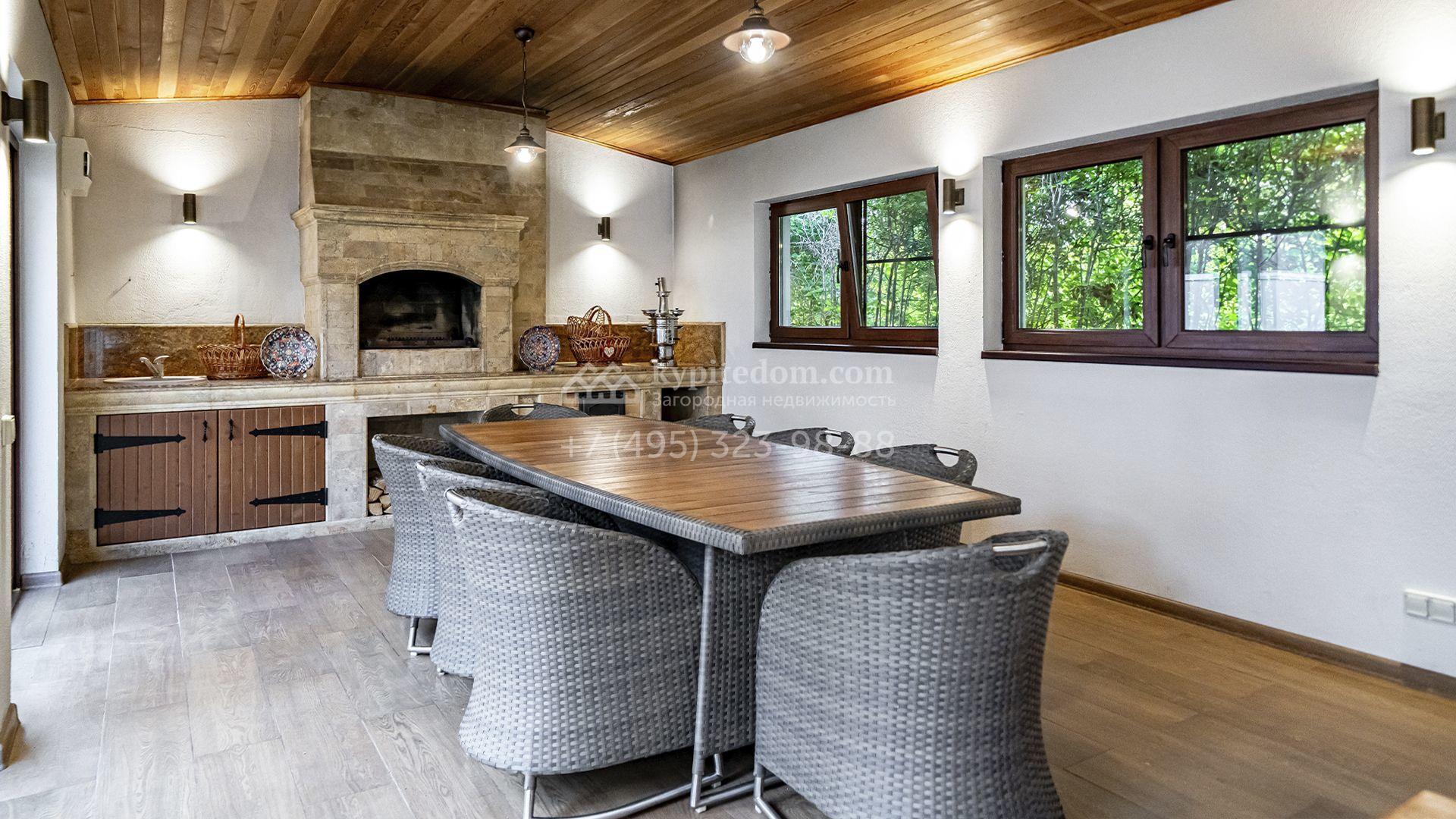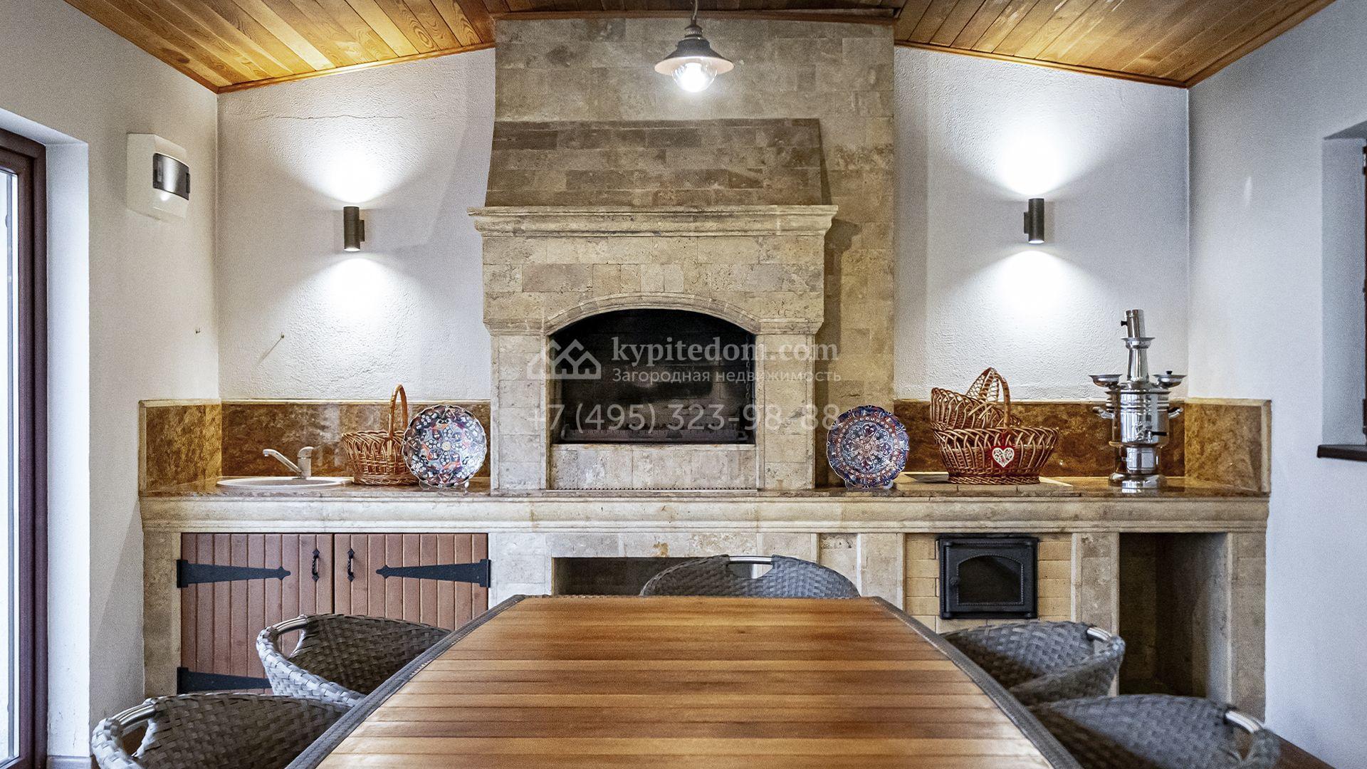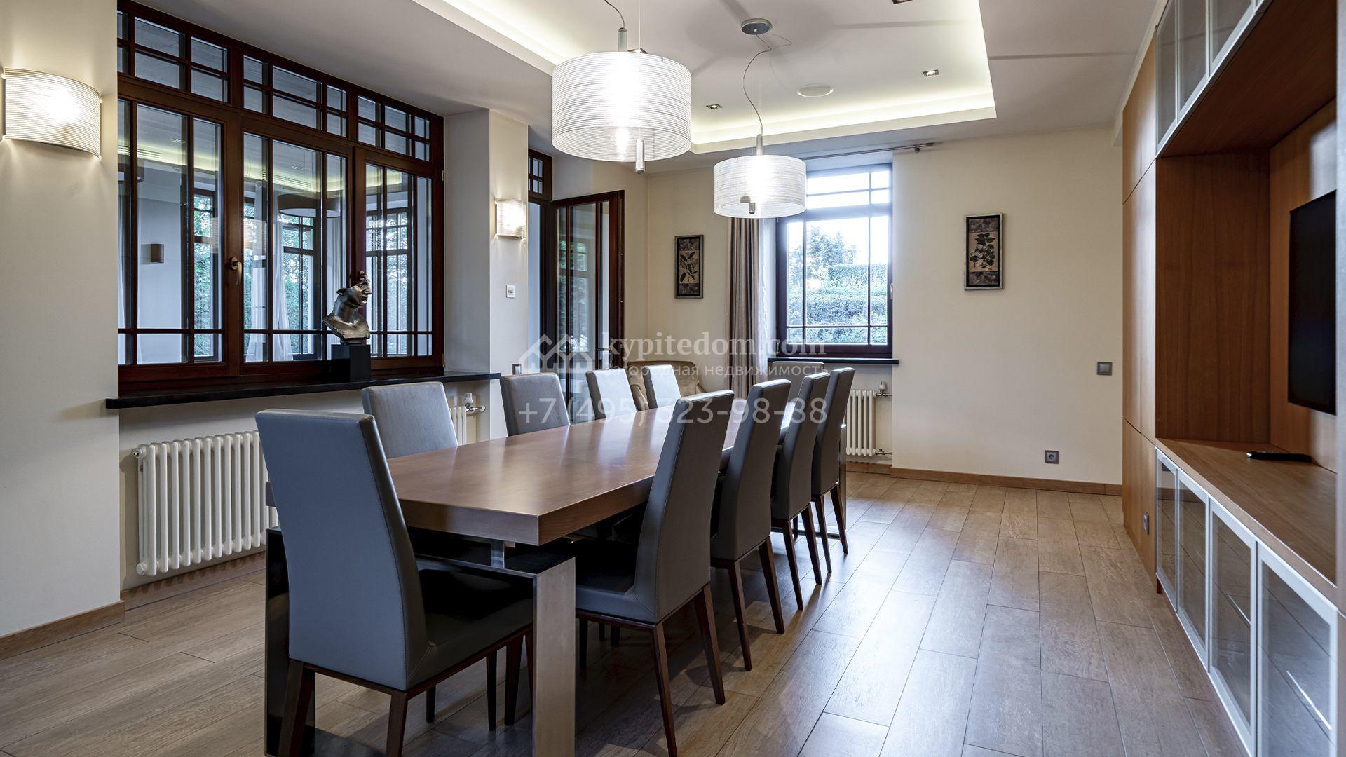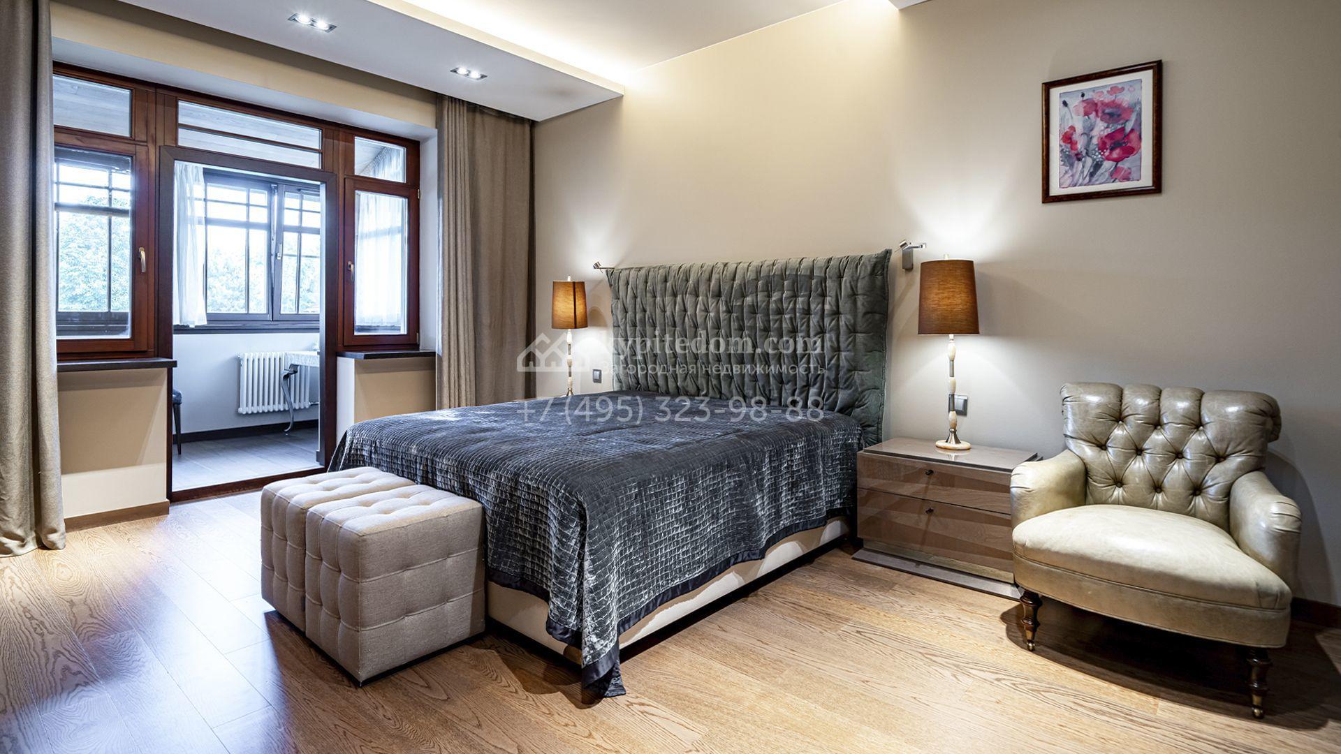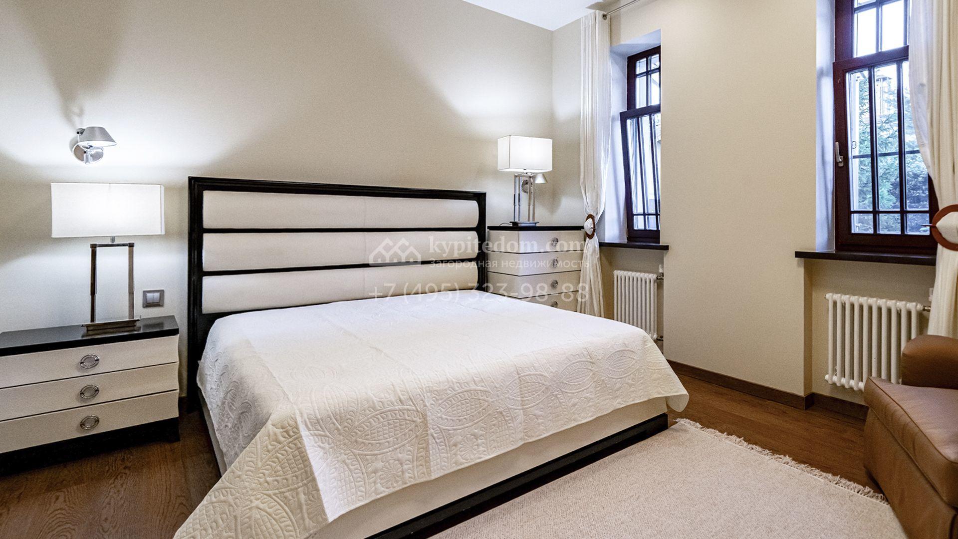 Загородная резиденция площадью 1300 м² расположена на полевом участке 31 сотка в тихой части посёлка рядом с парковой аллеей. Фасад выполнен в европейском стиле, облицован натуральным камнем и штукатуркой двух оттенков, а изящные колонны, филёнки и русты придают ему особый шарм. Современные интерьеры выдержаны в светлой гамме и отделаны с использованием оникса, гранита, мрамора и дерева. Каждая деталь продумана до мелочей — от дизайнерской мебели до премиальной бытовой техники. «Умный дом» и кондиционирование обеспечивают комфорт в любое время года.