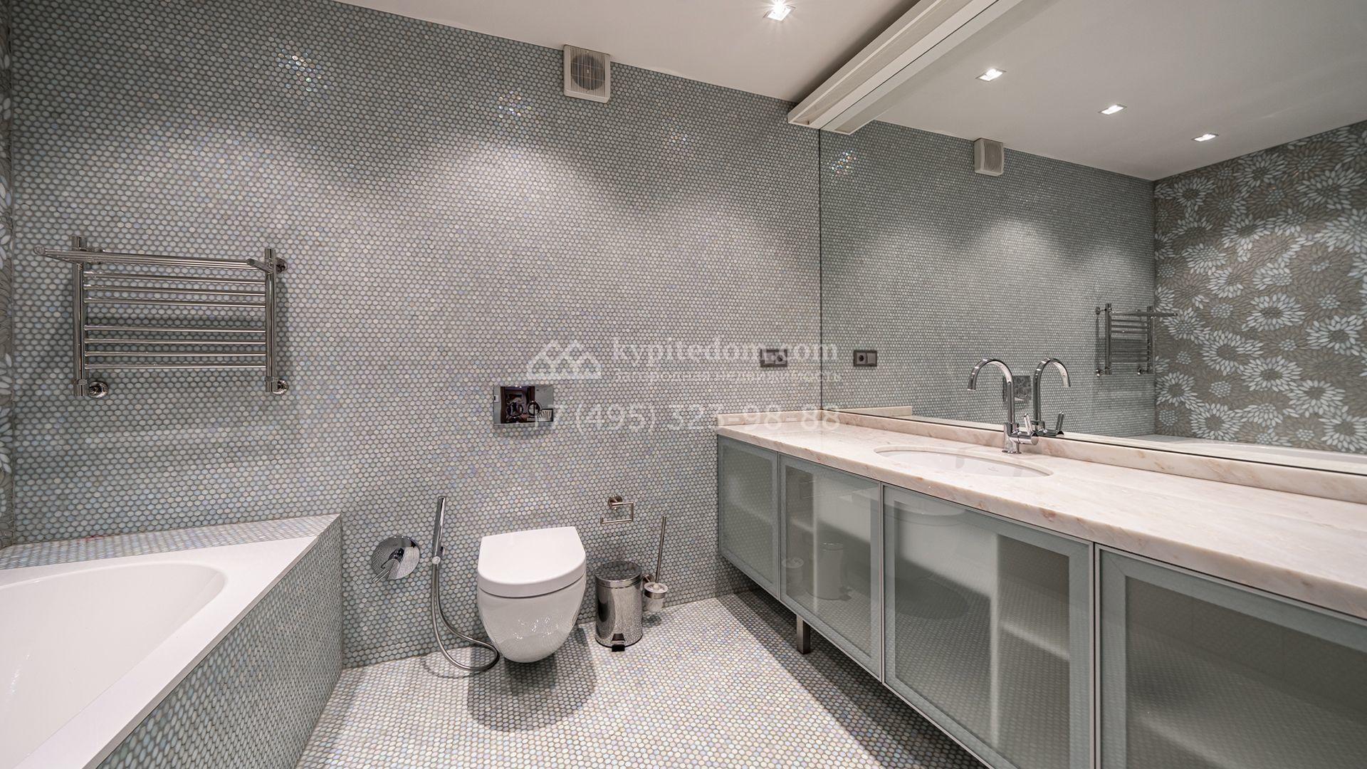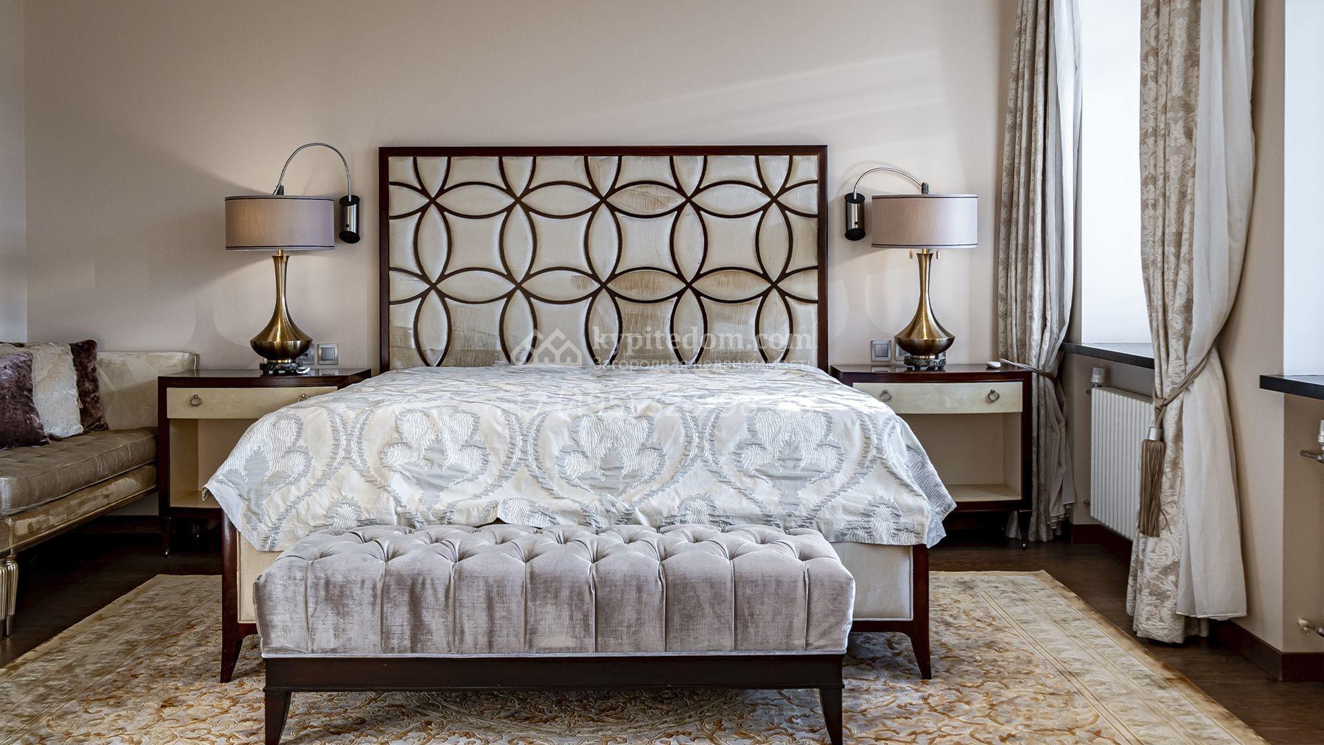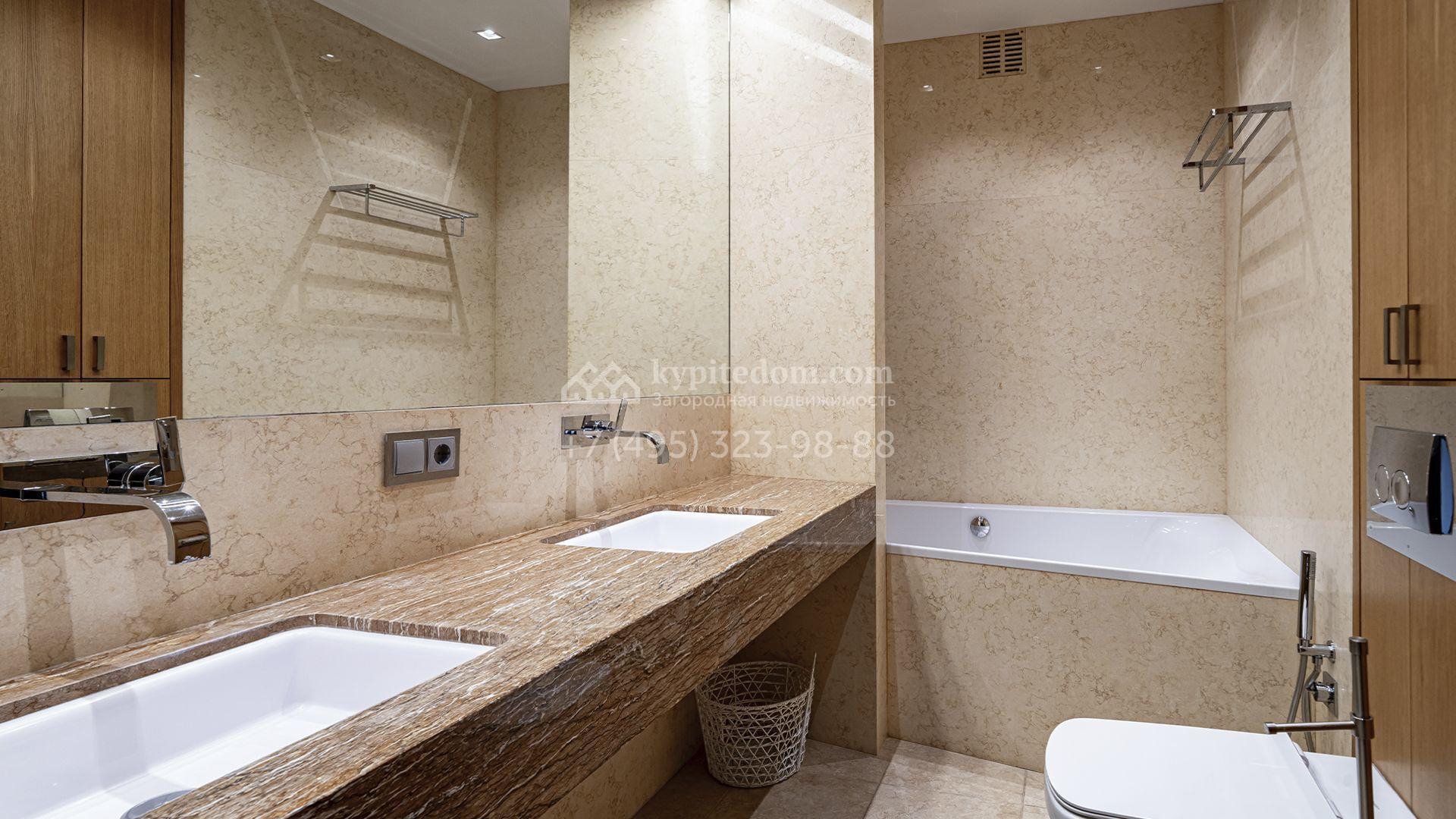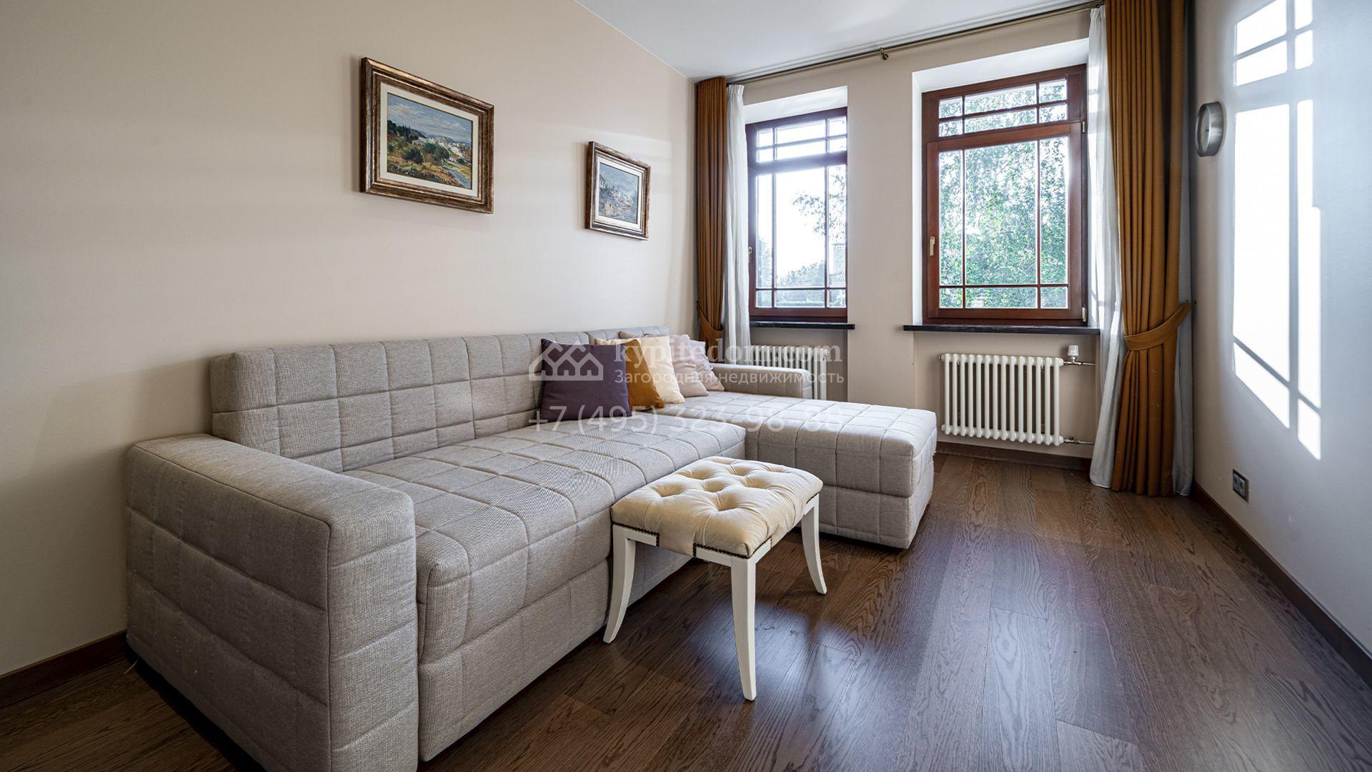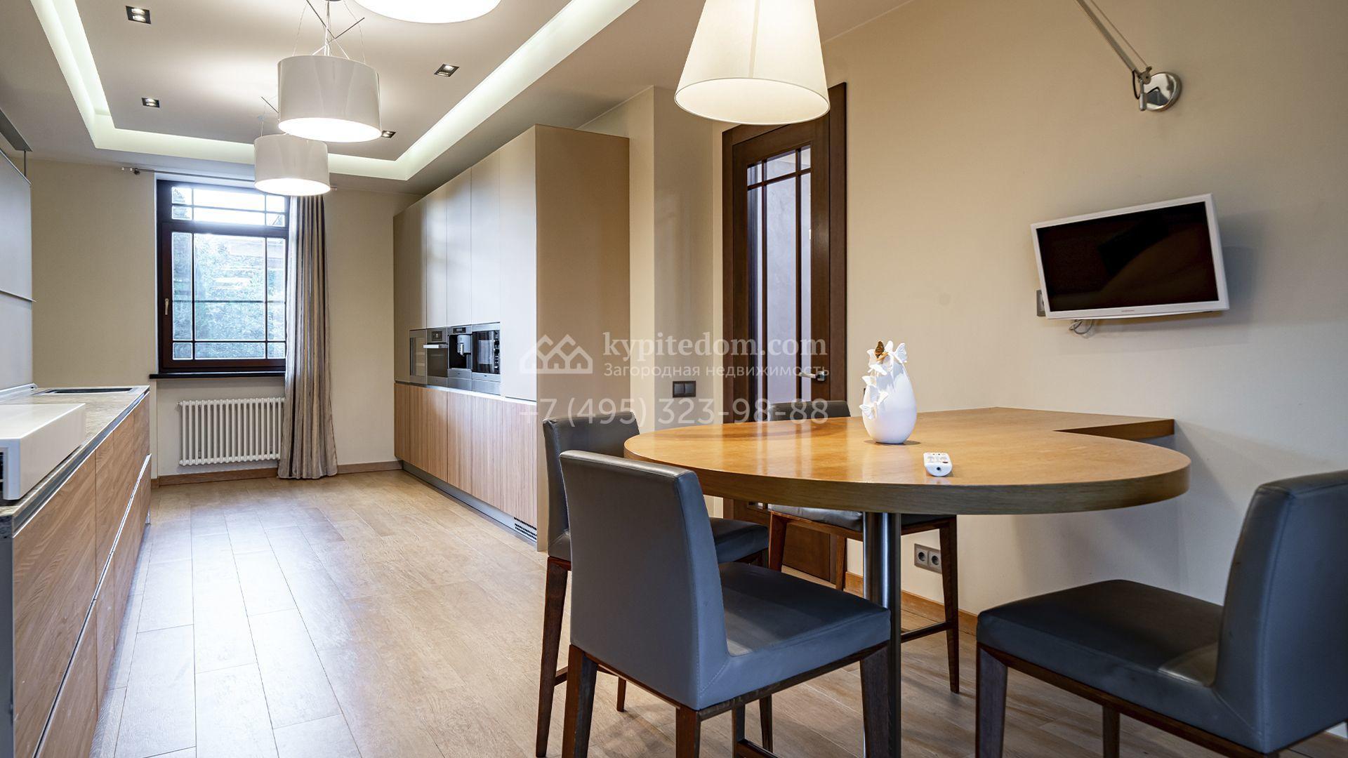 Загородная резиденция площадью 1300 м² расположена на полевом участке 31 сотка в тихой части посёлка рядом с парковой аллеей. Фасад выполнен в европейском стиле, облицован натуральным камнем и штукатуркой двух оттенков, а изящные колонны, филёнки и русты придают ему особый шарм. Современные интерьеры выдержаны в светлой гамме и отделаны с использованием оникса, гранита, мрамора и дерева. Каждая деталь продумана до мелочей — от дизайнерской мебели до премиальной бытовой техники. «Умный дом» и кондиционирование обеспечивают комфорт в любое время года.