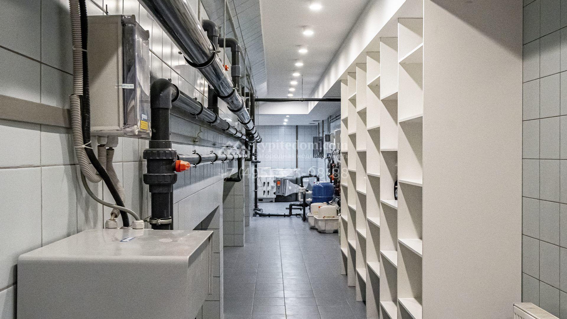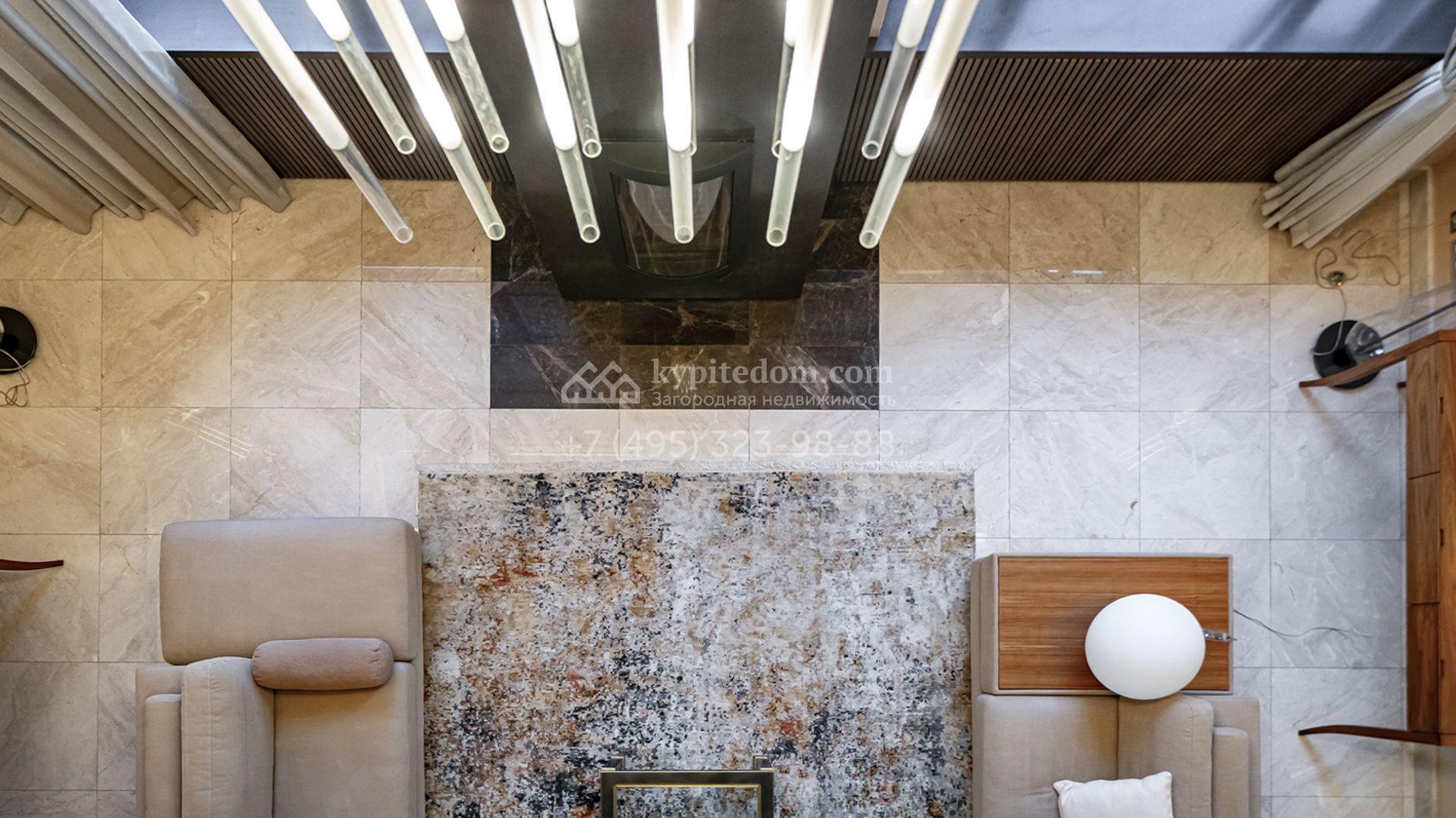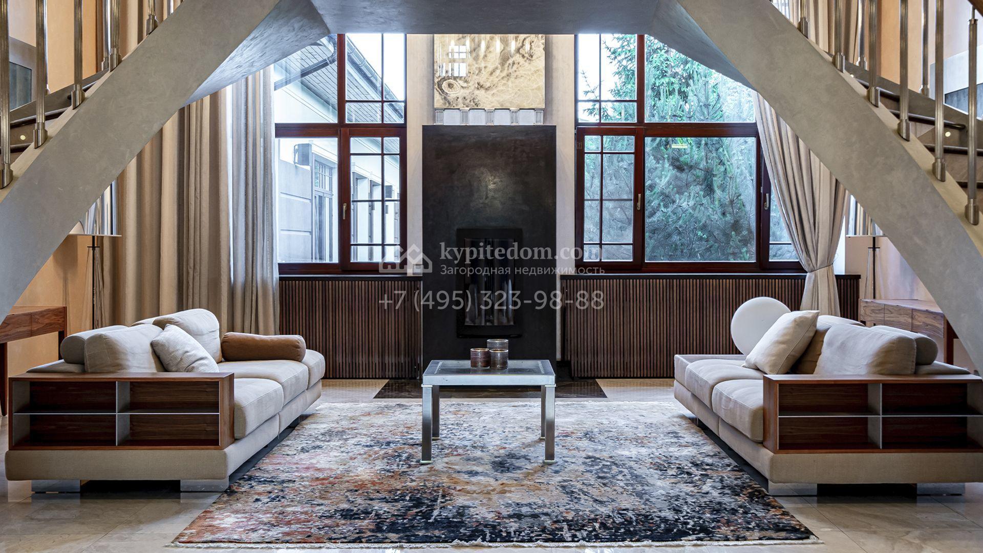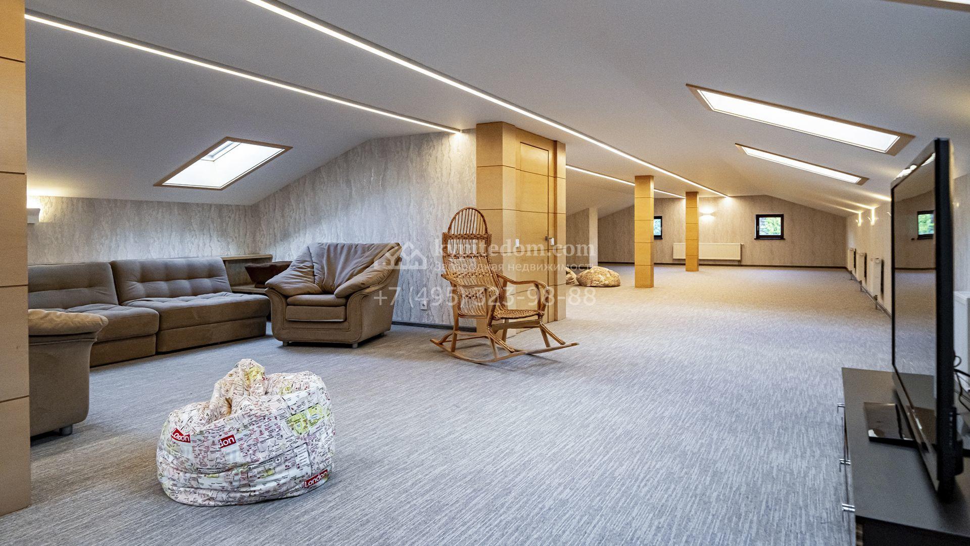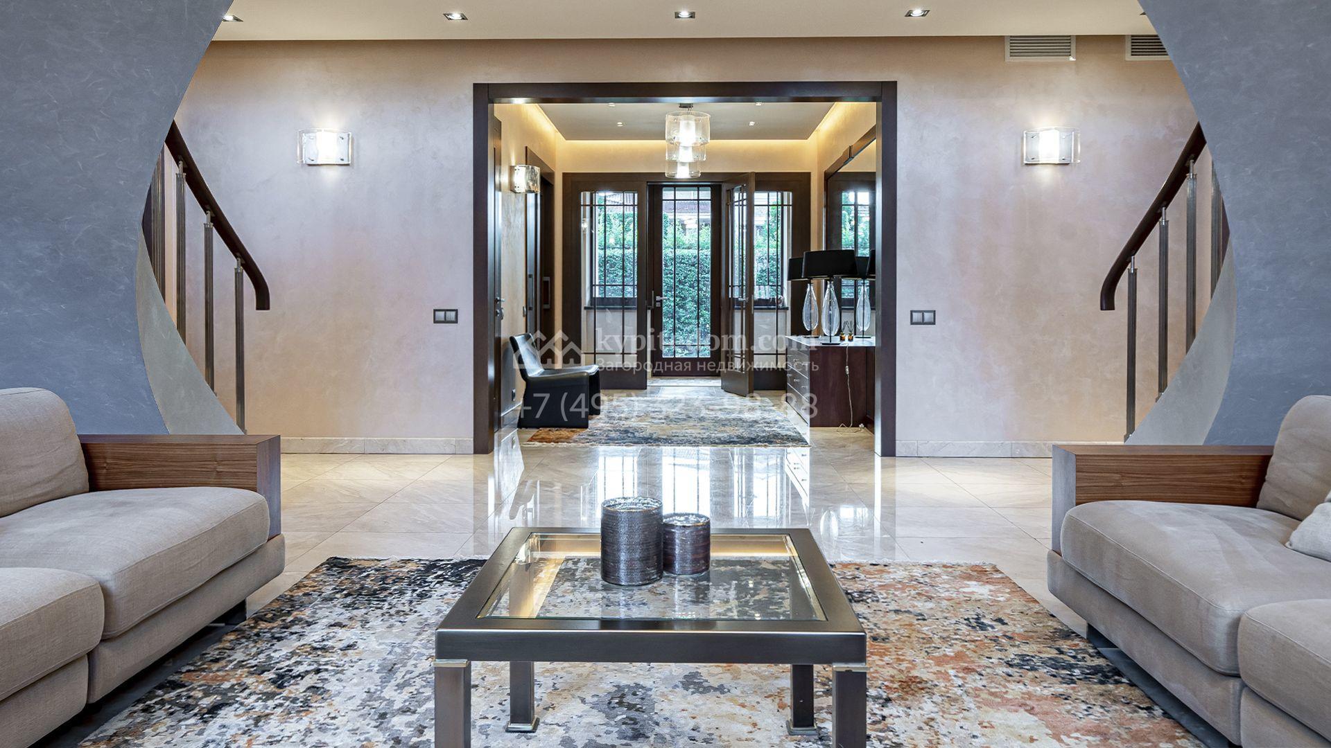 Планировка первого этажа включает просторный двухсветный каминный зал с элегантной лестницей, кухню с итальянским гарнитуром Valcucine, столовую, гостиную с кабинетом, застеклённую веранду и две спальни. Отсюда можно выйти на террасу с видом на сад или пройти через панорамный коридор в спа-зону с 11-метровым бассейном, сауной с печью Harvia, бильярдной и комнатой отдыха с баром. Второй этаж отведён под четыре спальни с гардеробными и большую игровую, а на цокольном уровне разместили дополнительную спальню и блок для персонала.