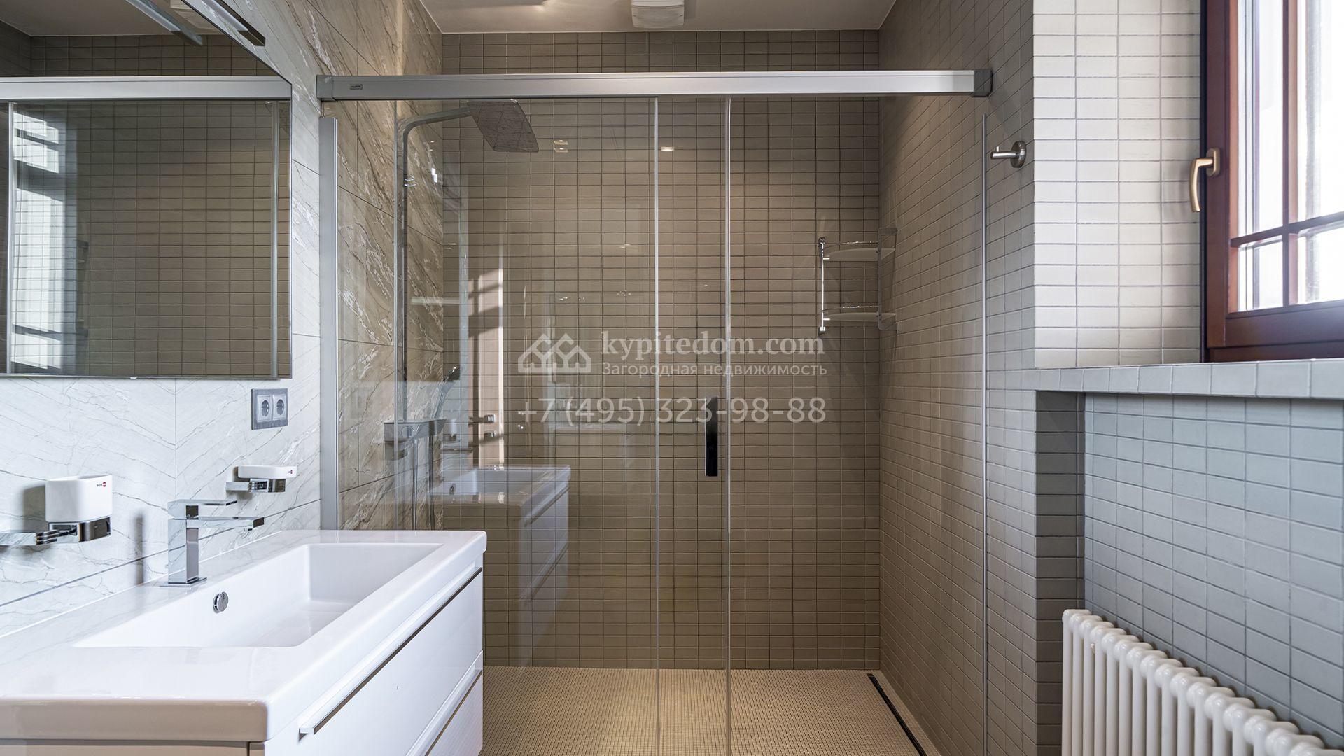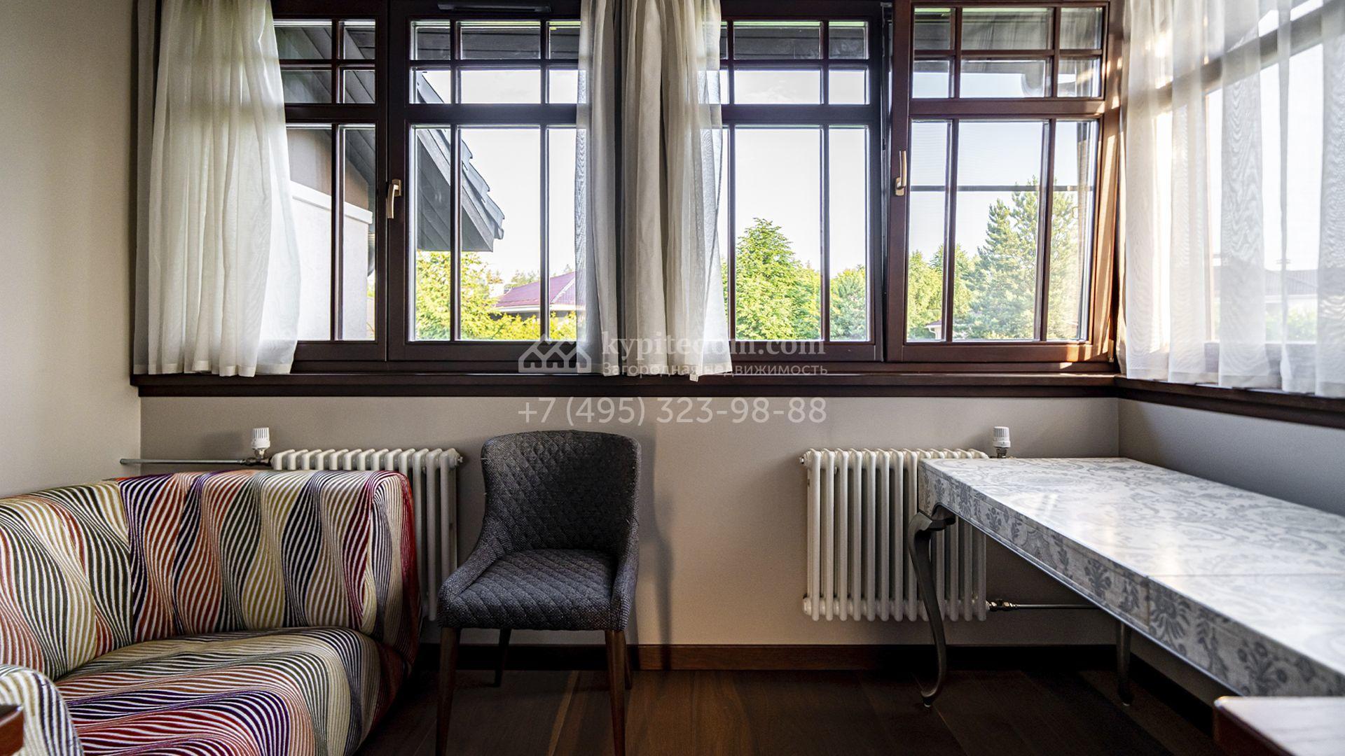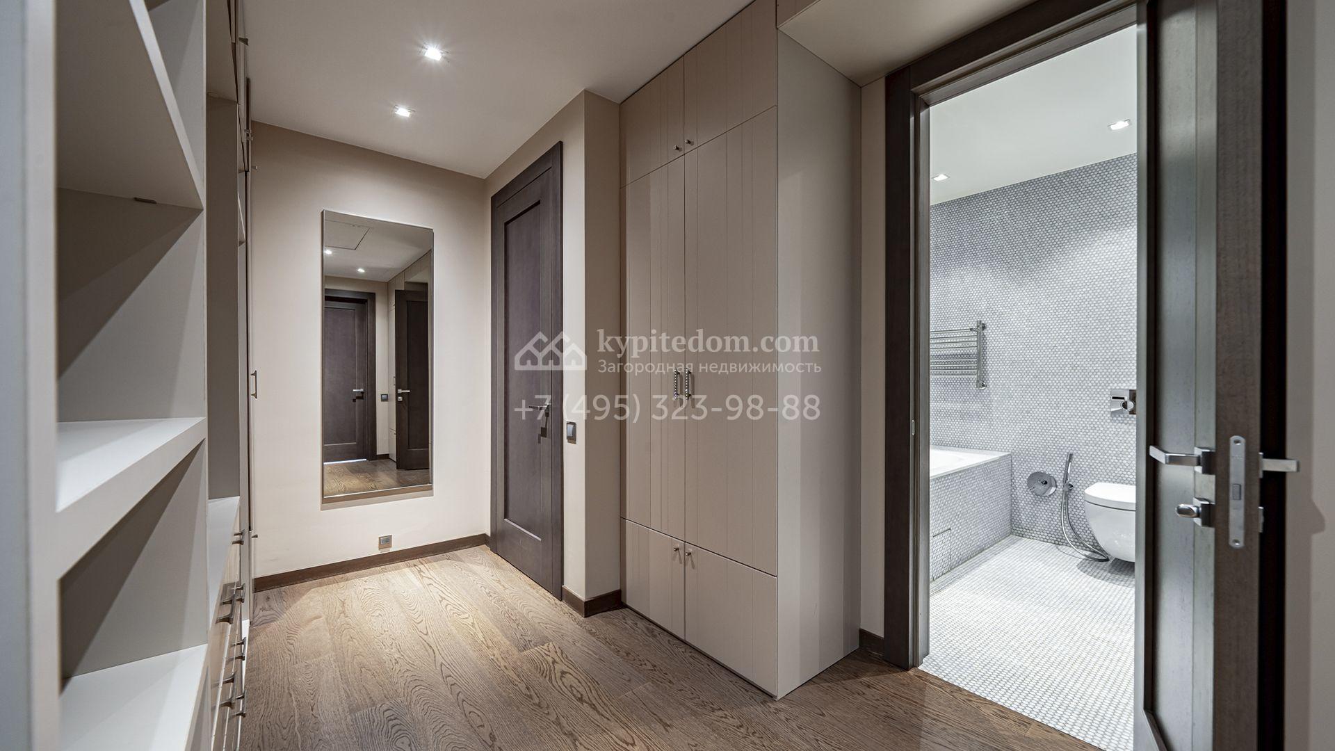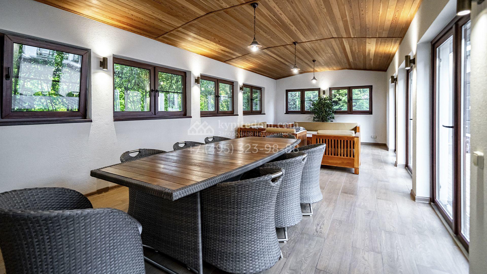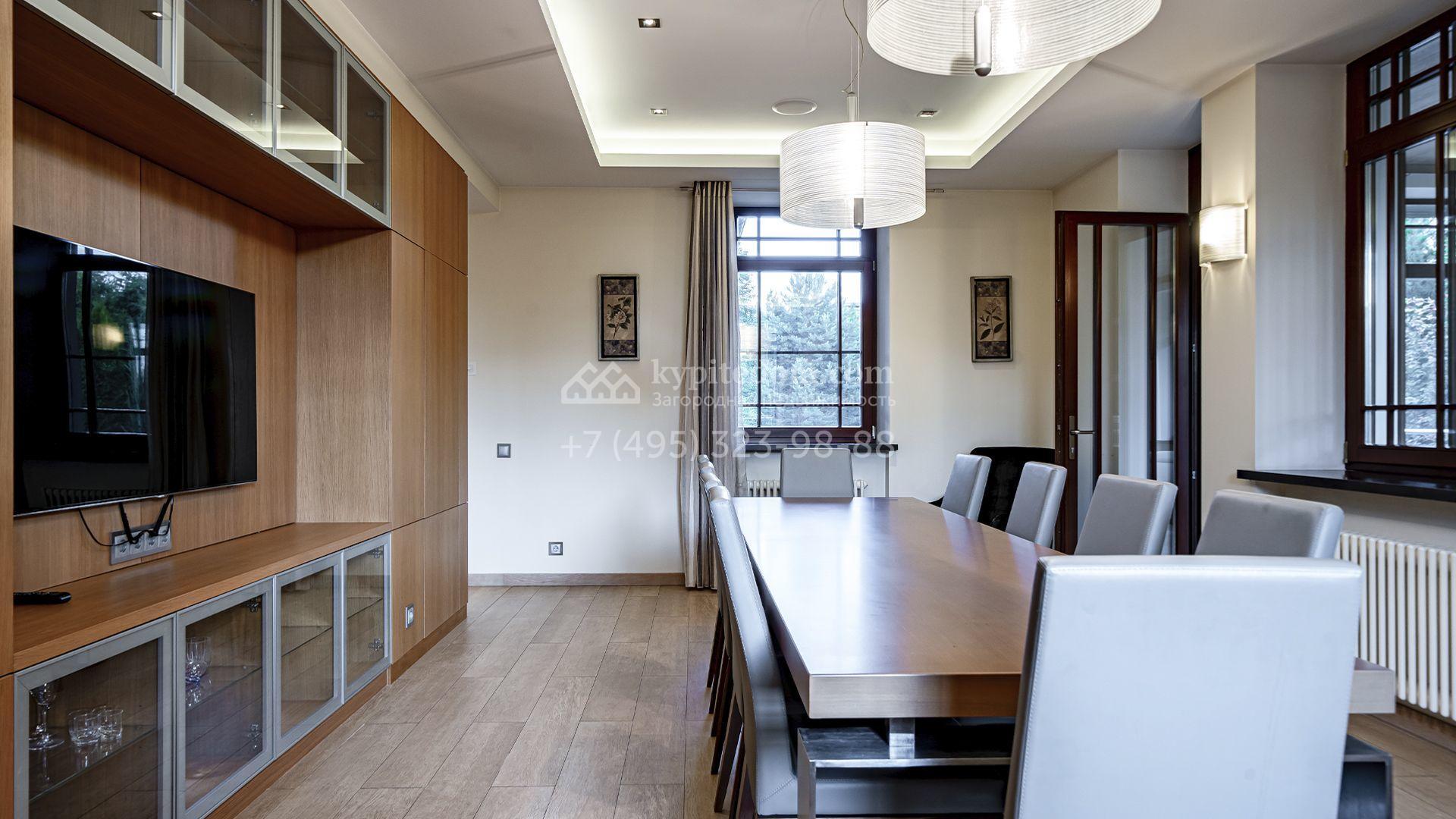 Планировка первого этажа включает просторный двухсветный каминный зал с элегантной лестницей, кухню с итальянским гарнитуром Valcucine, столовую, гостиную с кабинетом, застеклённую веранду и две спальни. Отсюда можно выйти на террасу с видом на сад или пройти через панорамный коридор в спа-зону с 11-метровым бассейном, сауной с печью Harvia, бильярдной и комнатой отдыха с баром. Второй этаж отведён под четыре спальни с гардеробными и большую игровую, а на цокольном уровне разместили дополнительную спальню и блок для персонала.