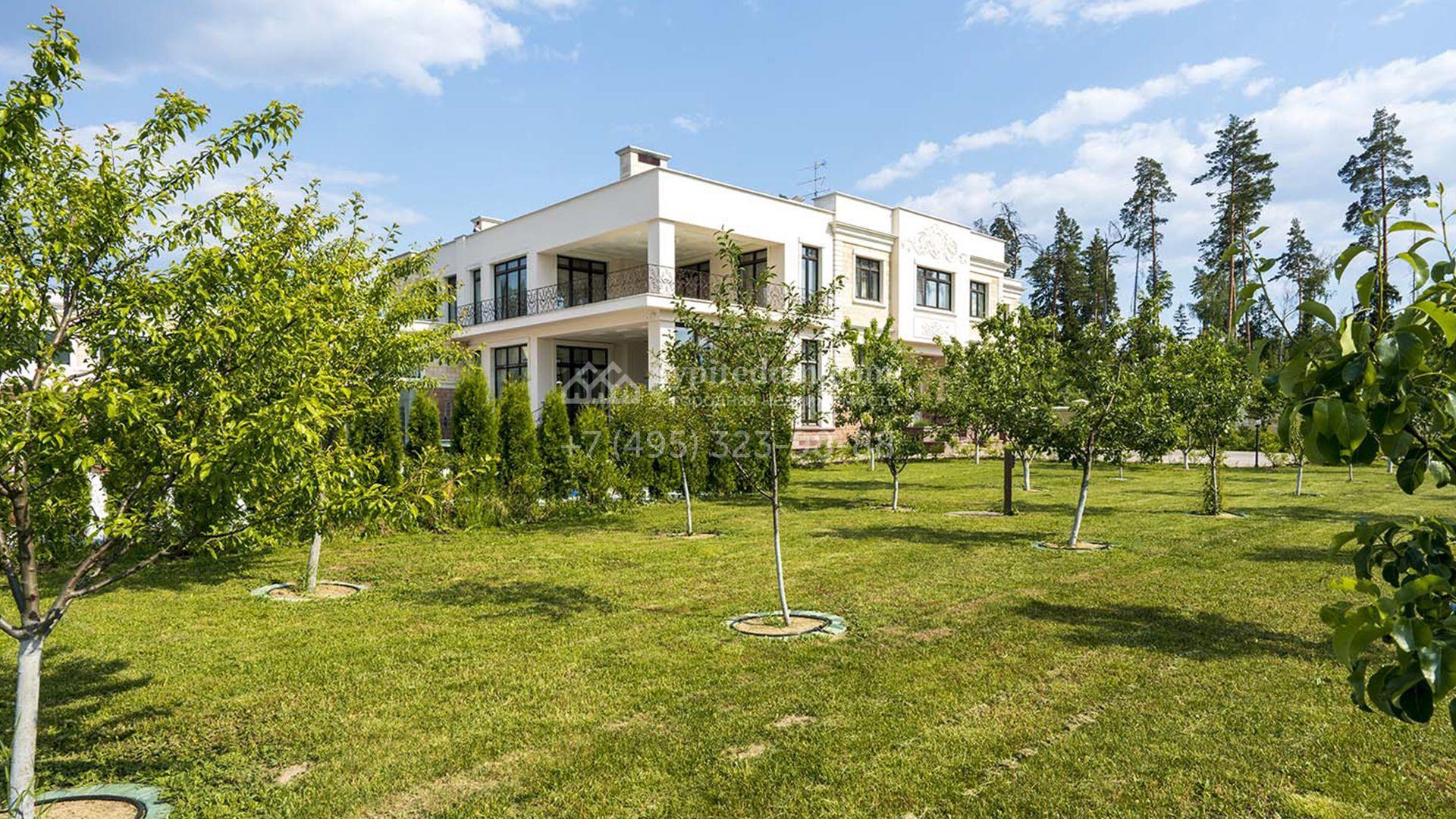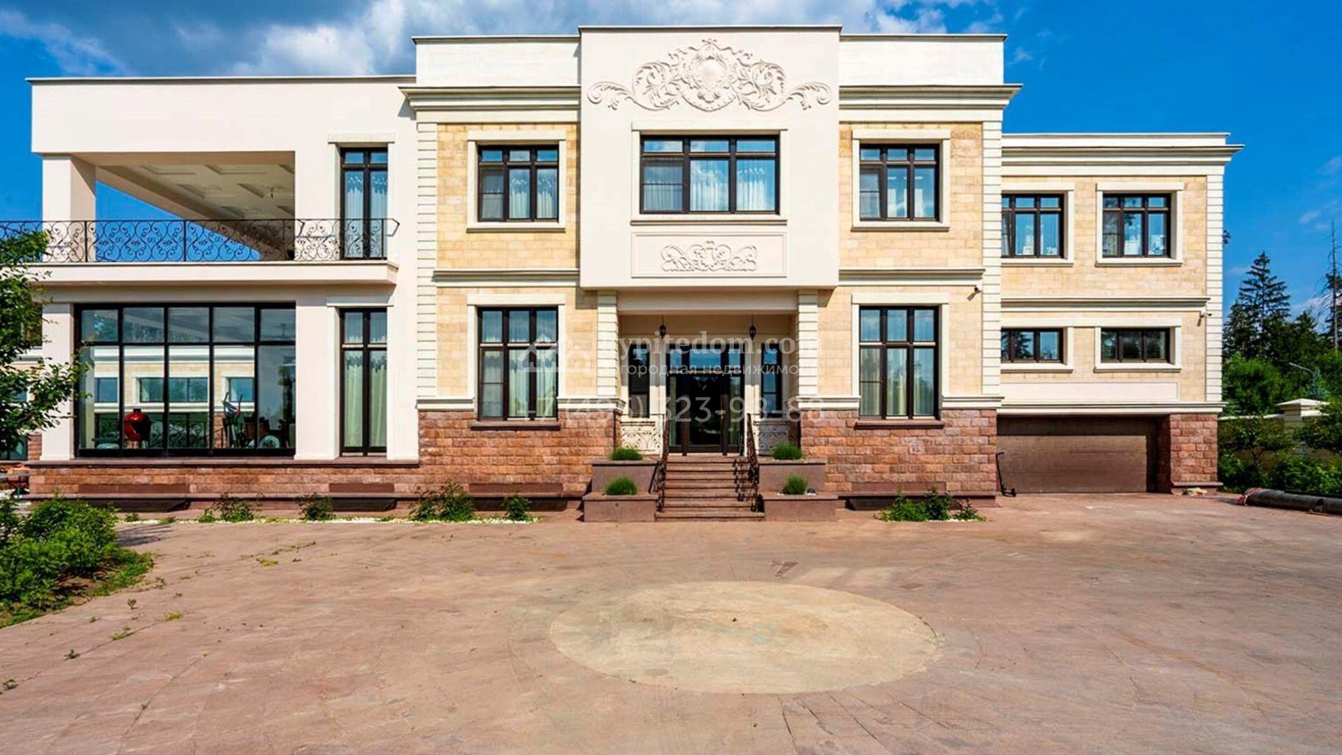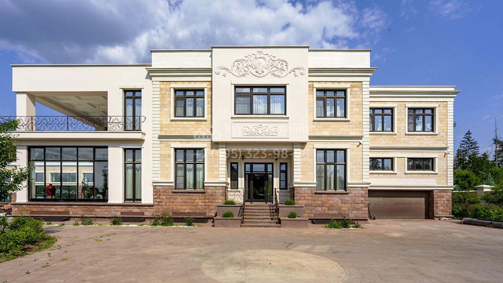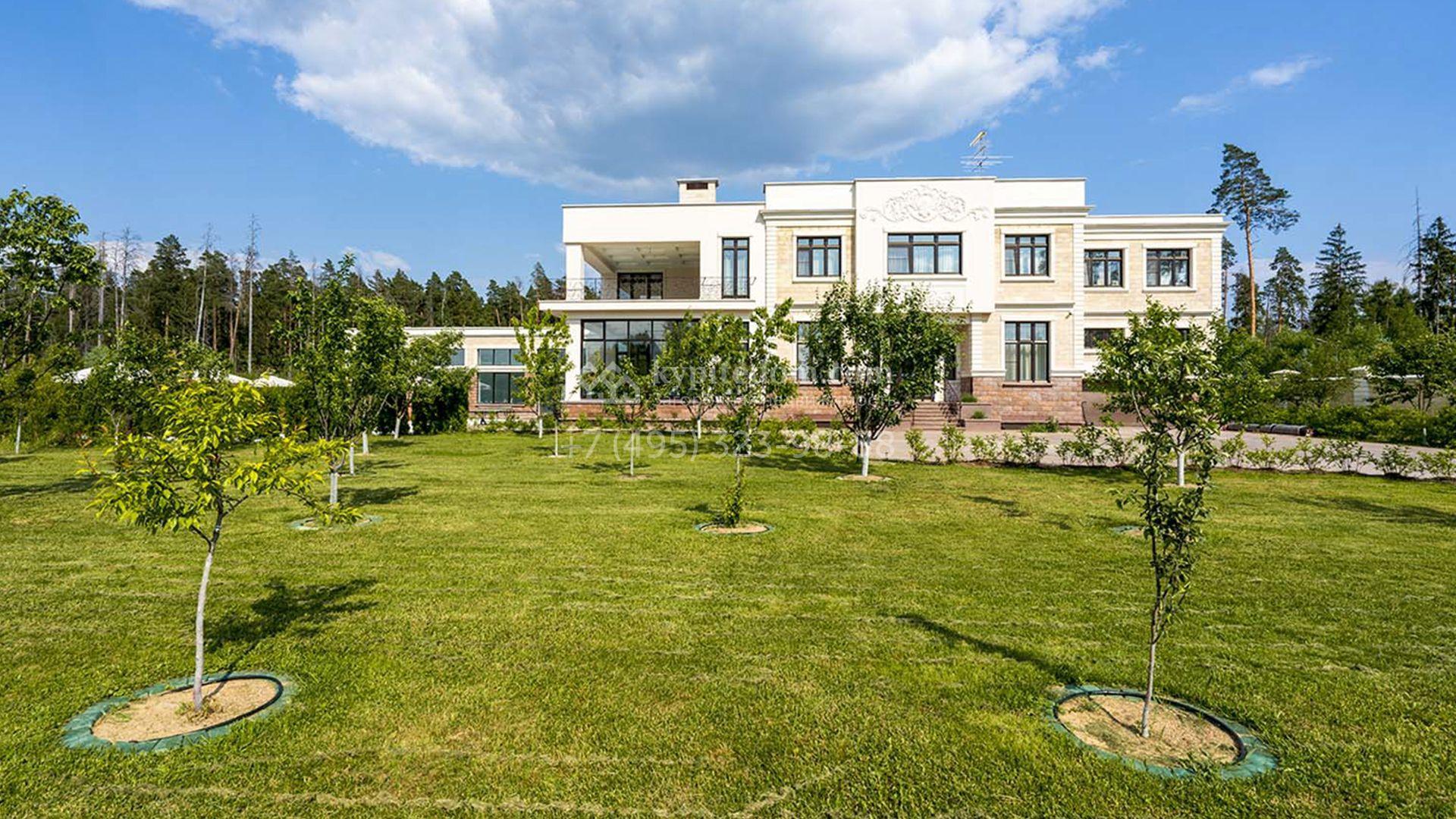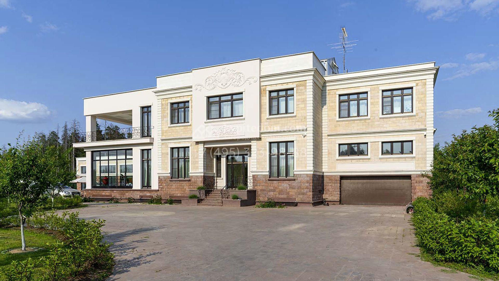 Загородная резиденция площадью 1663 м² расположена на просторном участке 25 соток около леса. Светлый фасад сочетает в себе современный и классический стили — дом с панорамным остеклением украшен лепным вензелем. Планировкой коттеджа предусмотрены 8 спален, гостиная с камином, кухня, зимний сад с выходом на террасу, сауна, хаммам, русская баня, 2 тренажерных зала и гараж на 4 машины, над которым расположили квартиру для персонала. К дому пристроен спа-комплекс с бассейном. Интерьер выдержали в классическом стиле в бежево-золотистых тонах. На участке выполнили ландшафтные работы, постелили газон, посадили деревья, обустроили беседку с зоной барбекю, паркинг и проложили дорожки к уличному бассейну.