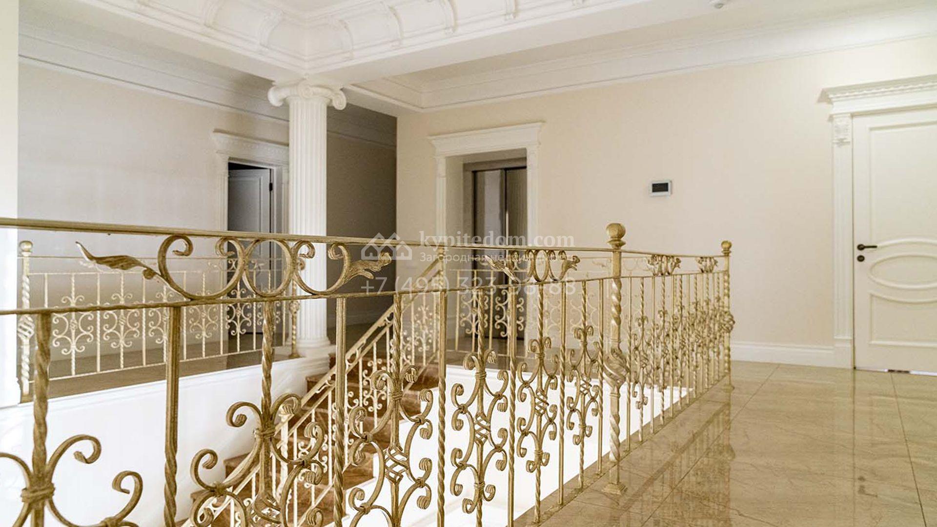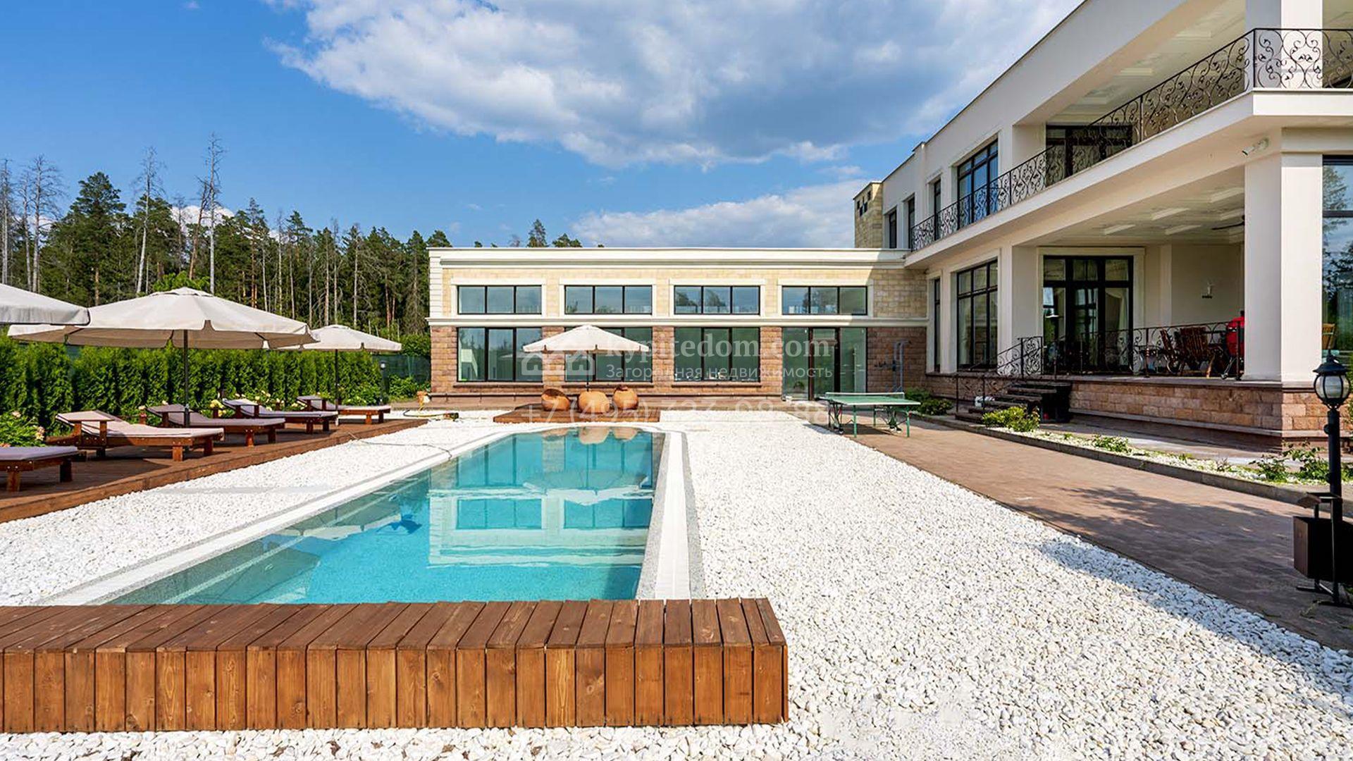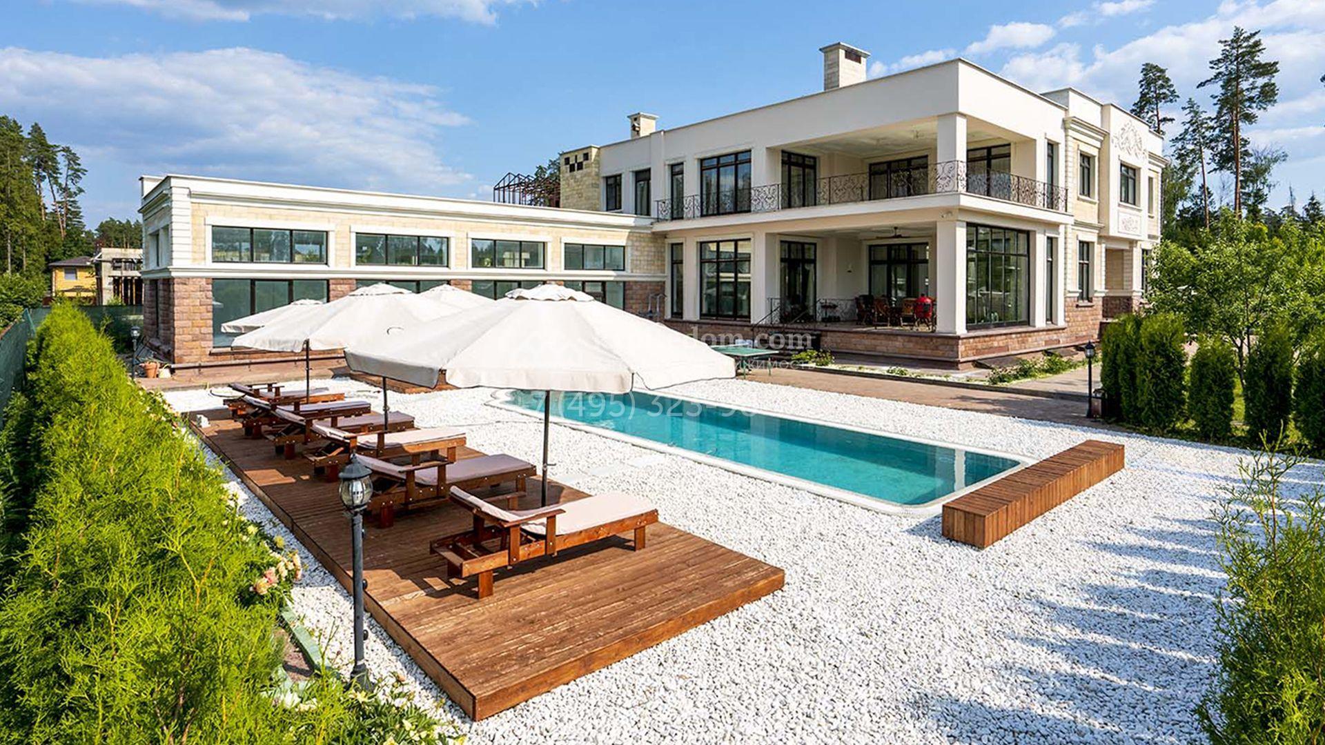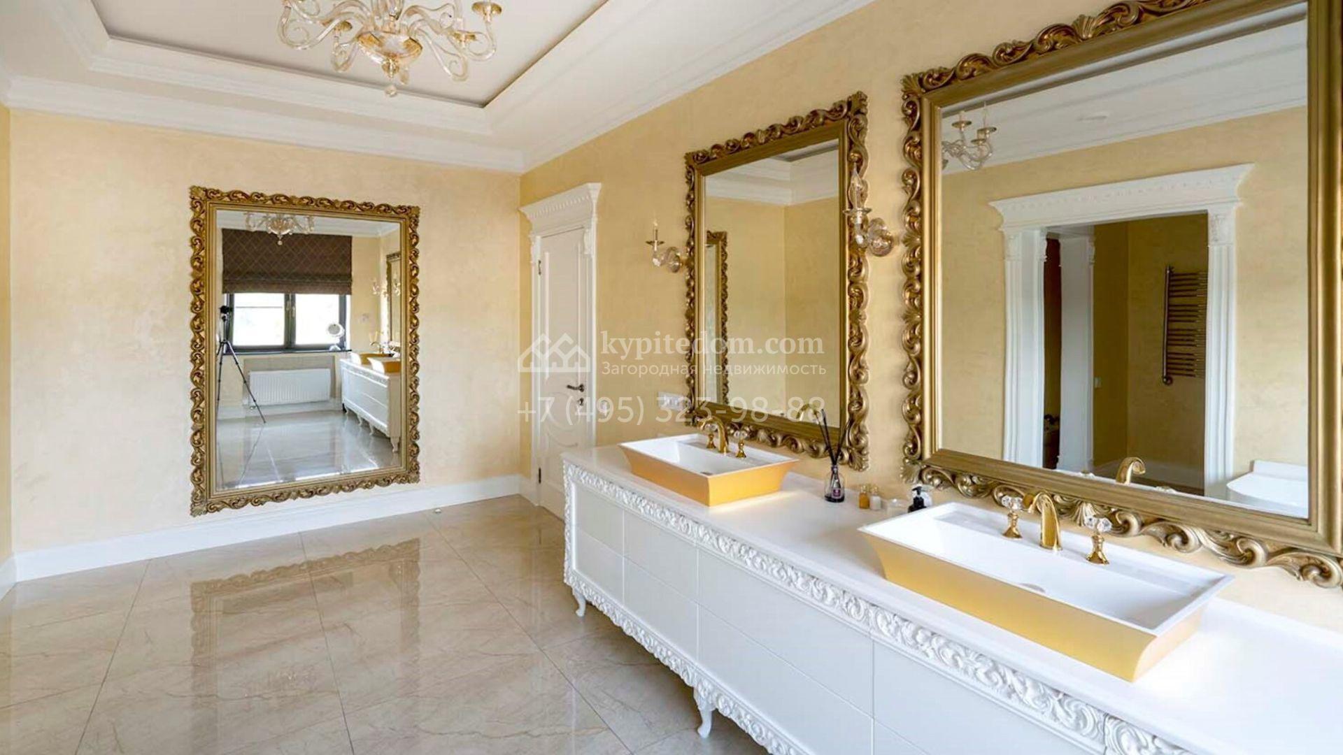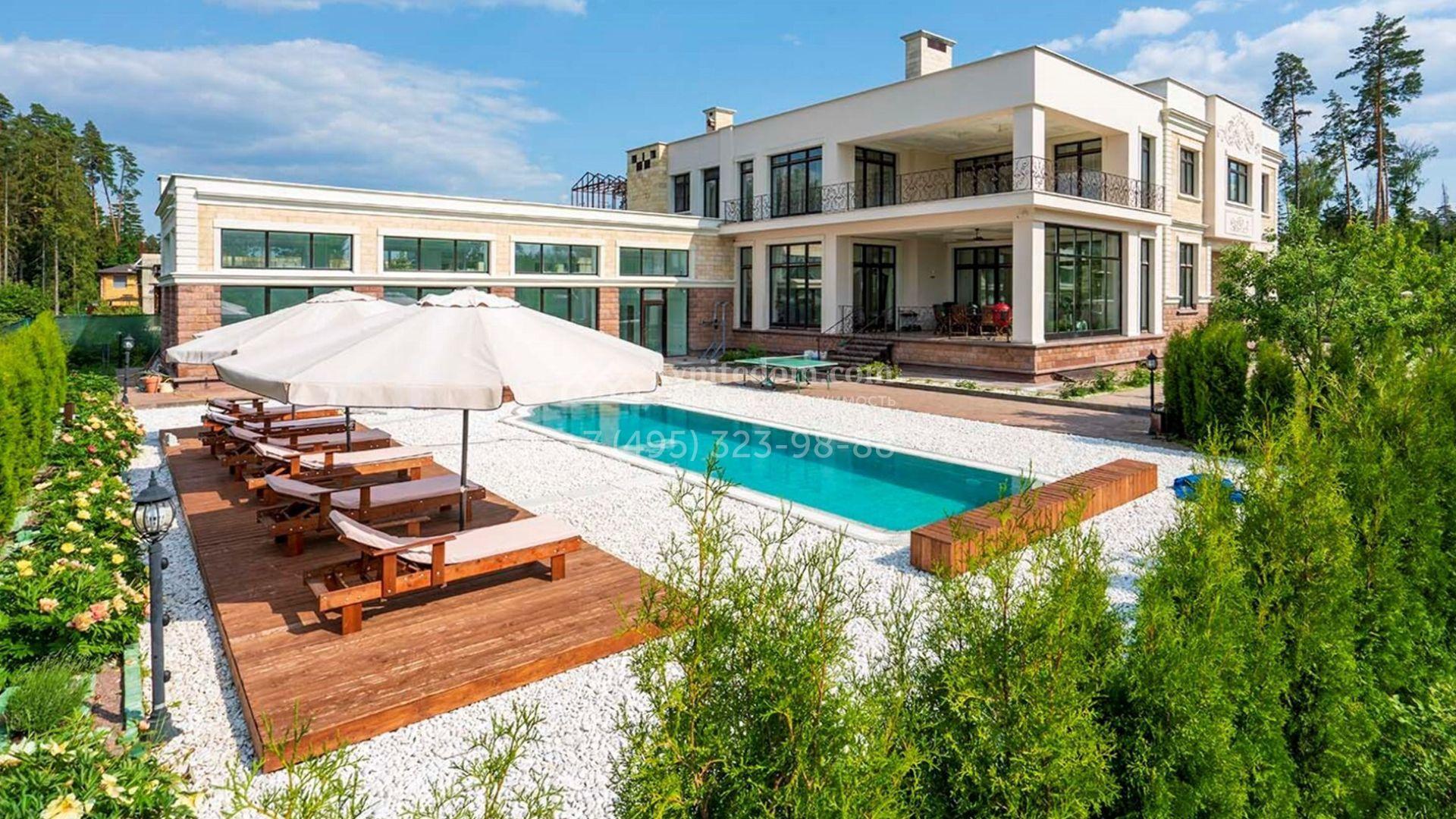 Загородная резиденция площадью 1663 м² расположена на просторном участке 25 соток около леса. Светлый фасад сочетает в себе современный и классический стили — дом с панорамным остеклением украшен лепным вензелем. Планировкой коттеджа предусмотрены 8 спален, гостиная с камином, кухня, зимний сад с выходом на террасу, сауна, хаммам, русская баня, 2 тренажерных зала и гараж на 4 машины, над которым расположили квартиру для персонала. К дому пристроен спа-комплекс с бассейном. Интерьер выдержали в классическом стиле в бежево-золотистых тонах. На участке выполнили ландшафтные работы, постелили газон, посадили деревья, обустроили беседку с зоной барбекю, паркинг и проложили дорожки к уличному бассейну.