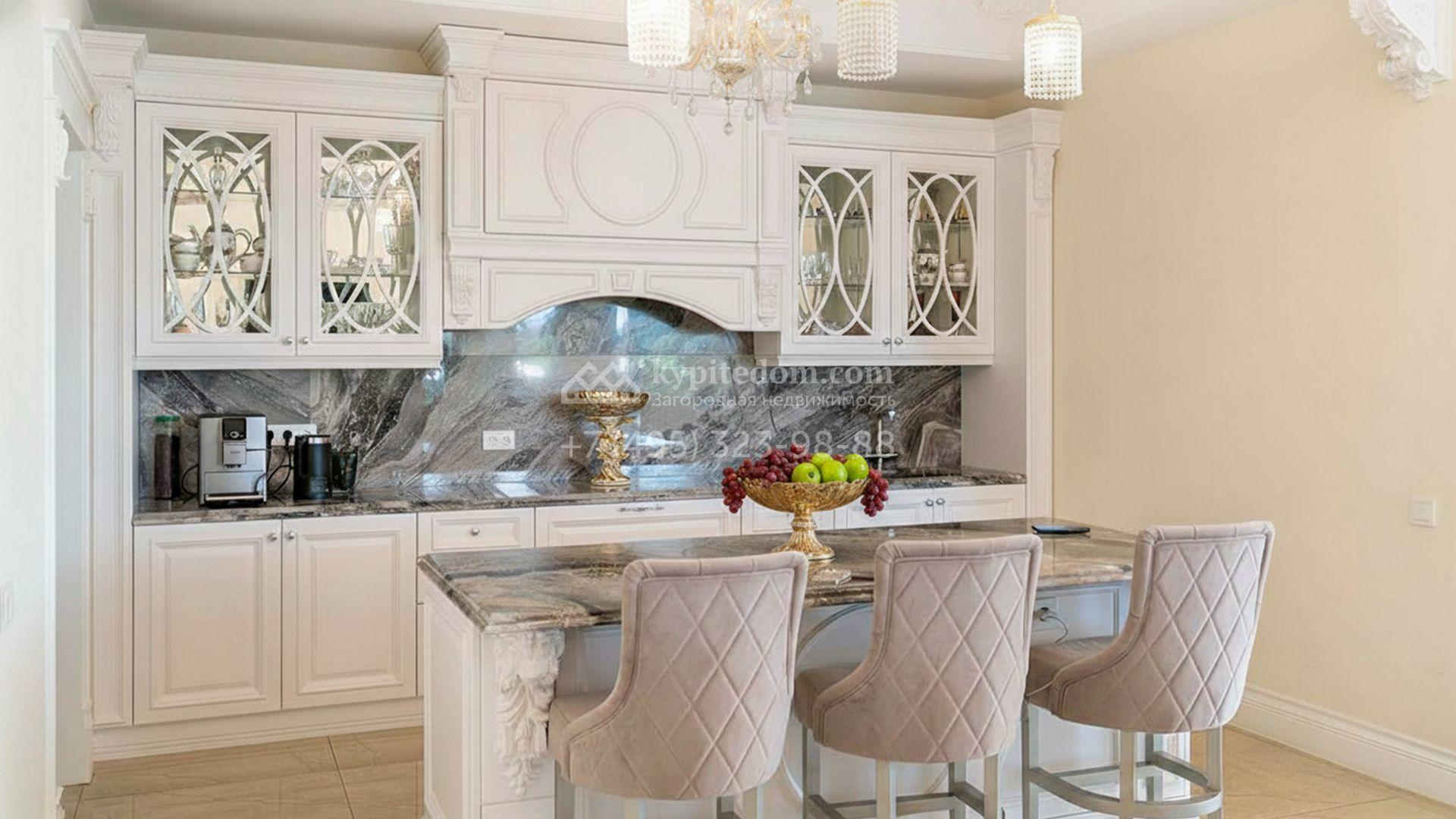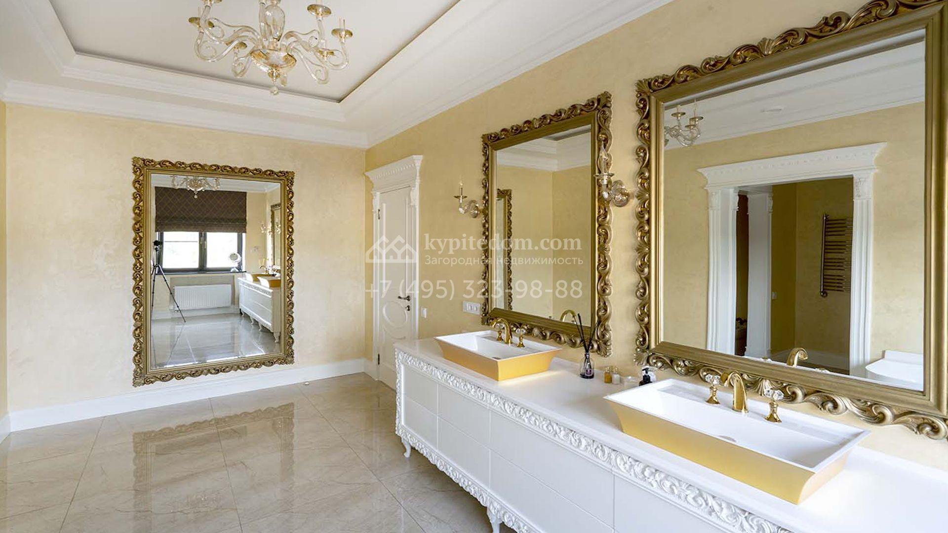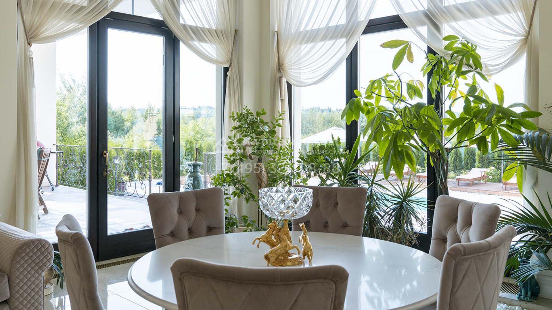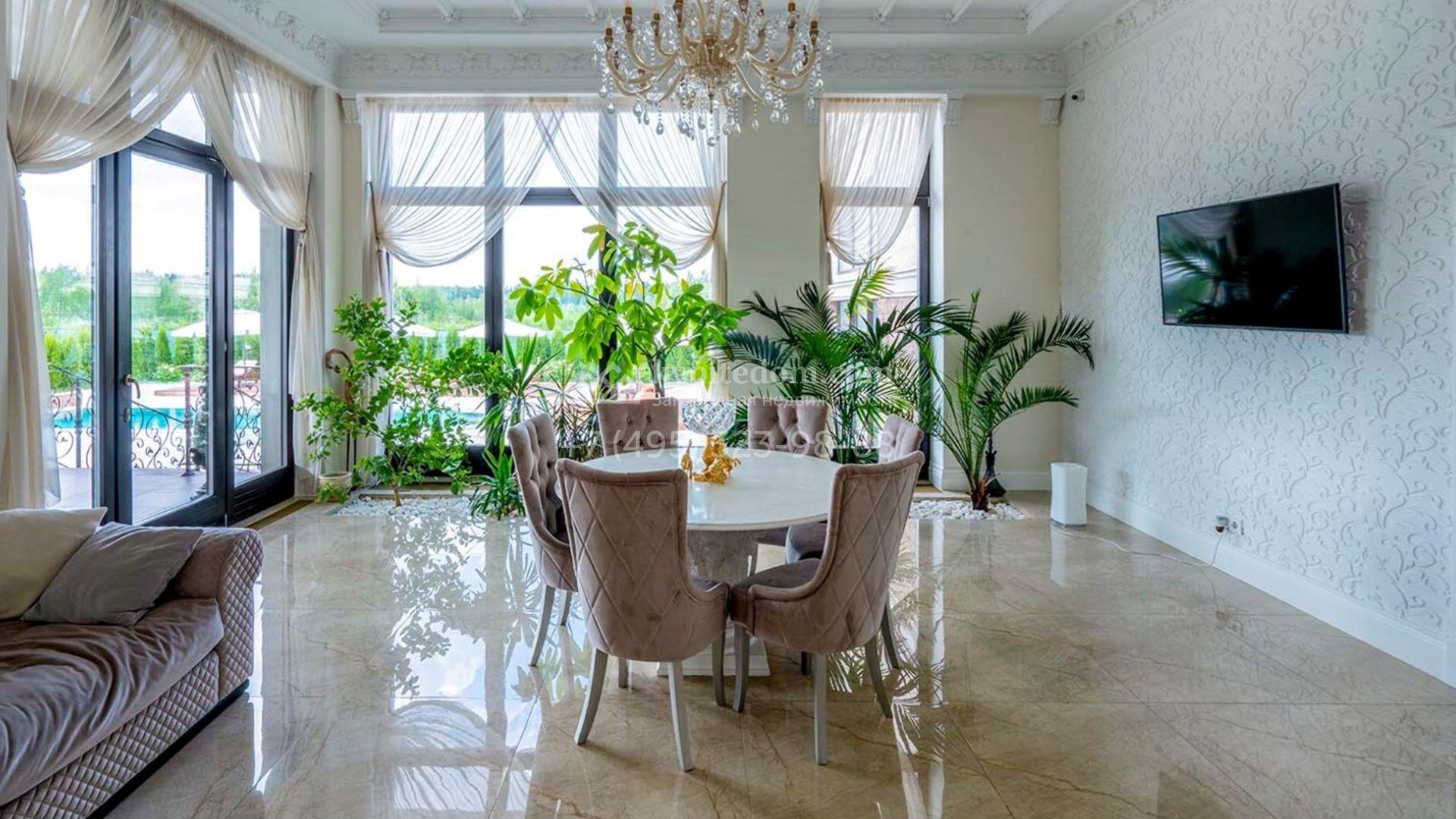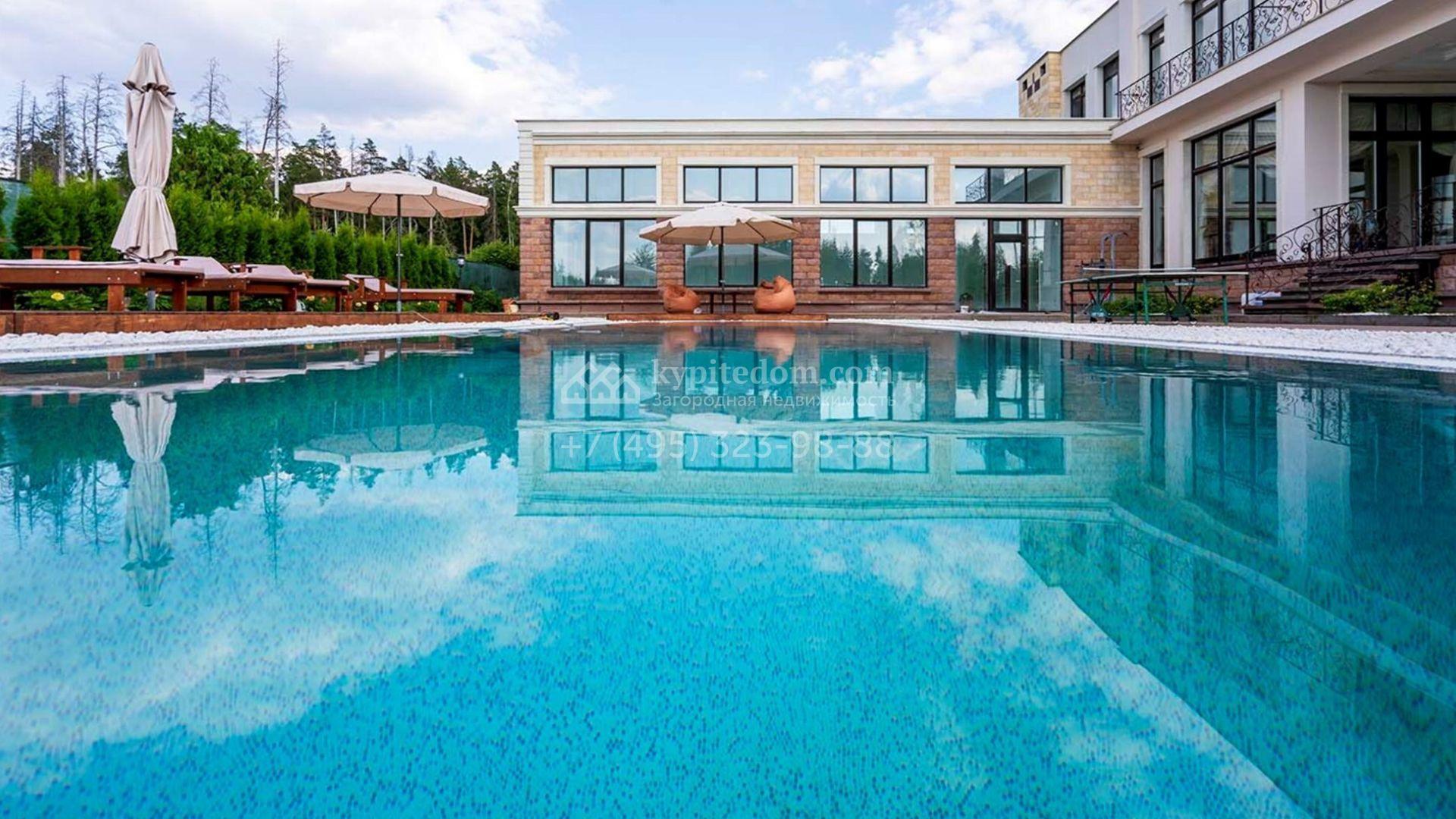 Загородная резиденция площадью 1663 м² расположена на просторном участке 25 соток около леса. Светлый фасад сочетает в себе современный и классический стили — дом с панорамным остеклением украшен лепным вензелем. Планировкой коттеджа предусмотрены 8 спален, гостиная с камином, кухня, зимний сад с выходом на террасу, сауна, хаммам, русская баня, 2 тренажерных зала и гараж на 4 машины, над которым расположили квартиру для персонала. К дому пристроен спа-комплекс с бассейном. Интерьер выдержали в классическом стиле в бежево-золотистых тонах. На участке выполнили ландшафтные работы, постелили газон, посадили деревья, обустроили беседку с зоной барбекю, паркинг и проложили дорожки к уличному бассейну.