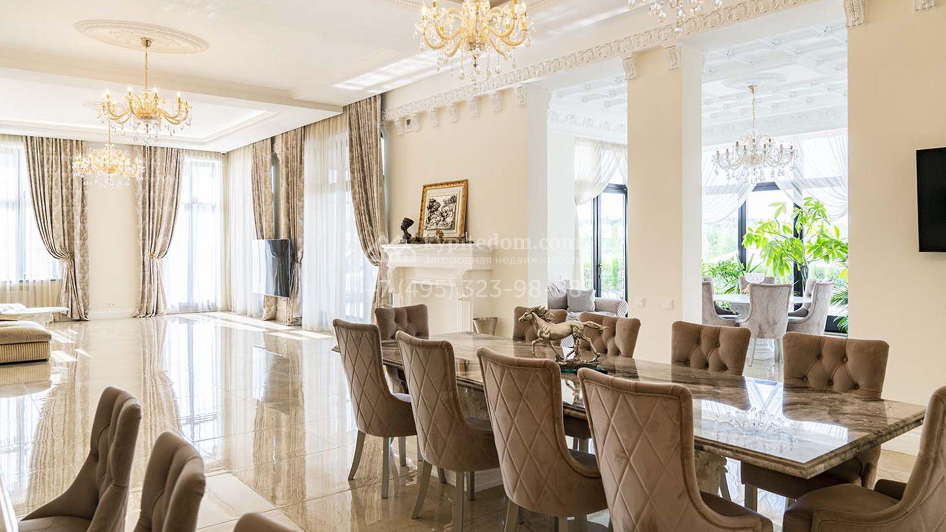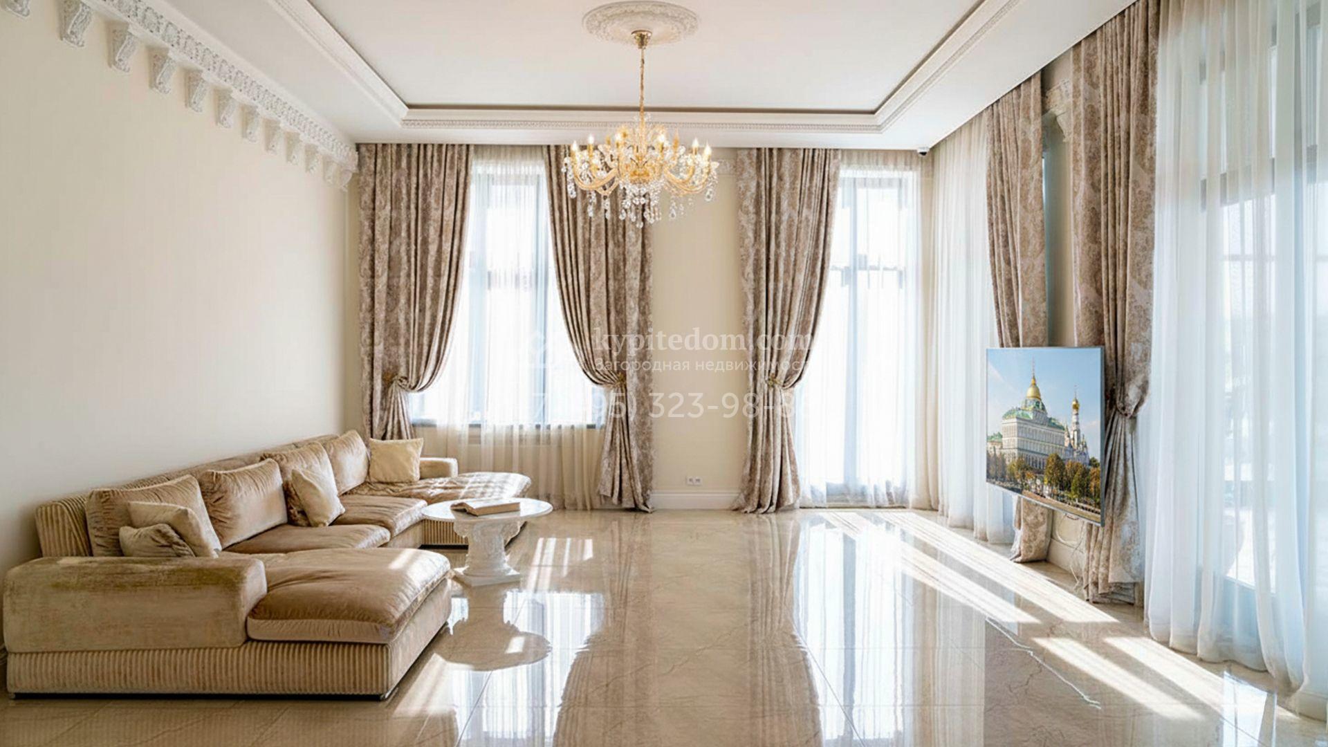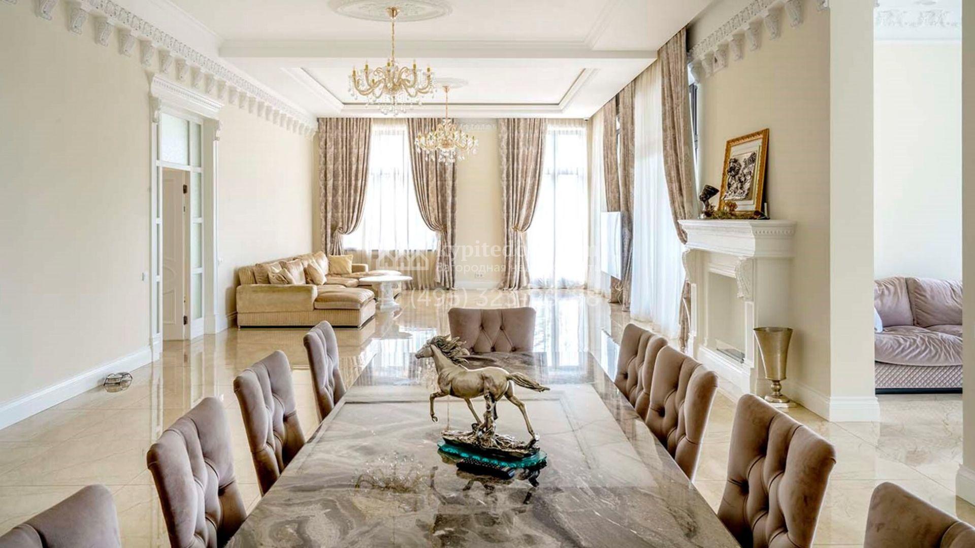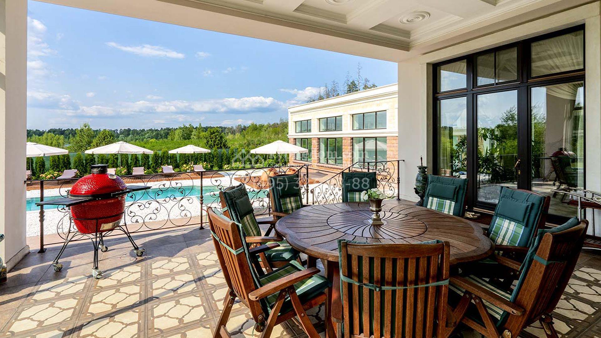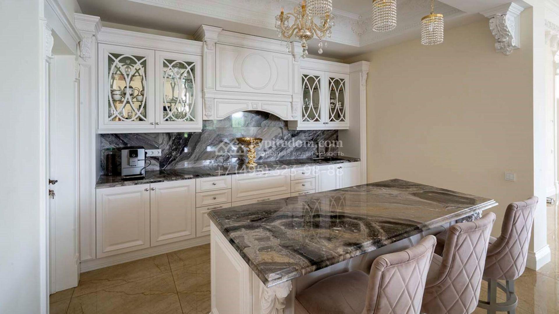 Загородная резиденция площадью 1663 м² расположена на просторном участке 25 соток около леса. Светлый фасад сочетает в себе современный и классический стили — дом с панорамным остеклением украшен лепным вензелем. Планировкой коттеджа предусмотрены 8 спален, гостиная с камином, кухня, зимний сад с выходом на террасу, сауна, хаммам, русская баня, 2 тренажерных зала и гараж на 4 машины, над которым расположили квартиру для персонала. К дому пристроен спа-комплекс с бассейном. Интерьер выдержали в классическом стиле в бежево-золотистых тонах. На участке выполнили ландшафтные работы, постелили газон, посадили деревья, обустроили беседку с зоной барбекю, паркинг и проложили дорожки к уличному бассейну.