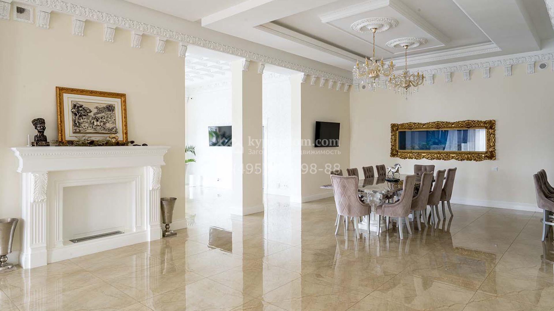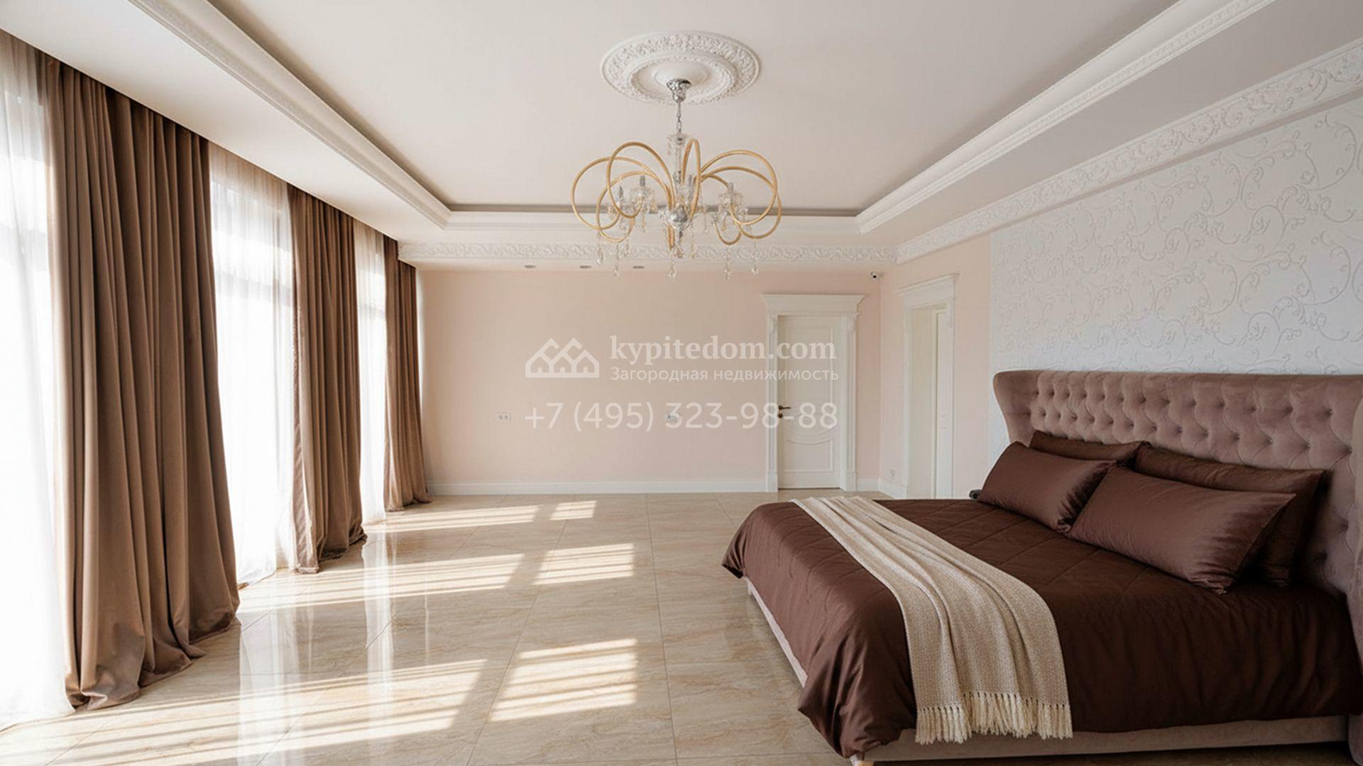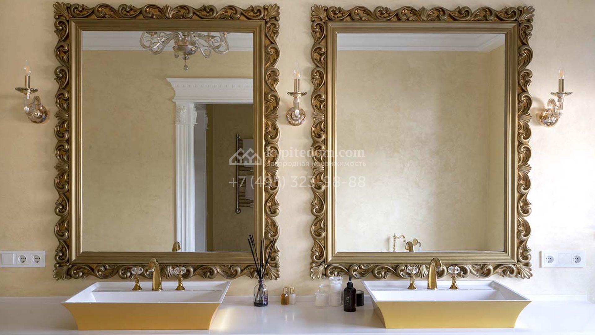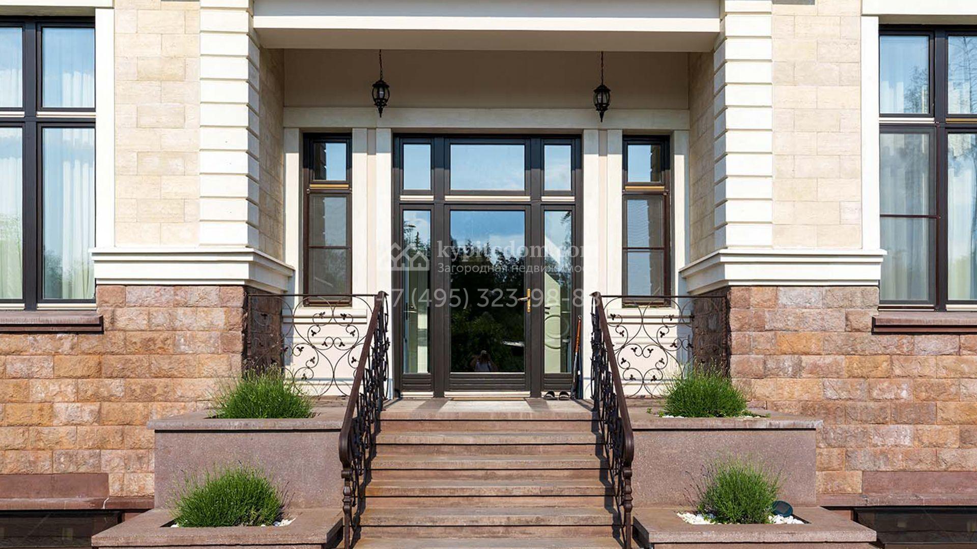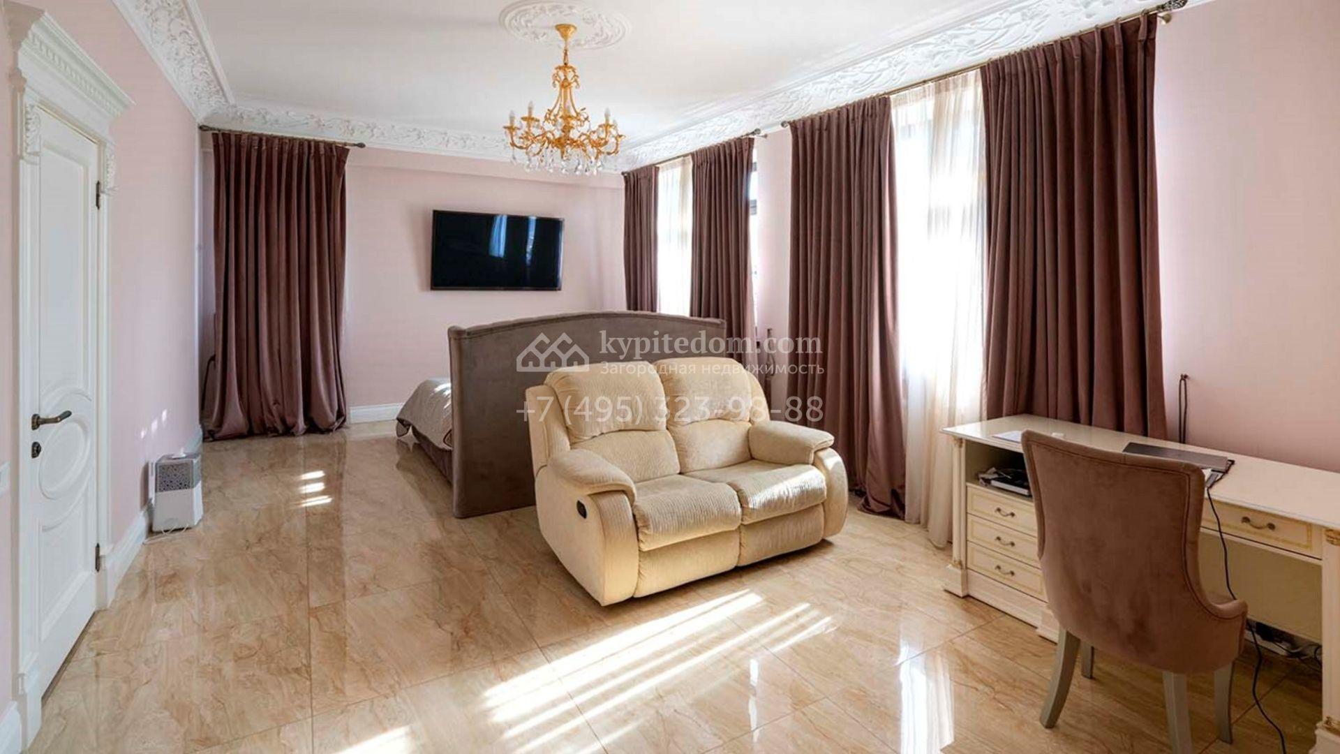 Загородная резиденция площадью 1663 м² расположена на просторном участке 25 соток около леса. Светлый фасад сочетает в себе современный и классический стили — дом с панорамным остеклением украшен лепным вензелем. Планировкой коттеджа предусмотрены 8 спален, гостиная с камином, кухня, зимний сад с выходом на террасу, сауна, хаммам, русская баня, 2 тренажерных зала и гараж на 4 машины, над которым расположили квартиру для персонала. К дому пристроен спа-комплекс с бассейном. Интерьер выдержали в классическом стиле в бежево-золотистых тонах. На участке выполнили ландшафтные работы, постелили газон, посадили деревья, обустроили беседку с зоной барбекю, паркинг и проложили дорожки к уличному бассейну.