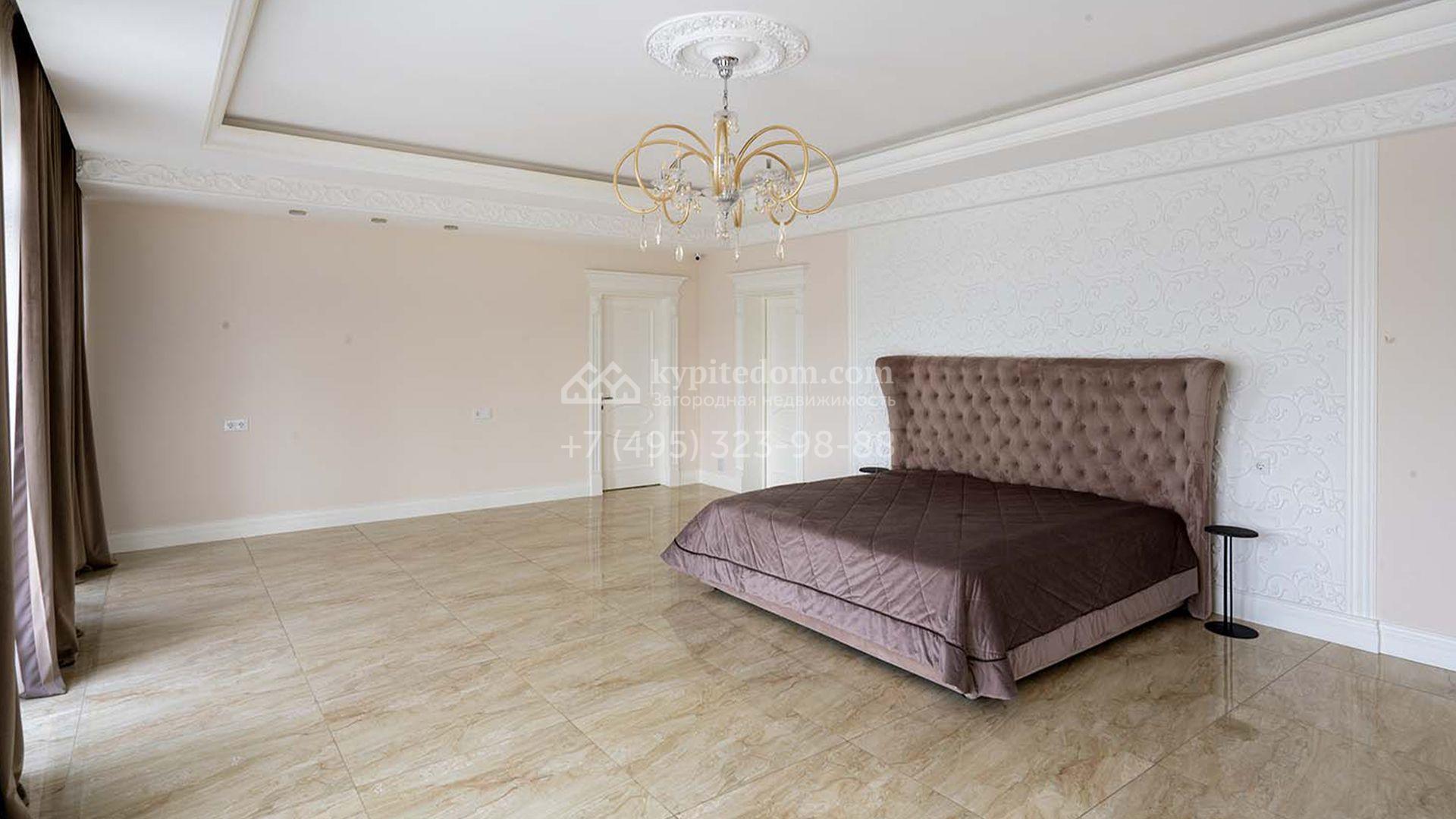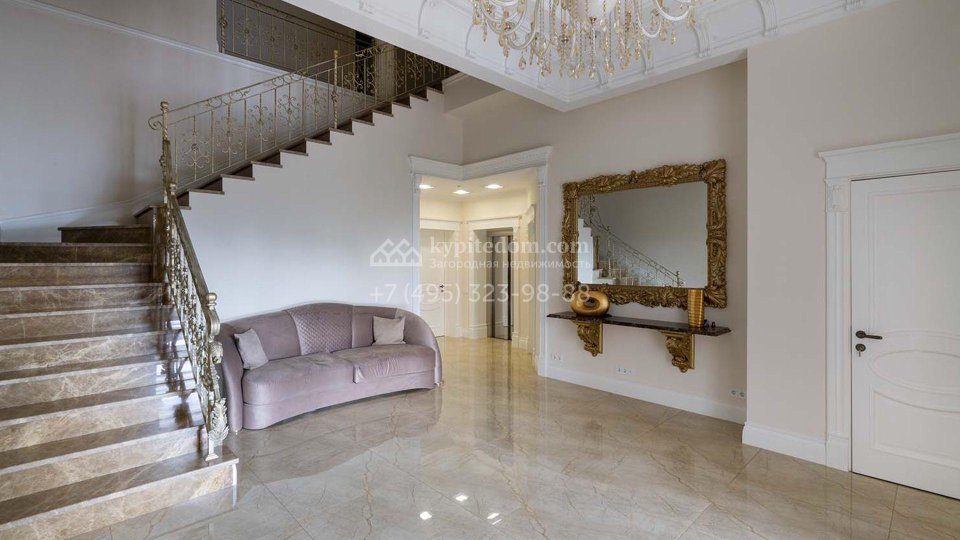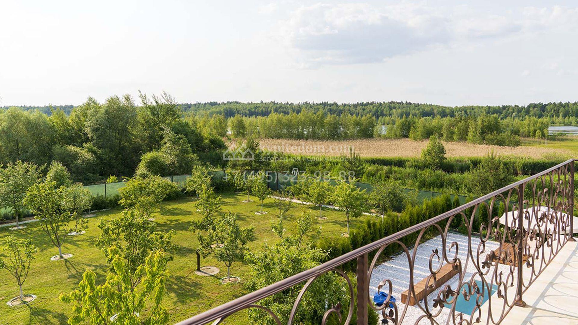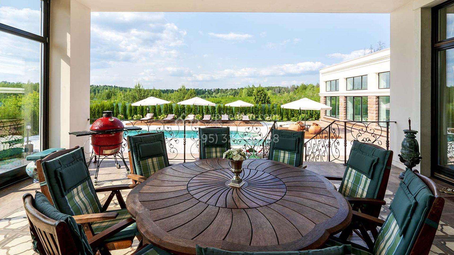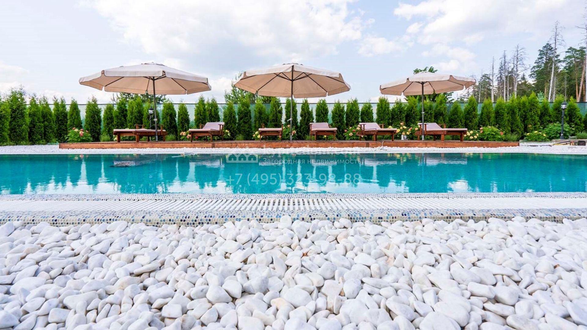 Загородная резиденция площадью 1663 м² расположена на просторном участке 25 соток около леса. Светлый фасад сочетает в себе современный и классический стили — дом с панорамным остеклением украшен лепным вензелем. Планировкой коттеджа предусмотрены 8 спален, гостиная с камином, кухня, зимний сад с выходом на террасу, сауна, хаммам, русская баня, 2 тренажерных зала и гараж на 4 машины, над которым расположили квартиру для персонала. К дому пристроен спа-комплекс с бассейном. Интерьер выдержали в классическом стиле в бежево-золотистых тонах. На участке выполнили ландшафтные работы, постелили газон, посадили деревья, обустроили беседку с зоной барбекю, паркинг и проложили дорожки к уличному бассейну.