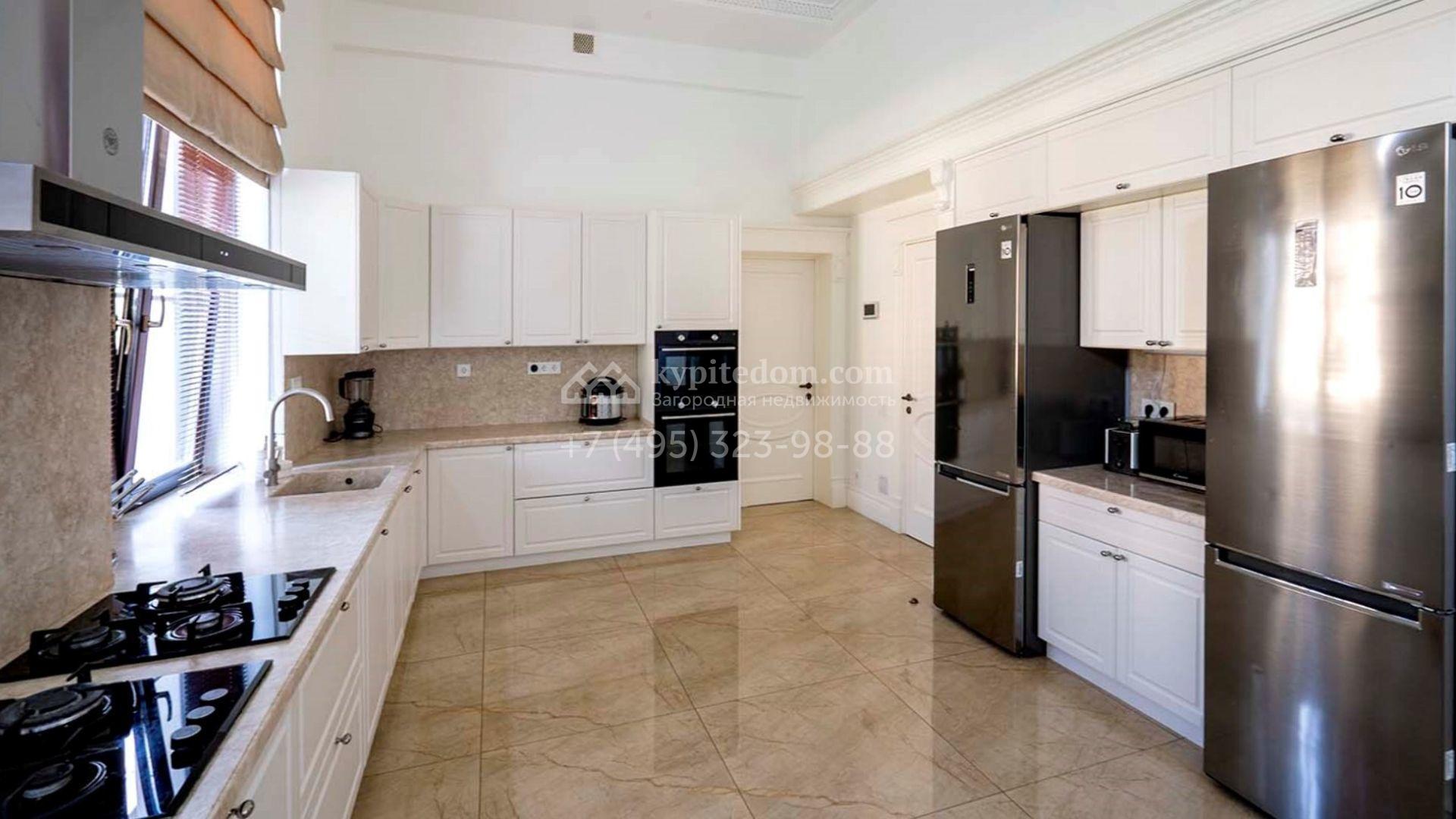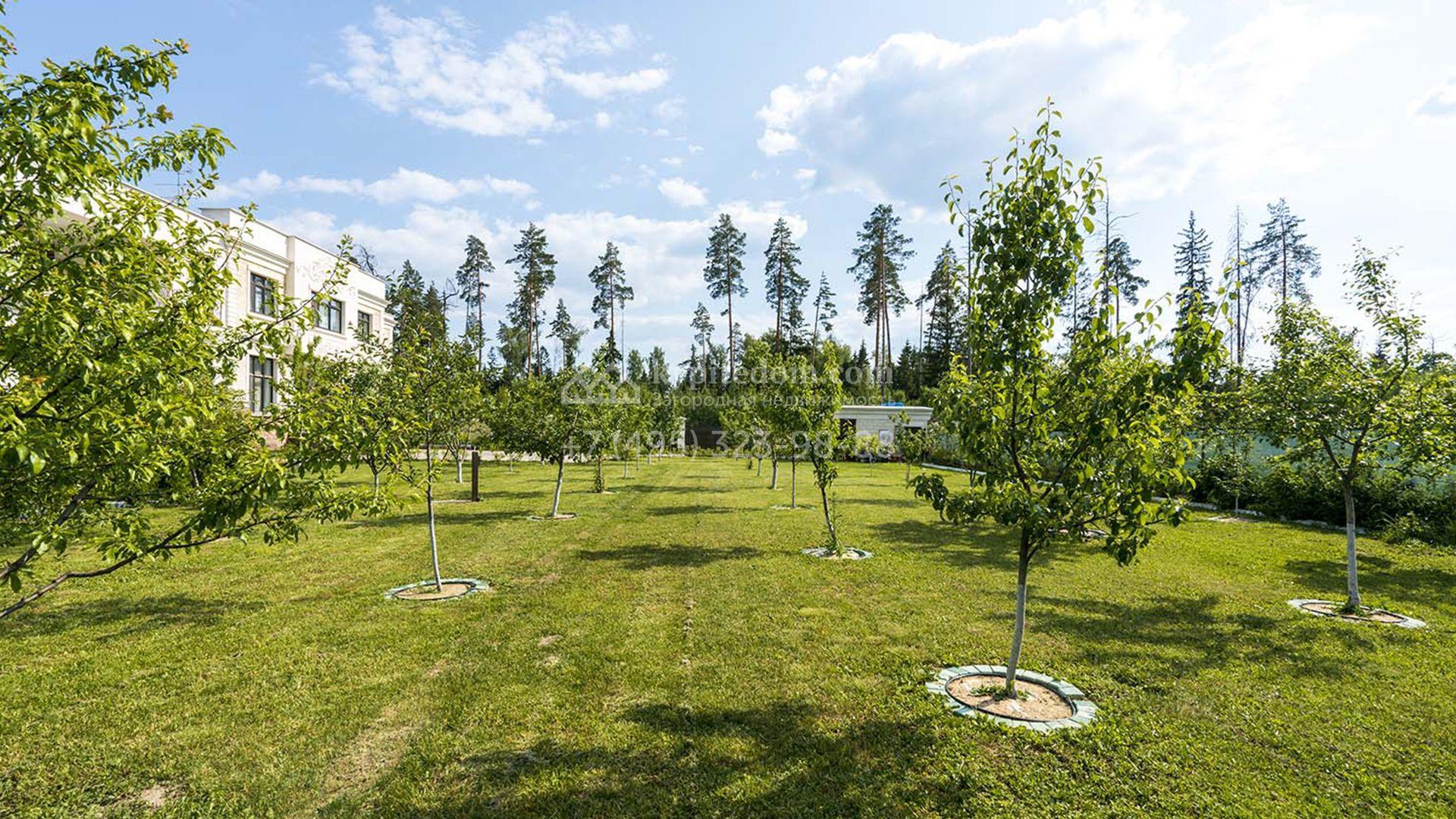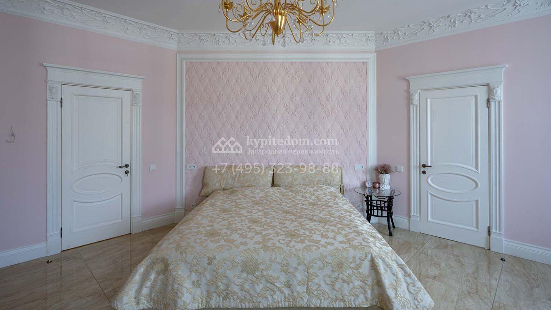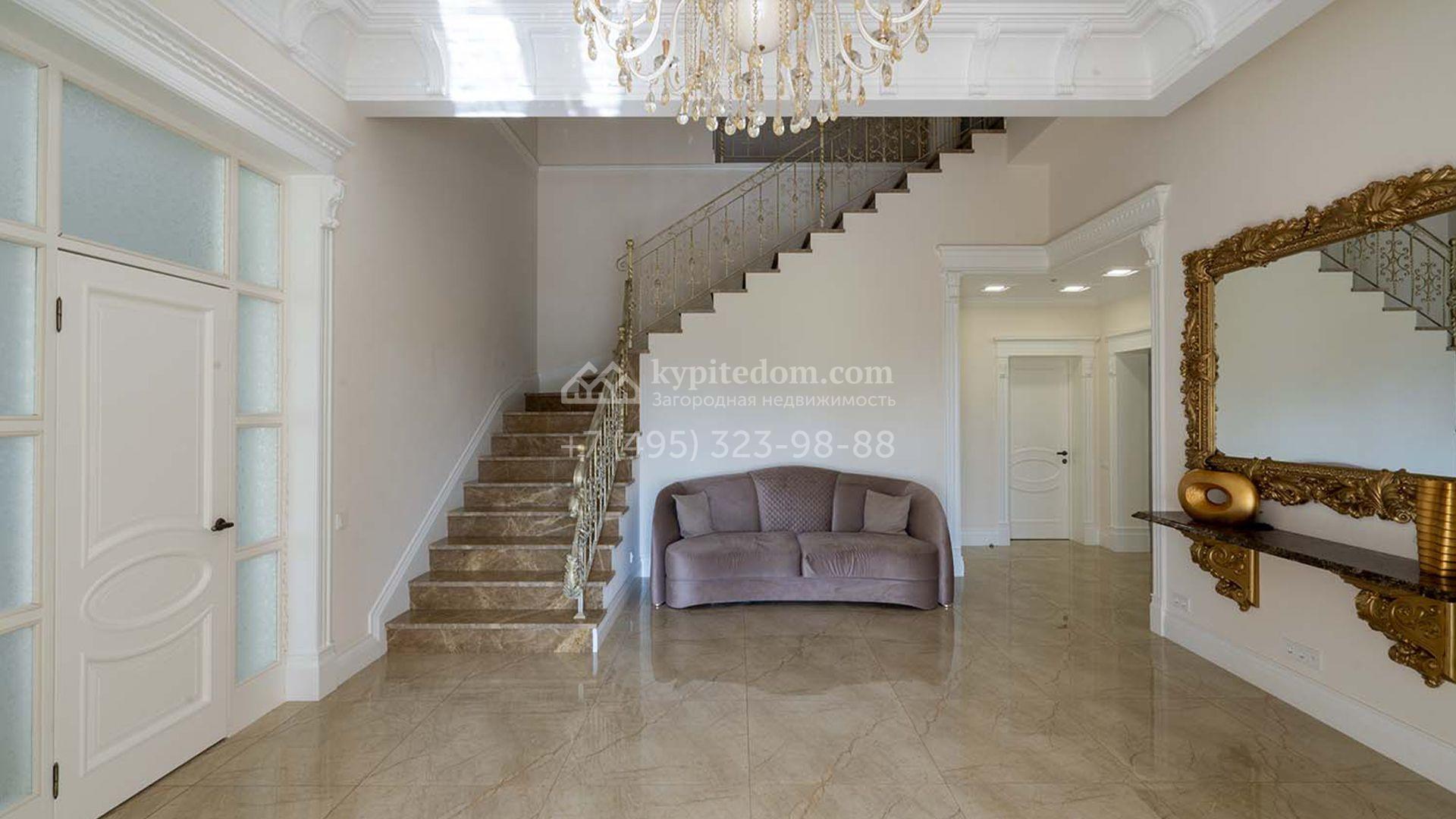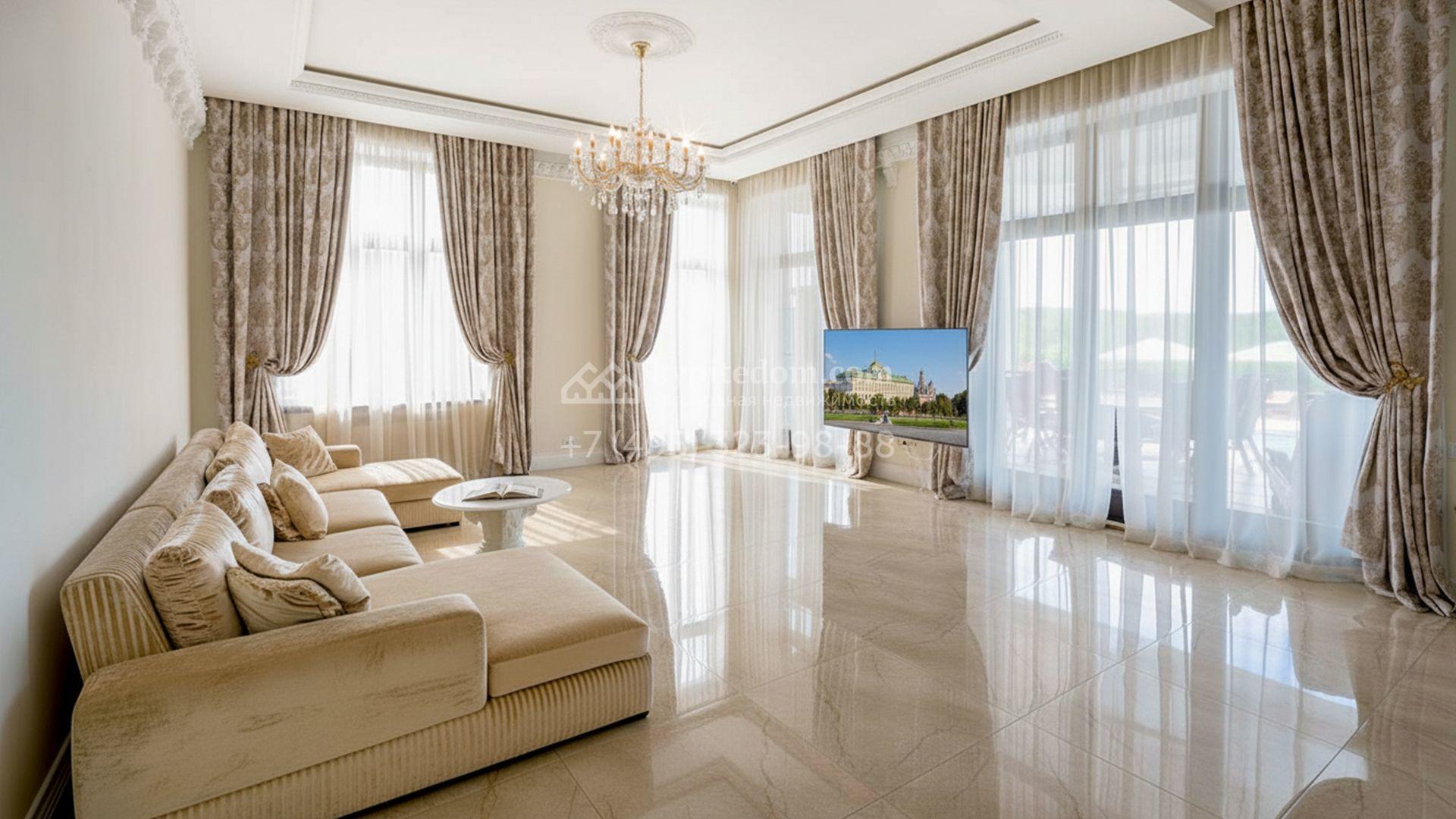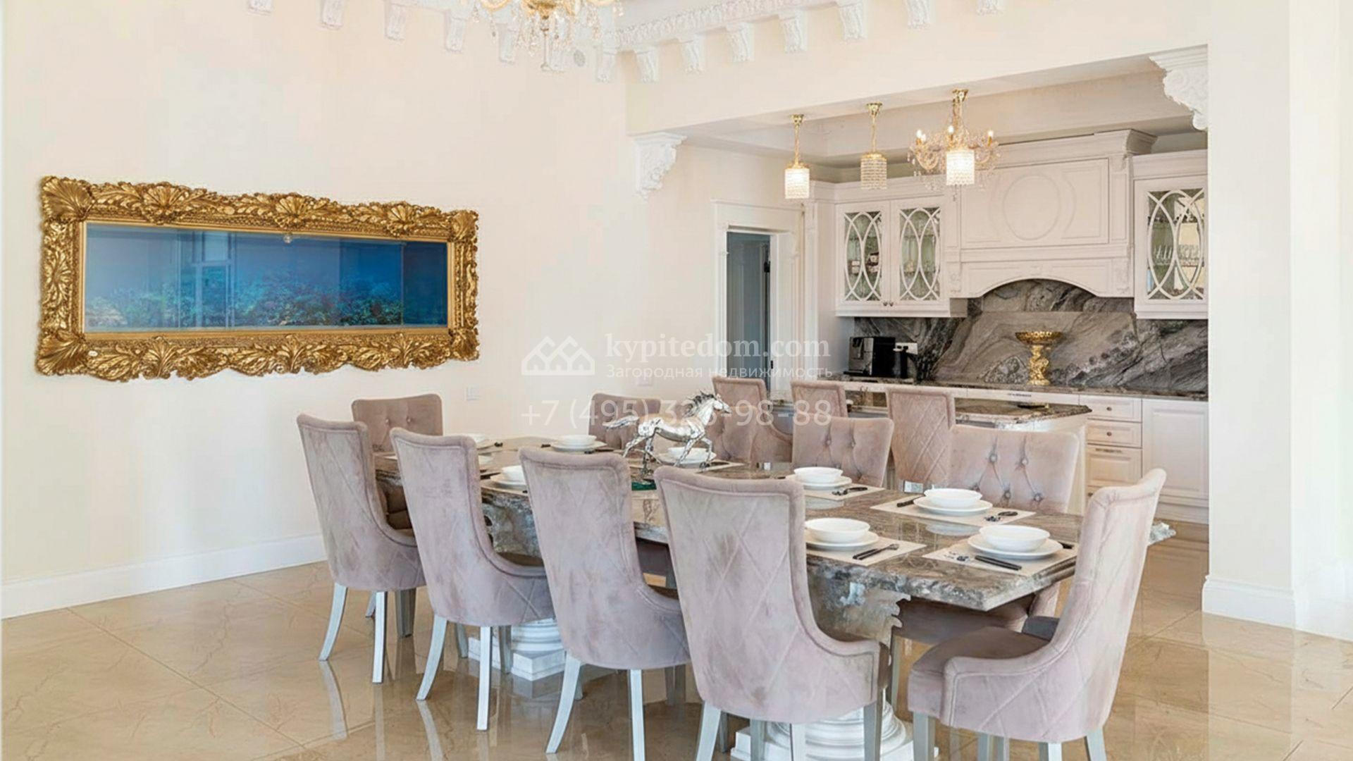 Загородная резиденция площадью 1663 м² расположена на просторном участке 25 соток около леса. Светлый фасад сочетает в себе современный и классический стили — дом с панорамным остеклением украшен лепным вензелем. Планировкой коттеджа предусмотрены 8 спален, гостиная с камином, кухня, зимний сад с выходом на террасу, сауна, хаммам, русская баня, 2 тренажерных зала и гараж на 4 машины, над которым расположили квартиру для персонала. К дому пристроен спа-комплекс с бассейном. Интерьер выдержали в классическом стиле в бежево-золотистых тонах. На участке выполнили ландшафтные работы, постелили газон, посадили деревья, обустроили беседку с зоной барбекю, паркинг и проложили дорожки к уличному бассейну.