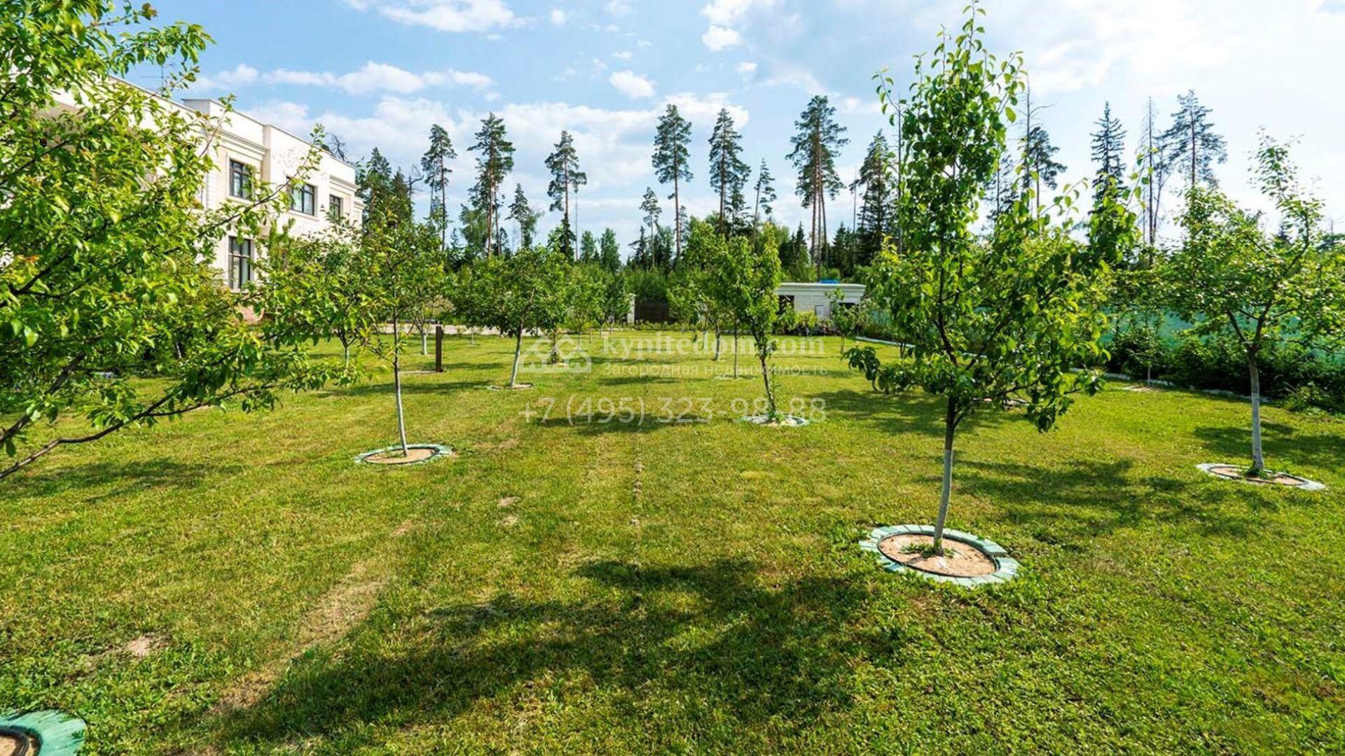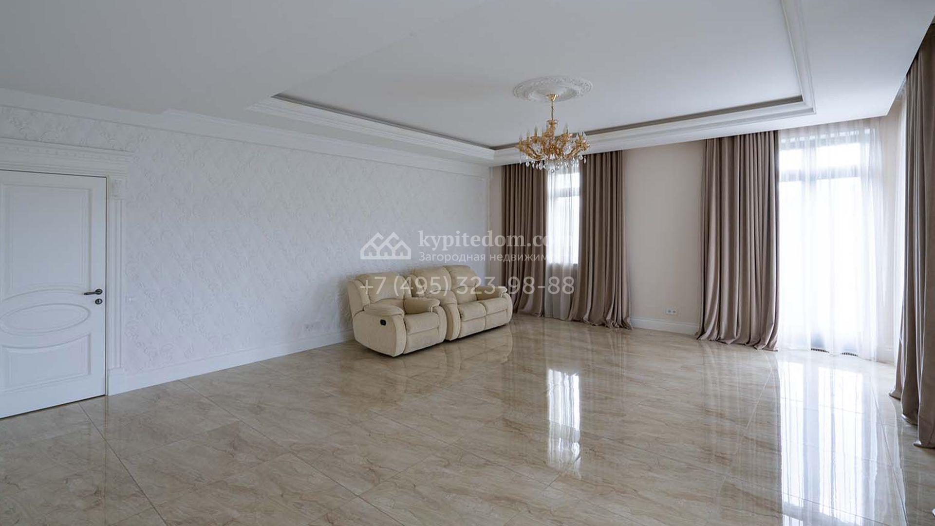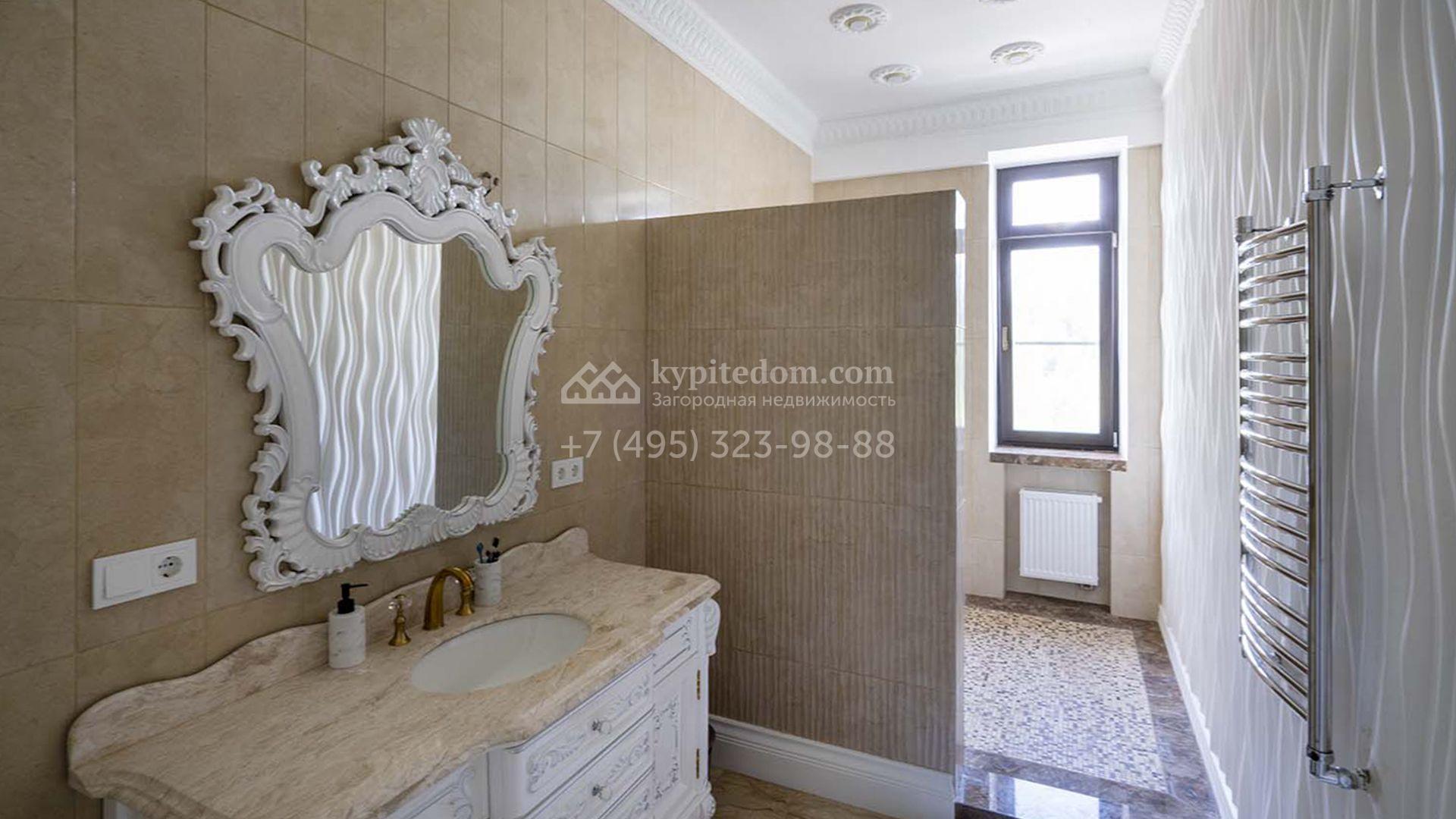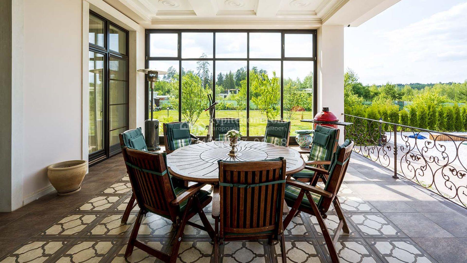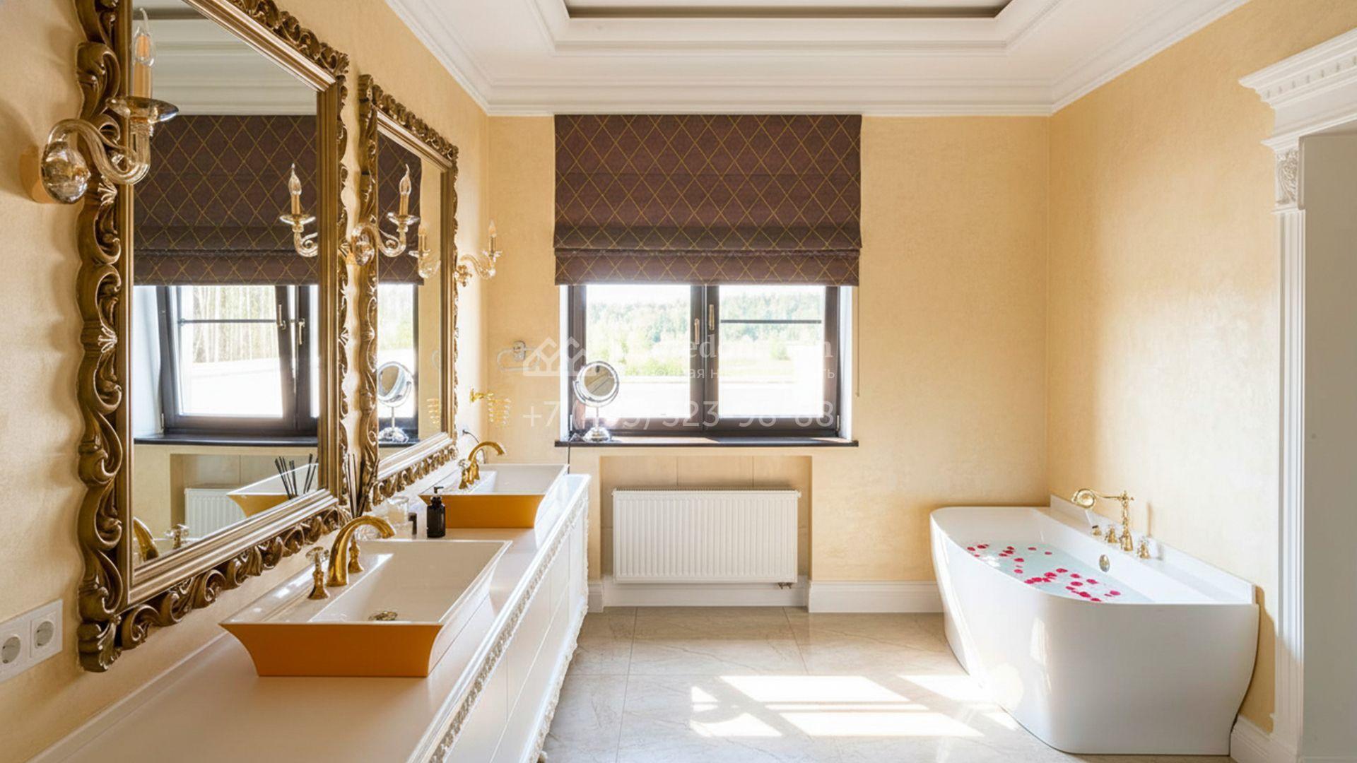 Загородная резиденция площадью 1663 м² расположена на просторном участке 25 соток около леса. Светлый фасад сочетает в себе современный и классический стили — дом с панорамным остеклением украшен лепным вензелем. Планировкой коттеджа предусмотрены 8 спален, гостиная с камином, кухня, зимний сад с выходом на террасу, сауна, хаммам, русская баня, 2 тренажерных зала и гараж на 4 машины, над которым расположили квартиру для персонала. К дому пристроен спа-комплекс с бассейном. Интерьер выдержали в классическом стиле в бежево-золотистых тонах. На участке выполнили ландшафтные работы, постелили газон, посадили деревья, обустроили беседку с зоной барбекю, паркинг и проложили дорожки к уличному бассейну.