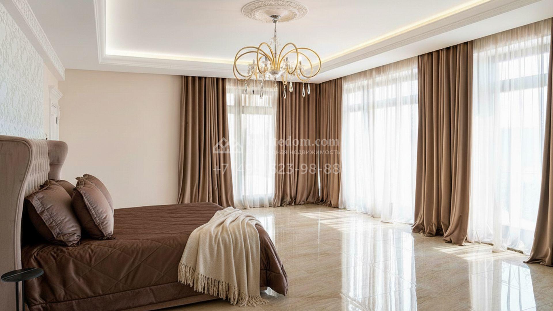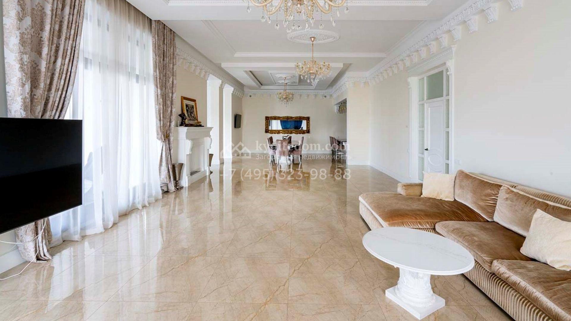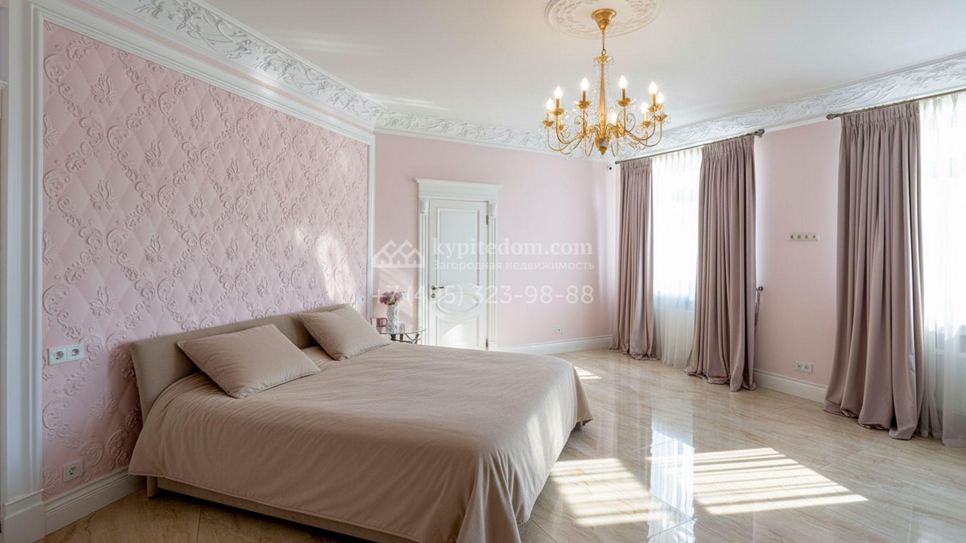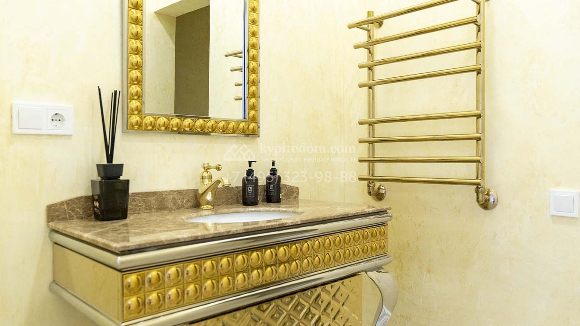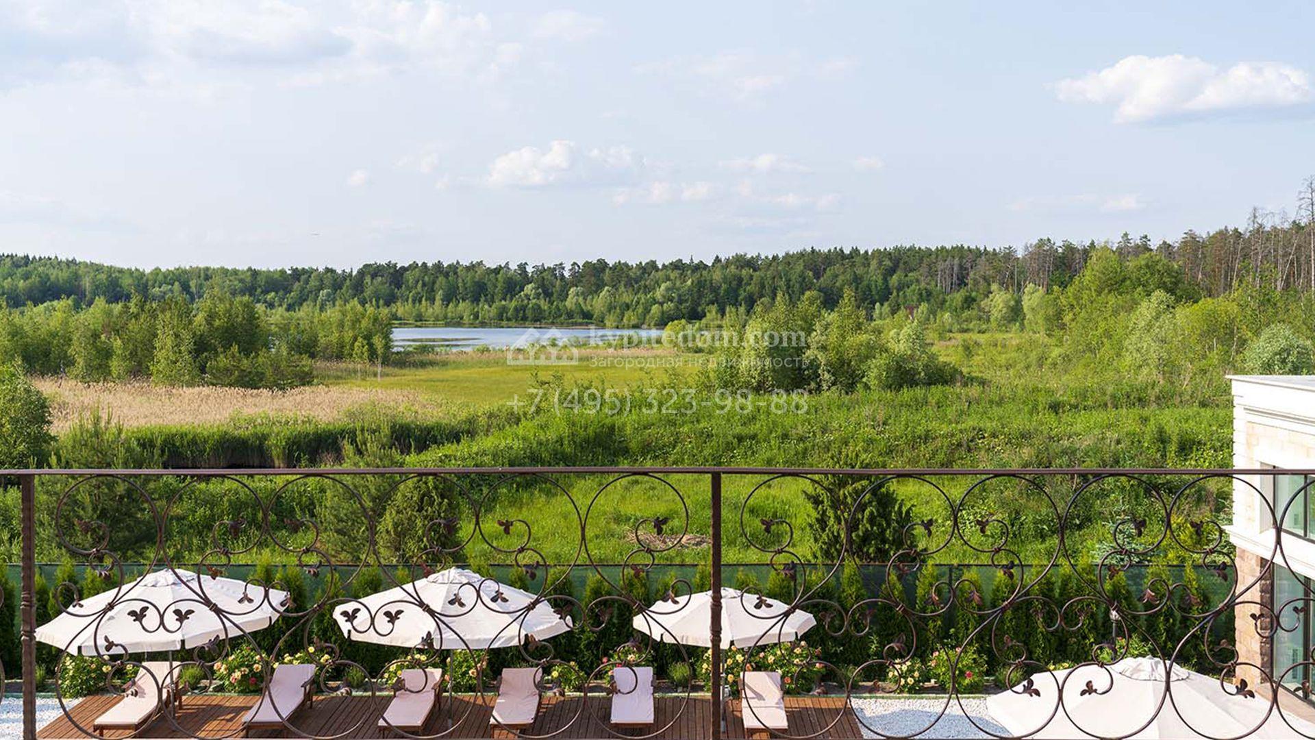 Загородная резиденция площадью 1663 м² расположена на просторном участке 25 соток около леса. Светлый фасад сочетает в себе современный и классический стили — дом с панорамным остеклением украшен лепным вензелем. Планировкой коттеджа предусмотрены 8 спален, гостиная с камином, кухня, зимний сад с выходом на террасу, сауна, хаммам, русская баня, 2 тренажерных зала и гараж на 4 машины, над которым расположили квартиру для персонала. К дому пристроен спа-комплекс с бассейном. Интерьер выдержали в классическом стиле в бежево-золотистых тонах. На участке выполнили ландшафтные работы, постелили газон, посадили деревья, обустроили беседку с зоной барбекю, паркинг и проложили дорожки к уличному бассейну.