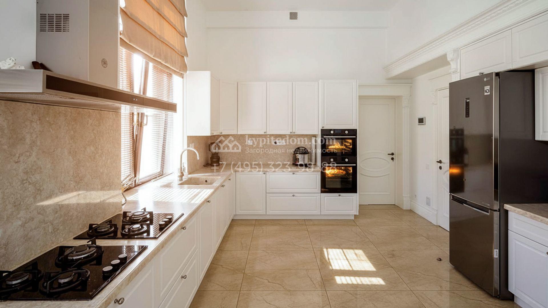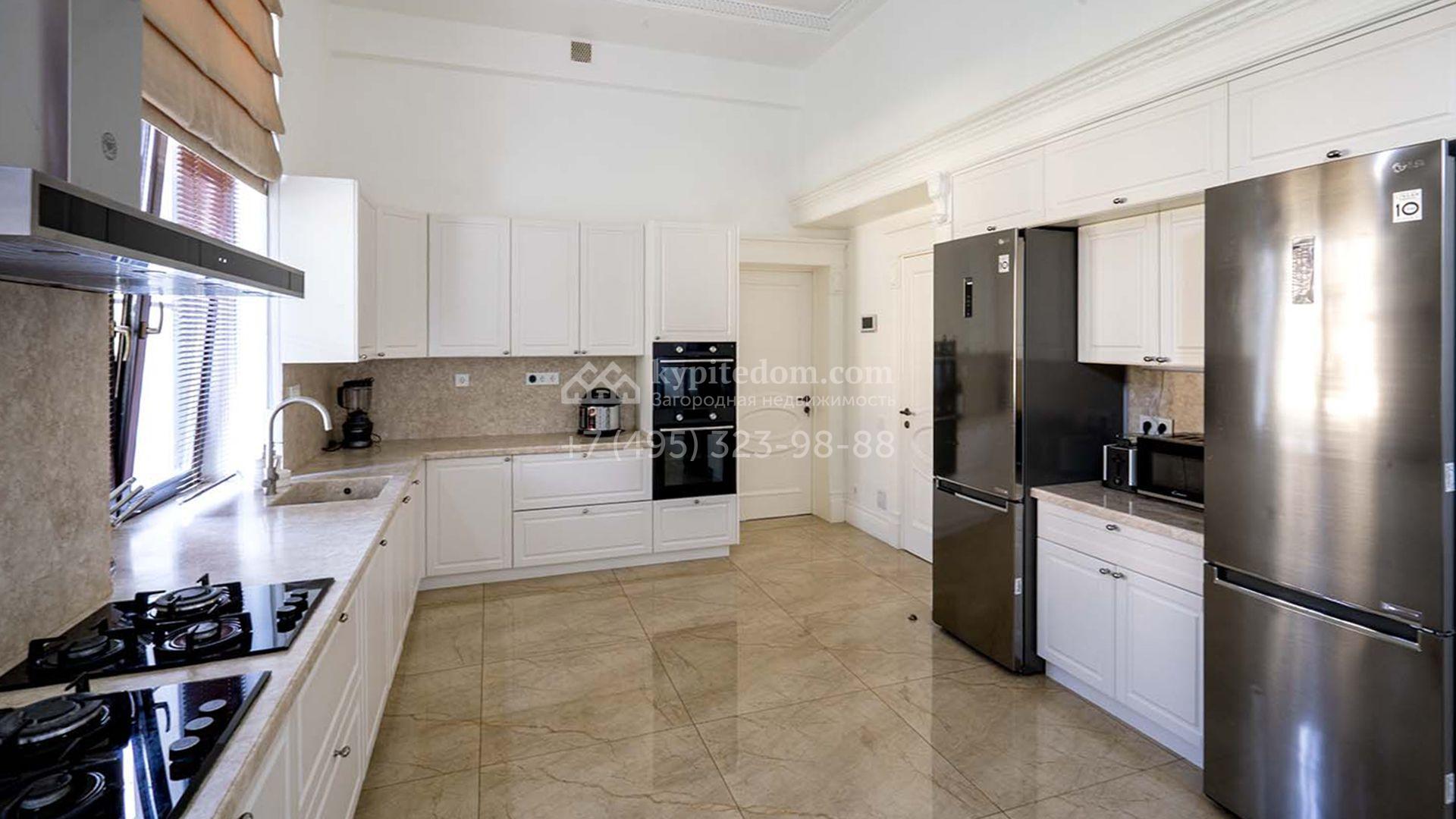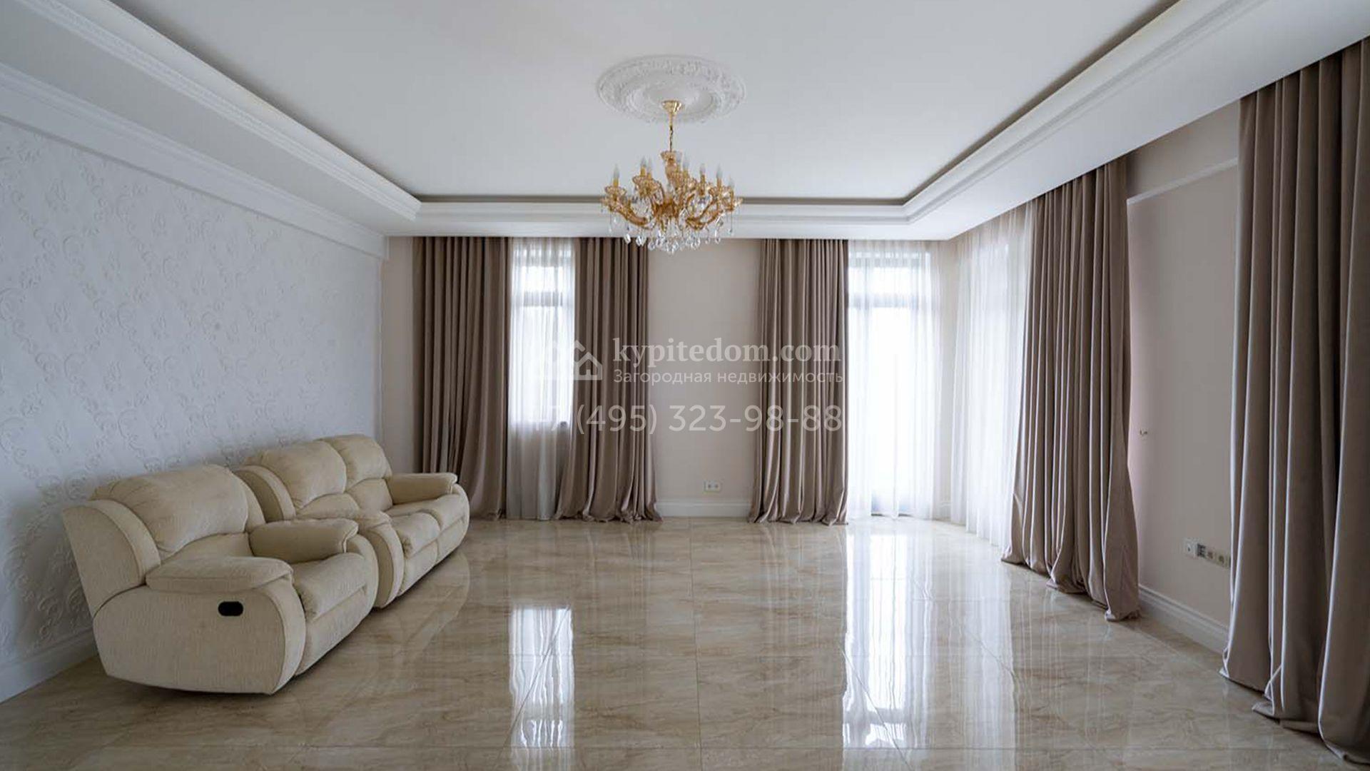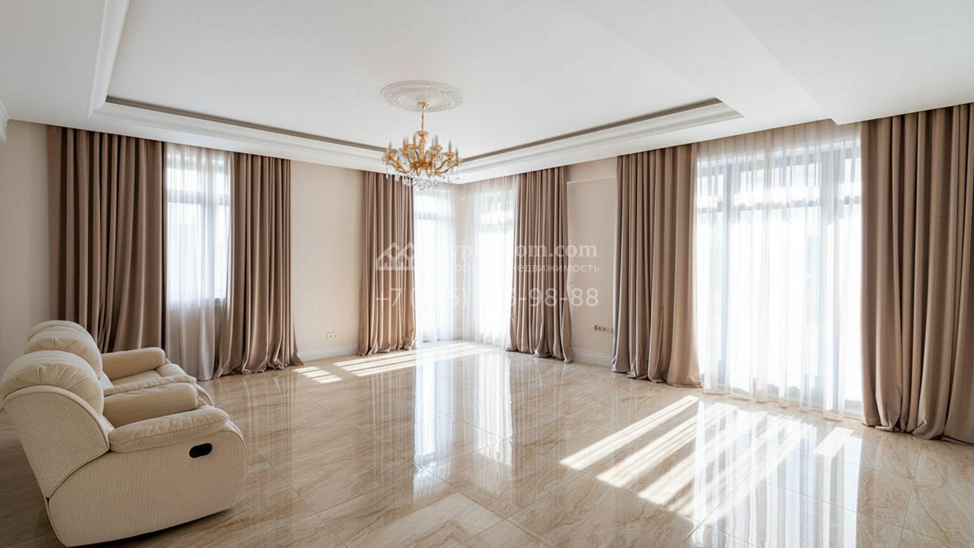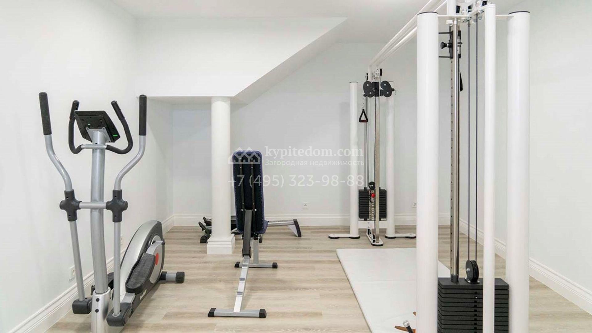 Загородная резиденция площадью 1663 м² расположена на просторном участке 25 соток около леса. Светлый фасад сочетает в себе современный и классический стили — дом с панорамным остеклением украшен лепным вензелем. Планировкой коттеджа предусмотрены 8 спален, гостиная с камином, кухня, зимний сад с выходом на террасу, сауна, хаммам, русская баня, 2 тренажерных зала и гараж на 4 машины, над которым расположили квартиру для персонала. К дому пристроен спа-комплекс с бассейном. Интерьер выдержали в классическом стиле в бежево-золотистых тонах. На участке выполнили ландшафтные работы, постелили газон, посадили деревья, обустроили беседку с зоной барбекю, паркинг и проложили дорожки к уличному бассейну.