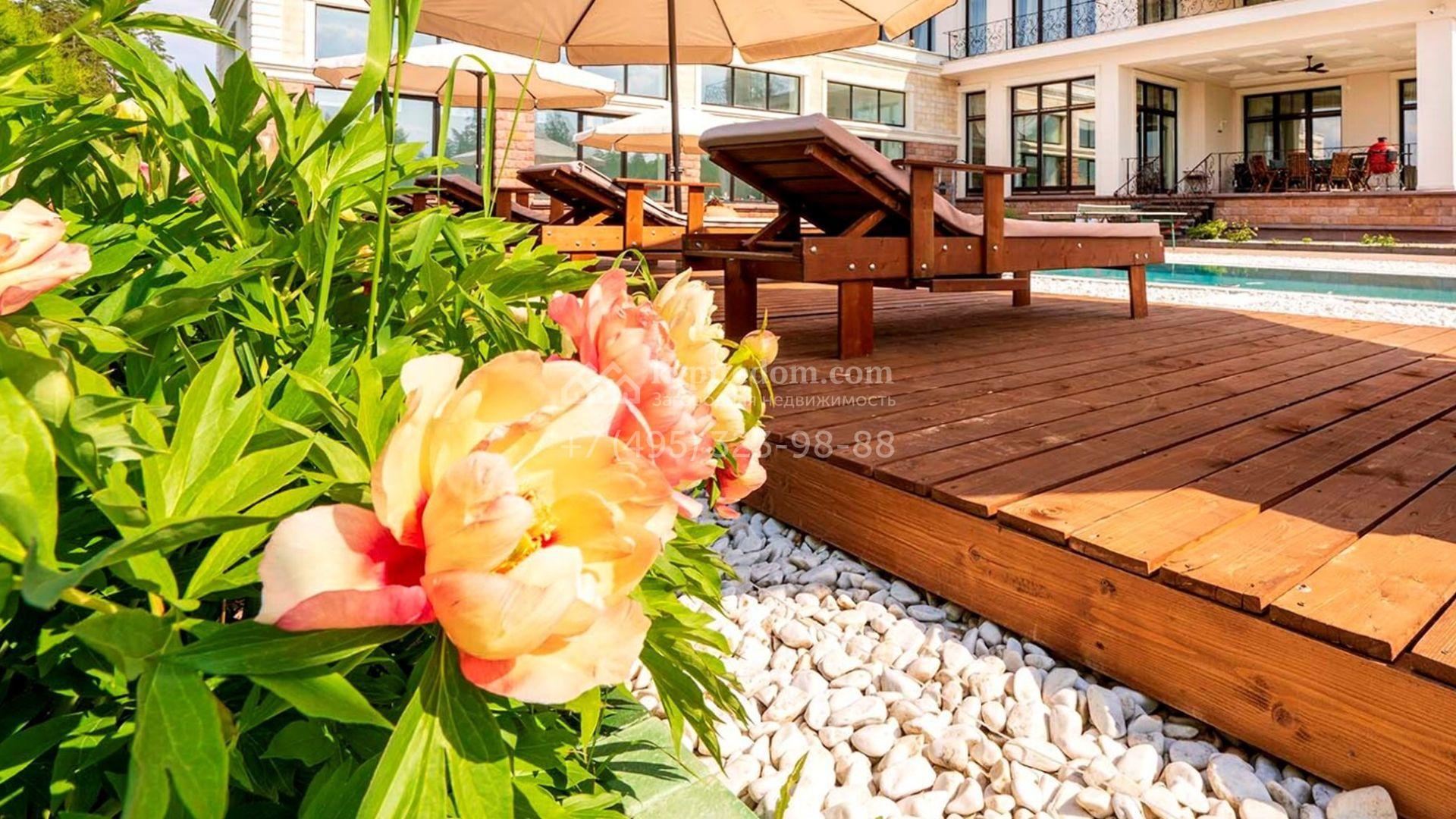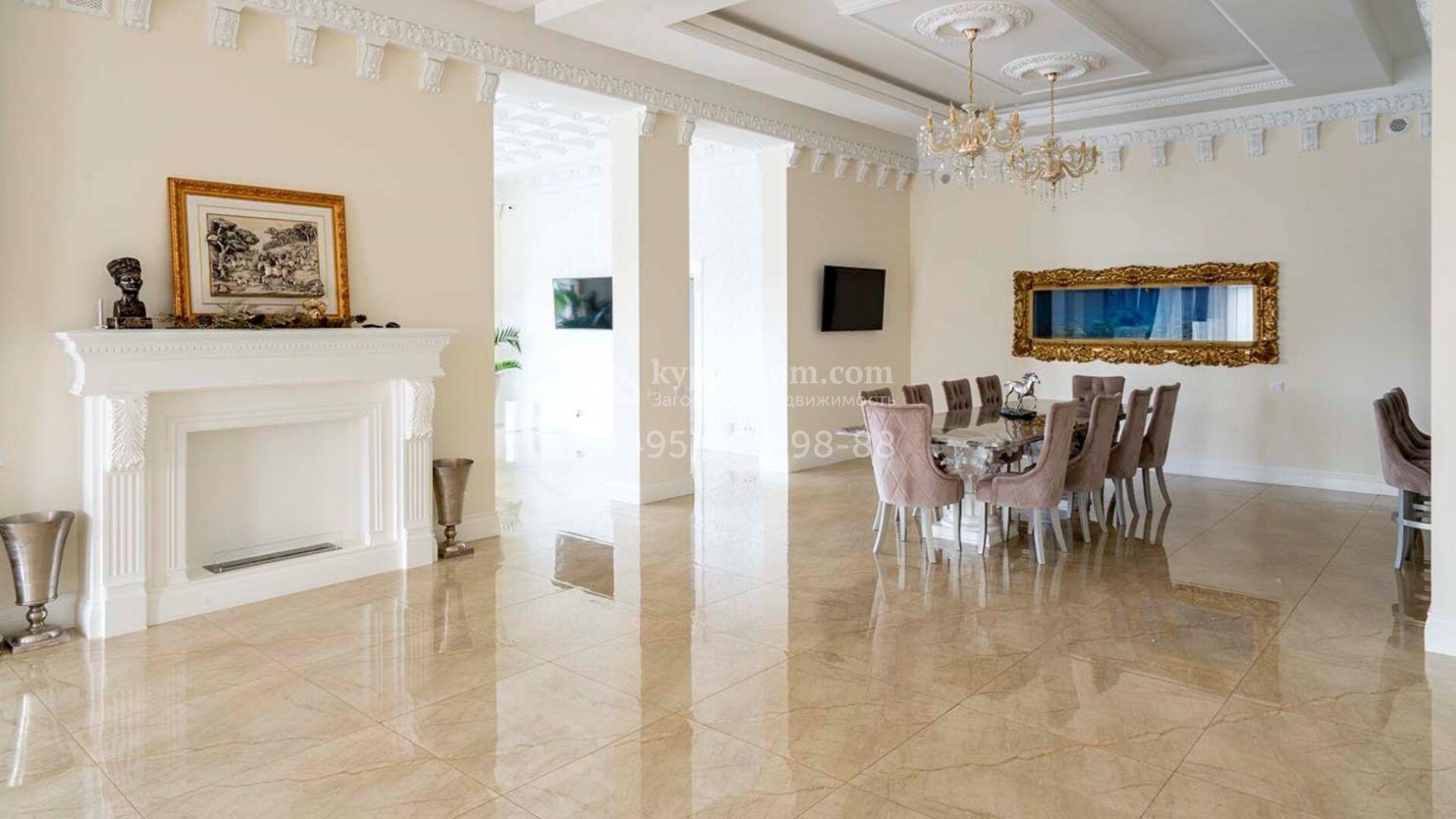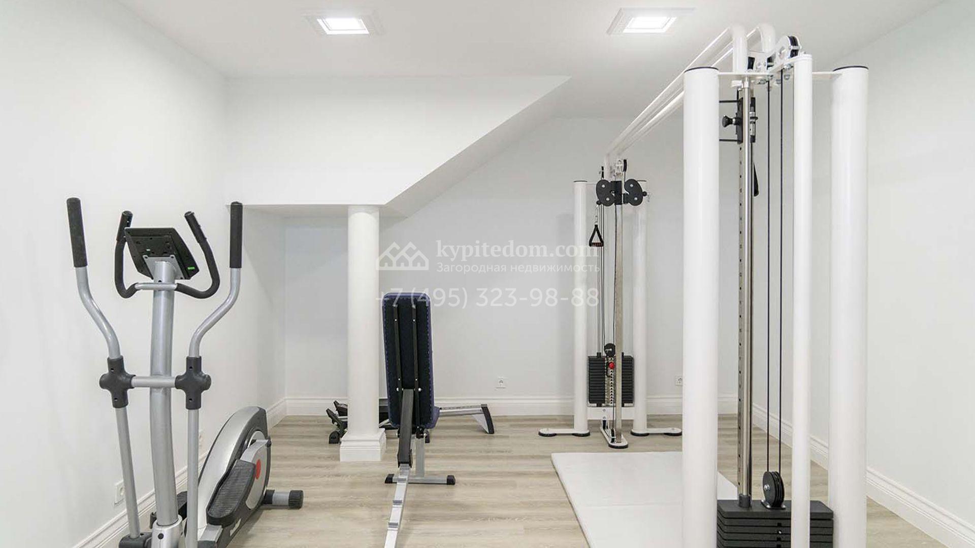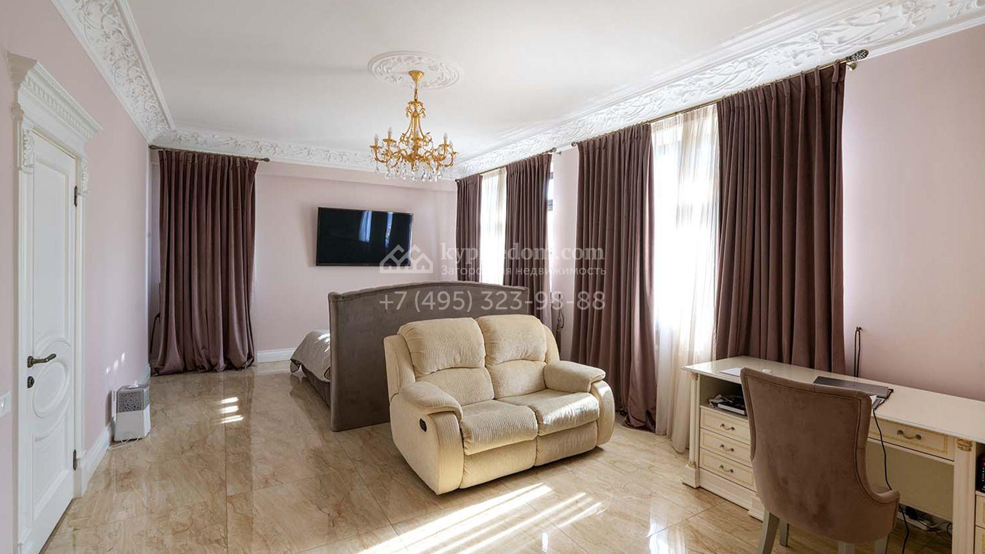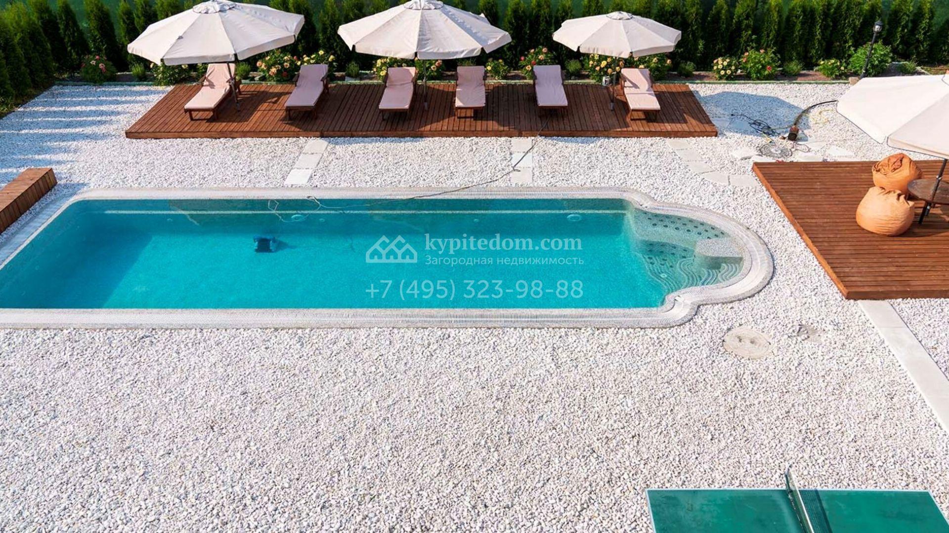 Загородная резиденция площадью 1663 м² расположена на просторном участке 25 соток около леса. Светлый фасад сочетает в себе современный и классический стили — дом с панорамным остеклением украшен лепным вензелем. Планировкой коттеджа предусмотрены 8 спален, гостиная с камином, кухня, зимний сад с выходом на террасу, сауна, хаммам, русская баня, 2 тренажерных зала и гараж на 4 машины, над которым расположили квартиру для персонала. К дому пристроен спа-комплекс с бассейном. Интерьер выдержали в классическом стиле в бежево-золотистых тонах. На участке выполнили ландшафтные работы, постелили газон, посадили деревья, обустроили беседку с зоной барбекю, паркинг и проложили дорожки к уличному бассейну.