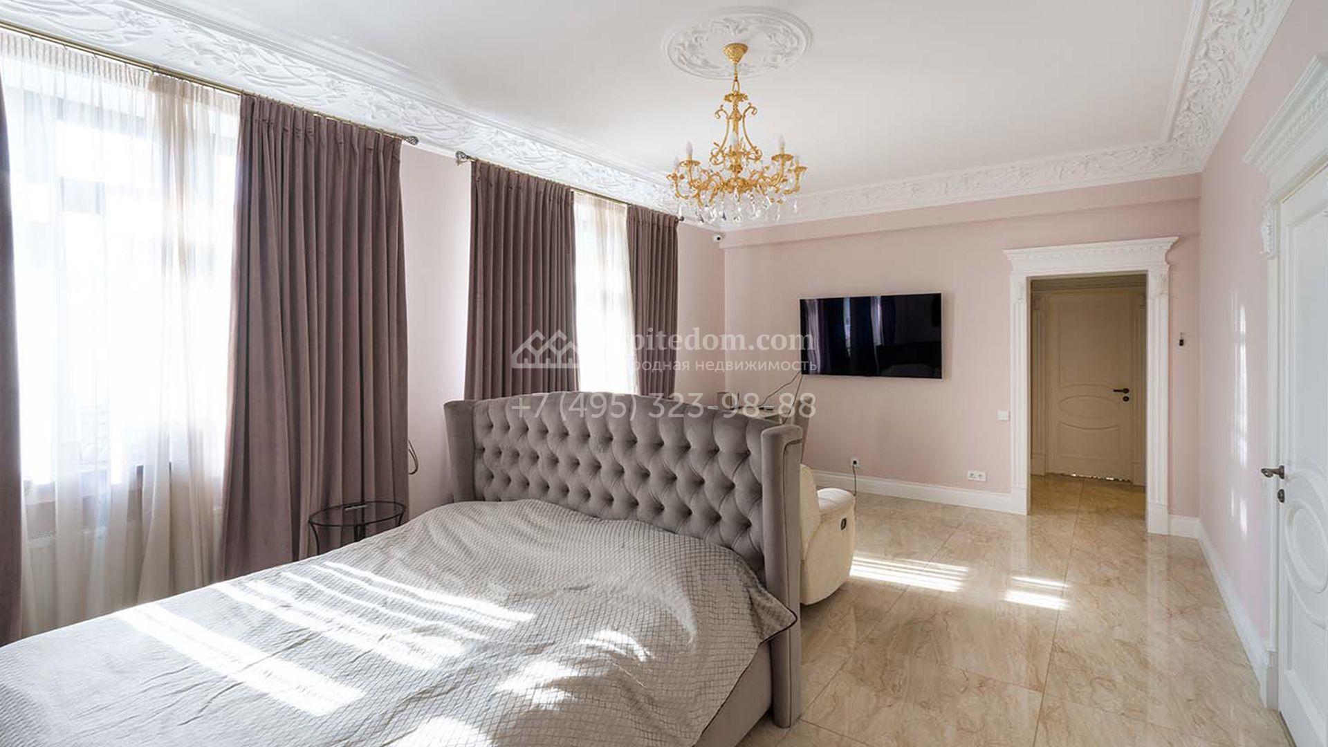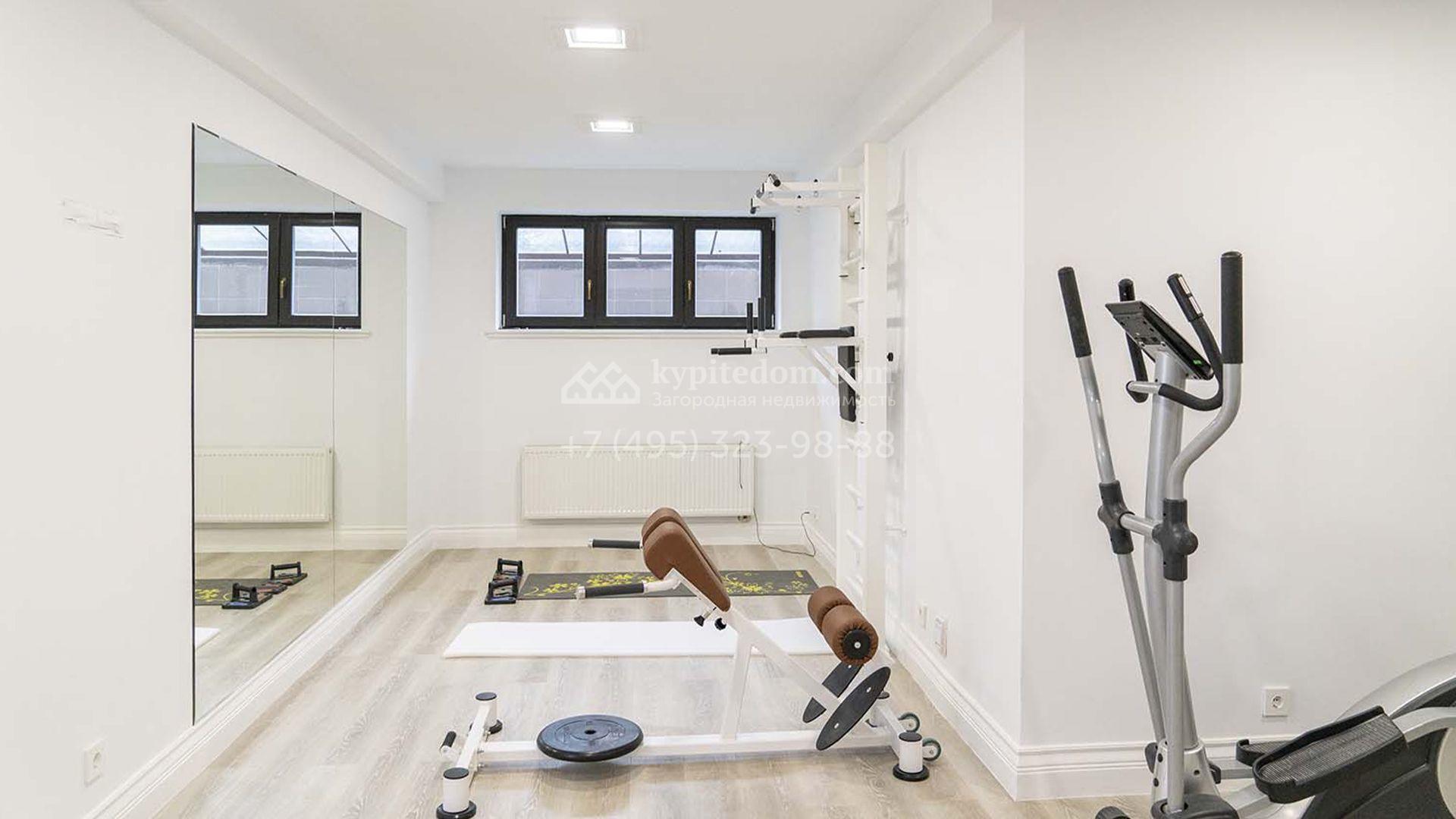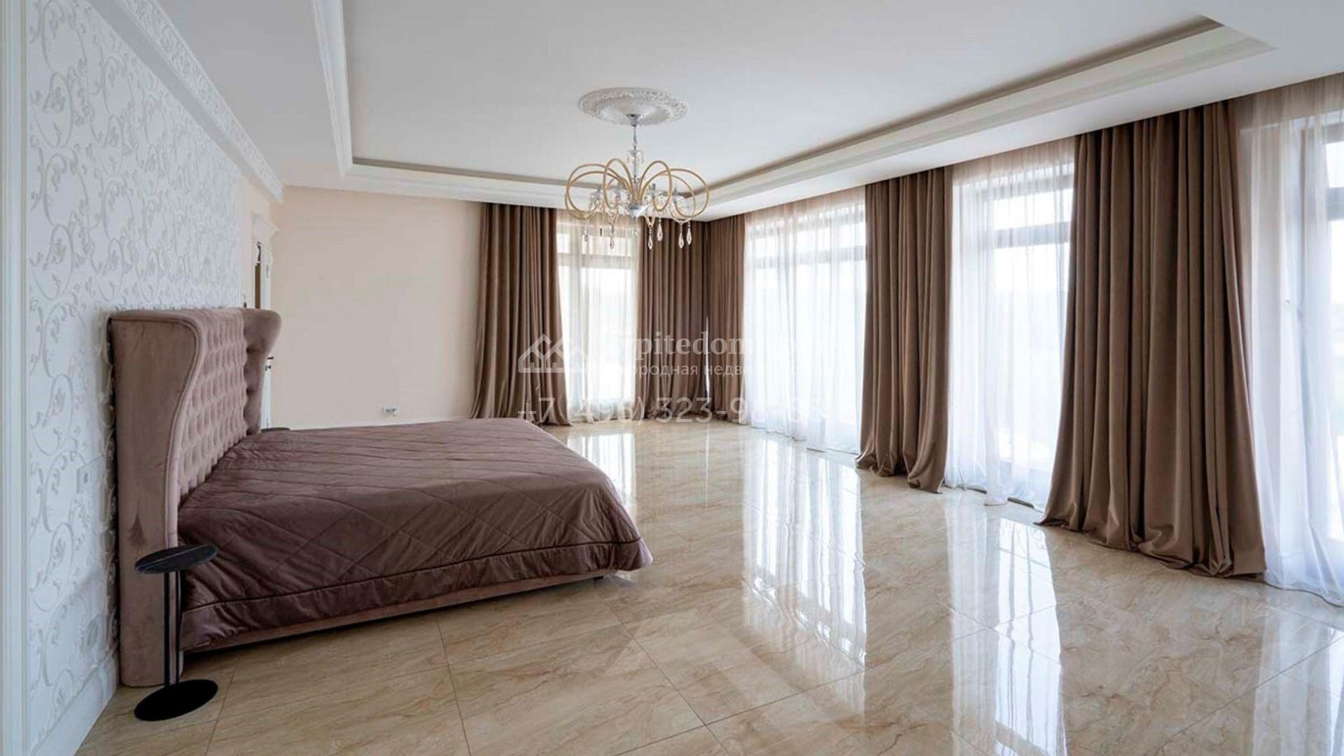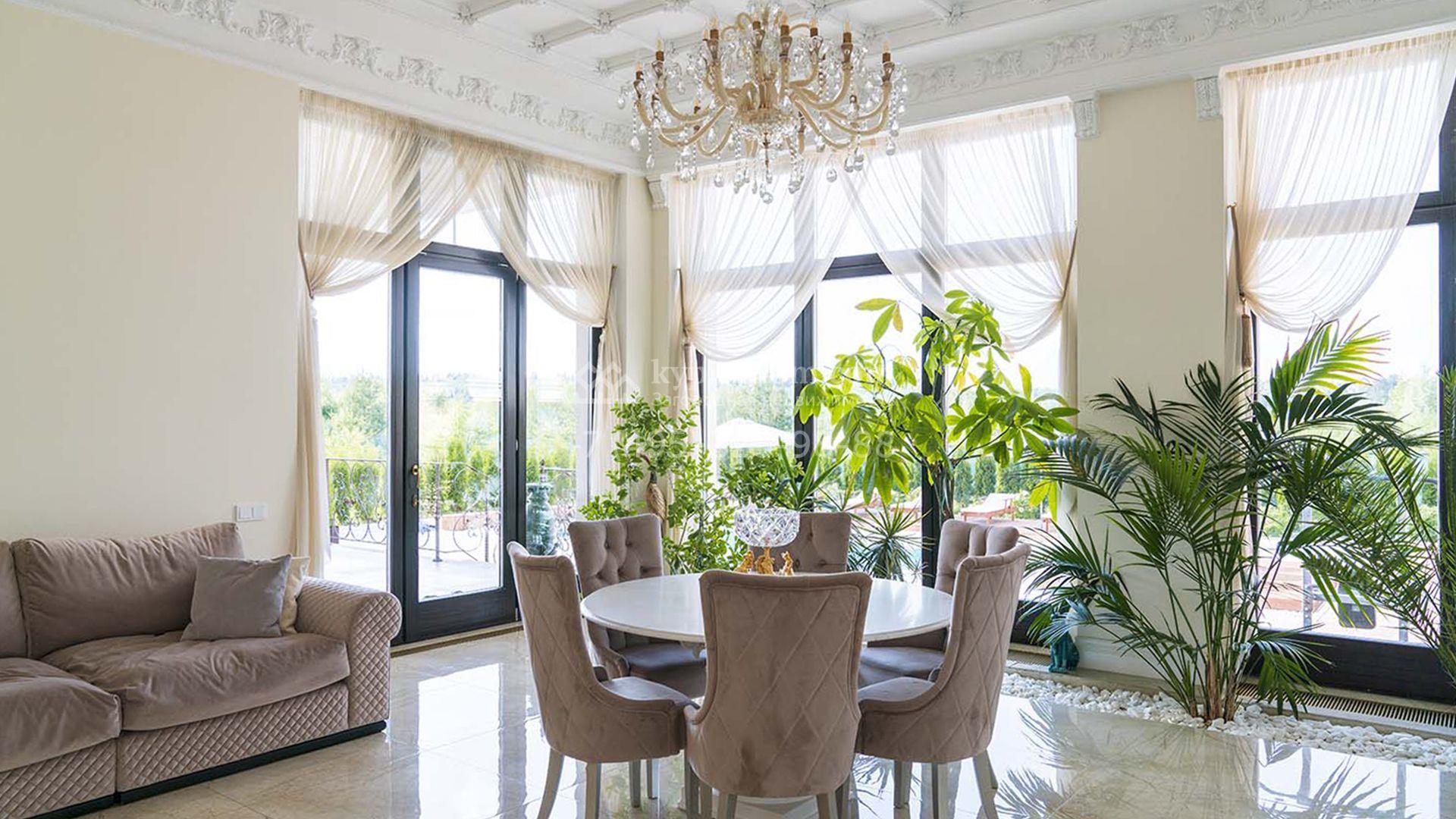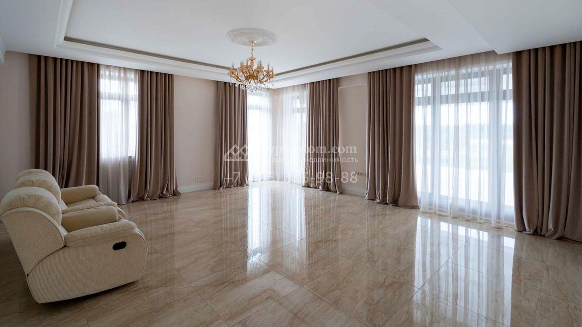 Загородная резиденция площадью 1663 м² расположена на просторном участке 25 соток около леса. Светлый фасад сочетает в себе современный и классический стили — дом с панорамным остеклением украшен лепным вензелем. Планировкой коттеджа предусмотрены 8 спален, гостиная с камином, кухня, зимний сад с выходом на террасу, сауна, хаммам, русская баня, 2 тренажерных зала и гараж на 4 машины, над которым расположили квартиру для персонала. К дому пристроен спа-комплекс с бассейном. Интерьер выдержали в классическом стиле в бежево-золотистых тонах. На участке выполнили ландшафтные работы, постелили газон, посадили деревья, обустроили беседку с зоной барбекю, паркинг и проложили дорожки к уличному бассейну.