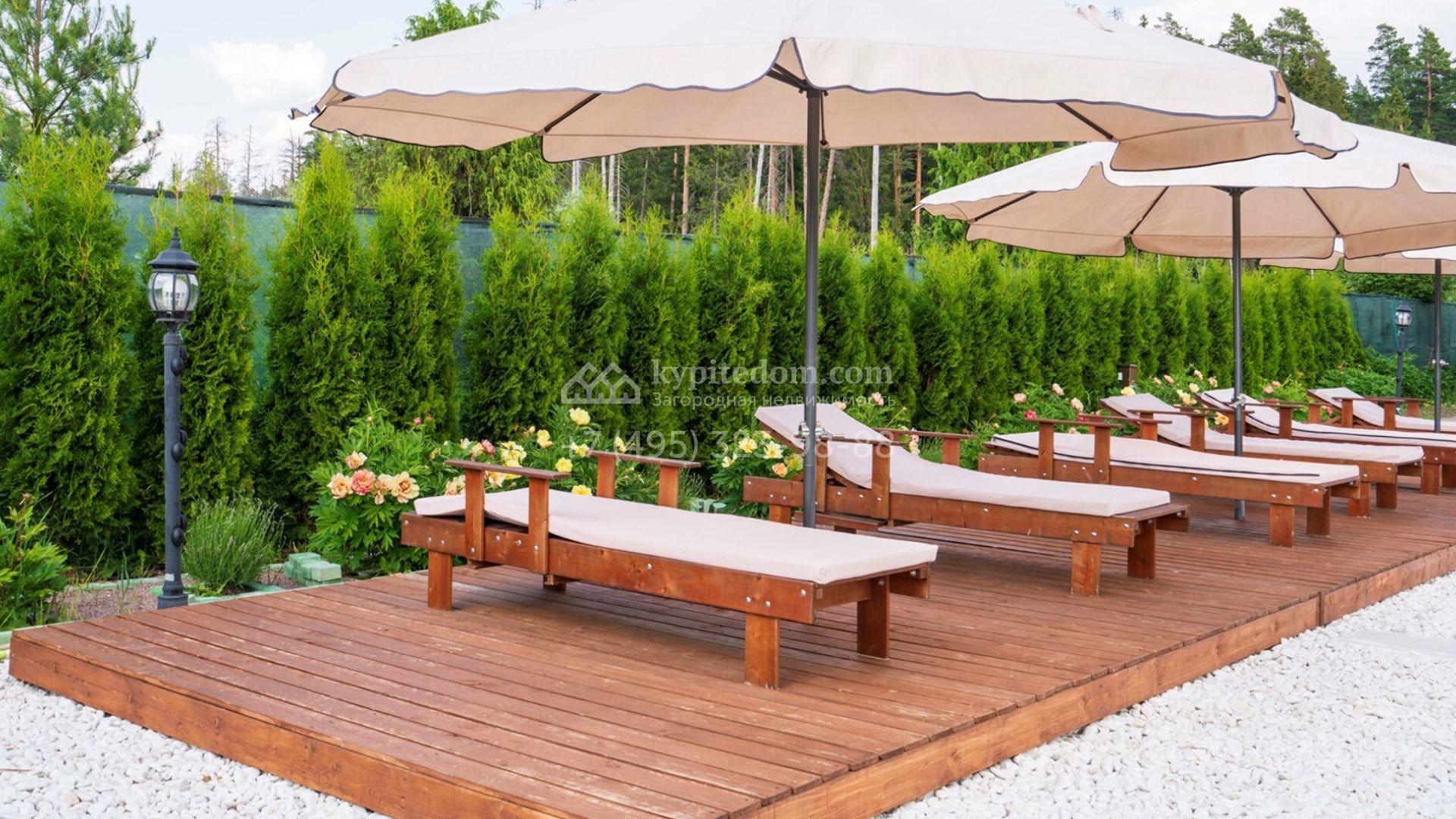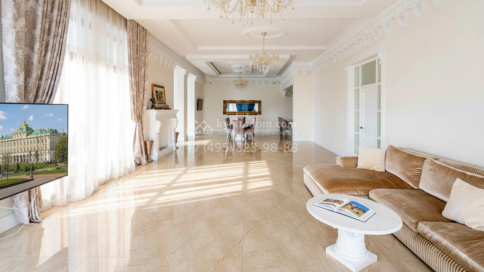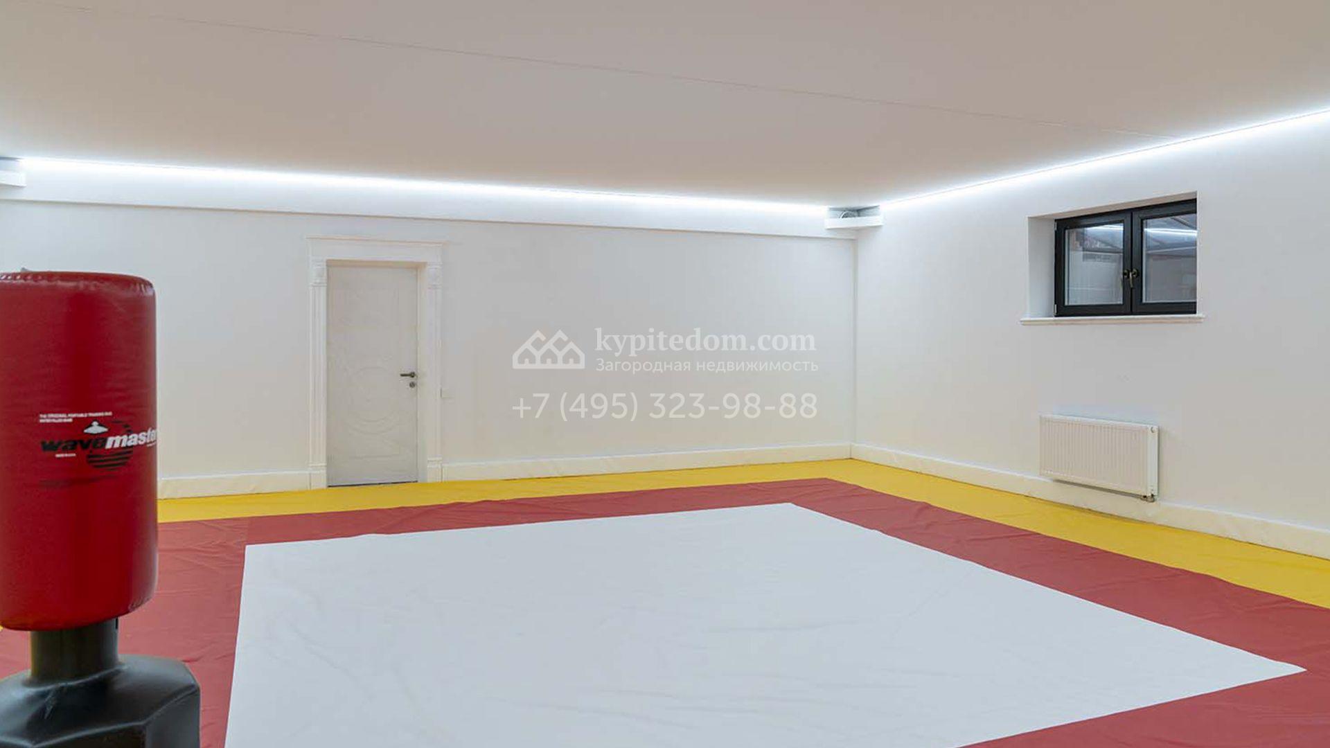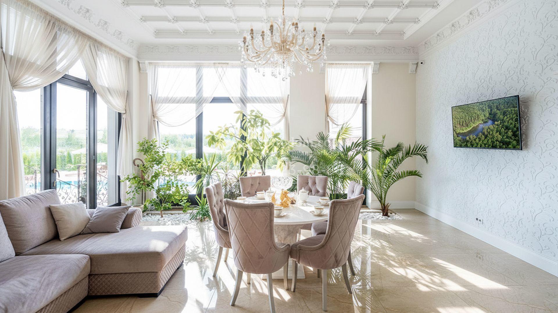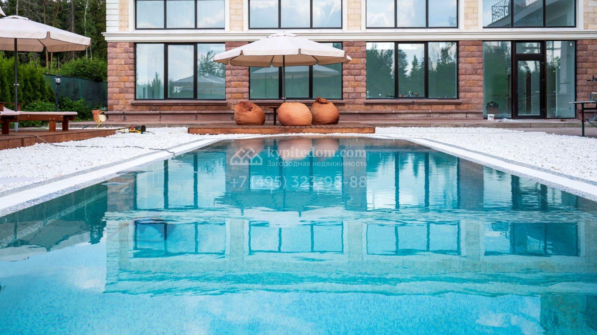 Загородная резиденция площадью 1663 м² расположена на просторном участке 25 соток около леса. Светлый фасад сочетает в себе современный и классический стили — дом с панорамным остеклением украшен лепным вензелем. Планировкой коттеджа предусмотрены 8 спален, гостиная с камином, кухня, зимний сад с выходом на террасу, сауна, хаммам, русская баня, 2 тренажерных зала и гараж на 4 машины, над которым расположили квартиру для персонала. К дому пристроен спа-комплекс с бассейном. Интерьер выдержали в классическом стиле в бежево-золотистых тонах. На участке выполнили ландшафтные работы, постелили газон, посадили деревья, обустроили беседку с зоной барбекю, паркинг и проложили дорожки к уличному бассейну.