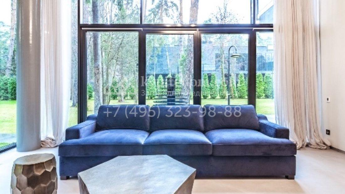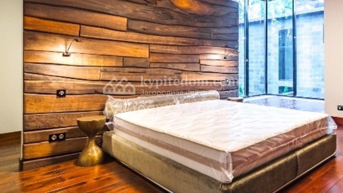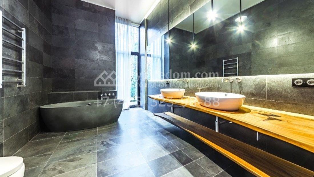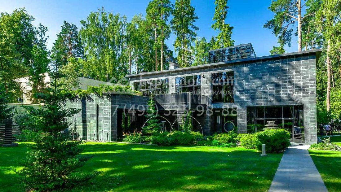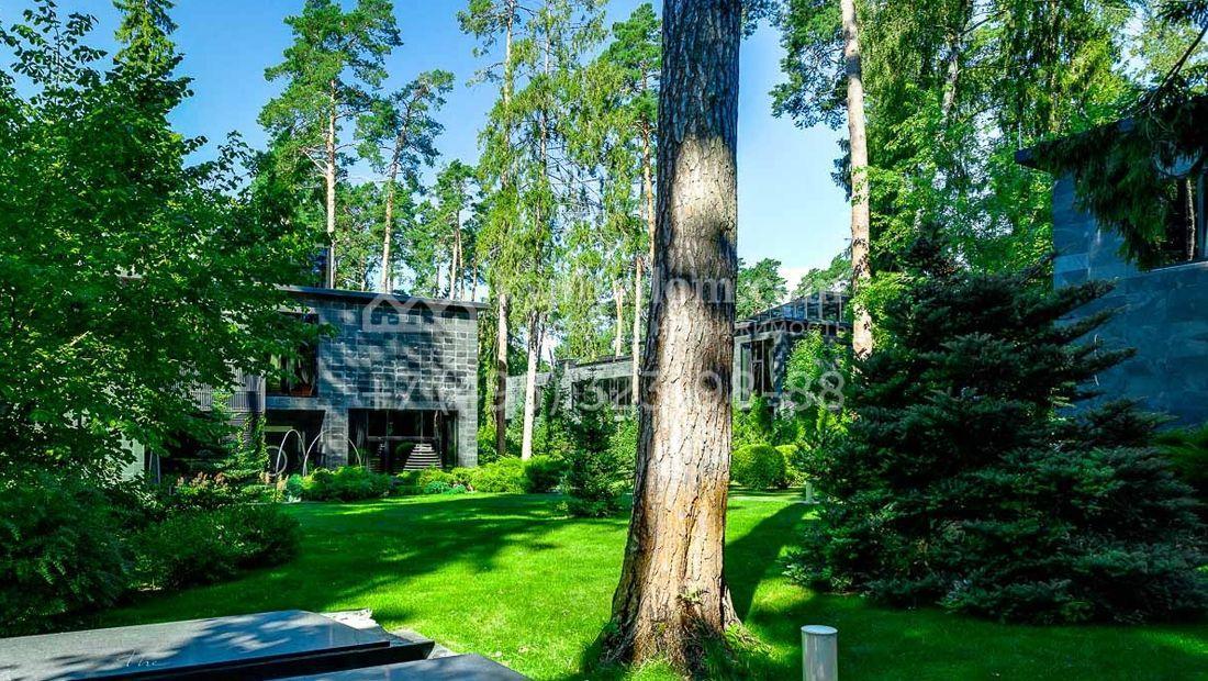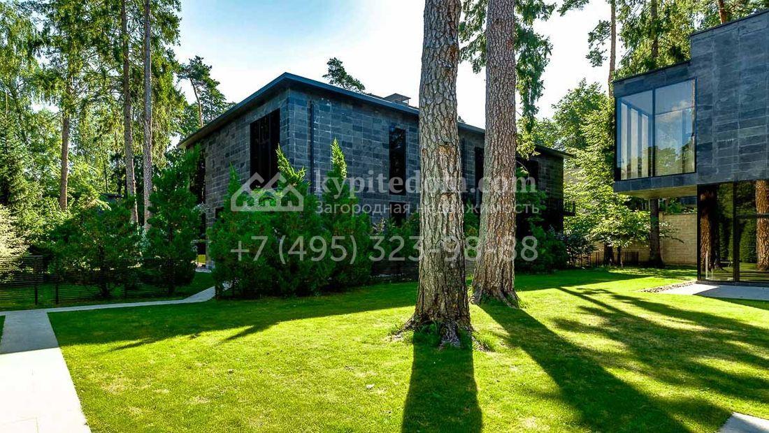 Большая загородная резиденция в современном стиле уютно расположена на лесном участке. Фасад здания облицован темно-зеленым камнем и сливается с ландшафтом. Общая площадь здания 640 м², на первом этаже расположен бассейн с зоной отдыха. Из панорамной кухни-гостиной можно выйти на площадку-патио около дома. Второй этаж занимает библиотека, кабинет и 3 спальни. Благодаря высоким потолкам и панорамным окнам в доме очень светло. Интерьер выполнен в светлых тонах в современном стиле, кухня и санузлы оборудованы. На территории 25 соток растут лесные деревья и декоративные кустарники, постелен газон и проложены плиточные дорожки, проведено уличное освещение.