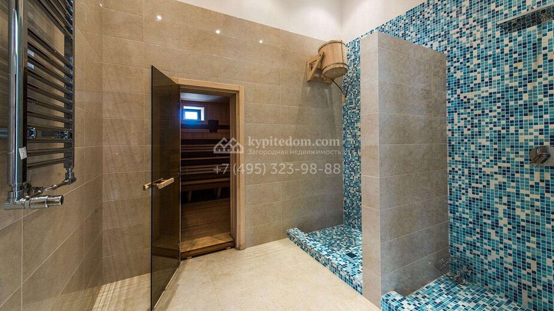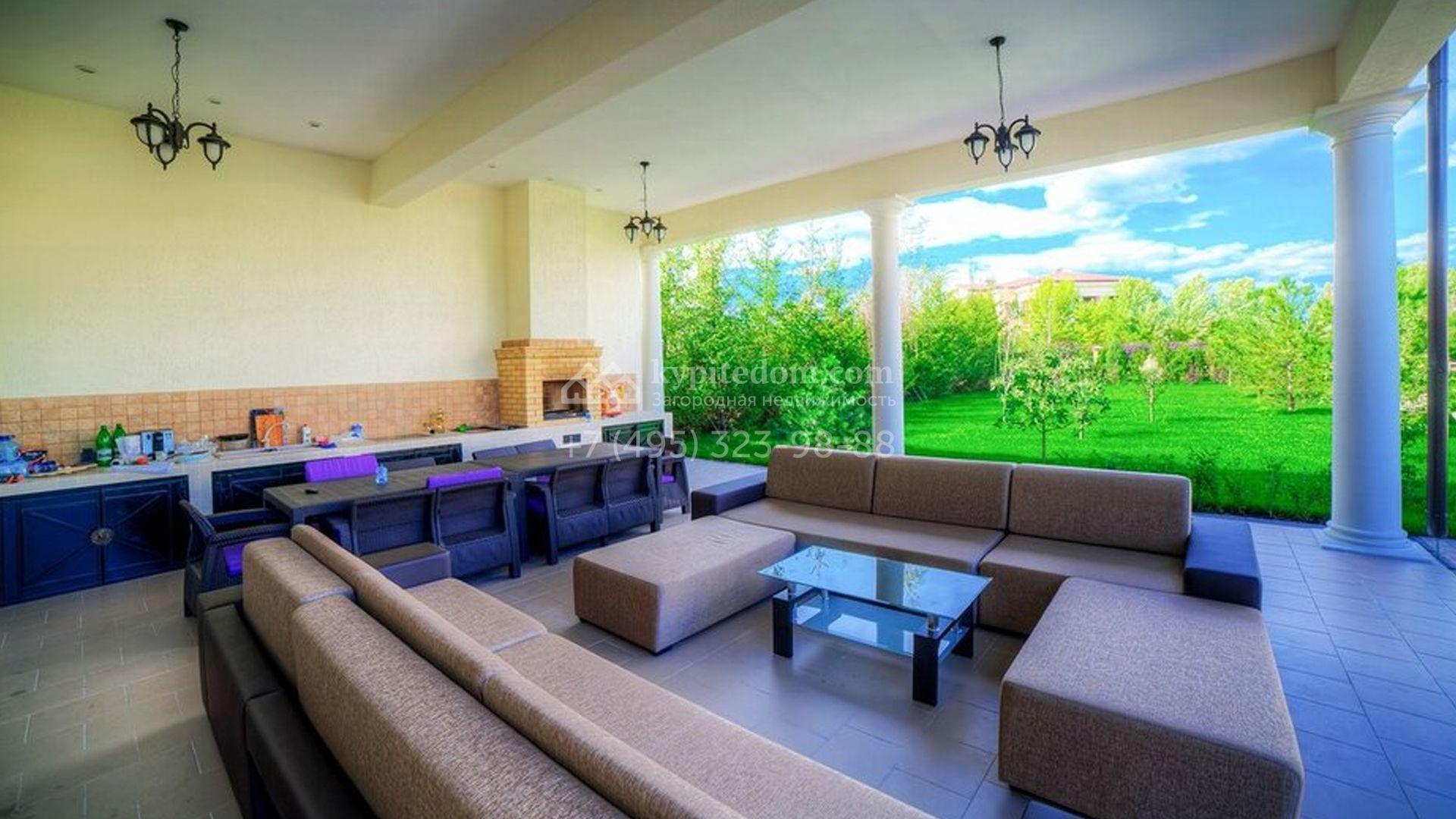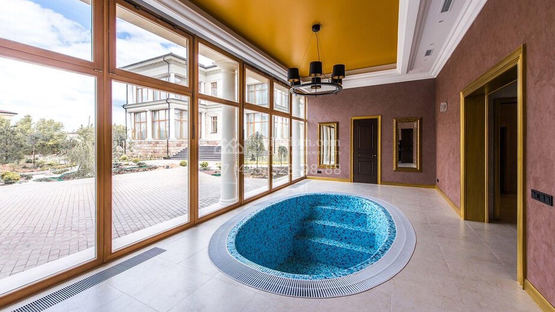 Гостевой дом: 1-й уровень: терраса с барбекю, двусветная бильярдная с камином, гардеробная, кухня, комната отдыха с бассейном и панорамным остеклением, сауна, массажный кабинет, санузел с душевой, спортзал.
