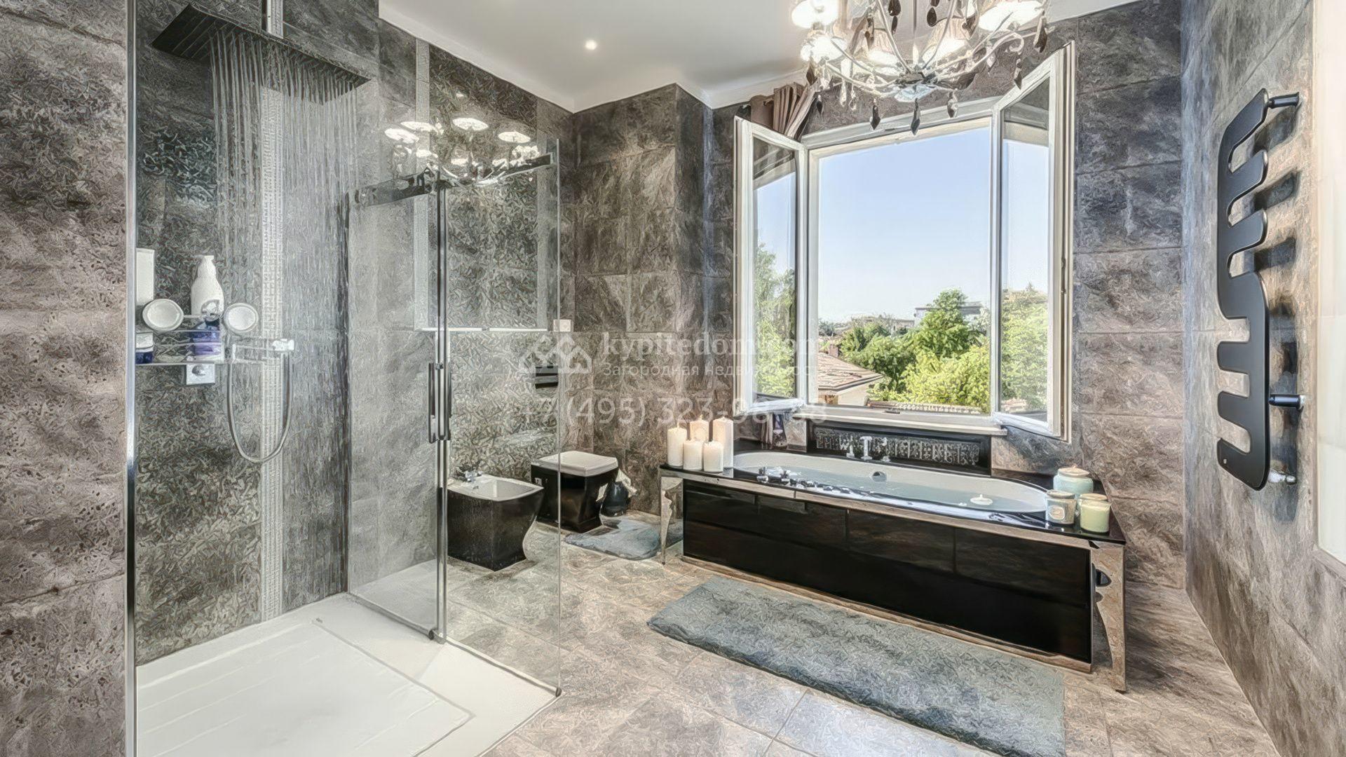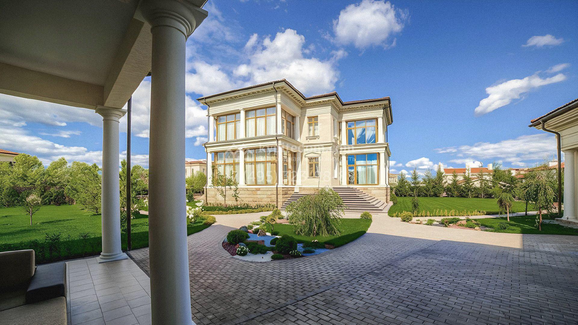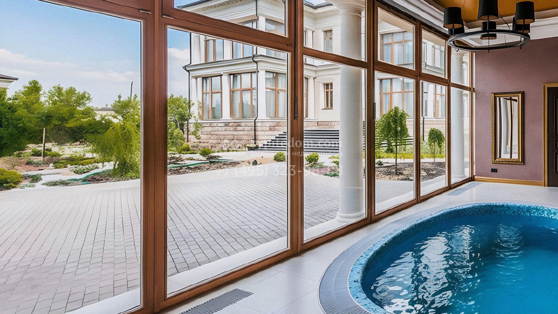 Гостевой дом: 1-й уровень: терраса с барбекю, двусветная бильярдная с камином, гардеробная, кухня, комната отдыха с бассейном и панорамным остеклением, сауна, массажный кабинет, санузел с душевой, спортзал.
