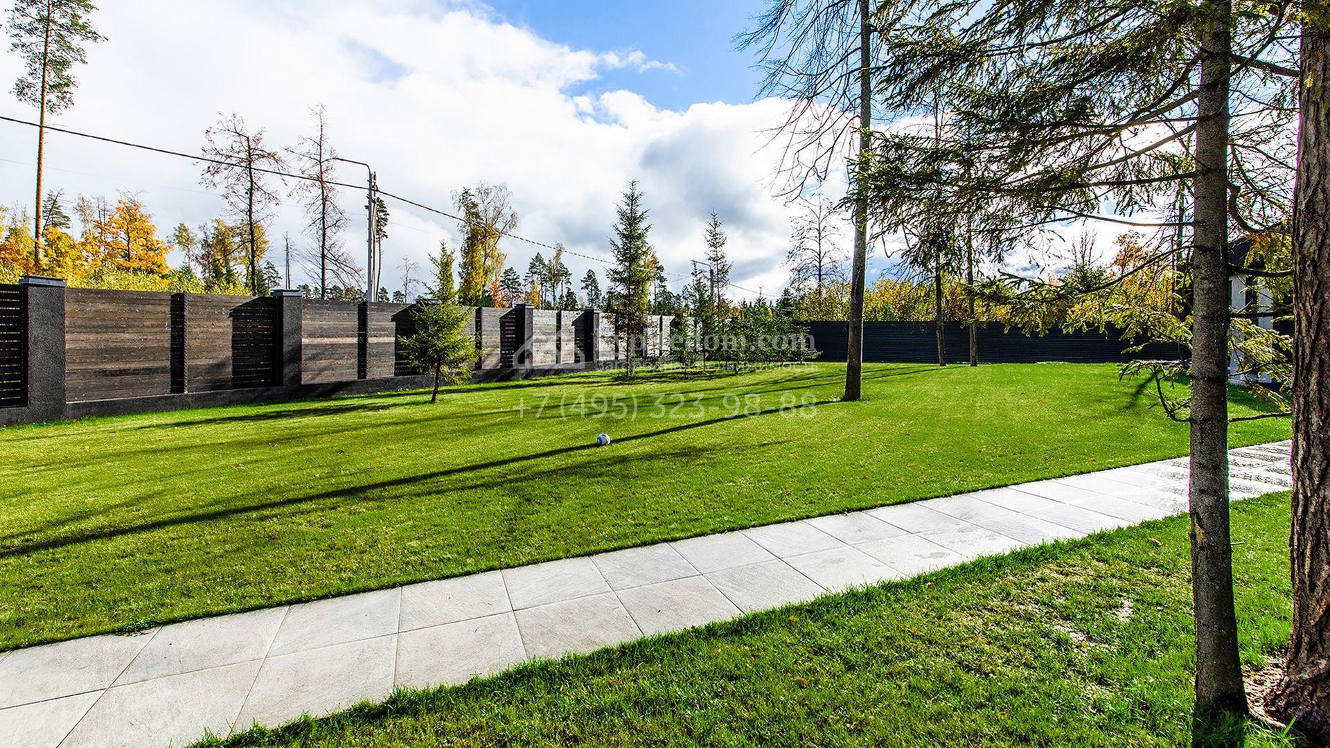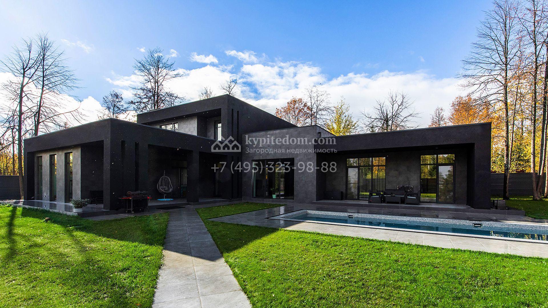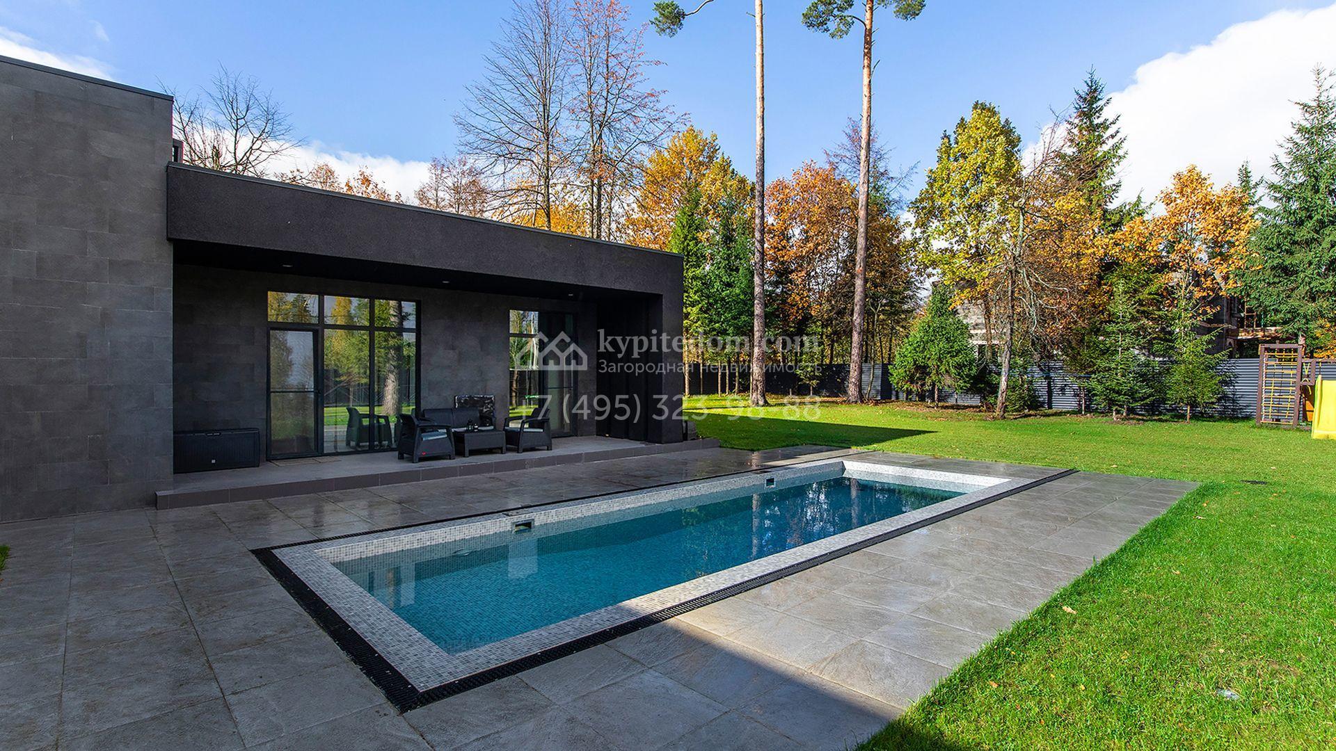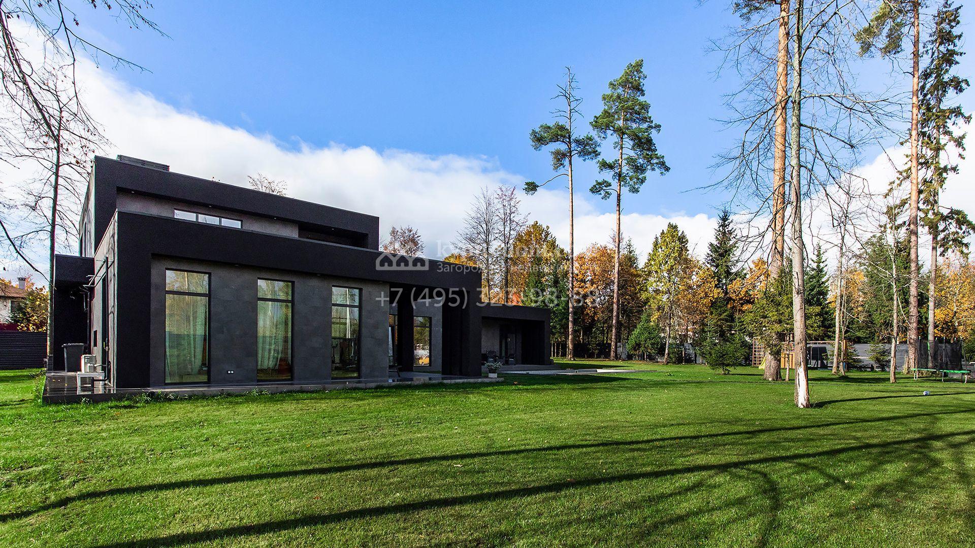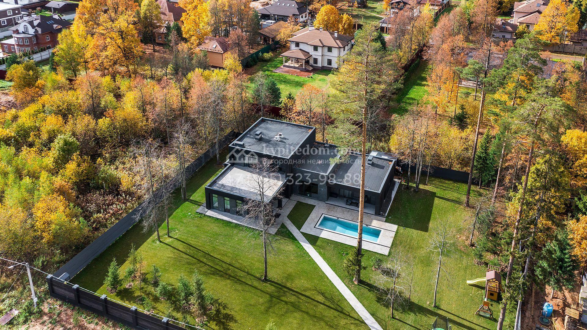 Особняк площадью 400 м² расположен на лесном участке 24 сотки с соснами и елями. Минималистичный фасад здания построен из керамических блоков в современном стиле и облицован серо-черным камнем. Установлены панорамные окна в пол с алюминиевым профилем и энергосберегающими стеклопакетами. В отделке лаконичного интерьера использованы натуральное дерево, мрамор и керамогранит, установлены кухонная мебель FENiX и бытовая техника MIELE. Планировка дома включает 4 спальни, гостиную с камином и потолками высотой 4 метра, кухню-столовую, кабинет, хаммам и террасу. Предусмотрен блок для персонала с отдельным входом, кухней-гостиной и спальней с санузлом. На участке с ландшафтным дизайном обустроен открытый бассейн с подогревом, отделанный испанской противоскользящей мозаикой.