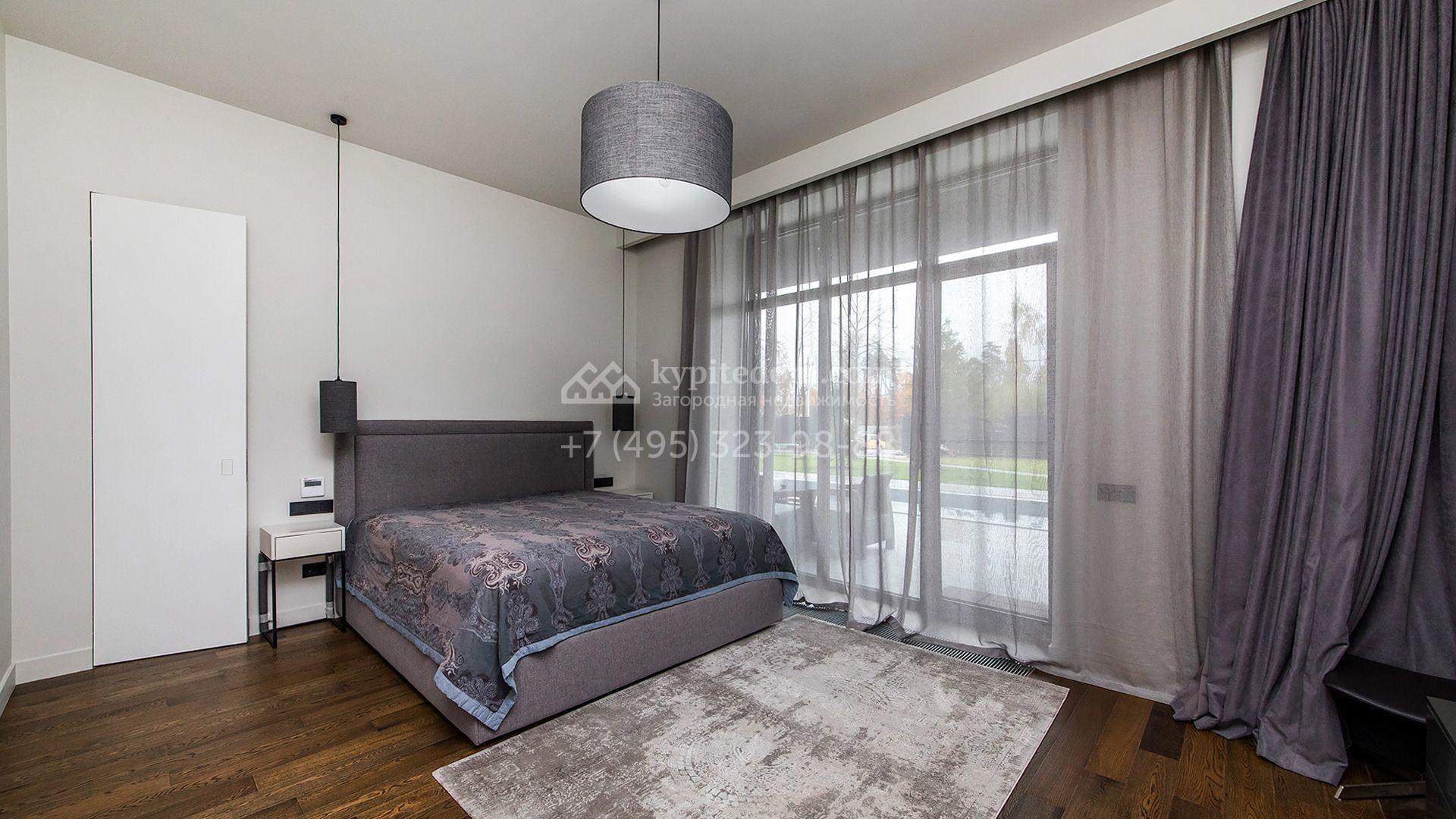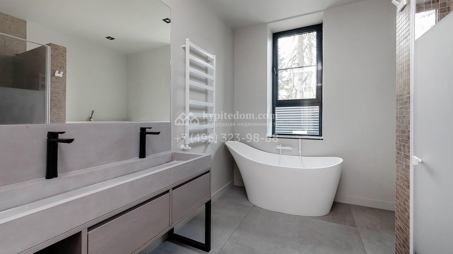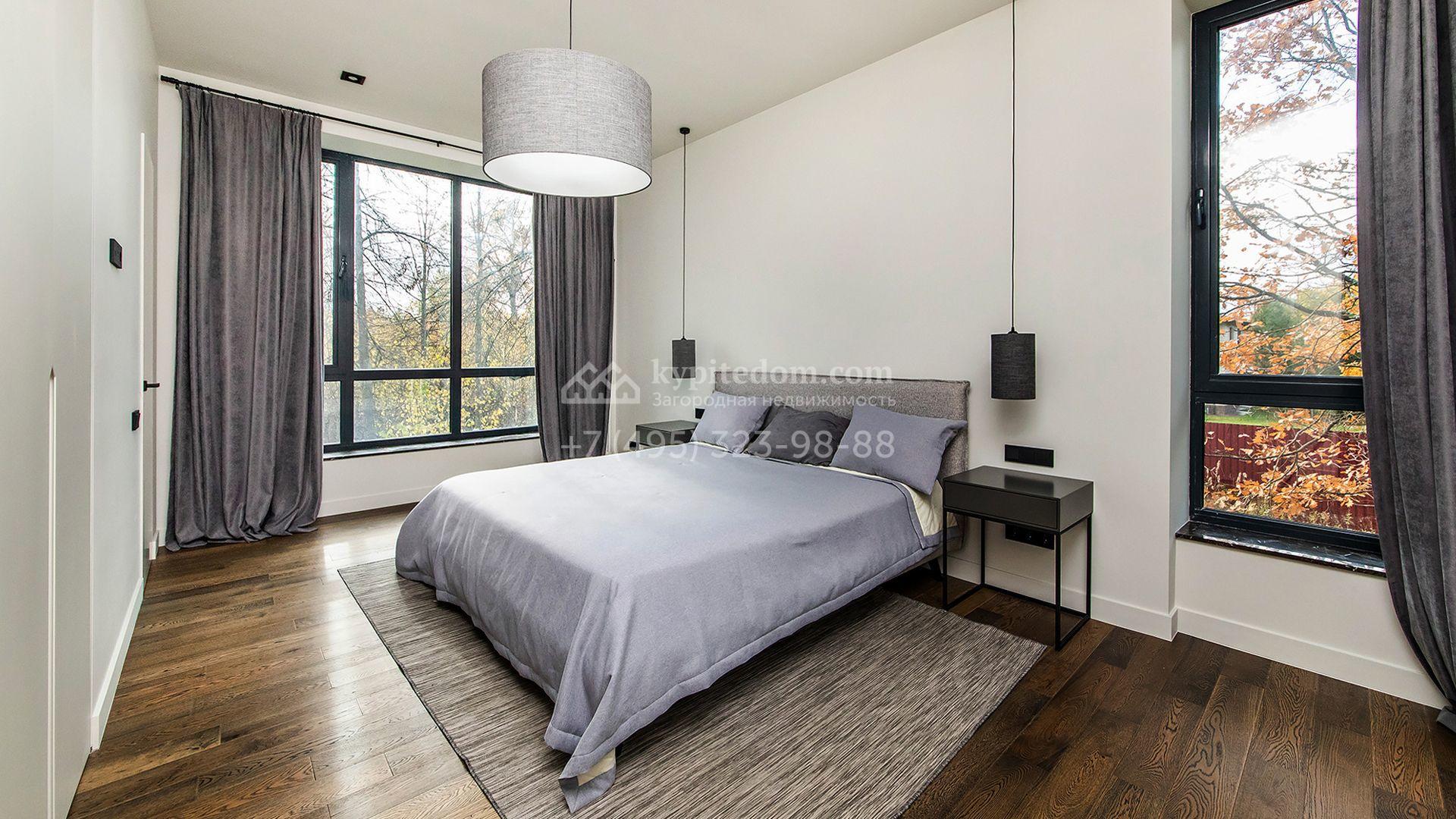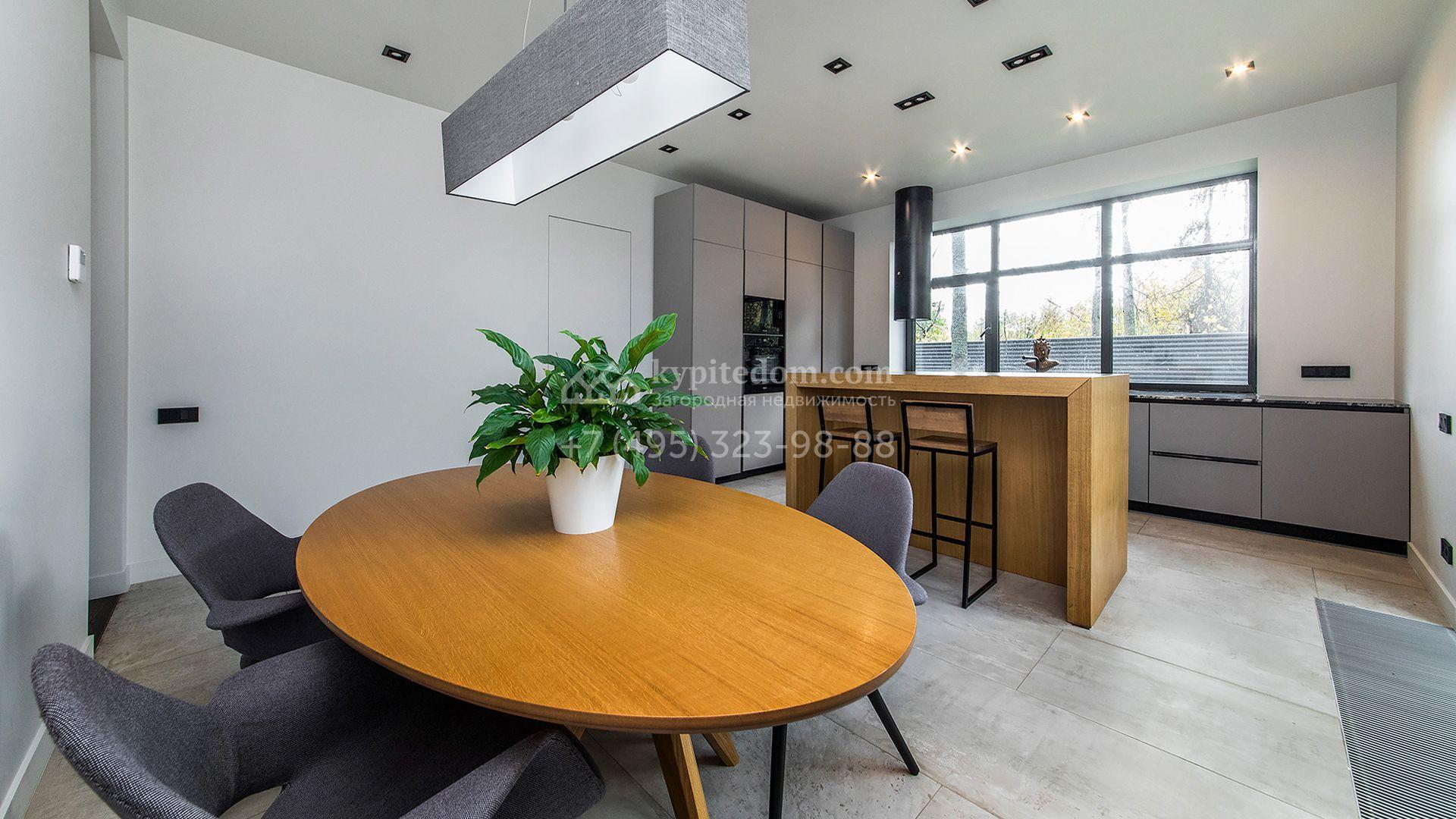 Особняк площадью 400 м² расположен на лесном участке 24 сотки с соснами и елями. Минималистичный фасад здания построен из керамических блоков в современном стиле и облицован серо-черным камнем. Установлены панорамные окна в пол с алюминиевым профилем и энергосберегающими стеклопакетами. В отделке лаконичного интерьера использованы натуральное дерево, мрамор и керамогранит, установлены кухонная мебель FENiX и бытовая техника MIELE. Планировка дома включает 4 спальни, гостиную с камином и потолками высотой 4 метра, кухню-столовую, кабинет, хаммам и террасу. Предусмотрен блок для персонала с отдельным входом, кухней-гостиной и спальней с санузлом. На участке с ландшафтным дизайном обустроен открытый бассейн с подогревом, отделанный испанской противоскользящей мозаикой.