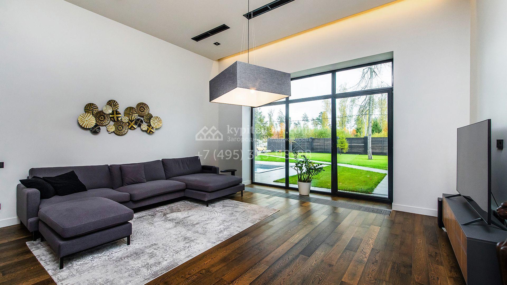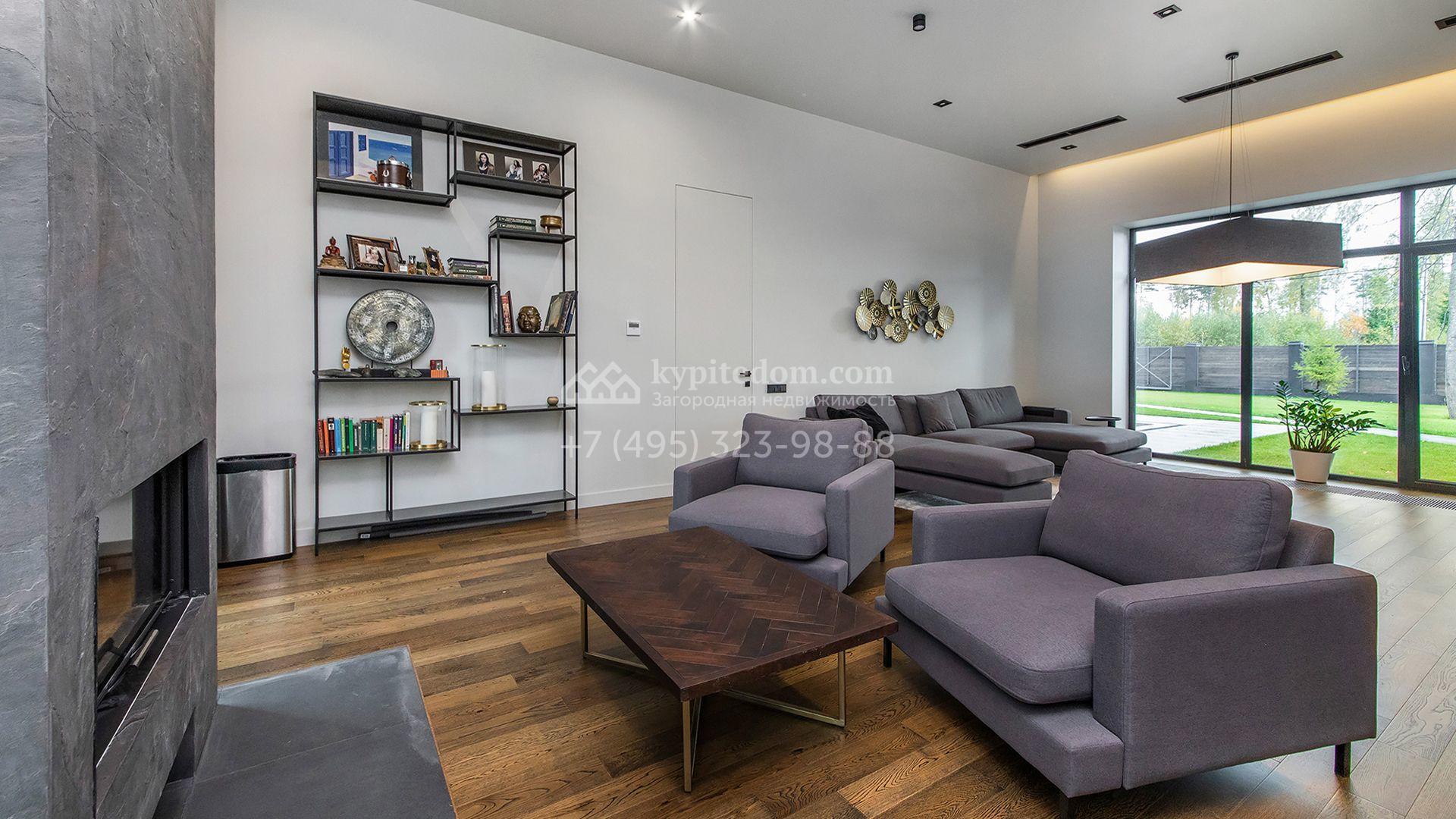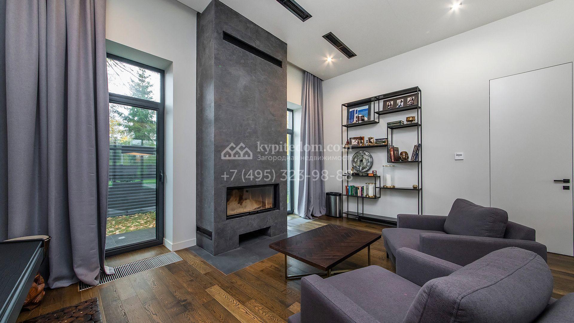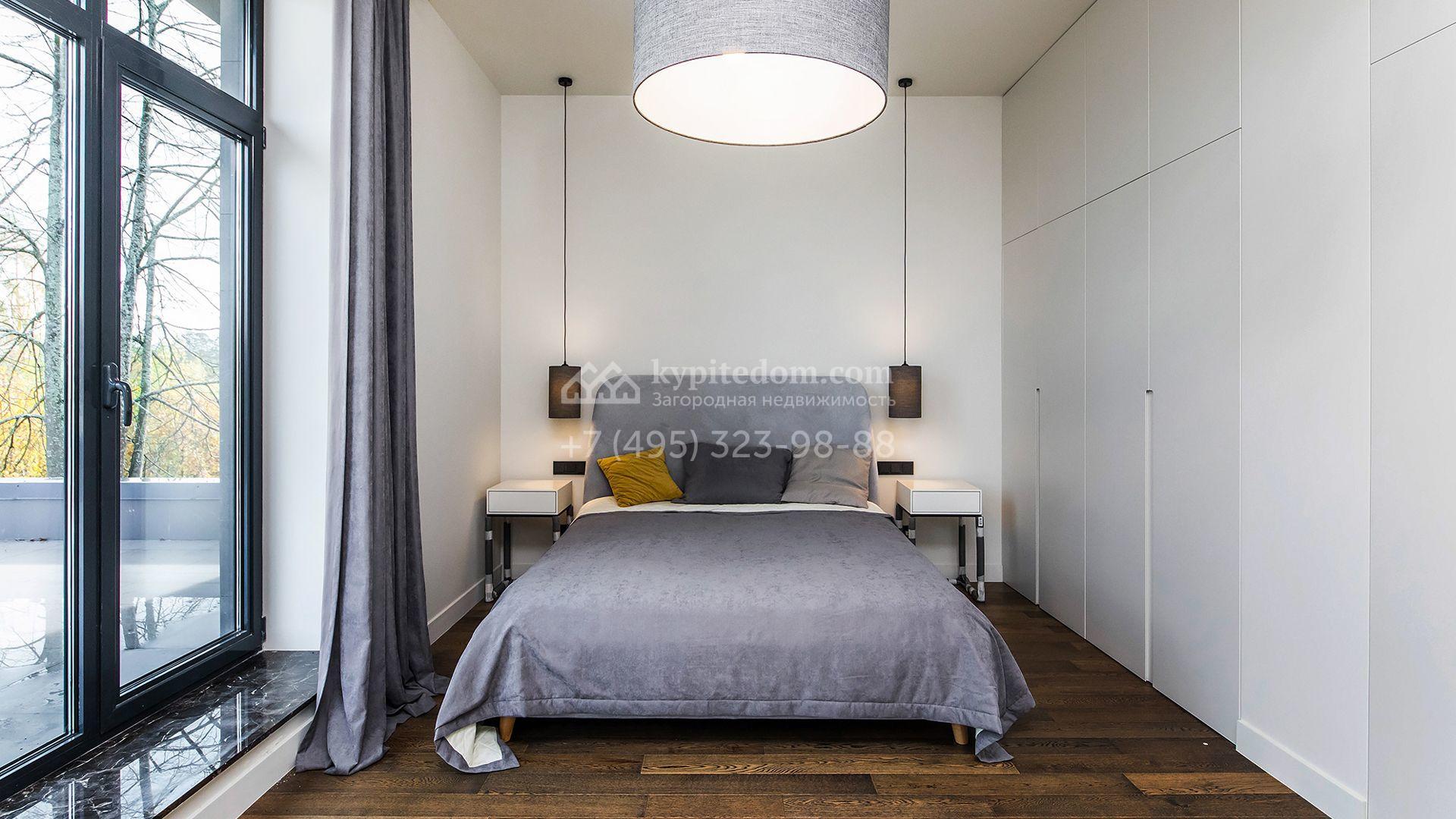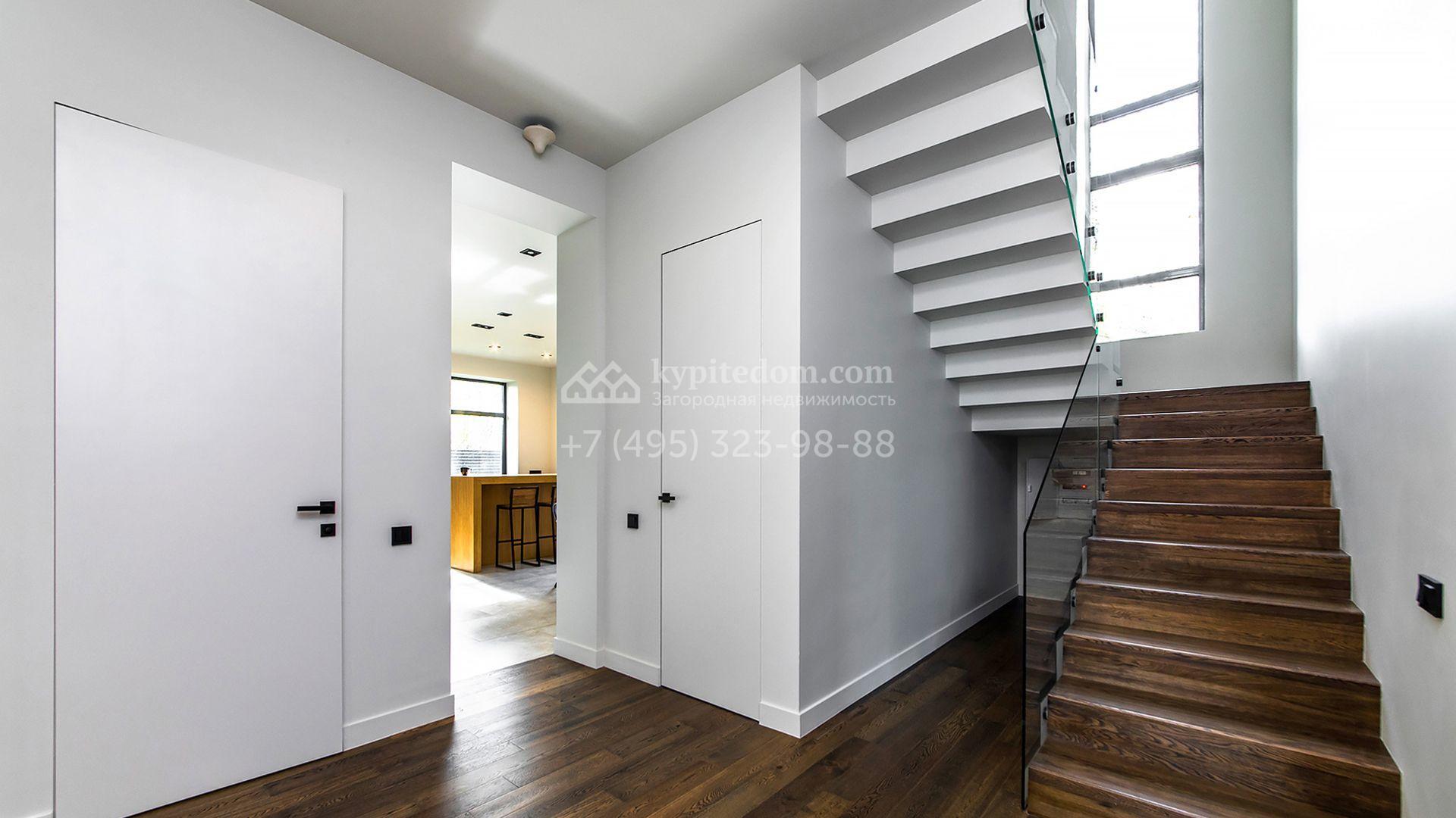 Особняк площадью 400 м² расположен на лесном участке 24 сотки с соснами и елями. Минималистичный фасад здания построен из керамических блоков в современном стиле и облицован серо-черным камнем. Установлены панорамные окна в пол с алюминиевым профилем и энергосберегающими стеклопакетами. В отделке лаконичного интерьера использованы натуральное дерево, мрамор и керамогранит, установлены кухонная мебель FENiX и бытовая техника MIELE. Планировка дома включает 4 спальни, гостиную с камином и потолками высотой 4 метра, кухню-столовую, кабинет, хаммам и террасу. Предусмотрен блок для персонала с отдельным входом, кухней-гостиной и спальней с санузлом. На участке с ландшафтным дизайном обустроен открытый бассейн с подогревом, отделанный испанской противоскользящей мозаикой.