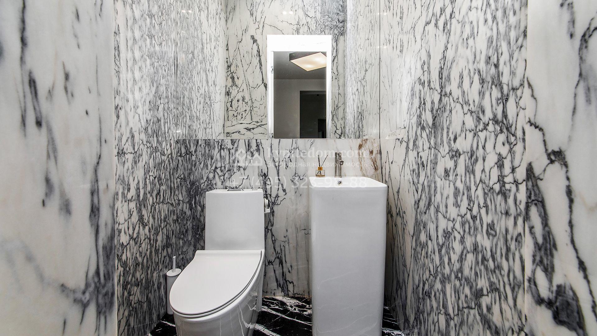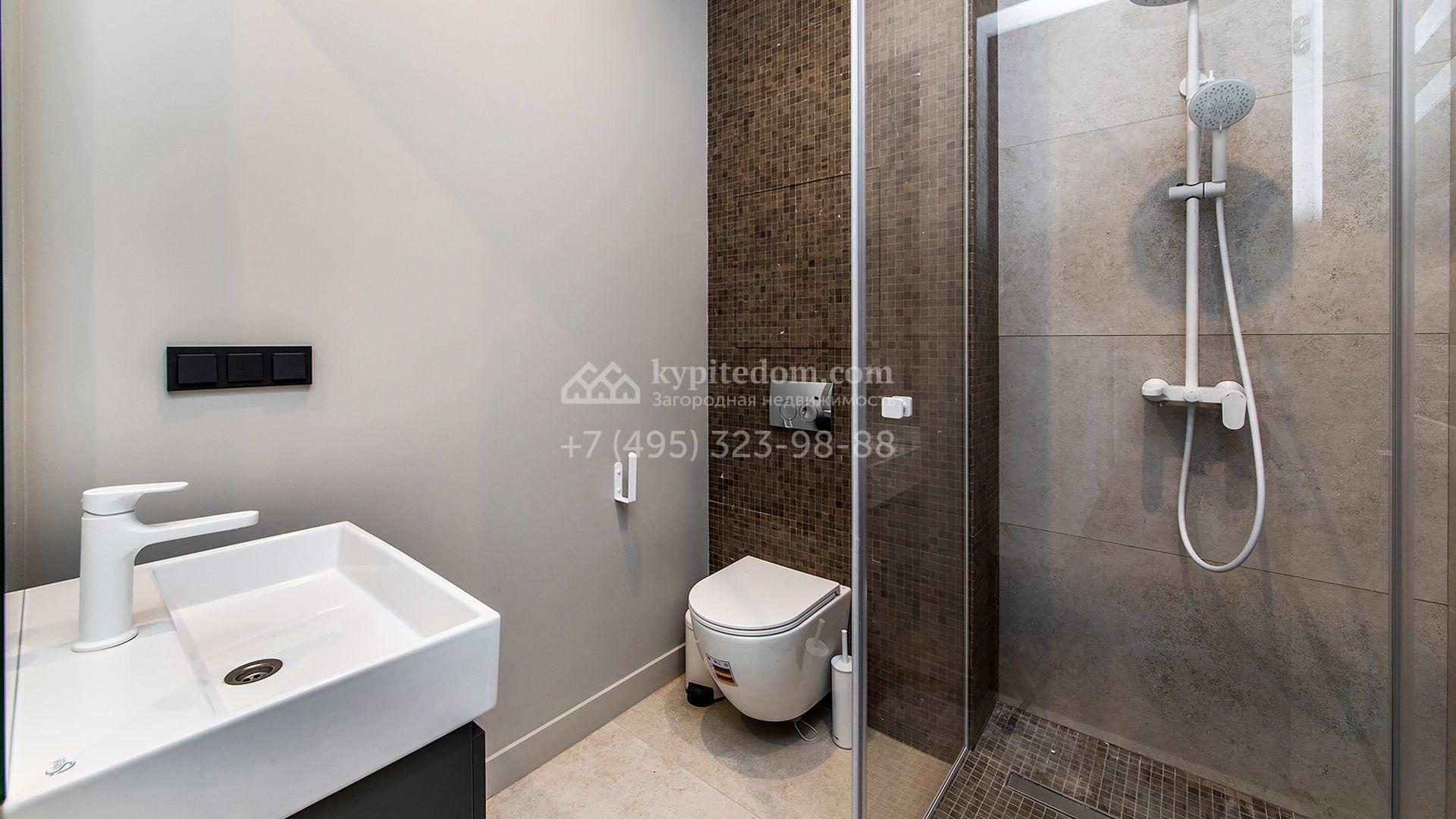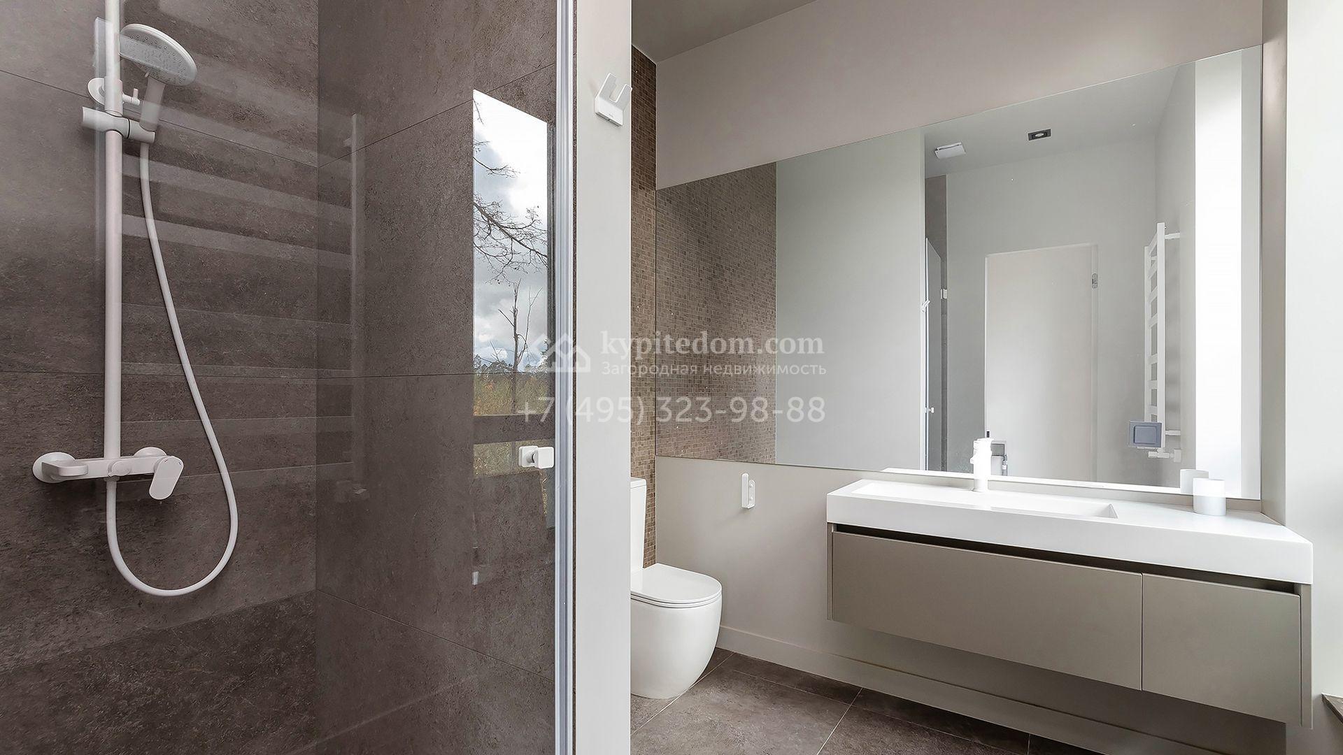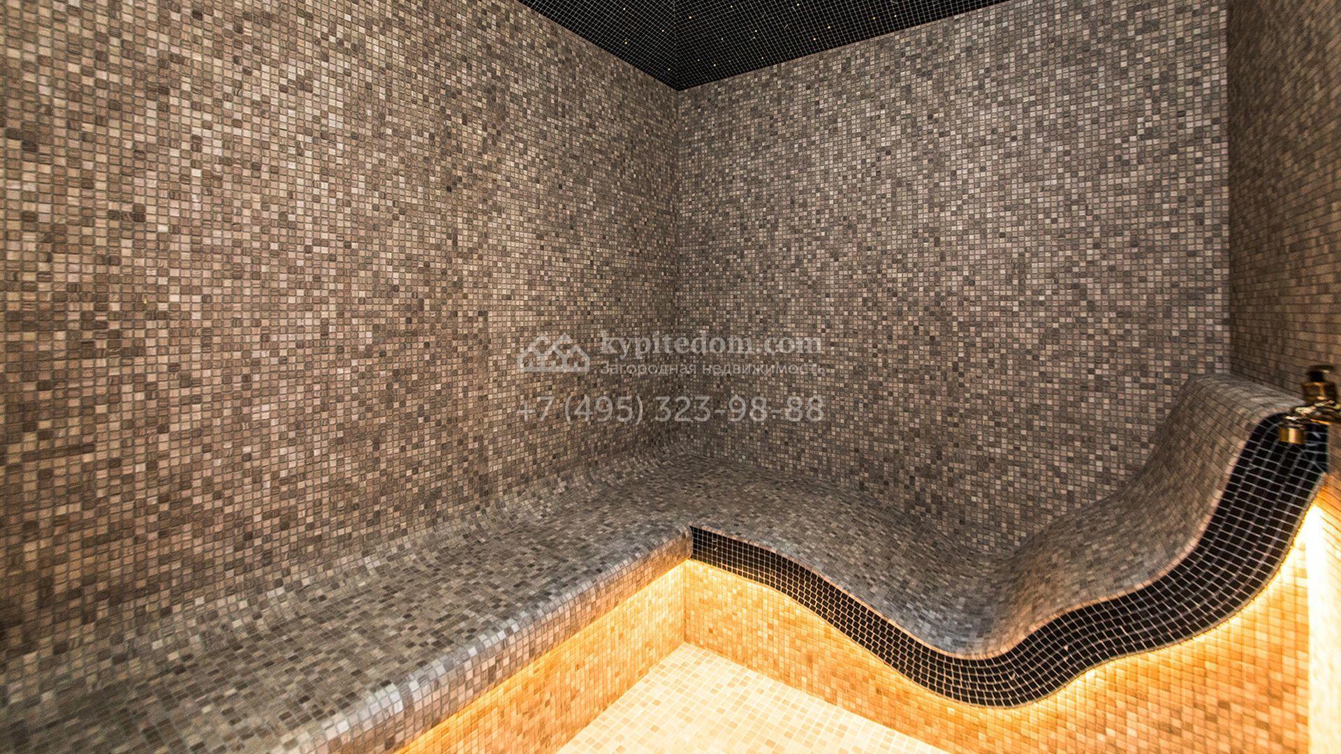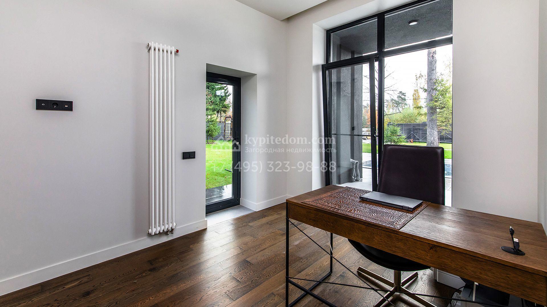 Особняк площадью 400 м² расположен на лесном участке 24 сотки с соснами и елями. Минималистичный фасад здания построен из керамических блоков в современном стиле и облицован серо-черным камнем. Установлены панорамные окна в пол с алюминиевым профилем и энергосберегающими стеклопакетами. В отделке лаконичного интерьера использованы натуральное дерево, мрамор и керамогранит, установлены кухонная мебель FENiX и бытовая техника MIELE. Планировка дома включает 4 спальни, гостиную с камином и потолками высотой 4 метра, кухню-столовую, кабинет, хаммам и террасу. Предусмотрен блок для персонала с отдельным входом, кухней-гостиной и спальней с санузлом. На участке с ландшафтным дизайном обустроен открытый бассейн с подогревом, отделанный испанской противоскользящей мозаикой.