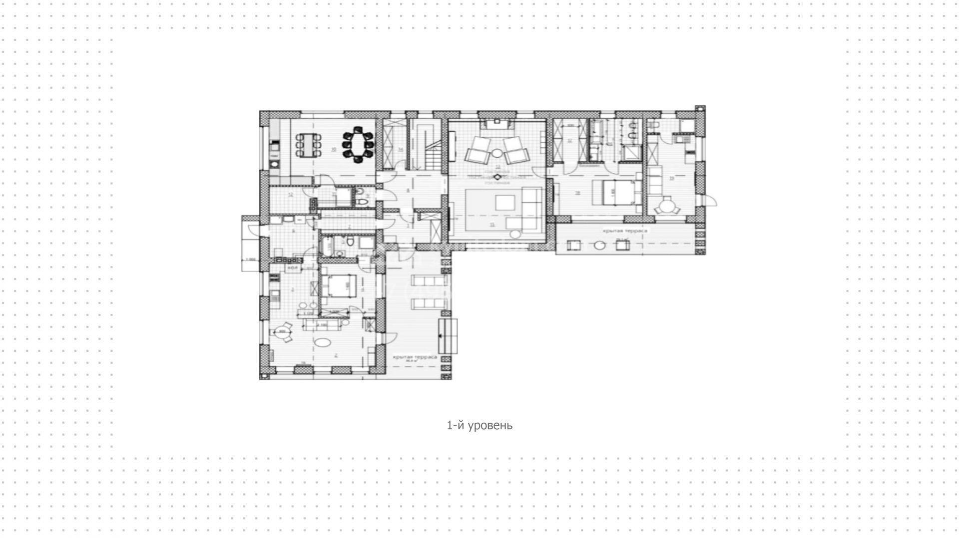 1-й уровень: холл, гардеробная, гостевой санузел, хаммам, кухня-столовая с кладовой, гостиная, мастер-спальня с гардеробной и санузлом, кабинет, блок для персонала с кухней-гостиной, спальней и санузлом, 2 крытых террасы.