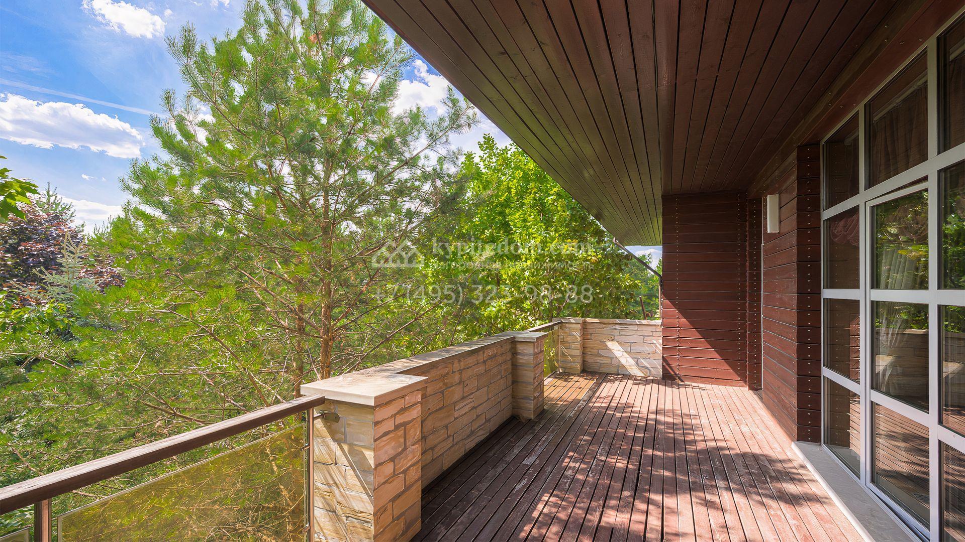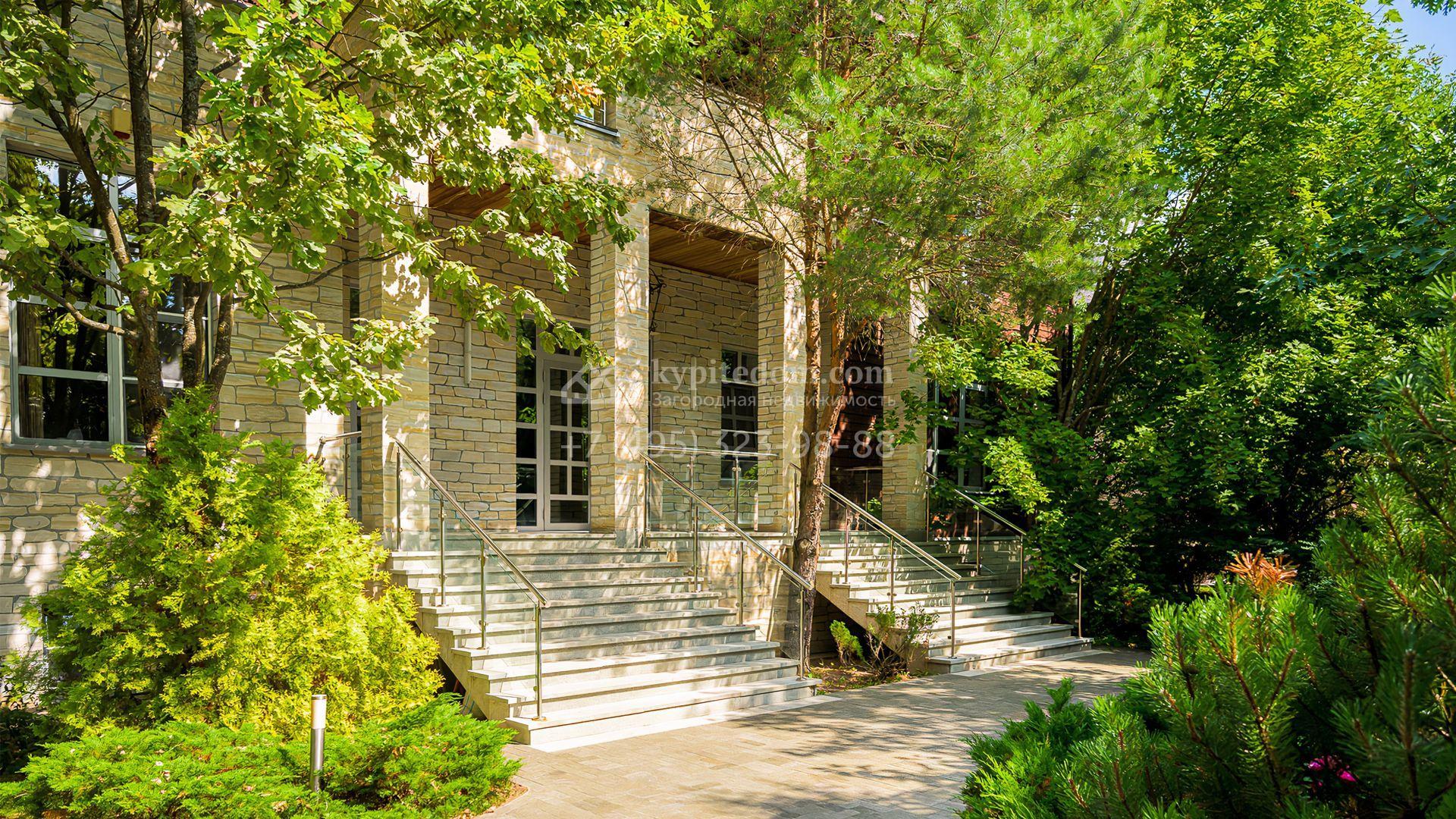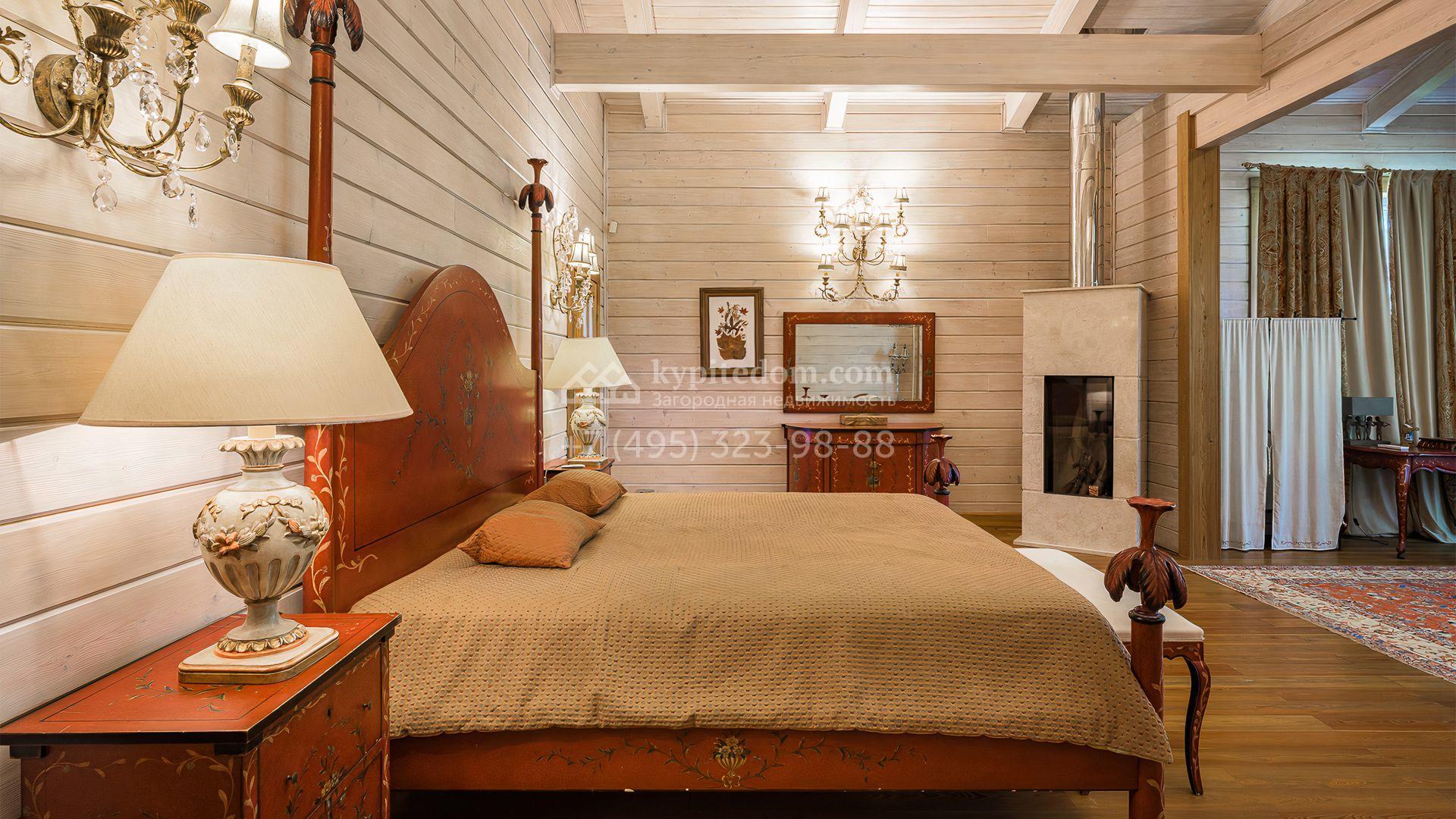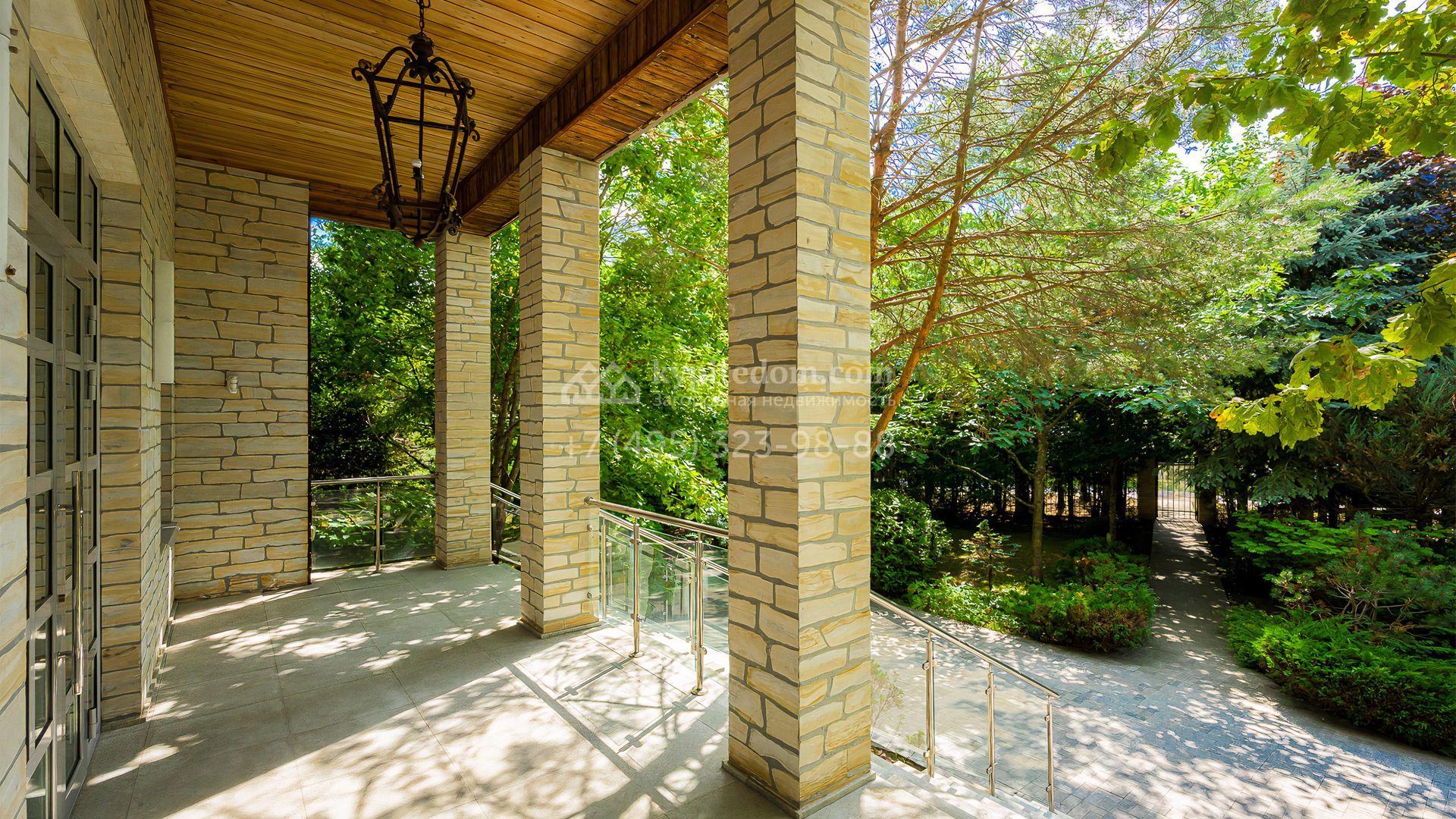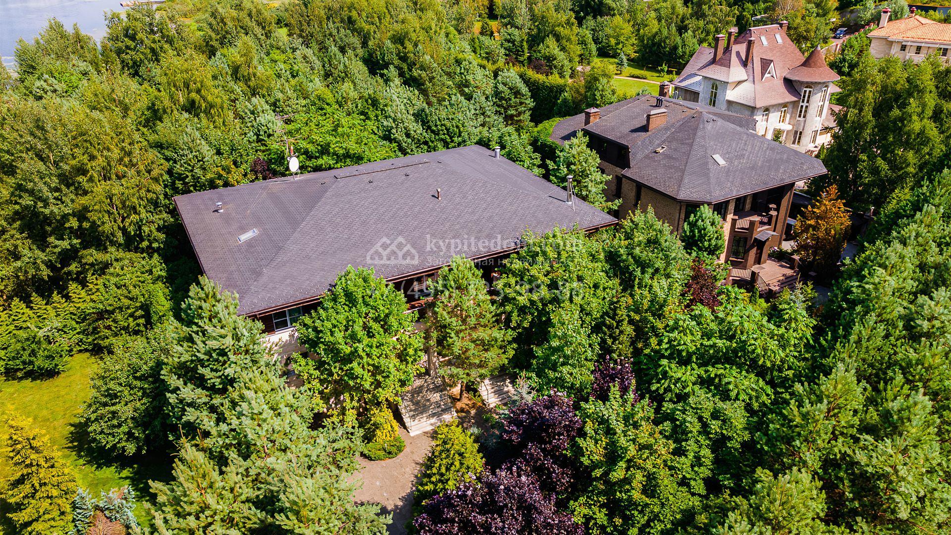 Загородный дом площадью 940 м² расположен на просторном участке 30 соток с собственным выходом к озеру. Фасад выполнен в современном американском стиле и облицован плиткой, имитирующей каменную кладку, и деревом. В отделке интерьра использованы теплые оттенки и натуральные материалы — канадский кедр, гранит, мрамор. Из больших окон открывается вид на живописный участок с березами, соснами, каштанами, цветущими декоративными кустарниками и цветниками. Центр притяжения коттеджа — уютная гостиная-столовая с камином, над которым висит зеркало ручной работы в резной раме. В резиденции разместили 4 спальни, кухню с выходом на террасу, кинотеатр, гараж на 2 машины и блок для персонала с отдельным входом. Расслабиться можно в SPA-зоне с бассейном, сауной и массажным кабинетом. На участке выполнен ландшафтный дизайн и обустроен собственный пирс.