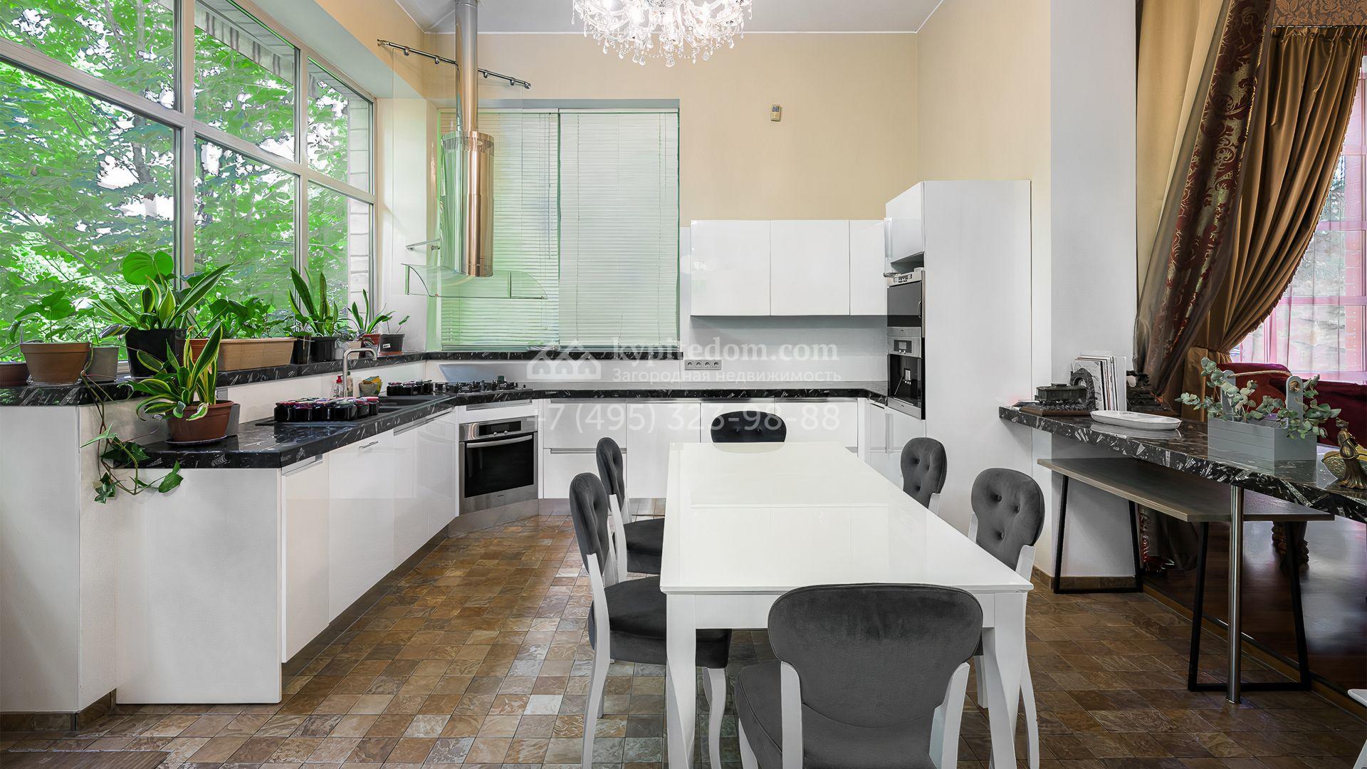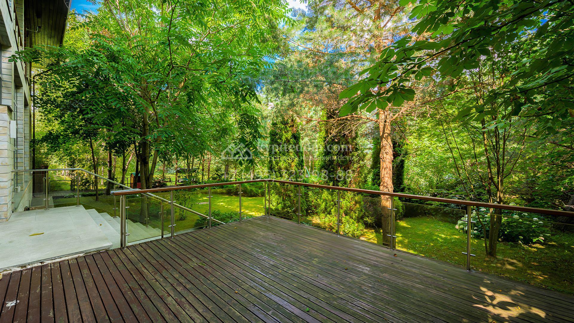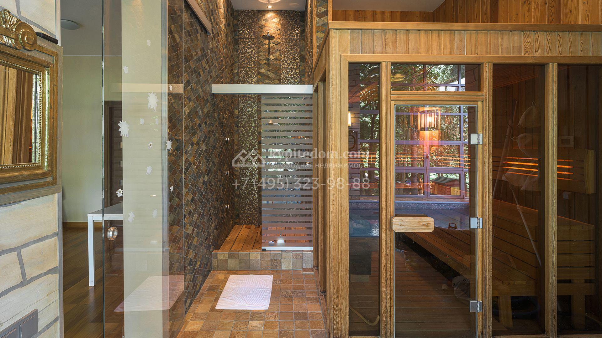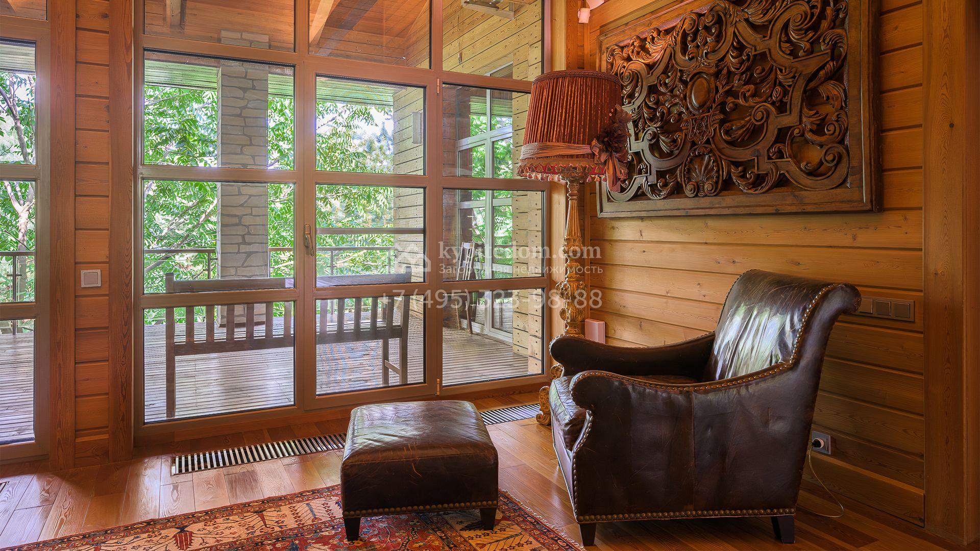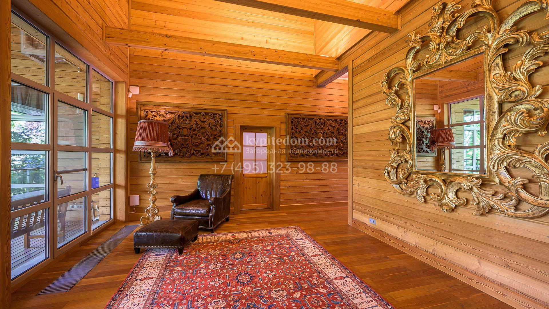 Загородный дом площадью 940 м² расположен на просторном участке 30 соток с собственным выходом к озеру. Фасад выполнен в современном американском стиле и облицован плиткой, имитирующей каменную кладку, и деревом. В отделке интерьра использованы теплые оттенки и натуральные материалы — канадский кедр, гранит, мрамор. Из больших окон открывается вид на живописный участок с березами, соснами, каштанами, цветущими декоративными кустарниками и цветниками. Центр притяжения коттеджа — уютная гостиная-столовая с камином, над которым висит зеркало ручной работы в резной раме. В резиденции разместили 4 спальни, кухню с выходом на террасу, кинотеатр, гараж на 2 машины и блок для персонала с отдельным входом. Расслабиться можно в SPA-зоне с бассейном, сауной и массажным кабинетом. На участке выполнен ландшафтный дизайн и обустроен собственный пирс.