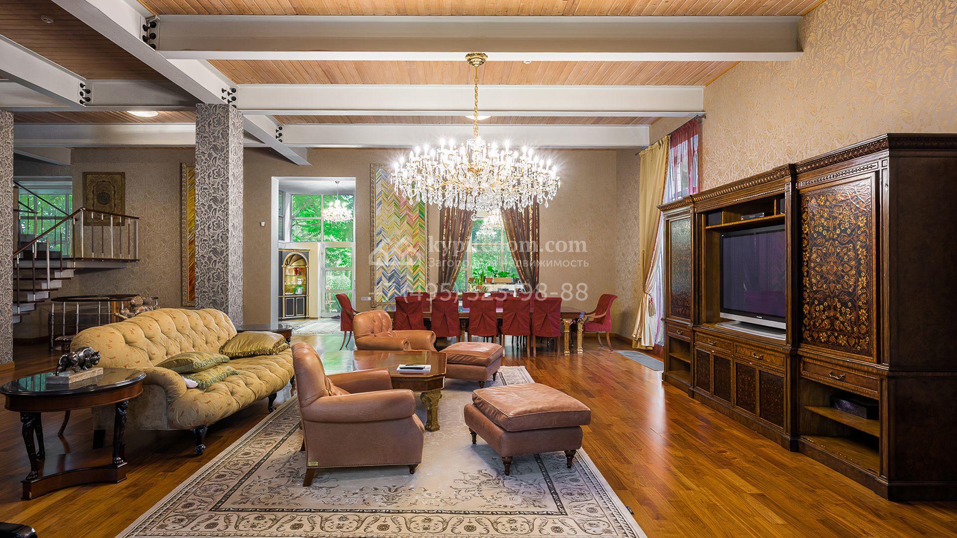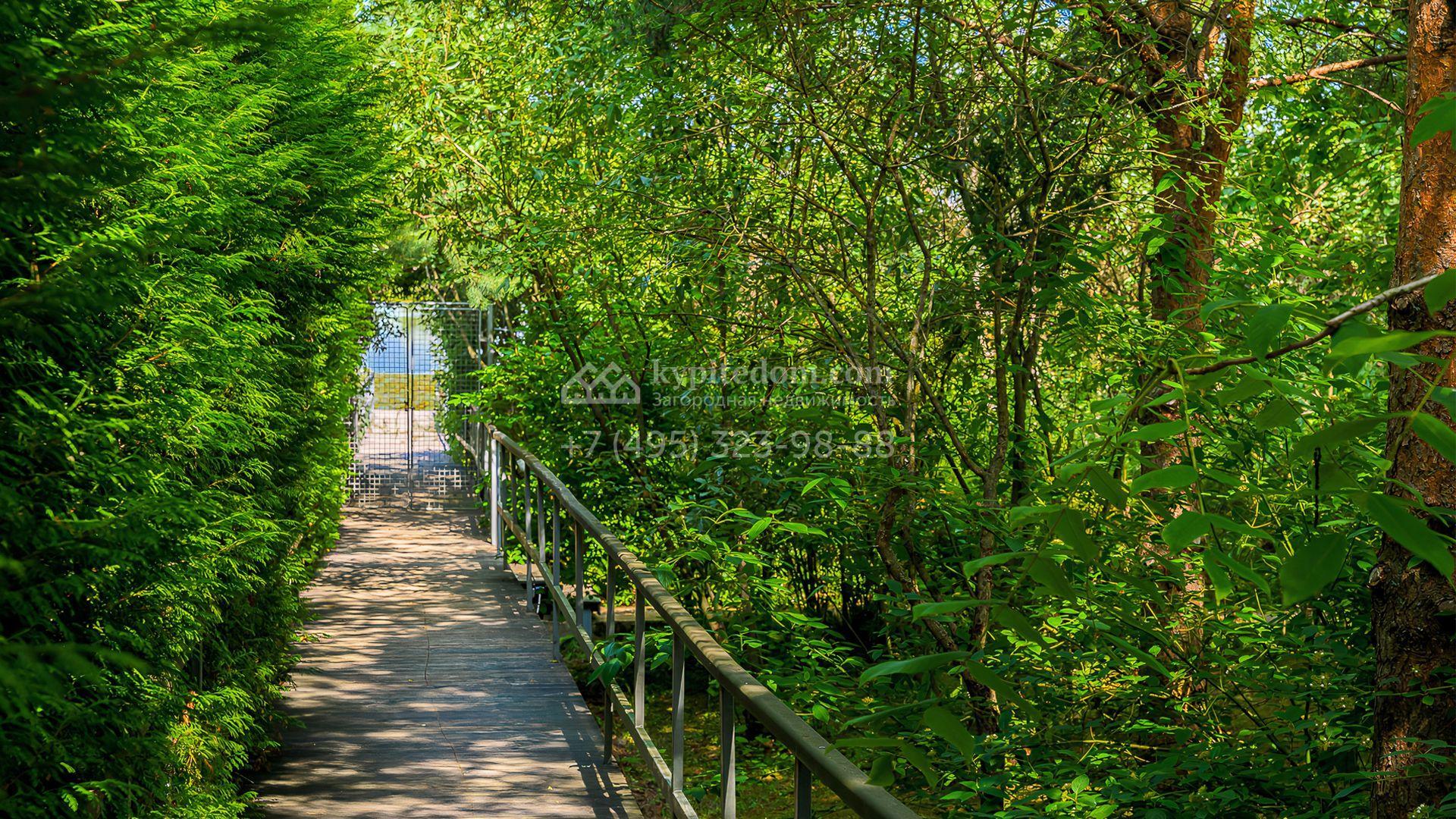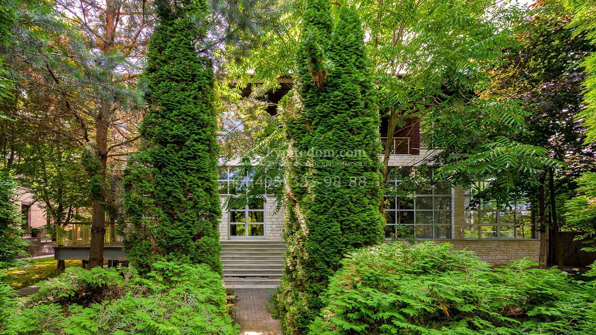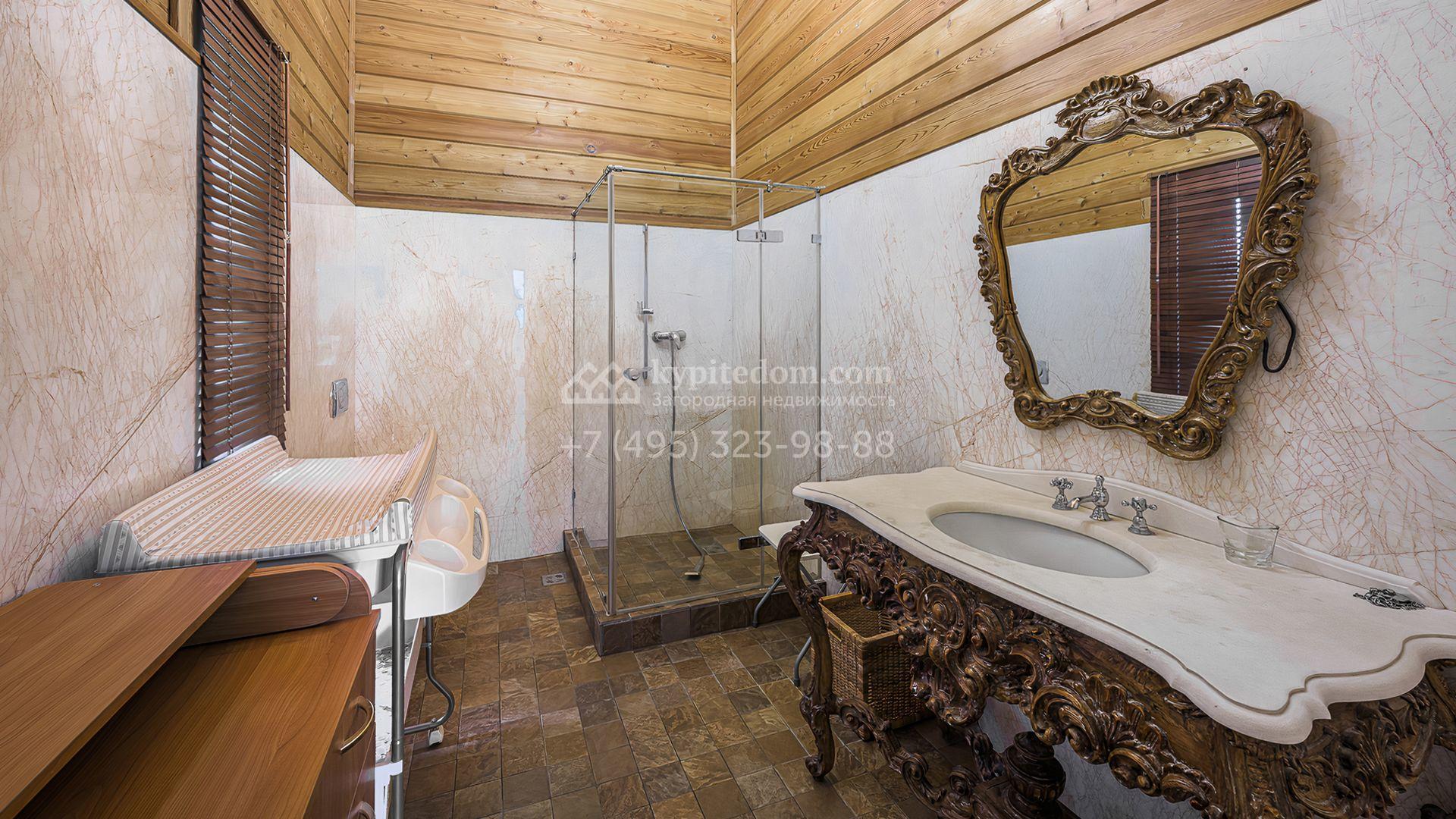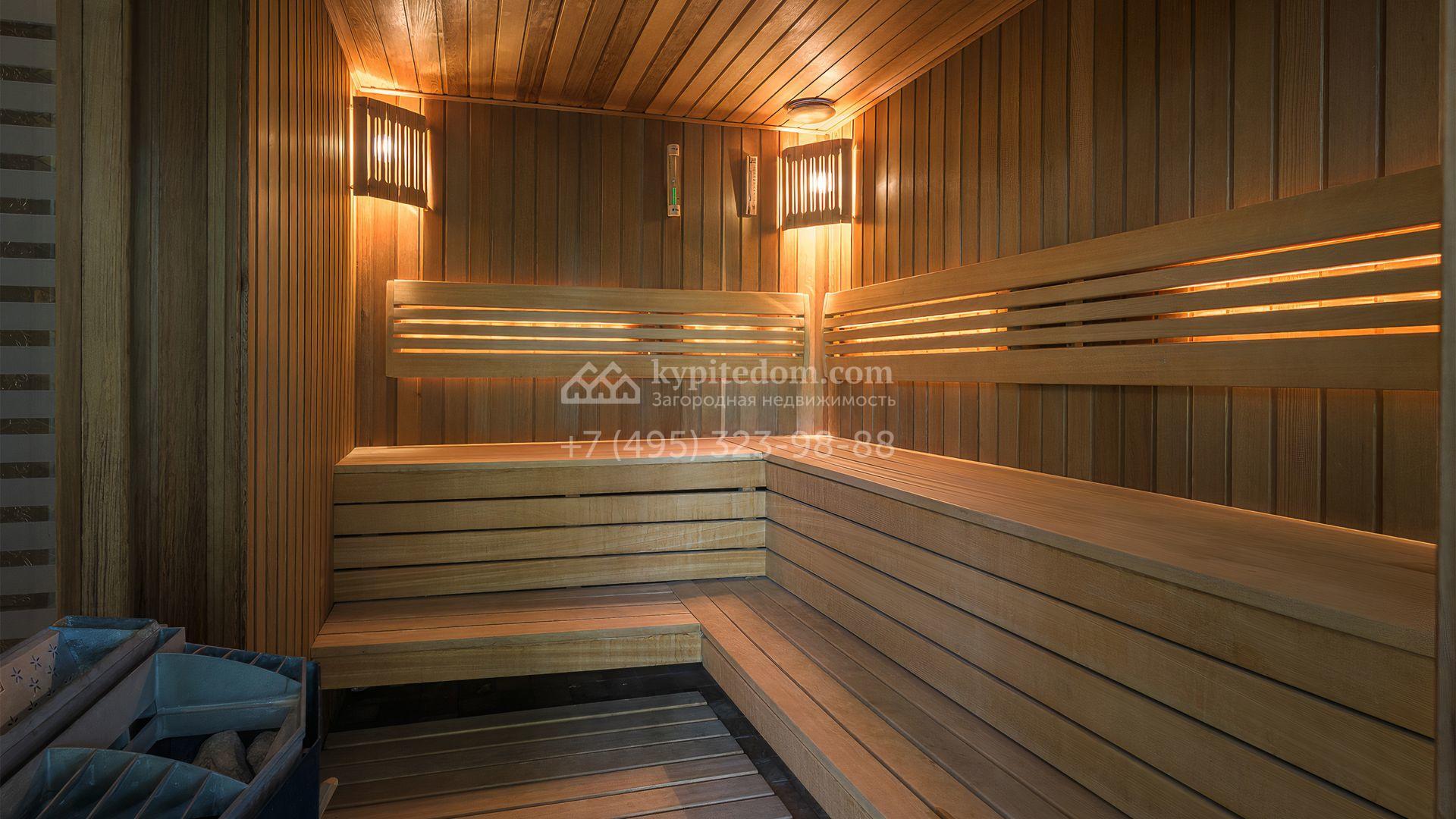 Загородный дом площадью 940 м² расположен на просторном участке 30 соток с собственным выходом к озеру. Фасад выполнен в современном американском стиле и облицован плиткой, имитирующей каменную кладку, и деревом. В отделке интерьра использованы теплые оттенки и натуральные материалы — канадский кедр, гранит, мрамор. Из больших окон открывается вид на живописный участок с березами, соснами, каштанами, цветущими декоративными кустарниками и цветниками. Центр притяжения коттеджа — уютная гостиная-столовая с камином, над которым висит зеркало ручной работы в резной раме. В резиденции разместили 4 спальни, кухню с выходом на террасу, кинотеатр, гараж на 2 машины и блок для персонала с отдельным входом. Расслабиться можно в SPA-зоне с бассейном, сауной и массажным кабинетом. На участке выполнен ландшафтный дизайн и обустроен собственный пирс.
