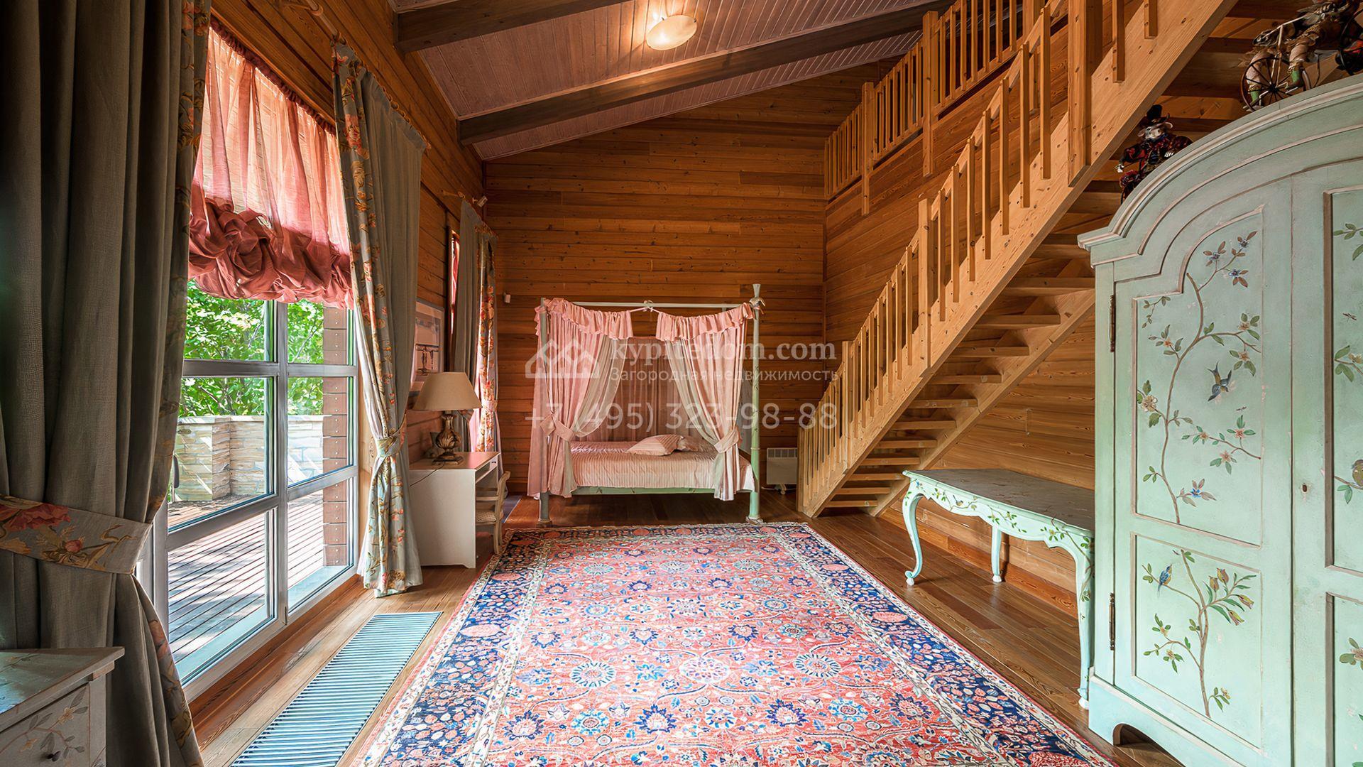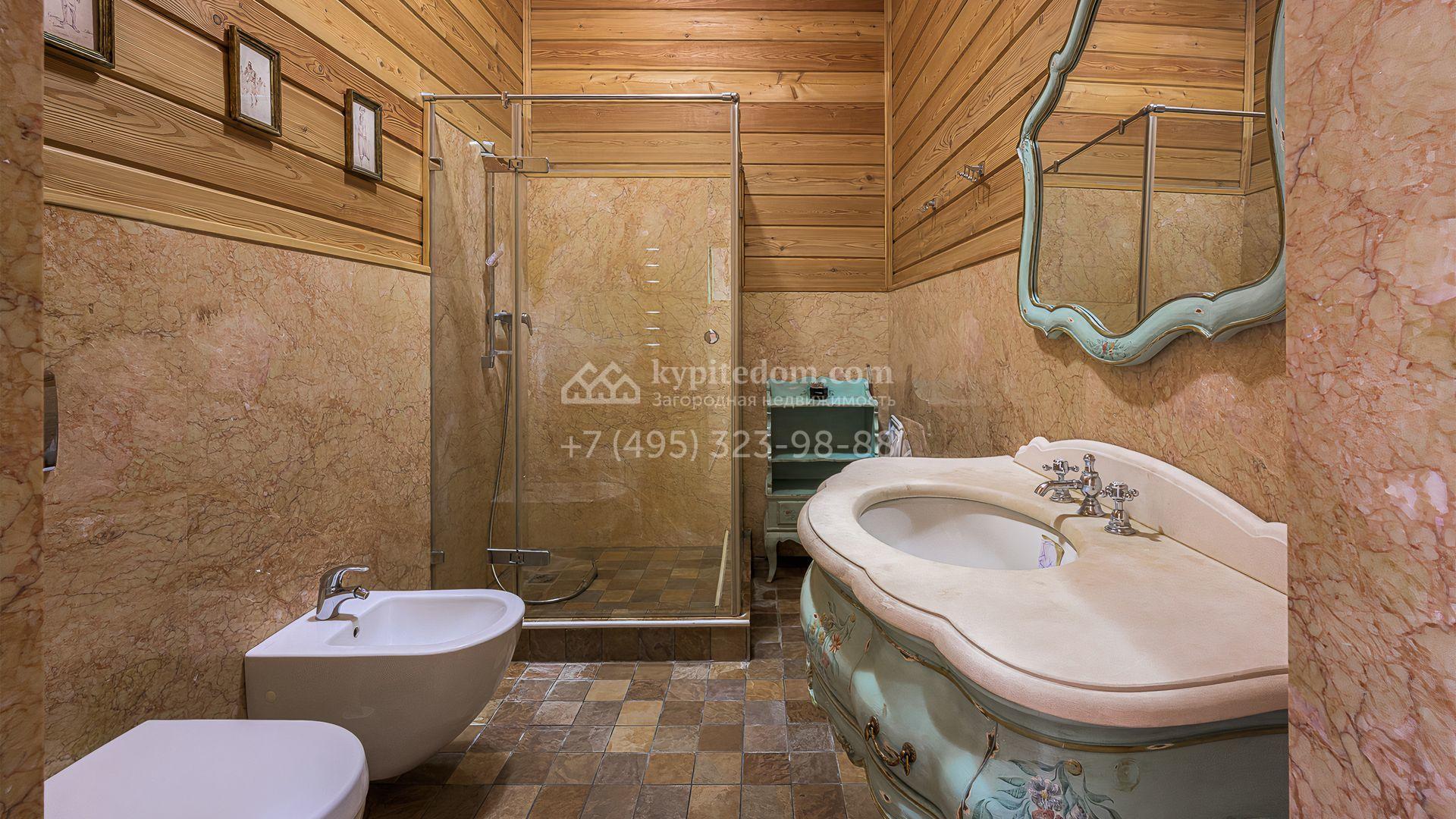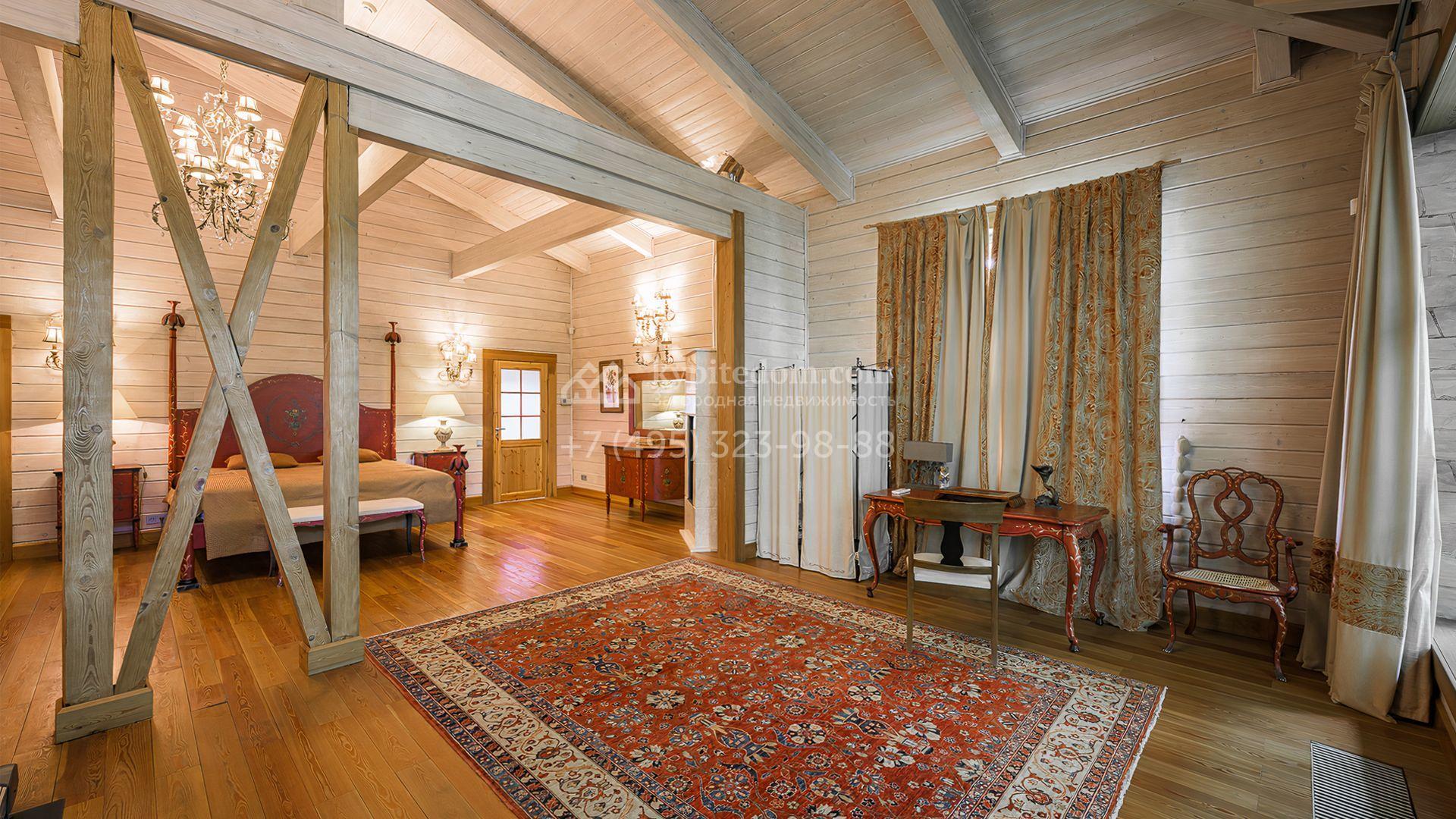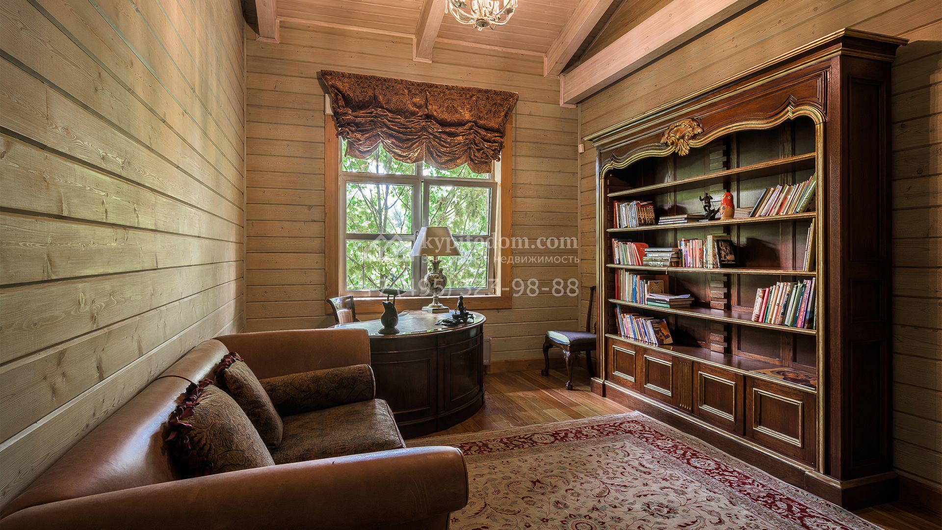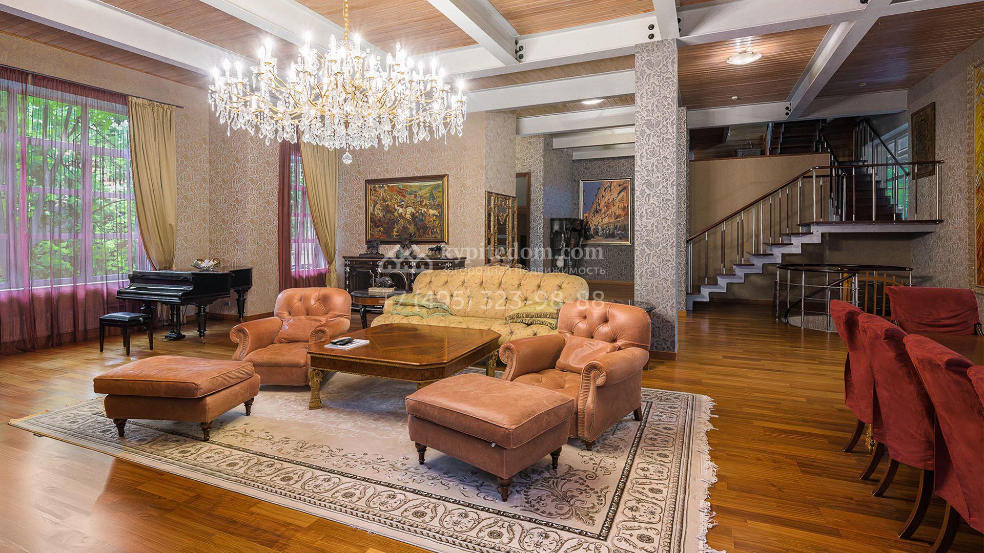 Загородный дом площадью 940 м² расположен на просторном участке 30 соток с собственным выходом к озеру. Фасад выполнен в современном американском стиле и облицован плиткой, имитирующей каменную кладку, и деревом. В отделке интерьра использованы теплые оттенки и натуральные материалы — канадский кедр, гранит, мрамор. Из больших окон открывается вид на живописный участок с березами, соснами, каштанами, цветущими декоративными кустарниками и цветниками. Центр притяжения коттеджа — уютная гостиная-столовая с камином, над которым висит зеркало ручной работы в резной раме. В резиденции разместили 4 спальни, кухню с выходом на террасу, кинотеатр, гараж на 2 машины и блок для персонала с отдельным входом. Расслабиться можно в SPA-зоне с бассейном, сауной и массажным кабинетом. На участке выполнен ландшафтный дизайн и обустроен собственный пирс.