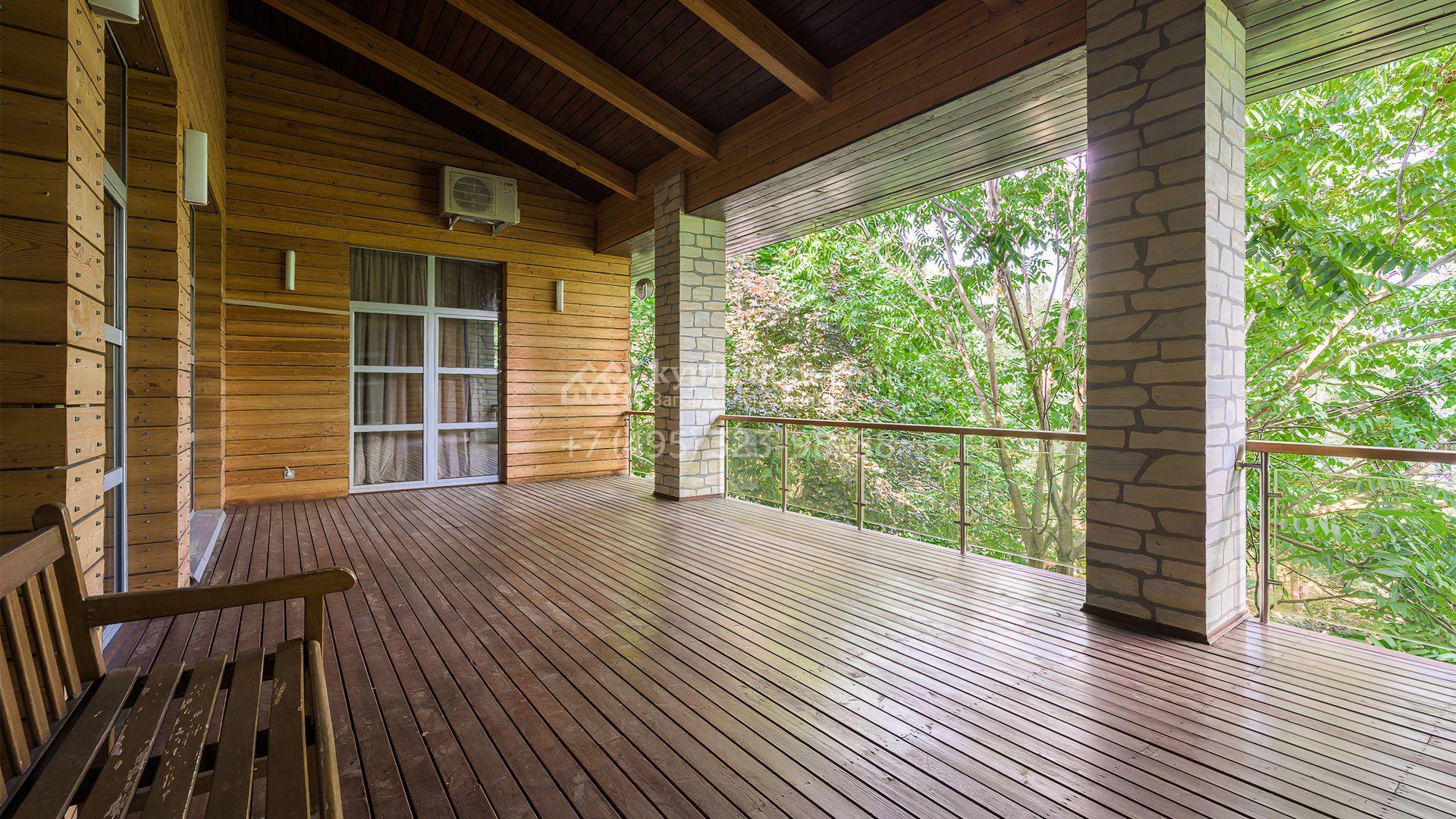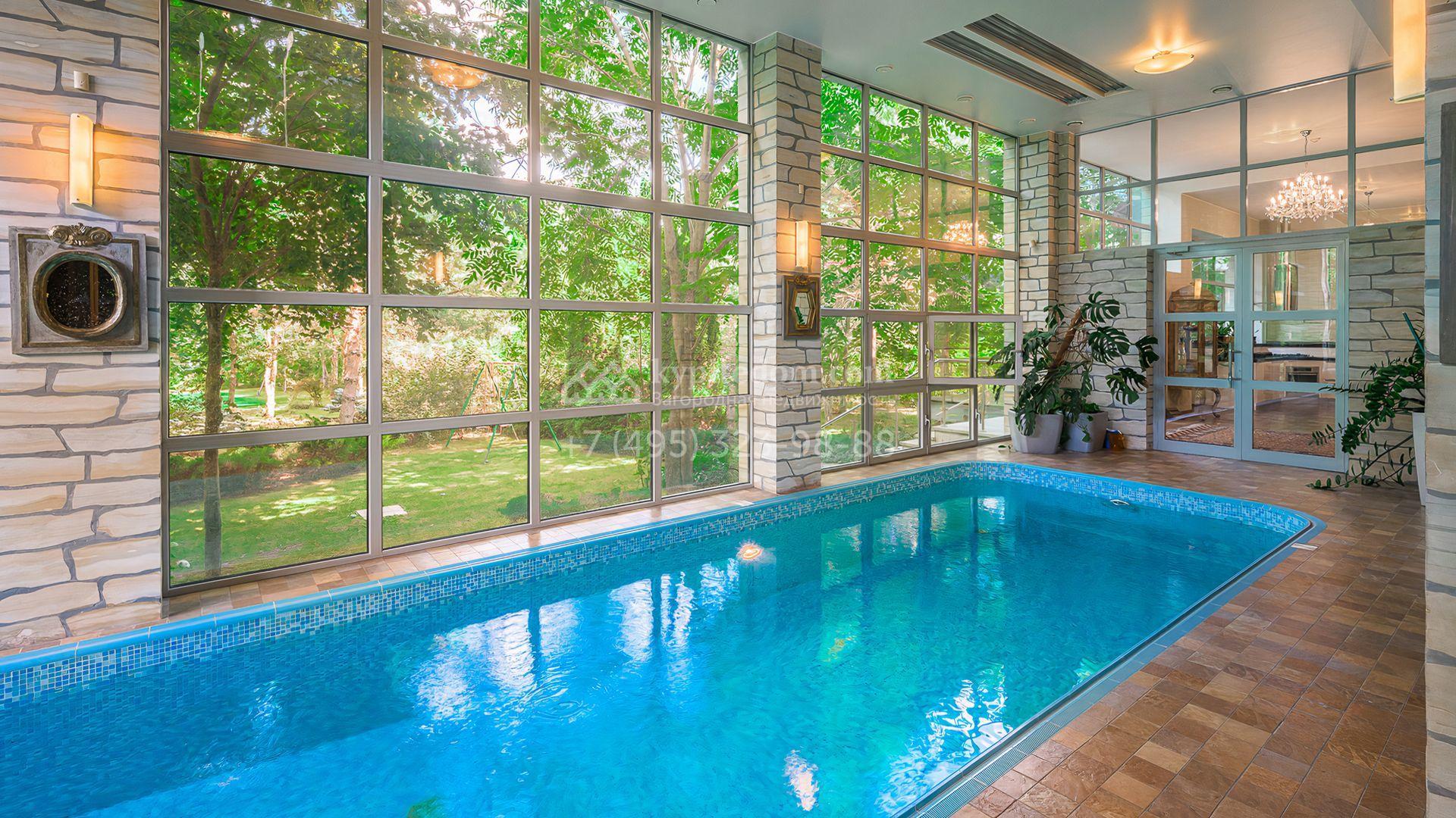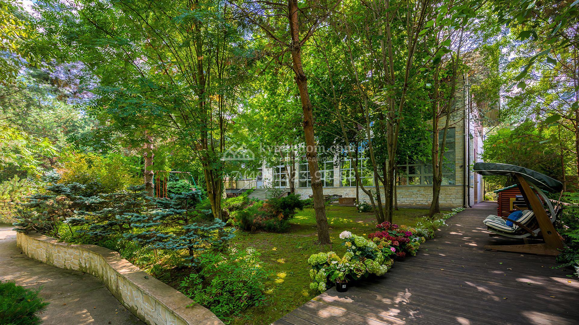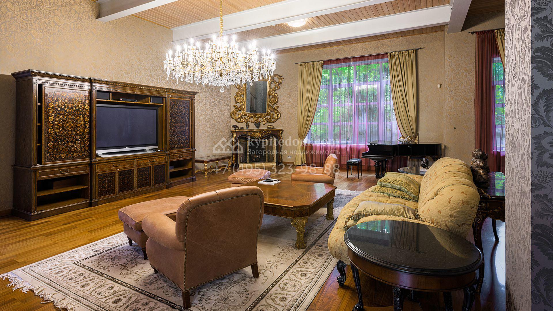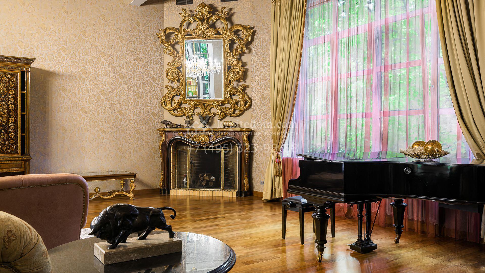 Загородный дом площадью 940 м² расположен на просторном участке 30 соток с собственным выходом к озеру. Фасад выполнен в современном американском стиле и облицован плиткой, имитирующей каменную кладку, и деревом. В отделке интерьра использованы теплые оттенки и натуральные материалы — канадский кедр, гранит, мрамор. Из больших окон открывается вид на живописный участок с березами, соснами, каштанами, цветущими декоративными кустарниками и цветниками. Центр притяжения коттеджа — уютная гостиная-столовая с камином, над которым висит зеркало ручной работы в резной раме. В резиденции разместили 4 спальни, кухню с выходом на террасу, кинотеатр, гараж на 2 машины и блок для персонала с отдельным входом. Расслабиться можно в SPA-зоне с бассейном, сауной и массажным кабинетом. На участке выполнен ландшафтный дизайн и обустроен собственный пирс.