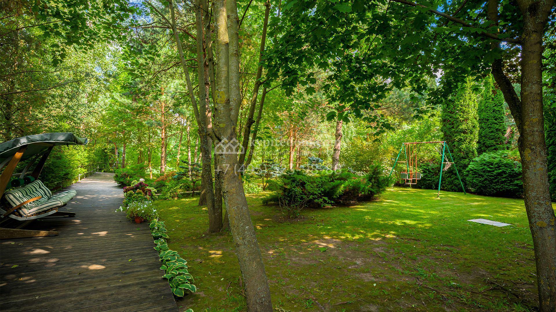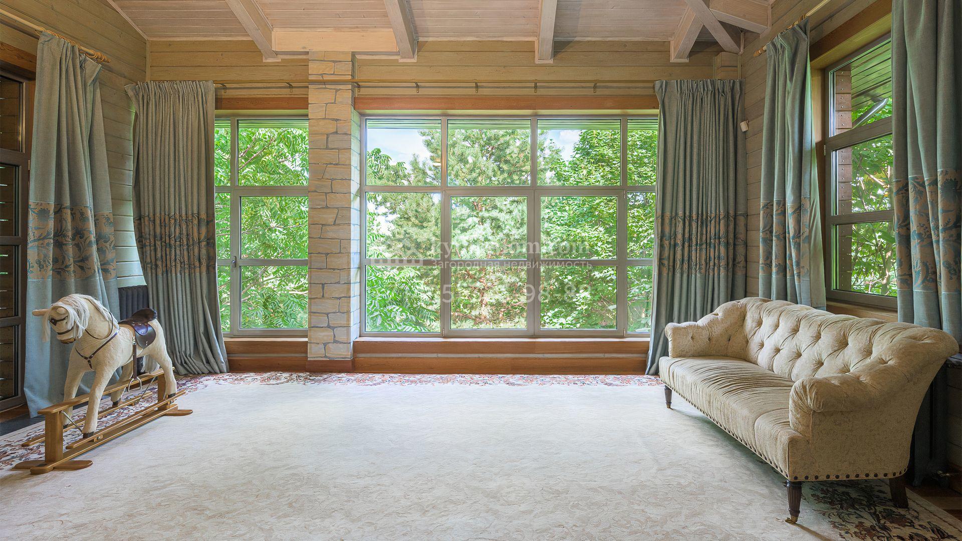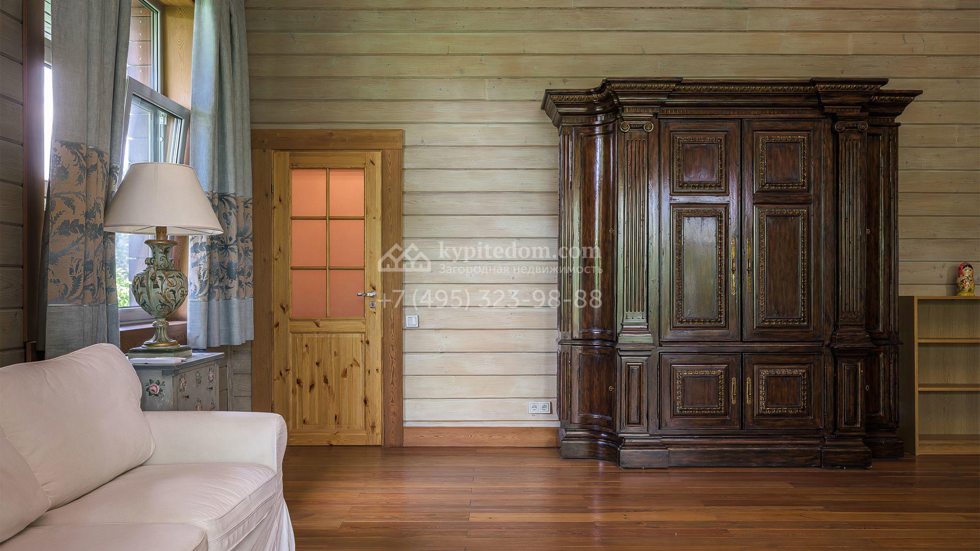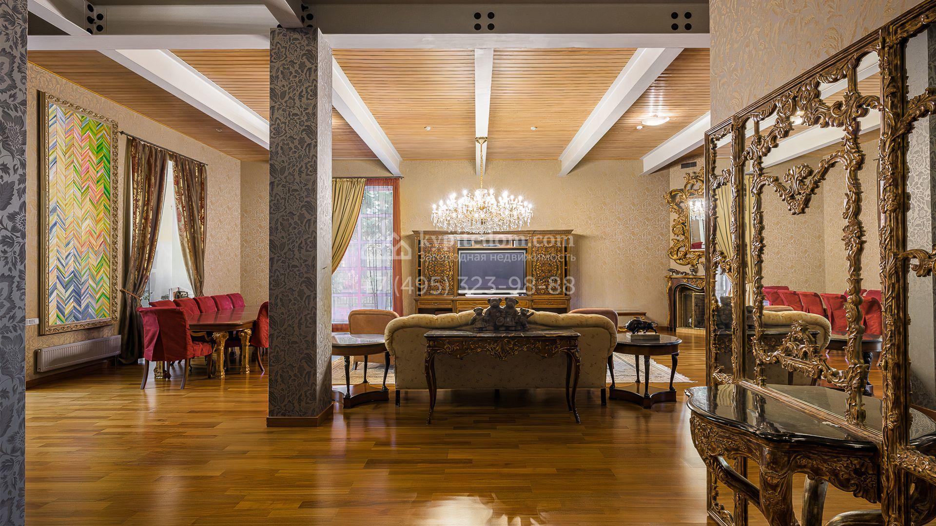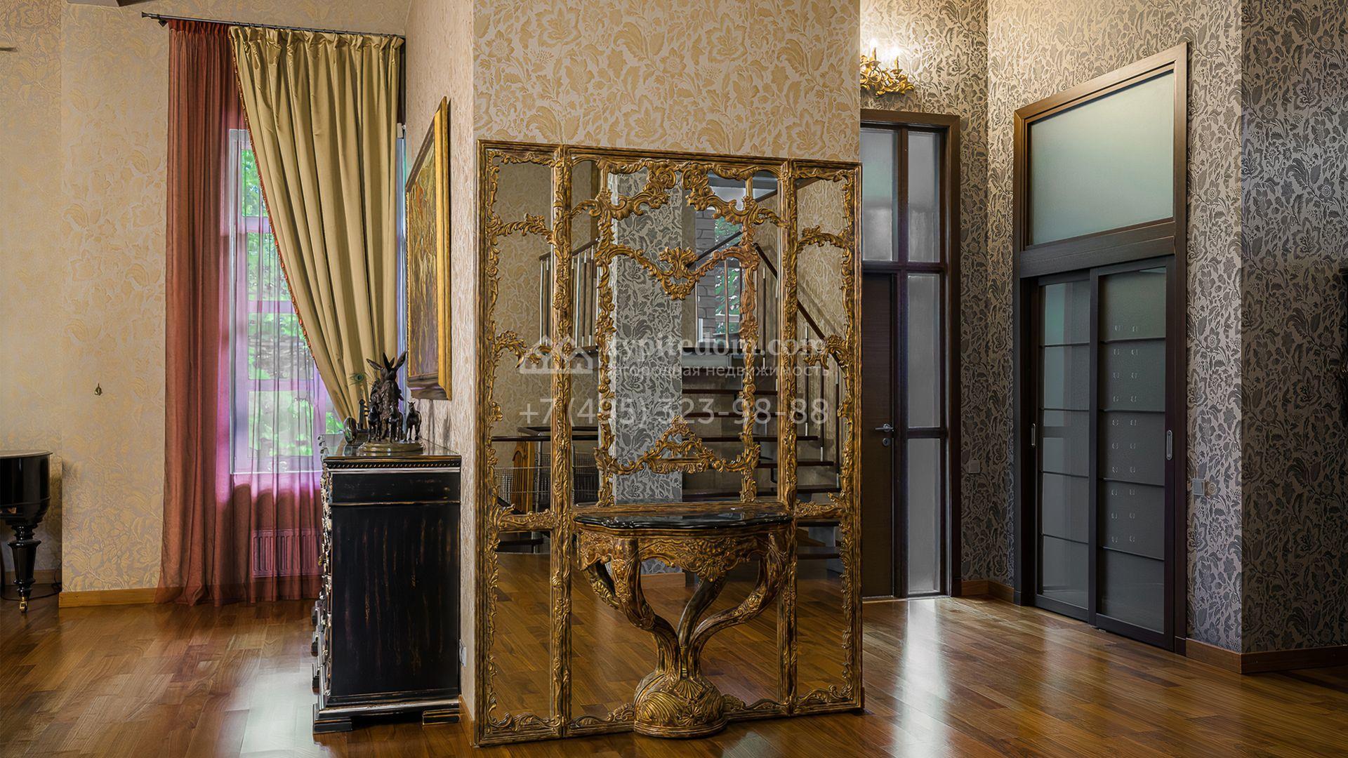 Загородный дом площадью 940 м² расположен на просторном участке 30 соток с собственным выходом к озеру. Фасад выполнен в современном американском стиле и облицован плиткой, имитирующей каменную кладку, и деревом. В отделке интерьра использованы теплые оттенки и натуральные материалы — канадский кедр, гранит, мрамор. Из больших окон открывается вид на живописный участок с березами, соснами, каштанами, цветущими декоративными кустарниками и цветниками. Центр притяжения коттеджа — уютная гостиная-столовая с камином, над которым висит зеркало ручной работы в резной раме. В резиденции разместили 4 спальни, кухню с выходом на террасу, кинотеатр, гараж на 2 машины и блок для персонала с отдельным входом. Расслабиться можно в SPA-зоне с бассейном, сауной и массажным кабинетом. На участке выполнен ландшафтный дизайн и обустроен собственный пирс.