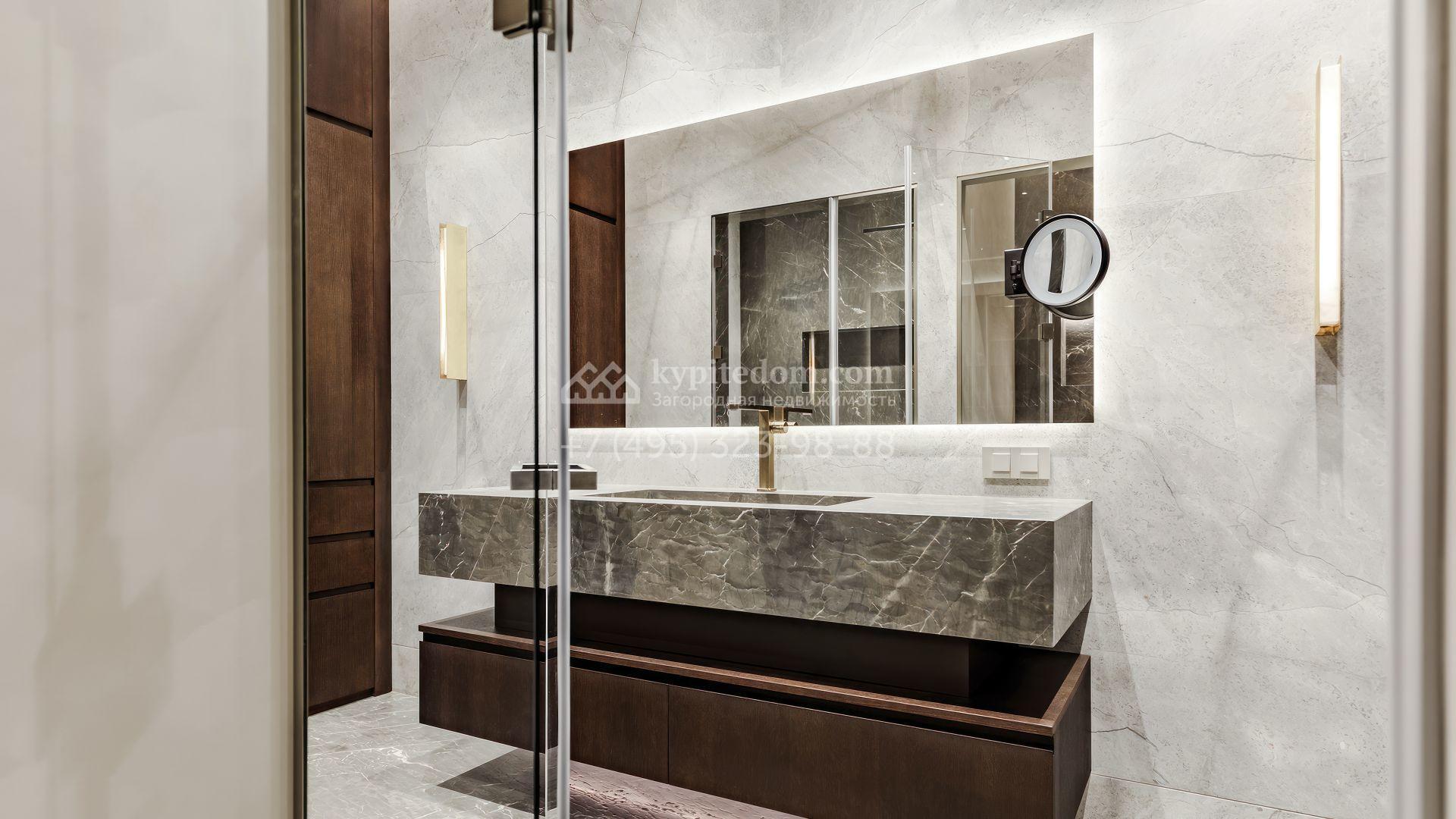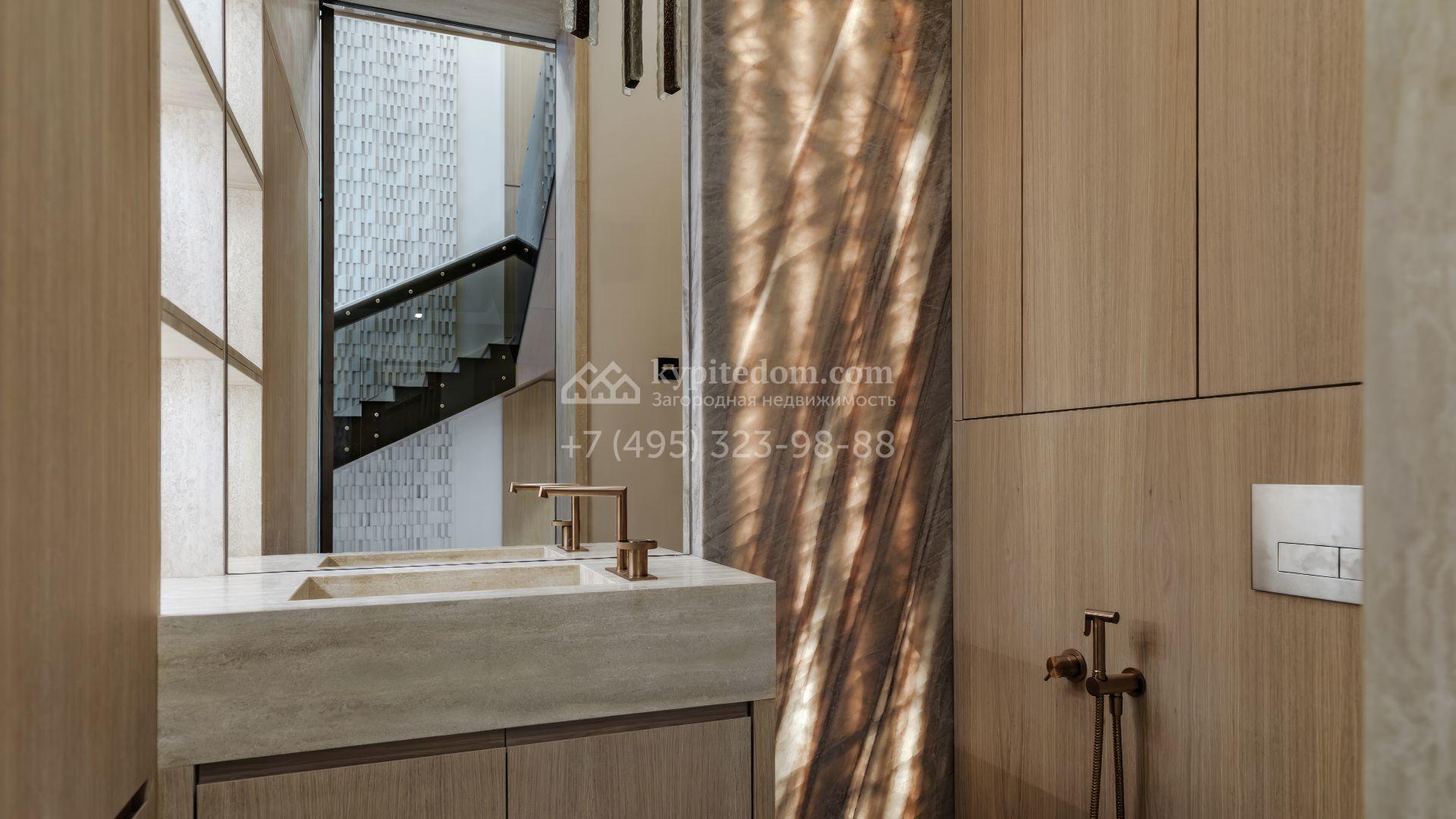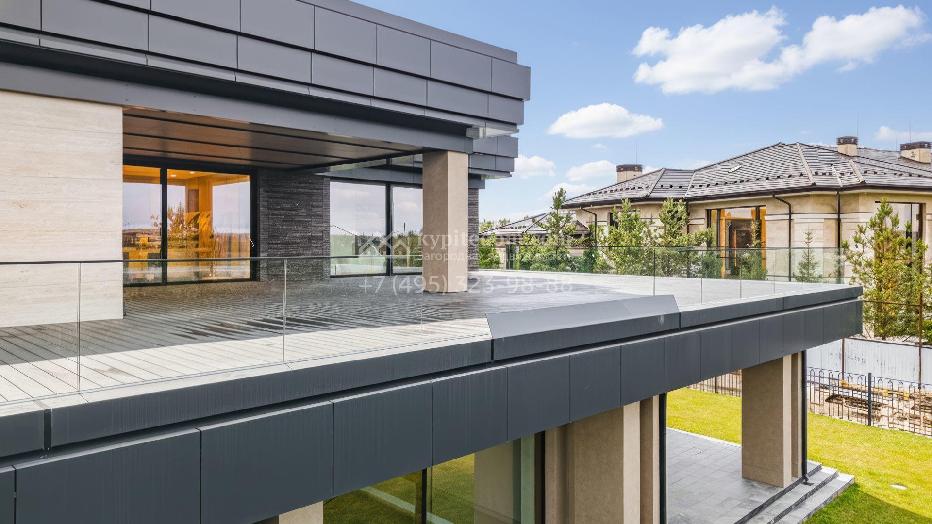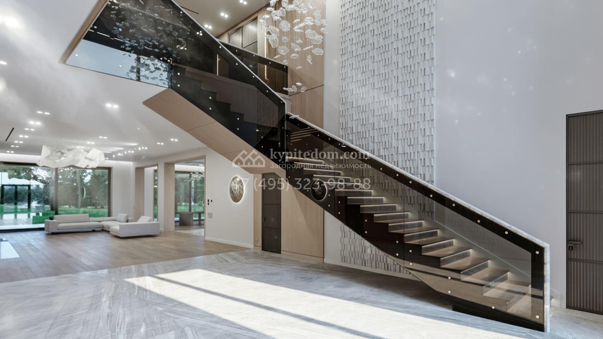Загородная резиденция в современном стиле площадью 1900 м² расположена на полевом участке 35,6 соток. Фасад сочетает светлый камень и тёплую древесную отделку, подчеркивая архитектурный ритм и геометрию объёмов. Чёткие вертикали, вытянутый карниз с подсветкой и крупные оконные проёмы формируют выразительный и цельный образ, наполняя интерьеры светом и создавая ощущение открытого пространства.