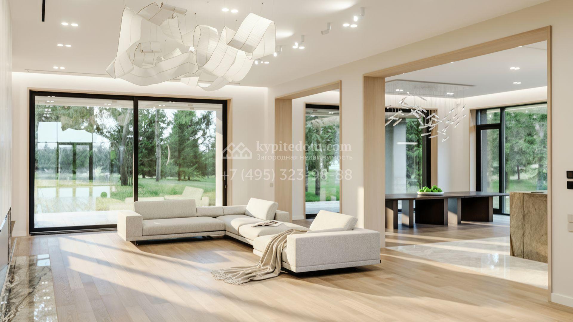 Внутреннее оформление выдержано в естественной цветовой гамме, где минимализм сочетается с тактильной выразительностью фактур. Простой силуэт мебели, натуральные материалы и изящные световые сценарии формируют спокойную, уравновешенную атмосферу. Освещение организовано с особым вниманием: зоны акцентированы дизайнерскими люстрами и светильниками.