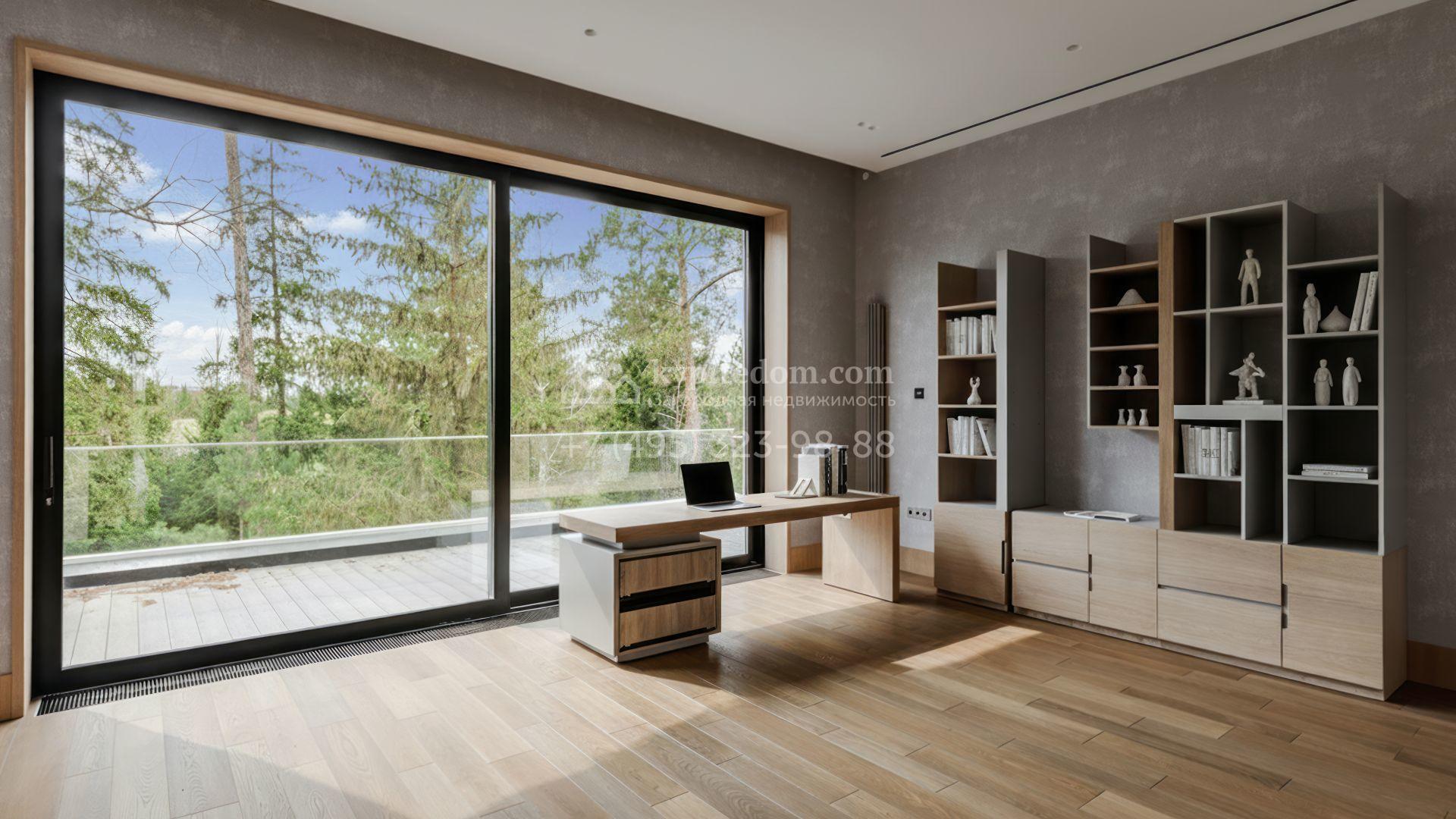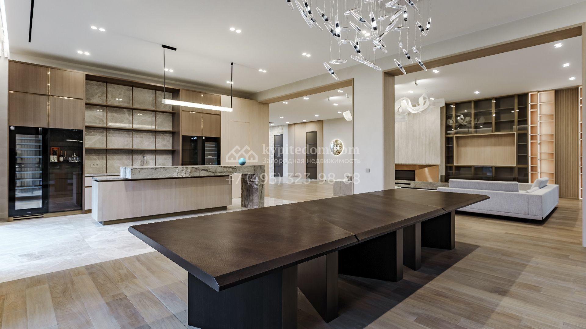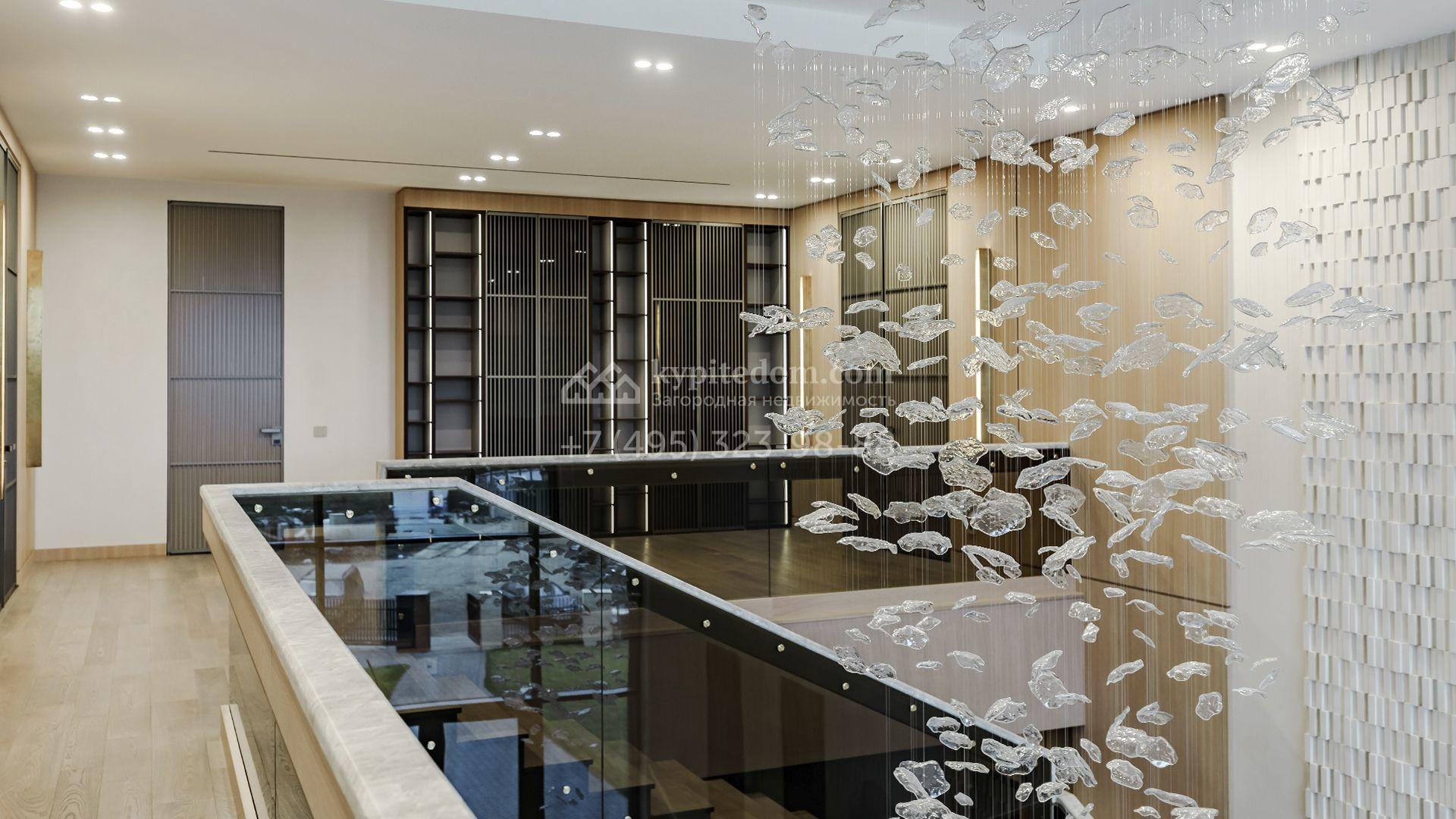 Планировка включает гостиную-кухню-столовую площадью 137 м², 6 спален с гардеробными и санузлами, кабинет, тренажёрный зал и полноценный спа-блок с бассейном, хаммамом и сауной. Дополнительно предусмотрены гараж и жилое пространство для персонала с тремя спальнями и кухней. Участок оформлен в авторской концепции: засеян газон, высажены декоративные деревья и кустарники, установлен арт-объект, обустроены места для отдыха у открытого бассейна.
