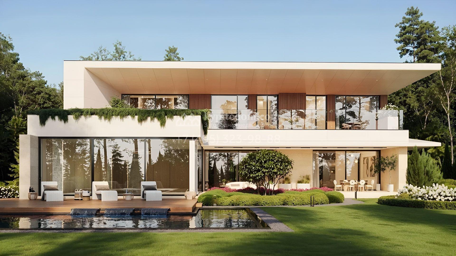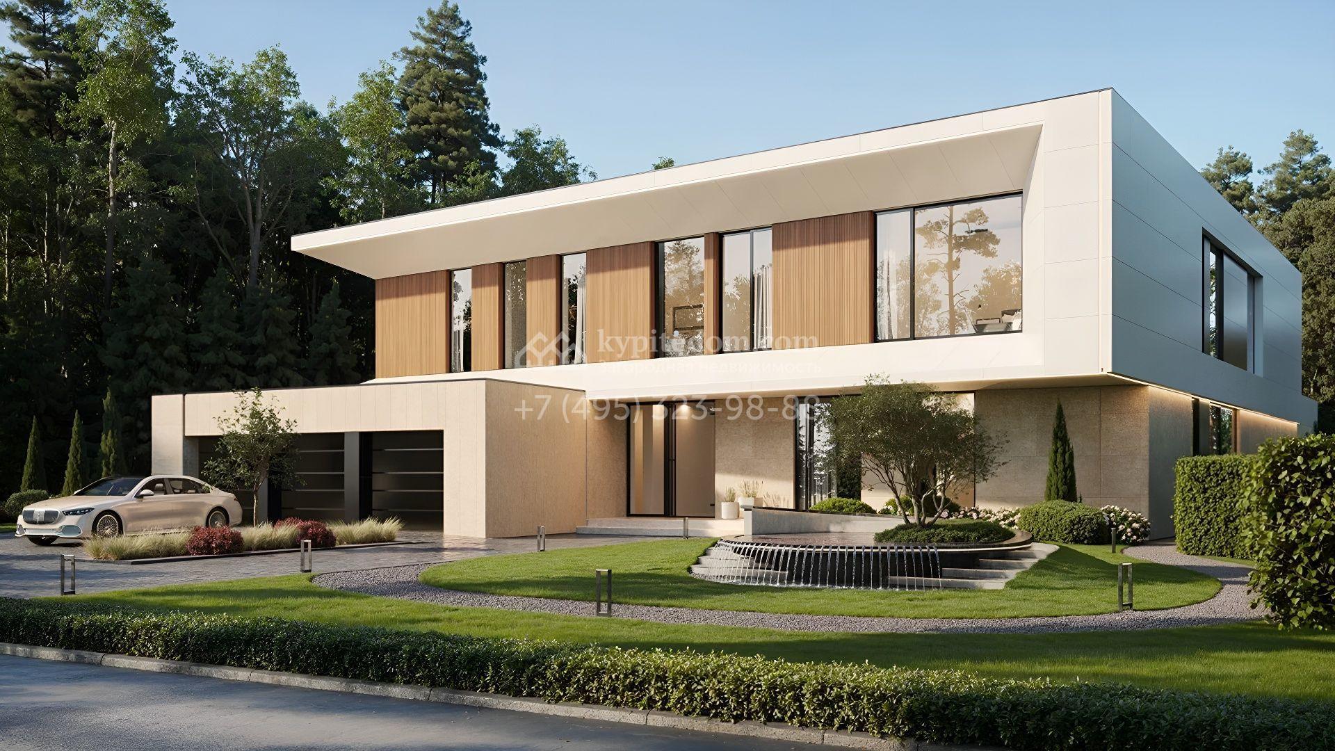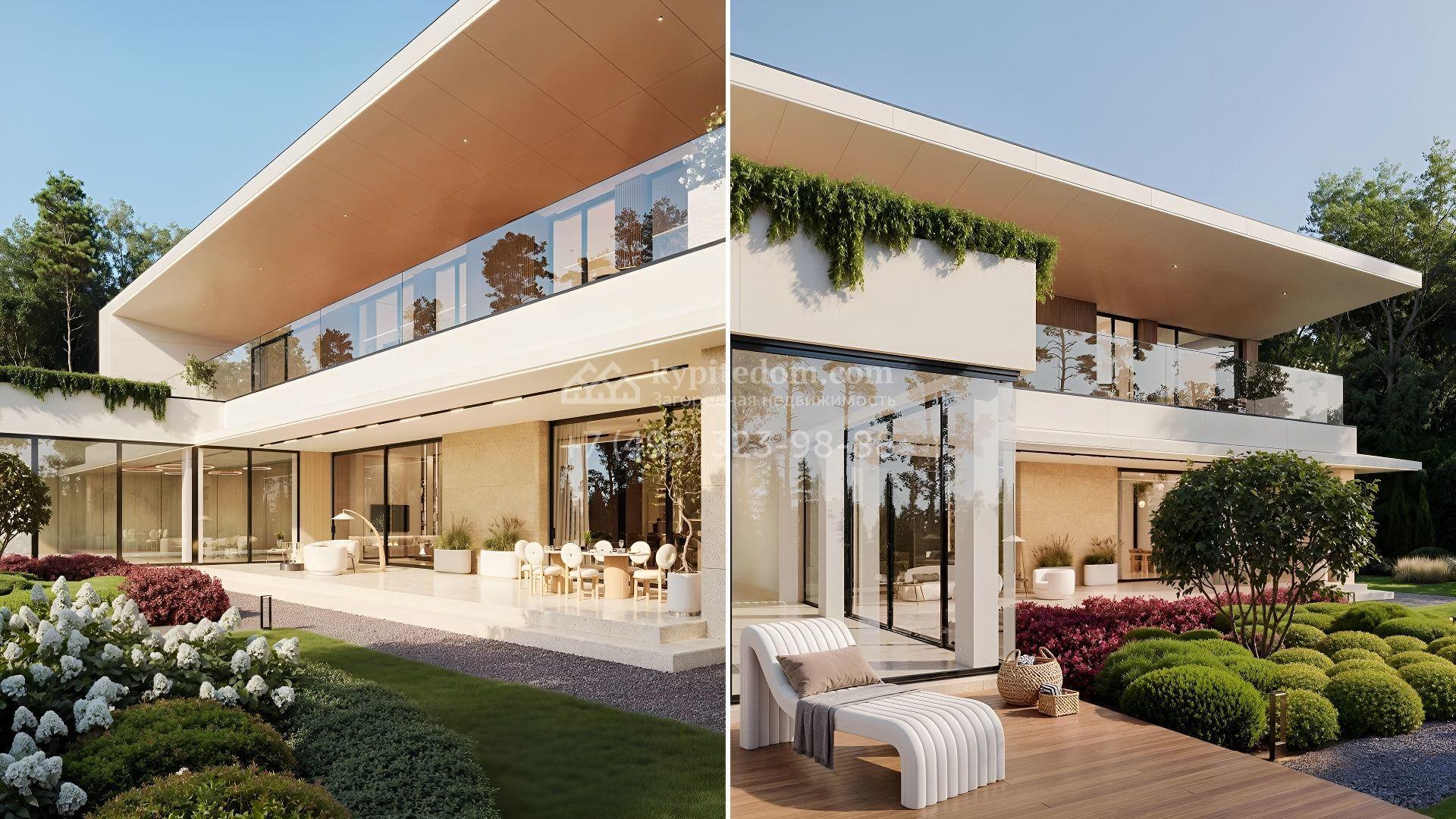 Современная резиденция площадью 1400 м² расположена на участке 30 соток рядом с парком и зоопарком. Светлая облицовка в сочетании с древесными вставками создаёт сбалансированный и лёгкий облик. Широкоформатные окна усиливают связь с ландшафтом, наполняя дом светом и визуальной прозрачностью. Плоская крыша и стеклянные ограждения балконов подчёркивают архитектурную геометрию, завершая внешний облик сдержанно и элегантно.